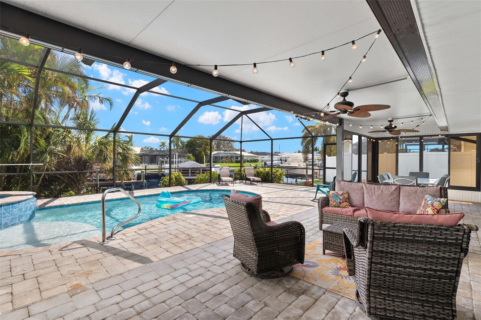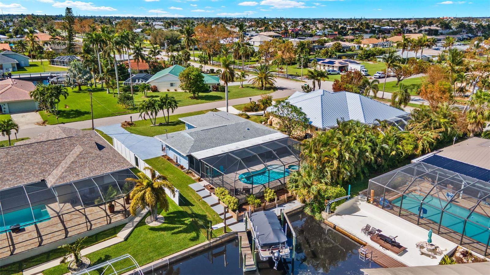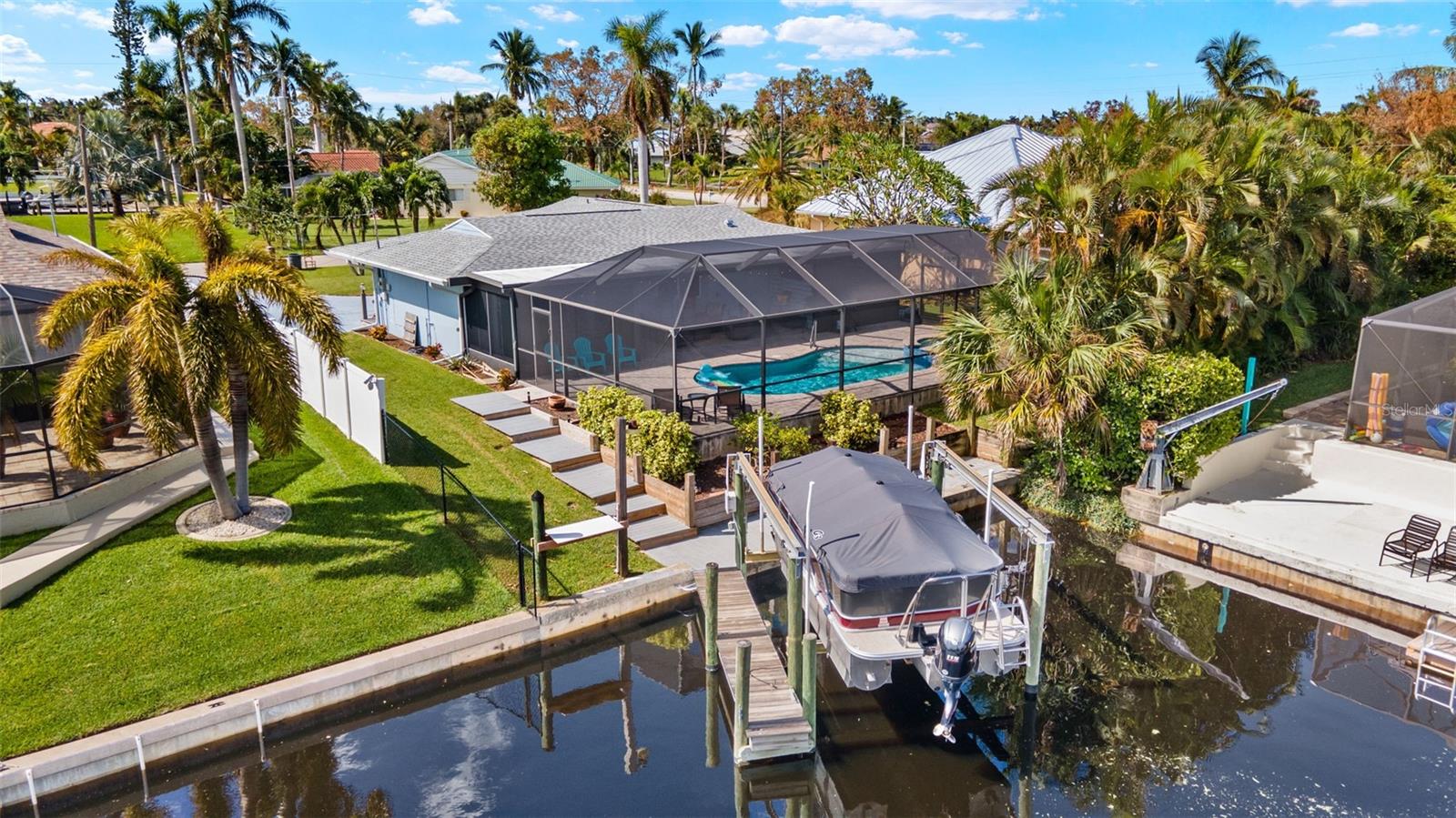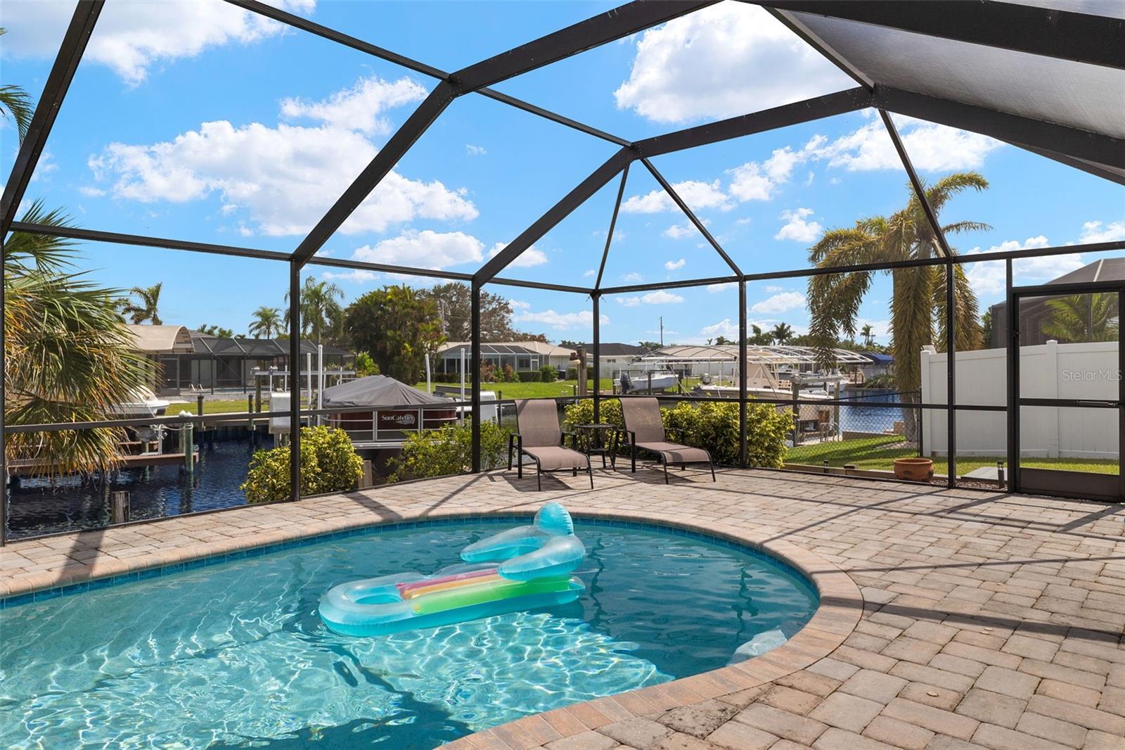This beautiful 3-bedroom home offers quick, direct river access and is a dream for boating enthusiasts, complete with a 7,000 lb boat lift on the canal. Experience the Florida lifestyle with a sparkling pool, spa, and expansive entertainment area, plus a large lanai with extra storage. The spacious eat-in kitchen features stainless steel appliances, walk in pantry and plenty of workspace; the home is equipped with a newer A/C and roof for added peace of mind. Ideally situated near Cape Coral's best shopping, dining, and attractions, and located in the highly sought-after Palaco Grande neighborhood. Best of all, the property has had no water damage from Ian, Helene, or Milton! Call today to schedule your private showing—this home won’t last at this price!