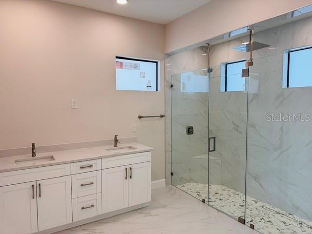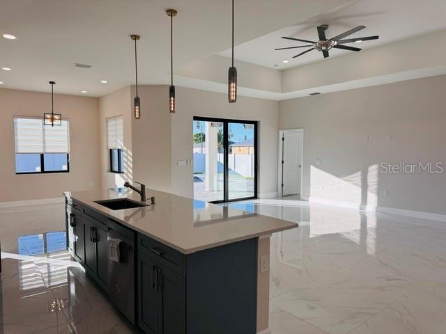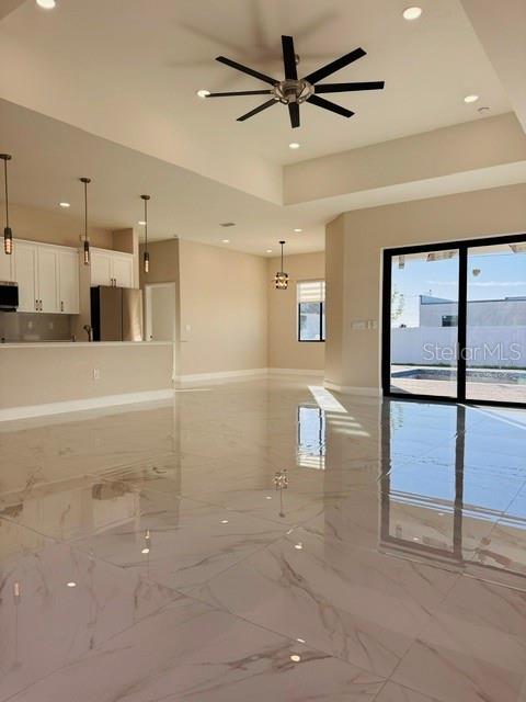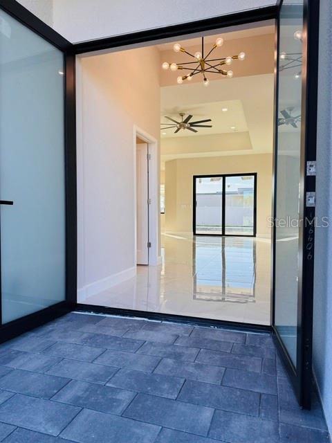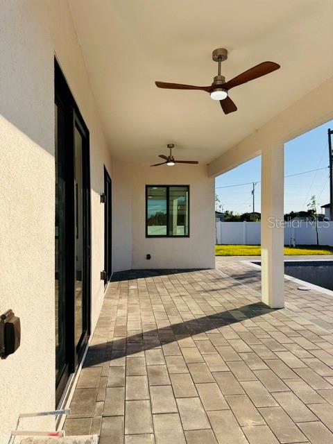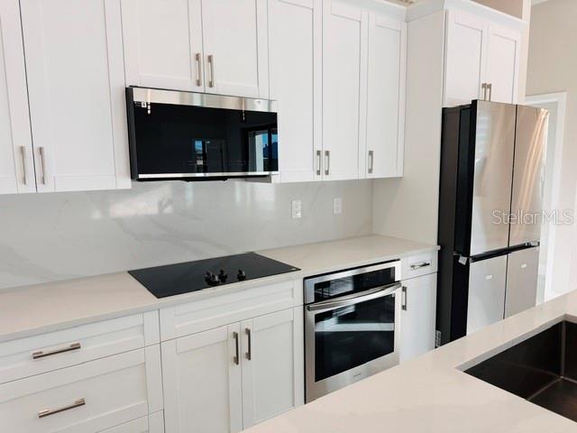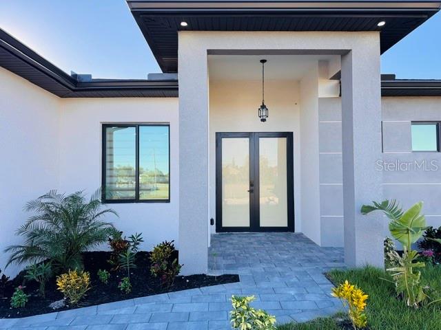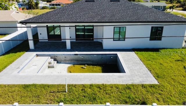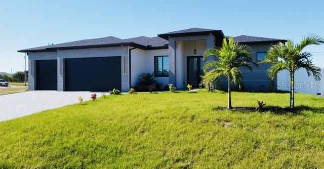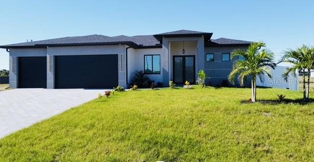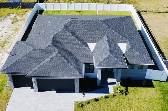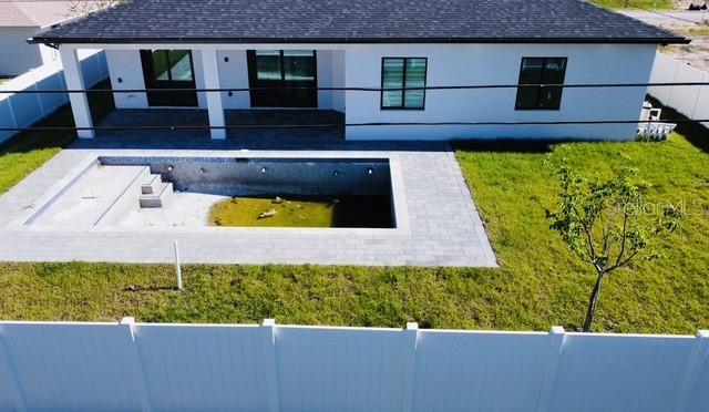Stunning new construction pool home located in a quiet neighborhood close to all amenities. This fabulous home features 3 bed + den/office, 2 bath, 3 car garage, an in ground 14 x 28 upgraded pool with natural stone travertine coping, interior tile, tanning ledge with bubbler, and a fenced yard. Enter the house through double entrance doors into the large and bright living area with 96” tall sliding doors to the lanai. This home features hurricane impact doors and windows and extra tall ceilings that complement all extended 96” exterior doors and 32”X32” porcelain tile throughout the house. Kitchen features premium cabinets with solid wood doors, a large island with room for seating, upgraded stainless steel appliances with a built in cooktop, and premium quartz counter tops. A separate dining area overlooks the gorgeous pool. Upgraded fixtures, ceiling fans and lighting throughout this home. Primary suite has two walk in closets with custom organizers, dual sinks, large glass enclosed shower, oversized freestanding tub, and sliding doors out to the lanai. The two additional bedrooms have custom closet organizers and window treatments. Garage has two garage door openers. Exterior has decorative stucco finish, extended paver driveway, High efficiency premium Ruud HVAC system, and a sprinkler system.