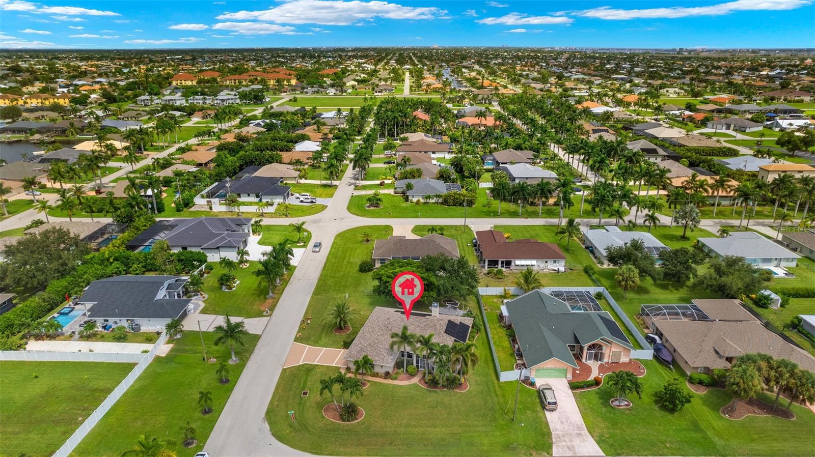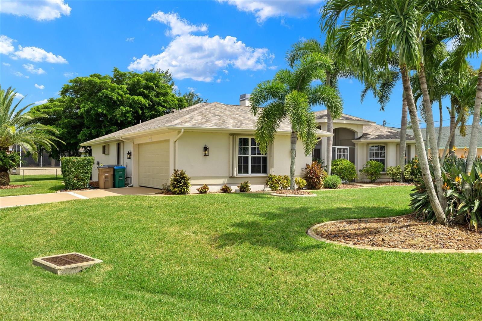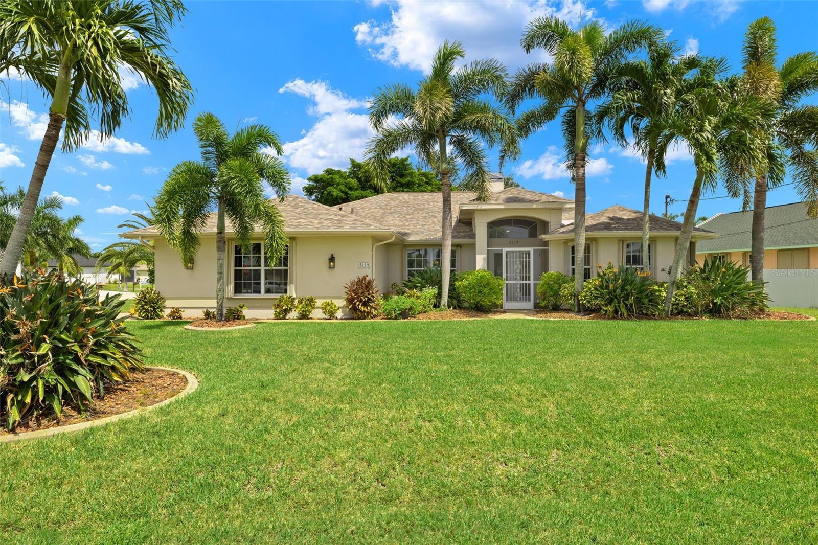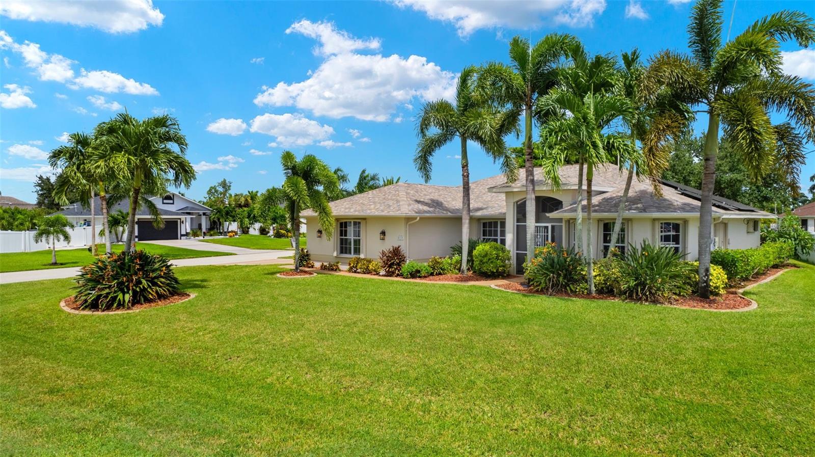 One or more photo(s) has been virtually staged. Solar energized and ready for immediate move in! Located in a lovely SW Cape Coral neighborhood and Situated on a sweeping corner lot with lush, beautiful landscaping. This inviting home is very well maintained and has a whole home solar system for energy efficiency. The screened entryway has a double doors leading you into a great room offering a large living area and formal dining. A wood burning fireplace is a focal point and a cozy spot to enjoy a chilly evening. High vaulted ceilings and tile flooring throughout. The large kitchen has updates to include granite counters, newer appliances plus pull out shelves in the cabinets and a great breakfast bar that joins the dinette area. Split bedrooms giving privacy to your guests with 2 bedrooms and a shared bathroom. A much appreciated office, den or multi use room in the front with lots of natural sunlight coming through the bay window. The Primary bedroom features French doors that lead to the lanai plus an attached bath that includes dual vanities, a large soaking tub and a huge tiled shower, and two walk in closets. A beautiful backyard with a lovely shade tree you can enjoy from the screened lanai. You'll have peace of mind with a newer roof and water heater, Accordion hurricane shutters for every window that have also been updated in recent years. Fresh paint for the driveway, walk, and lanai, epoxy floored garage that has room for storage, new exterior lighting and new sprinklers to keep the yard looking sharp. Keep your electric bill low having the solar for the whole home. This home has so much to offer and you must see it to appreciate it's value. Come take a look today