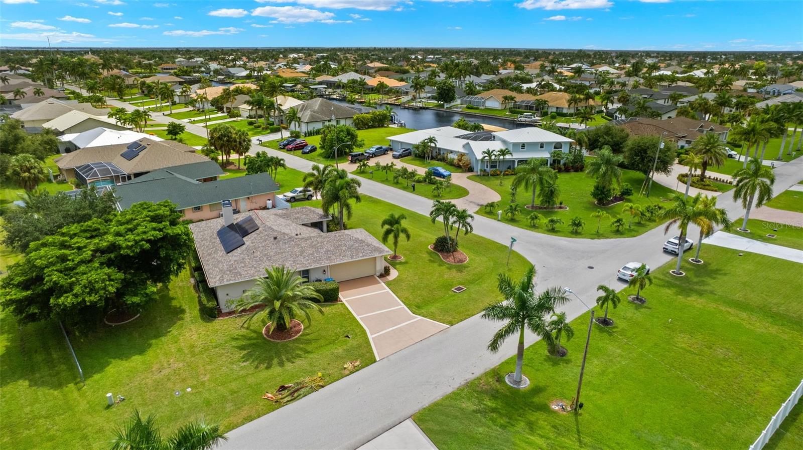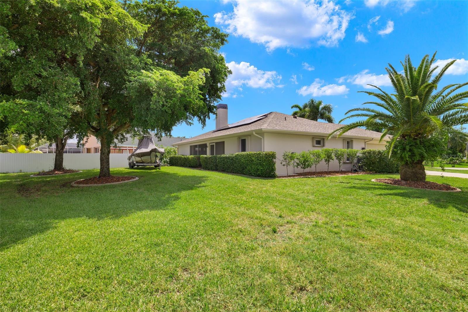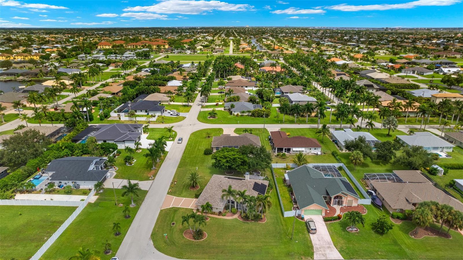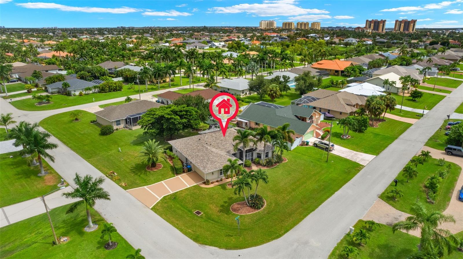 One or more photo(s) has been virtually staged. Solar energized and ready for immediate move in! Located in a lovely SW Cape Coral neighborhood and Situated on a sweeping corner lot with lush, beautiful landscaping. This inviting home is very well maintained and has a whole home solar system for energy efficiency. The screened entryway has a double doors leading you into a great room offering a large living area and formal dining. A wood burning fireplace is a focal point and a cozy spot to enjoy a chilly evening. High vaulted ceilings and tile flooring throughout. The large kitchen has updates to include granite counters, newer appliances plus pull out shelves in the cabinets and a great breakfast bar that joins the dinette area. Split bedrooms giving privacy to your guests with 2 bedrooms and a shared bathroom. A much appreciated office, den or multi use room in the front with lots of natural sunlight coming through the bay window. The Primary bedroom features French doors that lead to the lanai plus an attached bath that includes dual vanities, a large soaking tub and a huge tiled shower, and two walk in closets. A beautiful backyard with a lovely shade tree you can enjoy from the screened lanai. You'll have peace of mind with a newer roof and water heater, Accordion hurricane shutters for every window that have also been updated in recent years. Fresh paint for the driveway, walk, and lanai, epoxy floored garage that has room for storage, new exterior lighting and new sprinklers to keep the yard looking sharp. Keep your electric bill low having the solar for the whole home. This home has so much to offer and you must see it to appreciate it's value. Come take a look today