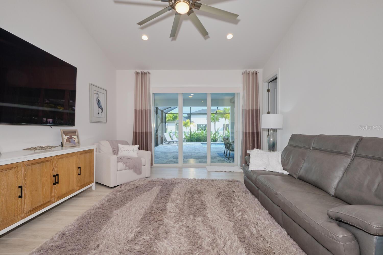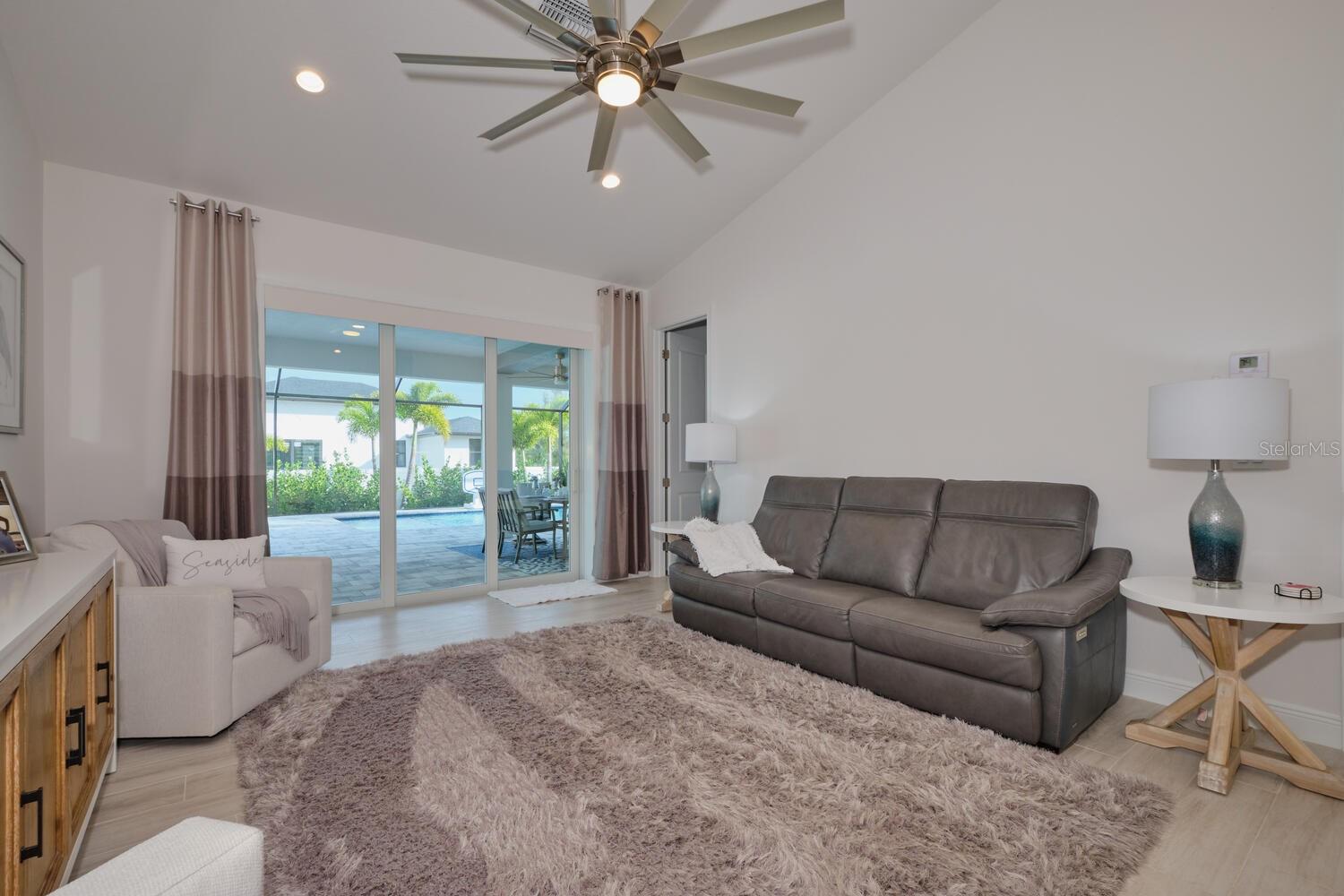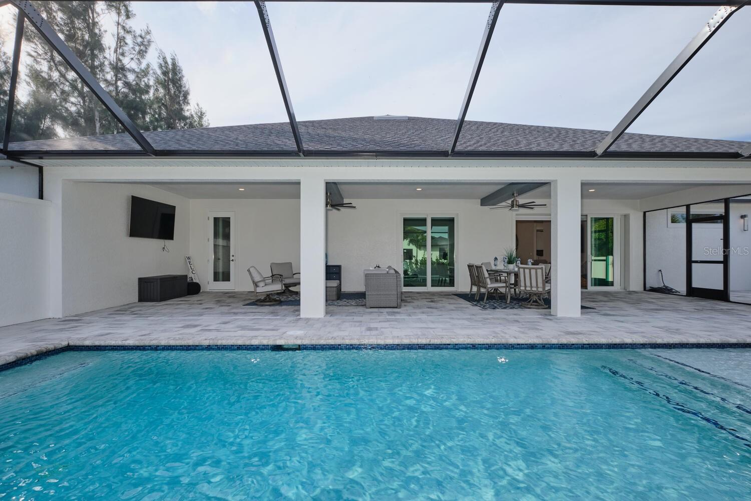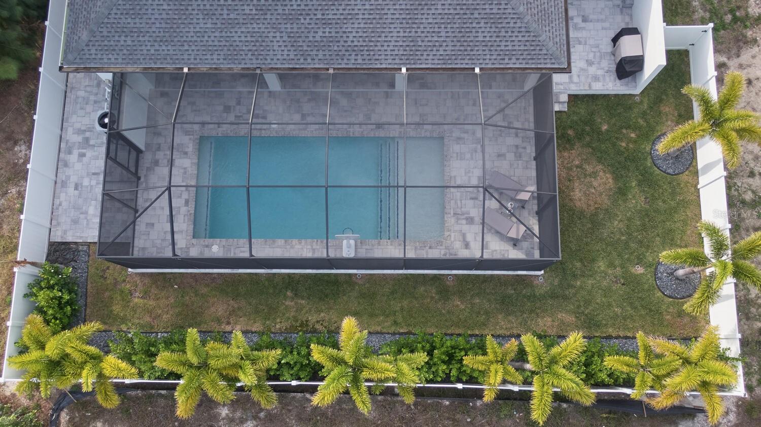DON'T MISS THIS BEAUTIFUL HOME WITH A 1200 SQ FT GARAGE! As you enter into this Magnificent home you will be captivated by the open floor plan. The Great Room features include pocket sliders, vaulted ceilings and Separate Den with glass doors. Master Bedroom features sliders, tray ceilings, & walk-in closet. Custom Master Bath with large shower, glass enclosure, & dual sinks. The Lanai features a fabulous designer salt water pool and an oversized under roof sitting area. Additional features to include PGT impact windows & doors, fully fenced & landscaped rear yard, plantation shutters, custom curtains, paver driveway & pool deck, quartz countertops, stainless steel appliances, porcelain tile flooring in the entire living area. Home is equipped with a full house reverse osmosis system. 1200 sq ft garage for 4 cars with epoxy finish floor & high ceilings for storage.