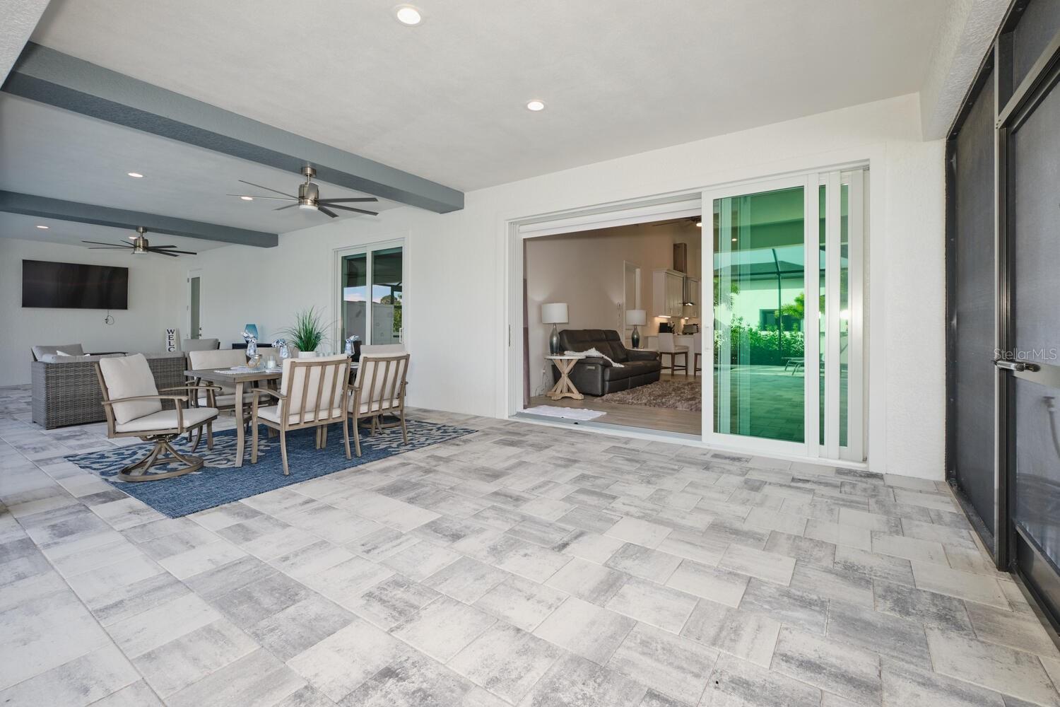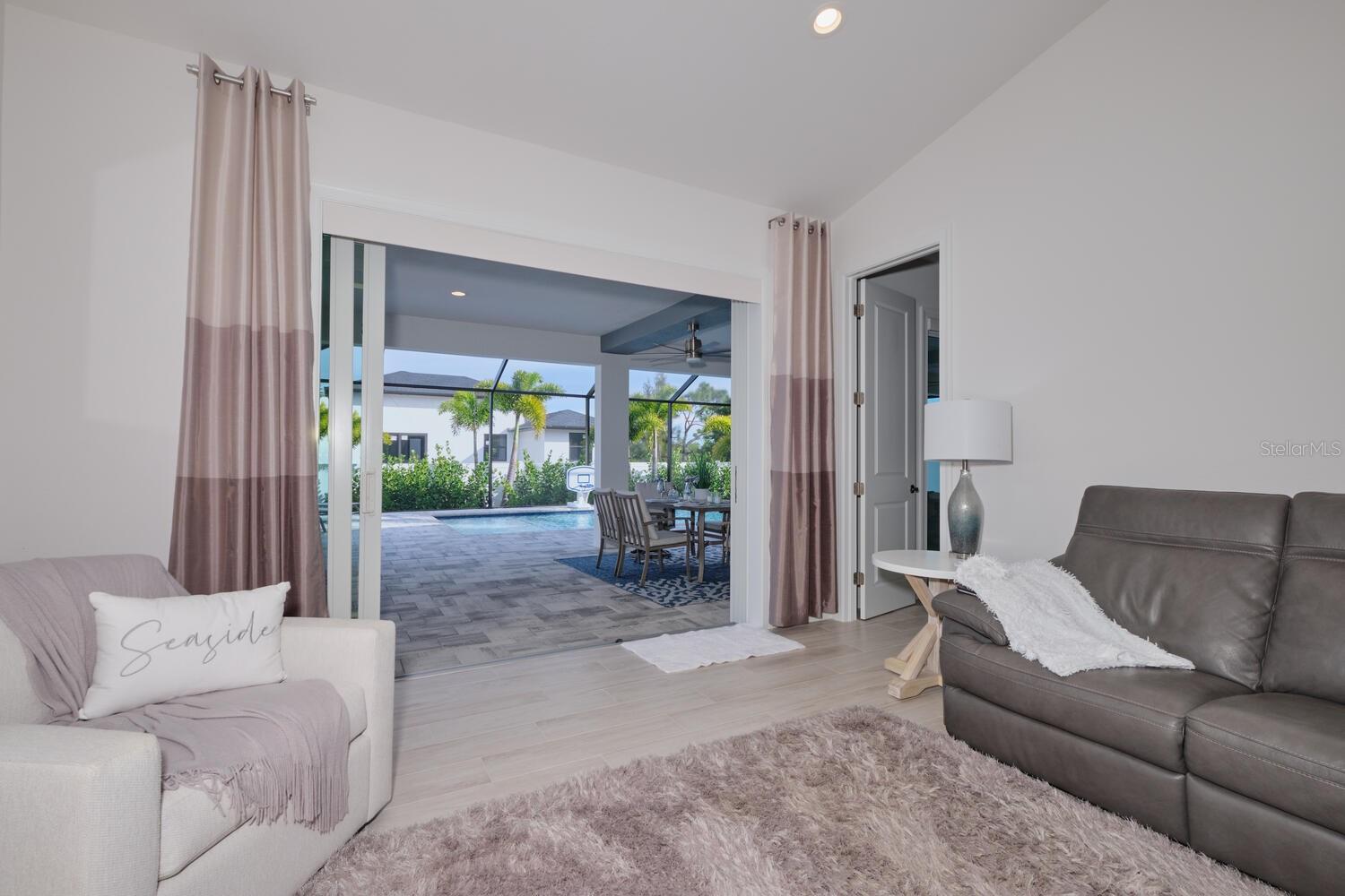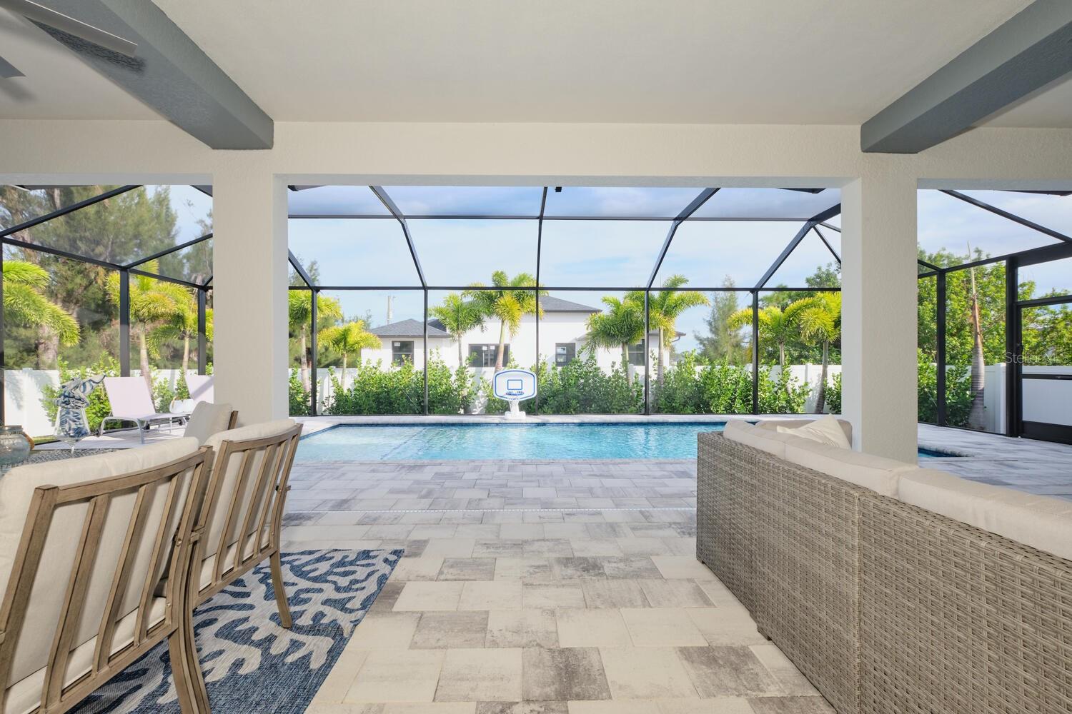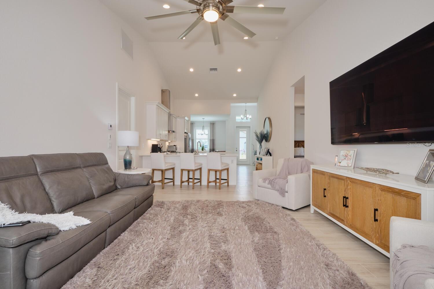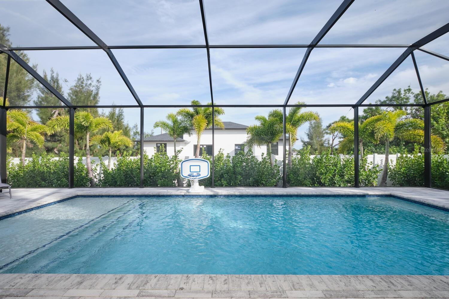 DON'T MISS THIS BEAUTIFUL HOME WITH A 1200 SQ FT GARAGE! As you enter into this Magnificent home you will be captivated by the open floor plan. The Great Room features include pocket sliders, vaulted ceilings and Separate Den with glass doors. Master Bedroom features sliders, tray ceilings, & walk-in closet. Custom Master Bath with large shower, glass enclosure, & dual sinks. The Lanai features a fabulous designer salt water pool and an oversized under roof sitting area. Additional features to include PGT impact windows & doors, fully fenced & landscaped rear yard, plantation shutters, custom curtains, paver driveway & pool deck, quartz countertops, stainless steel appliances, porcelain tile flooring in the entire living area. Home is equipped with a full house reverse osmosis system. 1200 sq ft garage for 4 cars with epoxy finish floor & high ceilings for storage.
