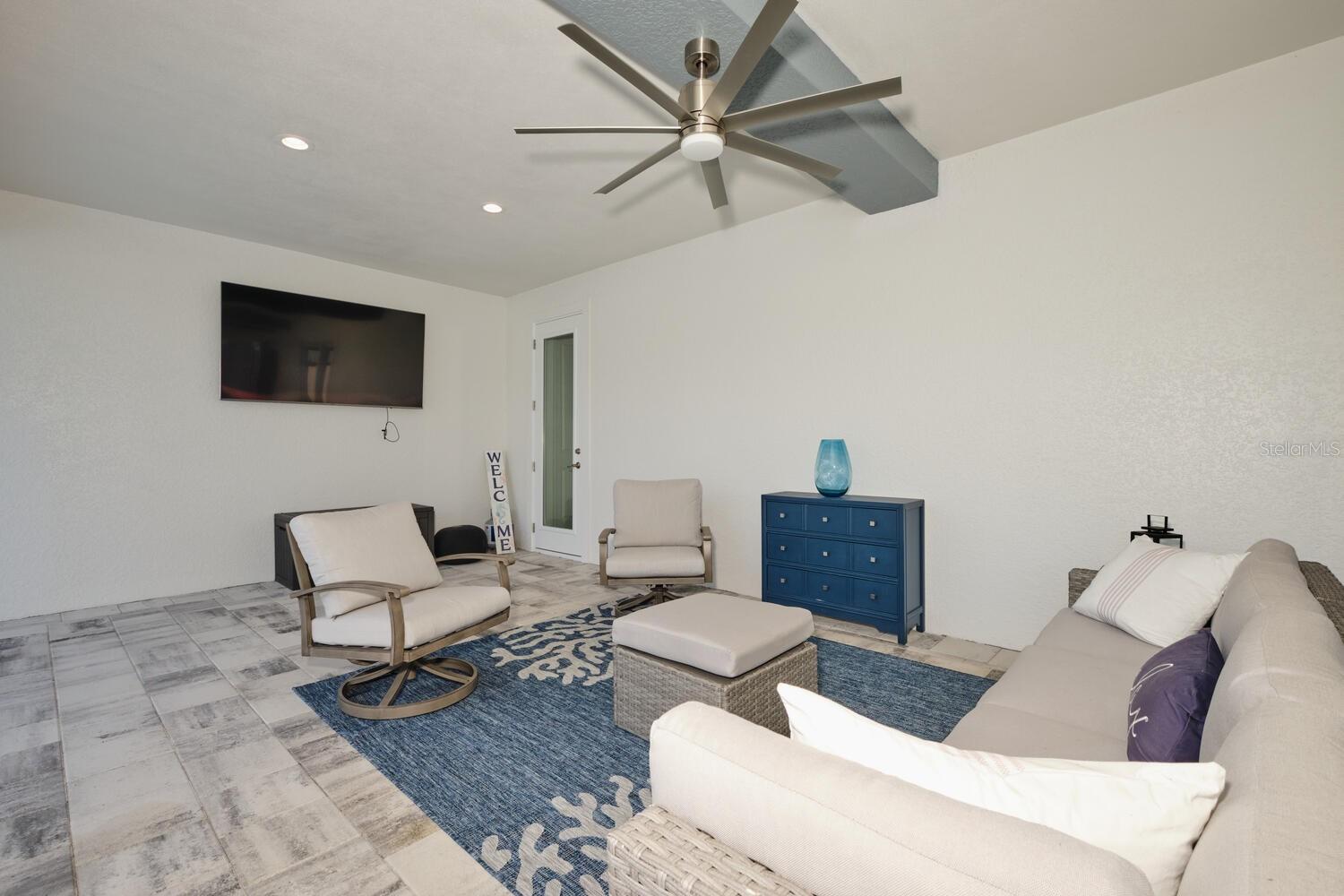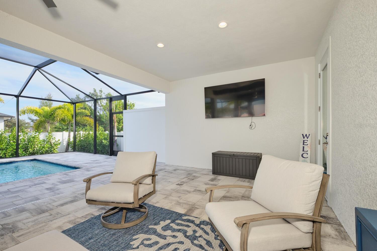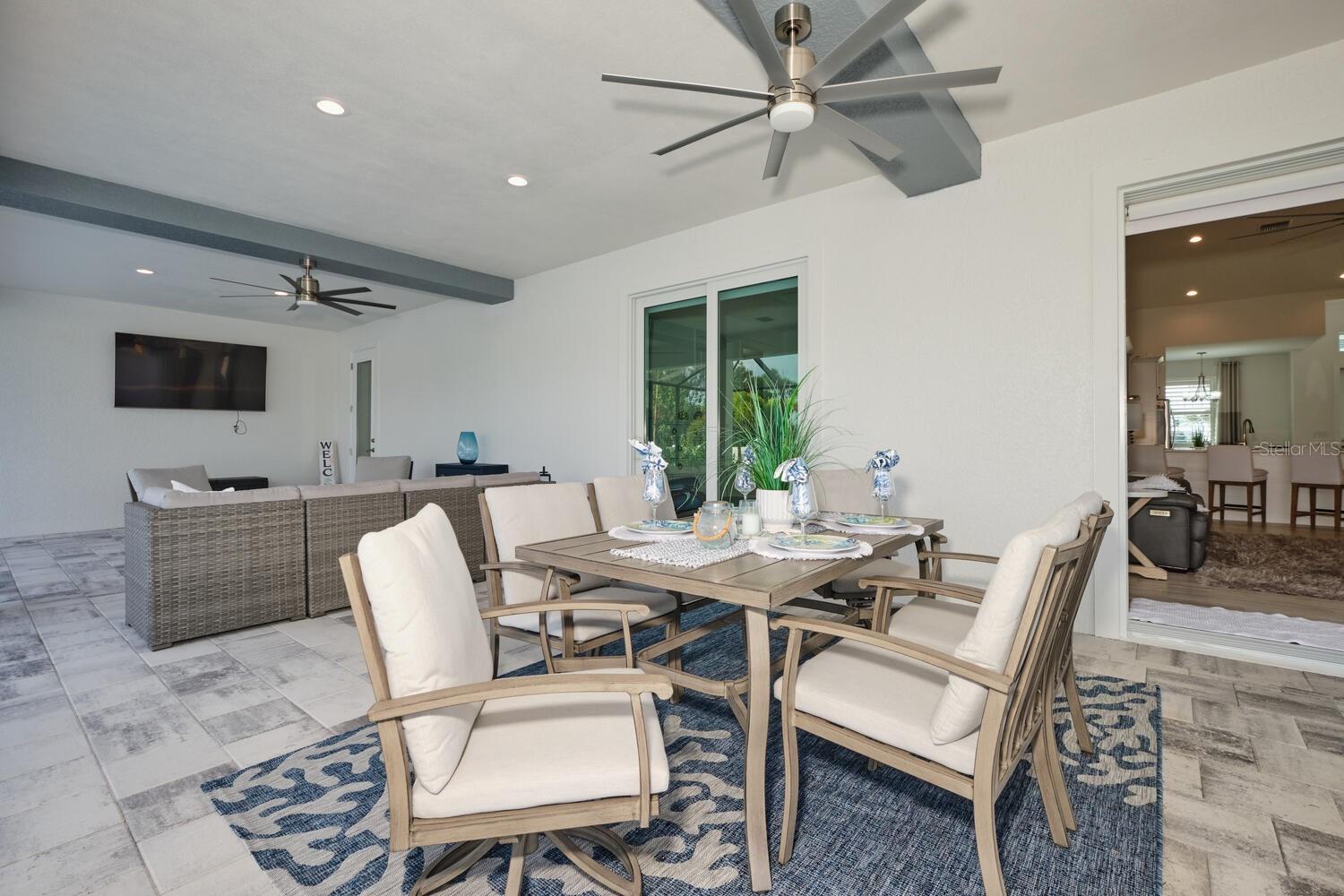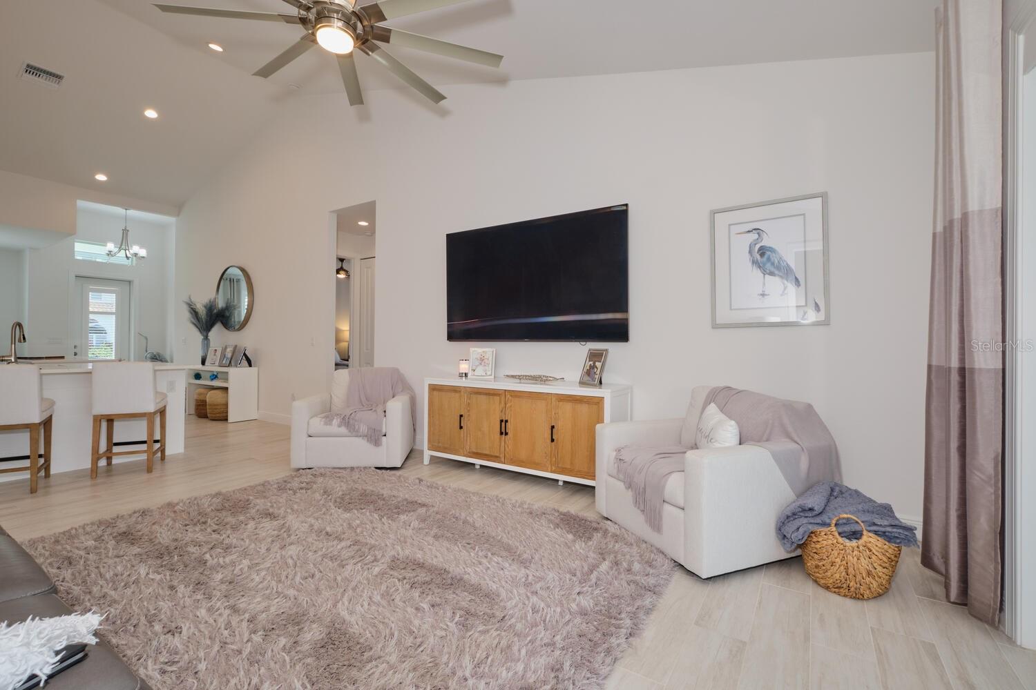 DON'T MISS THIS BEAUTIFUL HOME WITH A 1200 SQ FT GARAGE! As you enter into this Magnificent home you will be captivated by the open floor plan. The Great Room features include pocket sliders, vaulted ceilings and Separate Den with glass doors. Master Bedroom features sliders, tray ceilings, & walk-in closet. Custom Master Bath with large shower, glass enclosure, & dual sinks. The Lanai features a fabulous designer salt water pool and an oversized under roof sitting area. Additional features to include PGT impact windows & doors, fully fenced & landscaped rear yard, plantation shutters, custom curtains, paver driveway & pool deck, quartz countertops, stainless steel appliances, porcelain tile flooring in the entire living area. Home is equipped with a full house reverse osmosis system. 1200 sq ft garage for 4 cars with epoxy finish floor & high ceilings for storage.