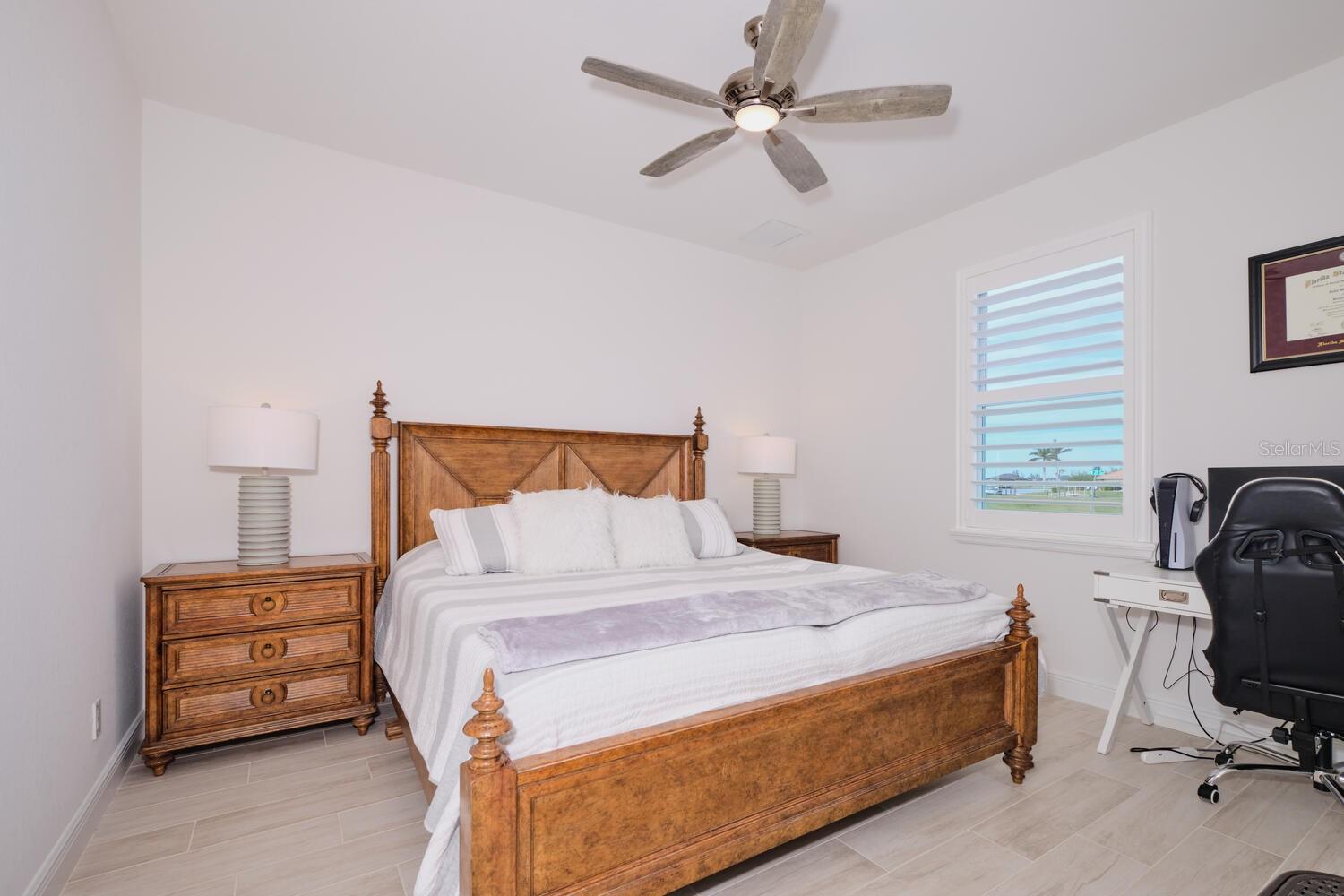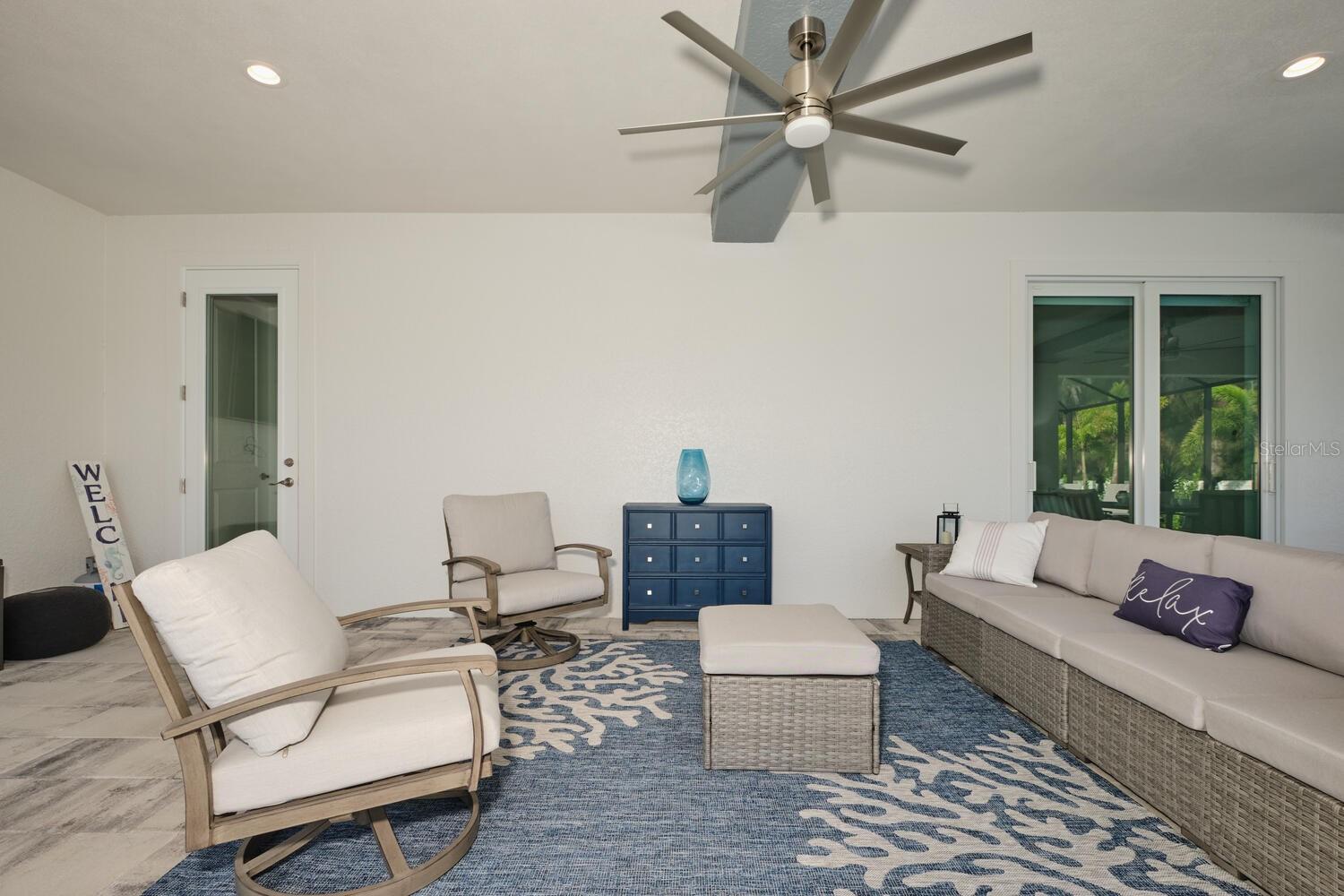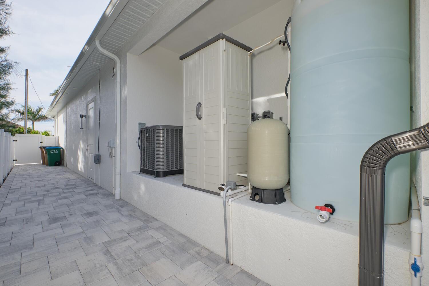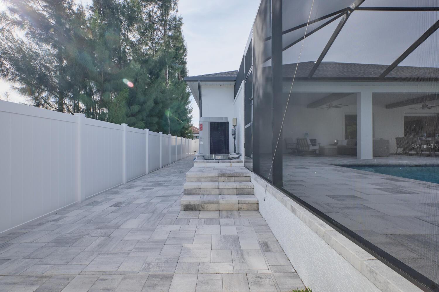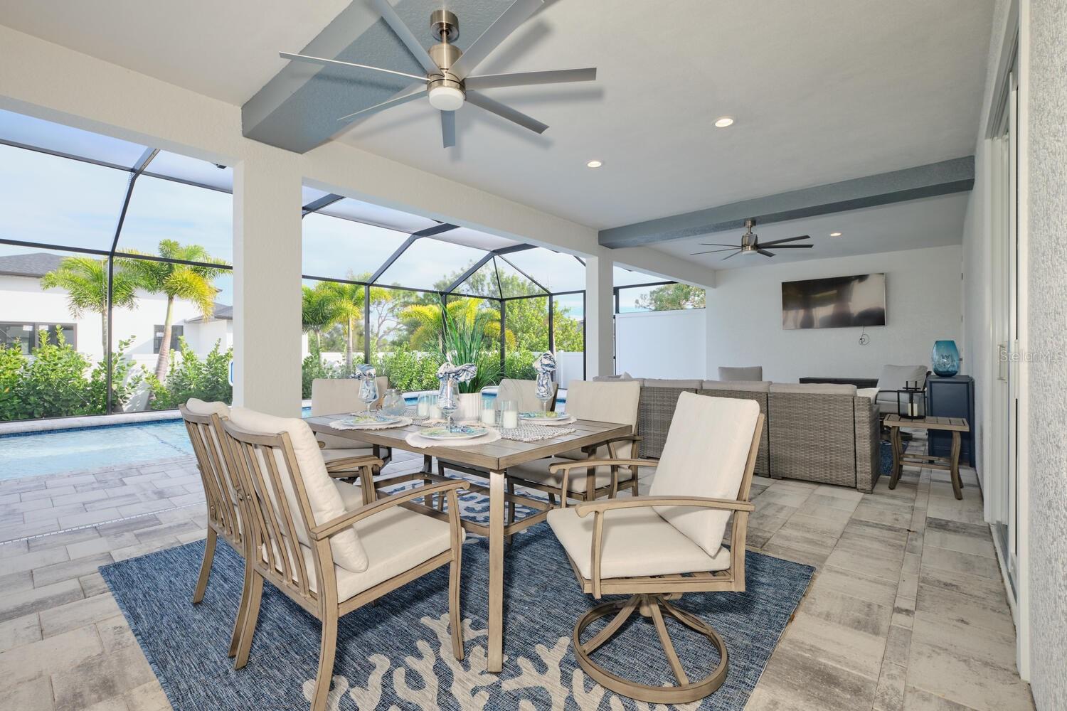 DON'T MISS THIS BEAUTIFUL HOME WITH A 1200 SQ FT GARAGE! As you enter into this Magnificent home you will be captivated by the open floor plan. The Great Room features include pocket sliders, vaulted ceilings and Separate Den with glass doors. Master Bedroom features sliders, tray ceilings, & walk-in closet. Custom Master Bath with large shower, glass enclosure, & dual sinks. The Lanai features a fabulous designer salt water pool and an oversized under roof sitting area. Additional features to include PGT impact windows & doors, fully fenced & landscaped rear yard, plantation shutters, custom curtains, paver driveway & pool deck, quartz countertops, stainless steel appliances, porcelain tile flooring in the entire living area. Home is equipped with a full house reverse osmosis system. 1200 sq ft garage for 4 cars with epoxy finish floor & high ceilings for storage.