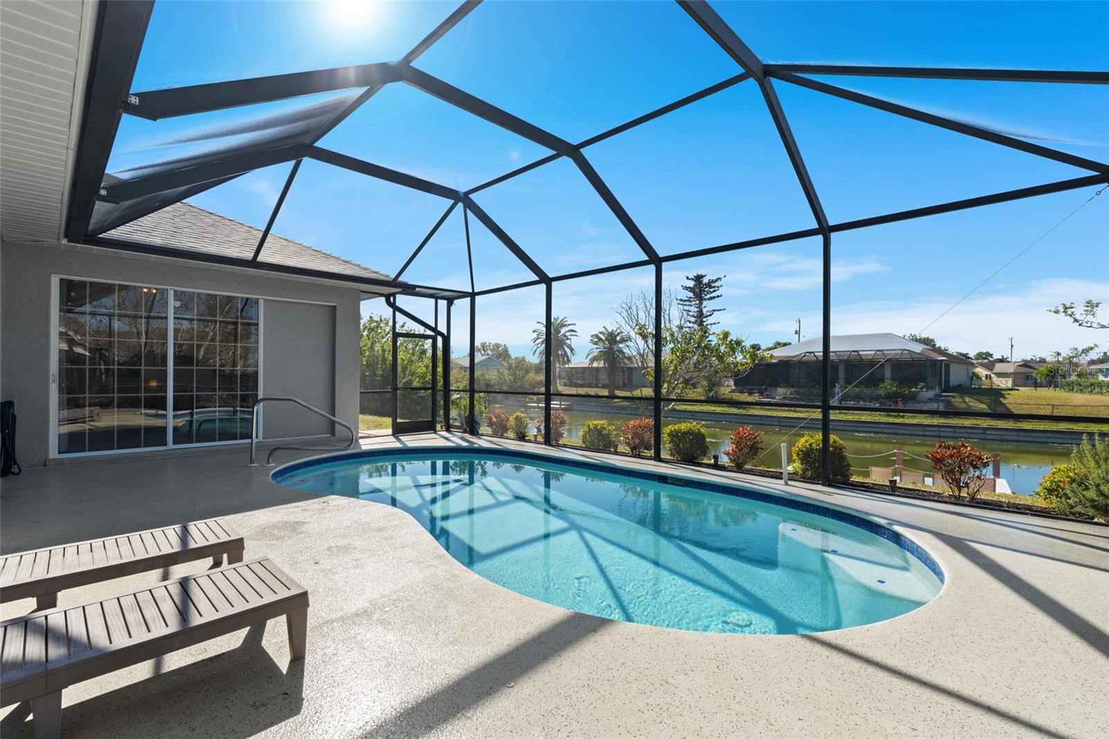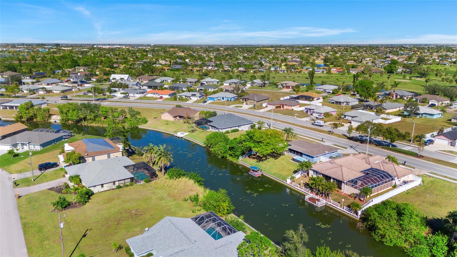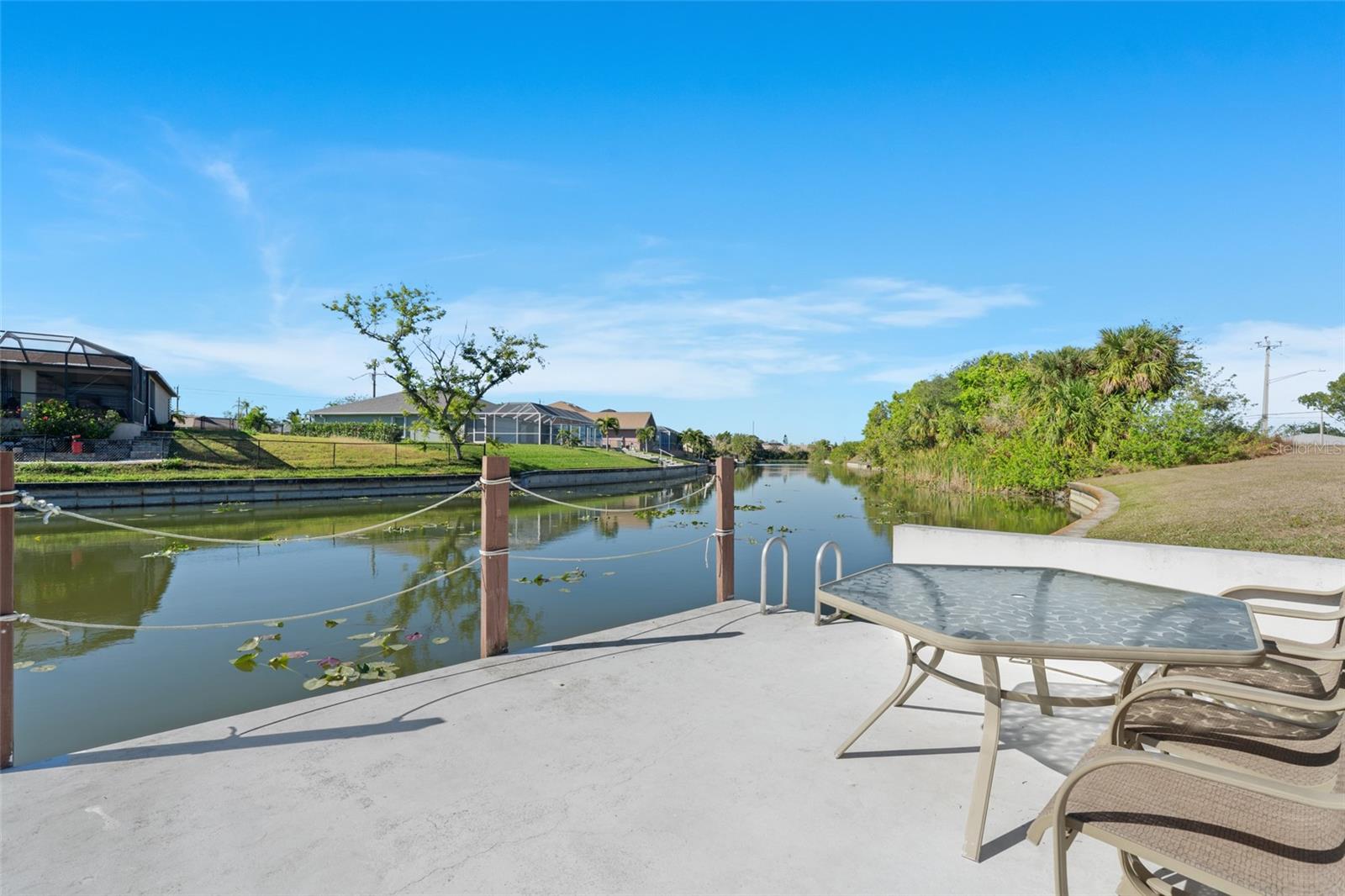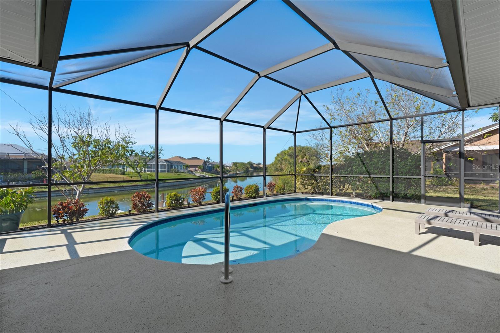 This property is being sold fully turnkey and currently operates as a successful short-term rental, presenting an excellent opportunity for investors. Discover the perfect blend of comfort, style, and convenience in this stunning 3-bedroom, 3-bathroom + den home, nestled on a picturesque canal with a concrete boat dock and seawall. This property did not sustain flooding from any recent hurricanes, providing peace of mind for its new owners. Whether you're kayaking, paddleboarding, or simply enjoying the serene waterfront views, this property offers a quintessential Florida lifestyle. The open floor plan welcomes you with vaulted ceilings, creating an airy and spacious feel throughout the main living areas. The kitchen, a true heart of the home, boasts updated stainless steel appliances, ample cabinet space, and a convenient built-in desk. Adjacent to the kitchen, the informal dining area offers beautiful views of the pool and screened lanai, making it the perfect spot to start your day. The primary suite is a private retreat with generous space for a king-sized bed, a large walk-in closet with extra storage, and an ensuite bathroom featuring a luxurious jetted tub and separate walk-in shower. Each additional bedroom comes with its own full bathroom, ensuring comfort and privacy for family or guests. Step outside to the expansive screened lanai and pool area, where entertaining is effortless. The heated saltwater pool, equipped with a new saltwater system and pool heater, offers year-round enjoyment. The outdoor space is ideal for hosting gatherings or simply unwinding while soaking up the Florida sunshine. The home also features a brand-new roof, adding to its value and appeal. The attached two-car garage provides additional storage with shelving that conveys with the home. Located just off Santa Barbara Boulevard, this home is minutes from shopping, dining, and biking trails, offering unparalleled convenience without sacrificing tranquility. Don’t miss the opportunity to make this exceptional home your private oasis. Come and experience the best of Cape Coral living!