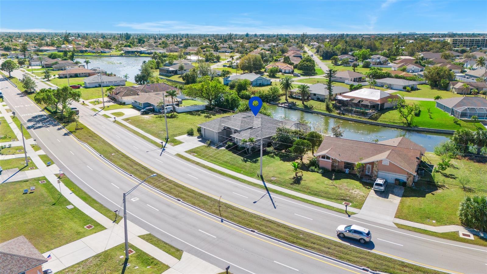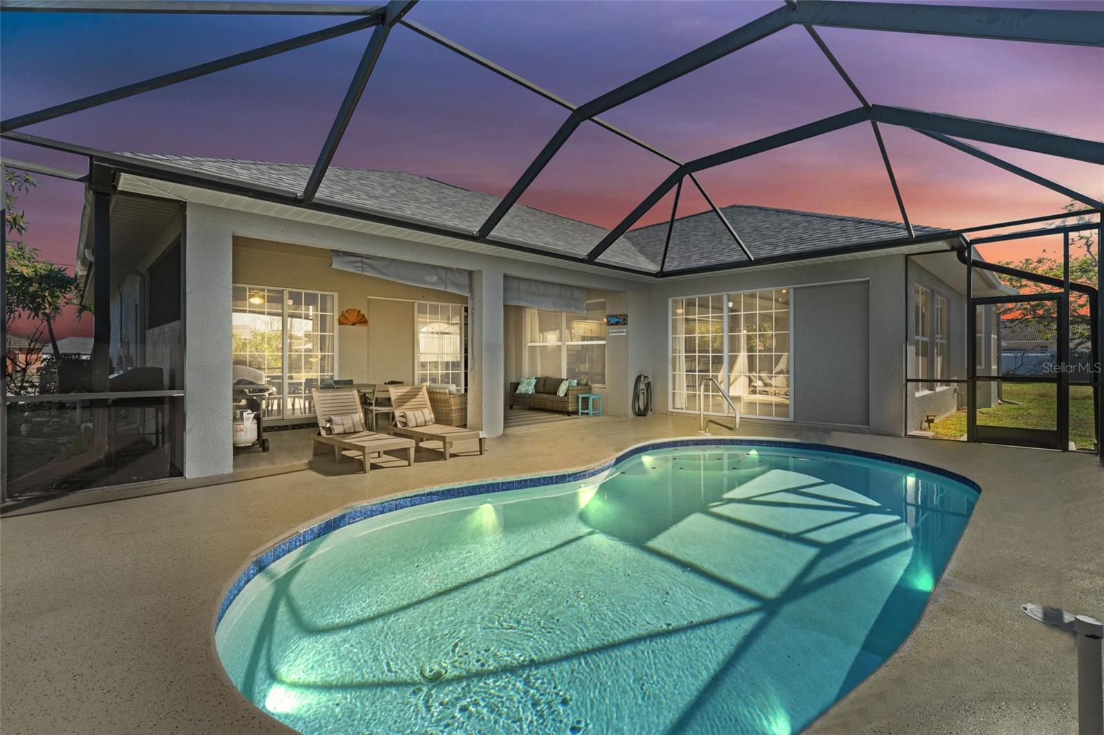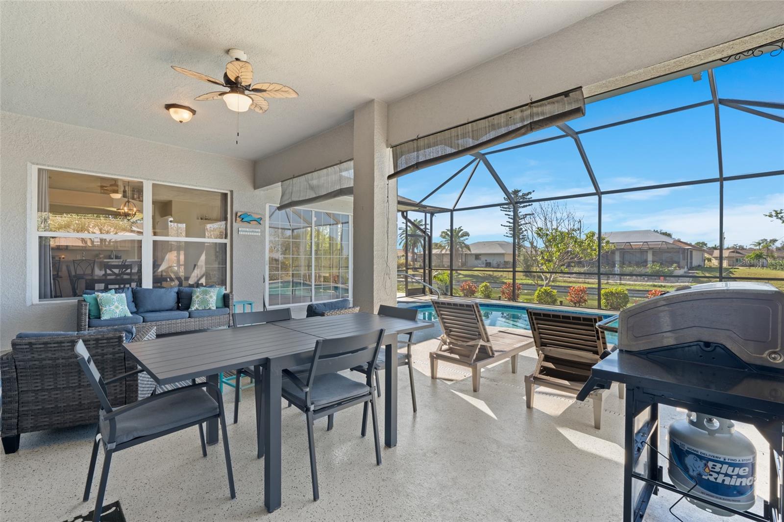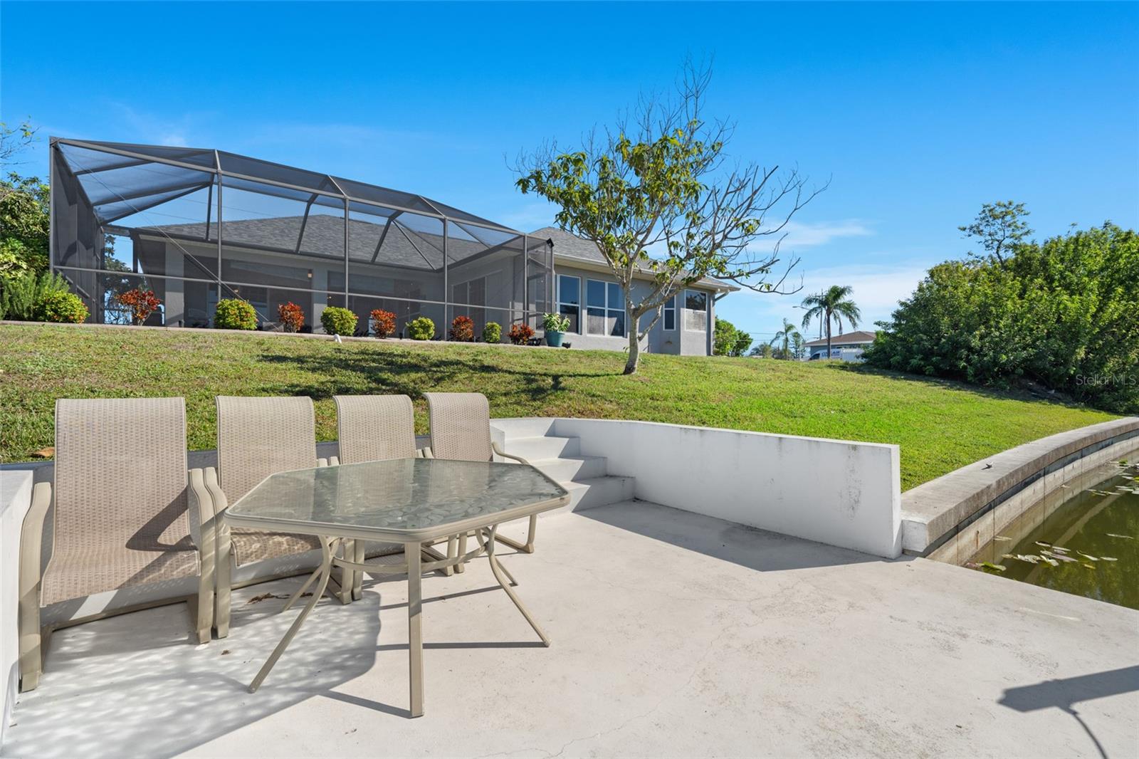 This property is being sold fully turnkey and currently operates as a successful short-term rental, presenting an excellent opportunity for investors. Discover the perfect blend of comfort, style, and convenience in this stunning 3-bedroom, 3-bathroom + den home, nestled on a picturesque canal with a concrete boat dock and seawall. This property did not sustain flooding from any recent hurricanes, providing peace of mind for its new owners. Whether you're kayaking, paddleboarding, or simply enjoying the serene waterfront views, this property offers a quintessential Florida lifestyle. The open floor plan welcomes you with vaulted ceilings, creating an airy and spacious feel throughout the main living areas. The kitchen, a true heart of the home, boasts updated stainless steel appliances, ample cabinet space, and a convenient built-in desk. Adjacent to the kitchen, the informal dining area offers beautiful views of the pool and screened lanai, making it the perfect spot to start your day. The primary suite is a private retreat with generous space for a king-sized bed, a large walk-in closet with extra storage, and an ensuite bathroom featuring a luxurious jetted tub and separate walk-in shower. Each additional bedroom comes with its own full bathroom, ensuring comfort and privacy for family or guests. Step outside to the expansive screened lanai and pool area, where entertaining is effortless. The heated saltwater pool, equipped with a new saltwater system and pool heater, offers year-round enjoyment. The outdoor space is ideal for hosting gatherings or simply unwinding while soaking up the Florida sunshine. The home also features a brand-new roof, adding to its value and appeal. The attached two-car garage provides additional storage with shelving that conveys with the home. Located just off Santa Barbara Boulevard, this home is minutes from shopping, dining, and biking trails, offering unparalleled convenience without sacrificing tranquility. Don’t miss the opportunity to make this exceptional home your private oasis. Come and experience the best of Cape Coral living!