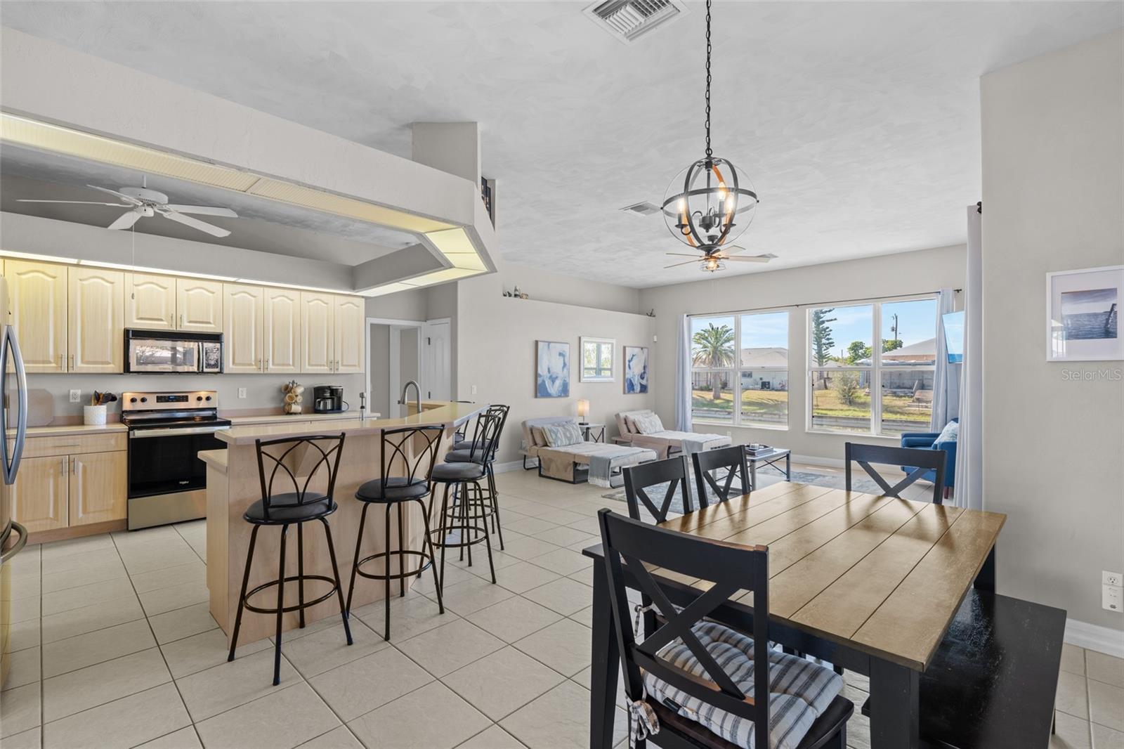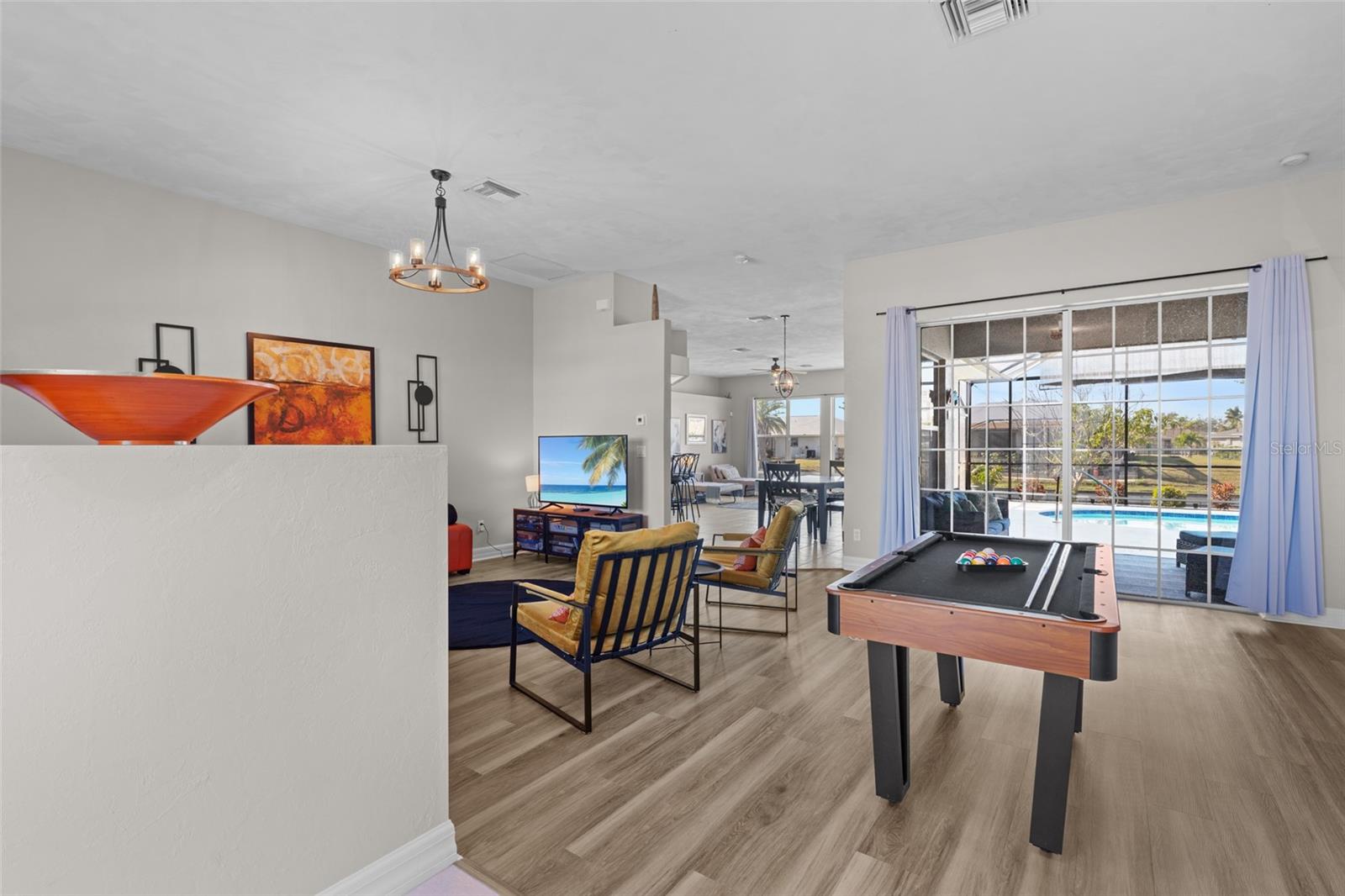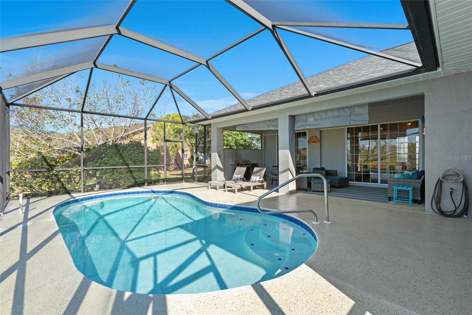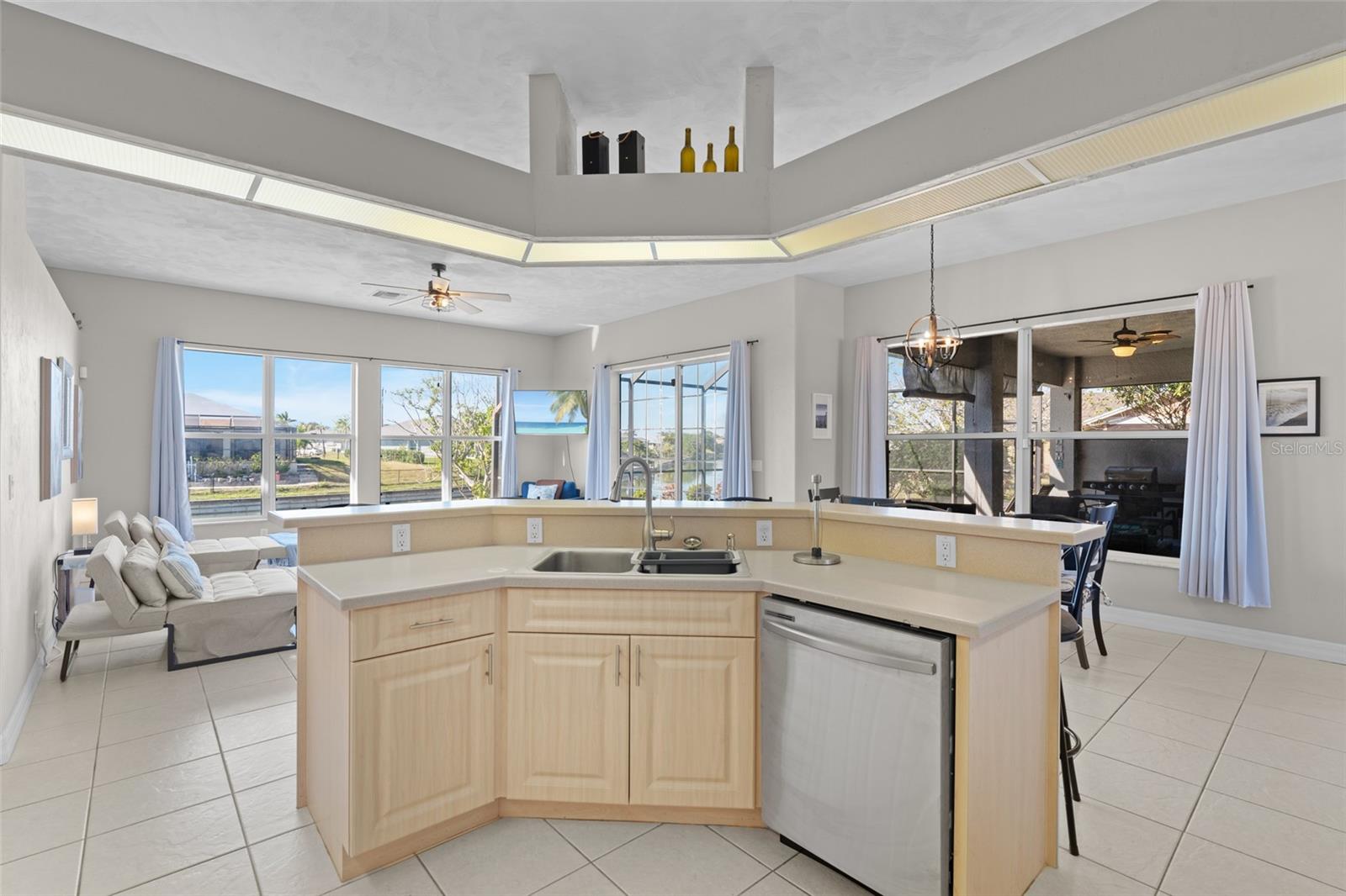 This property is being sold fully turnkey and currently operates as a successful short-term rental, presenting an excellent opportunity for investors. Discover the perfect blend of comfort, style, and convenience in this stunning 3-bedroom, 3-bathroom + den home, nestled on a picturesque canal with a concrete boat dock and seawall. This property did not sustain flooding from any recent hurricanes, providing peace of mind for its new owners. Whether you're kayaking, paddleboarding, or simply enjoying the serene waterfront views, this property offers a quintessential Florida lifestyle. The open floor plan welcomes you with vaulted ceilings, creating an airy and spacious feel throughout the main living areas. The kitchen, a true heart of the home, boasts updated stainless steel appliances, ample cabinet space, and a convenient built-in desk. Adjacent to the kitchen, the informal dining area offers beautiful views of the pool and screened lanai, making it the perfect spot to start your day. The primary suite is a private retreat with generous space for a king-sized bed, a large walk-in closet with extra storage, and an ensuite bathroom featuring a luxurious jetted tub and separate walk-in shower. Each additional bedroom comes with its own full bathroom, ensuring comfort and privacy for family or guests. Step outside to the expansive screened lanai and pool area, where entertaining is effortless. The heated saltwater pool, equipped with a new saltwater system and pool heater, offers year-round enjoyment. The outdoor space is ideal for hosting gatherings or simply unwinding while soaking up the Florida sunshine. The home also features a brand-new roof, adding to its value and appeal. The attached two-car garage provides additional storage with shelving that conveys with the home. Located just off Santa Barbara Boulevard, this home is minutes from shopping, dining, and biking trails, offering unparalleled convenience without sacrificing tranquility. Don’t miss the opportunity to make this exceptional home your private oasis. Come and experience the best of Cape Coral living!