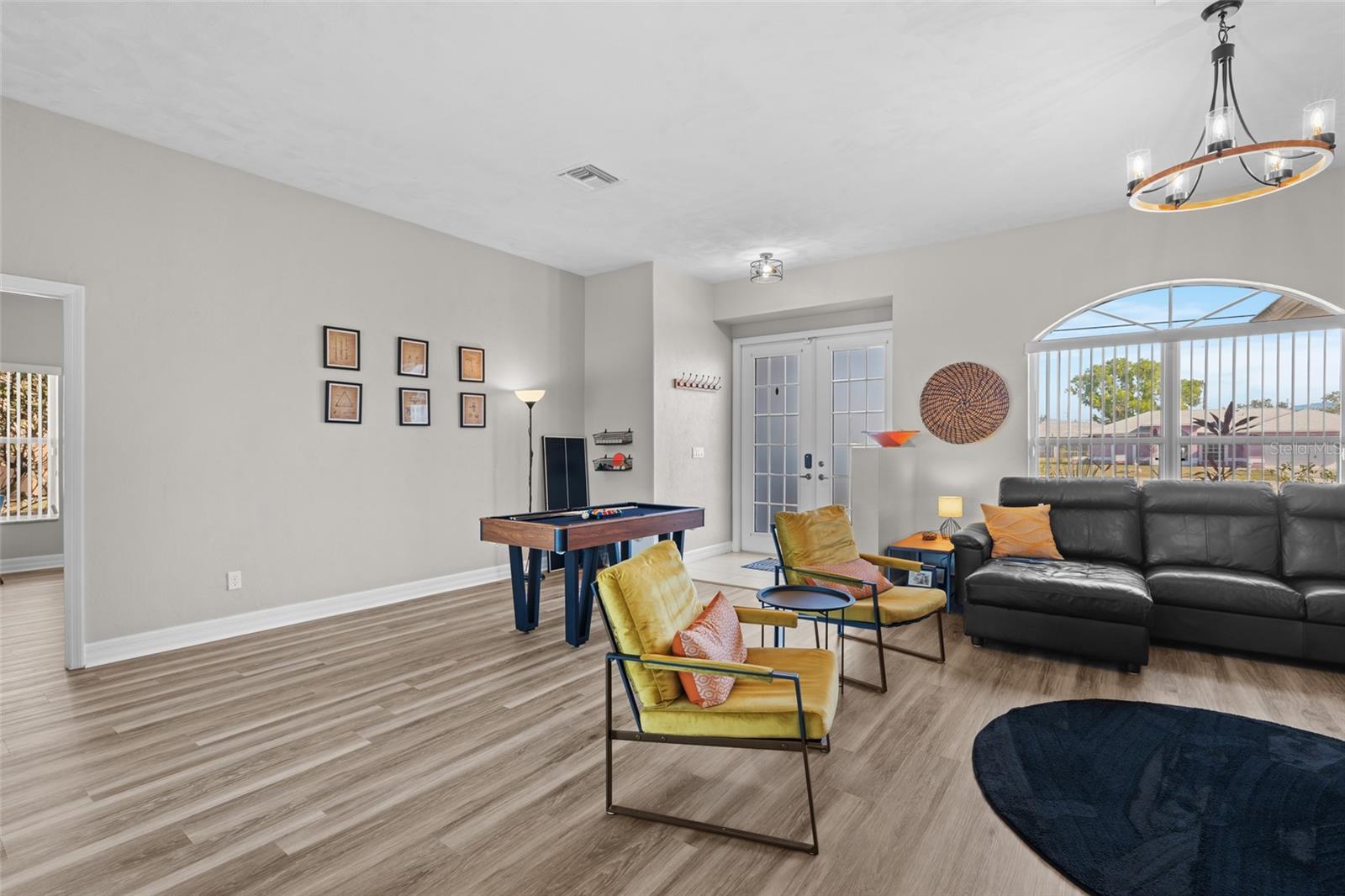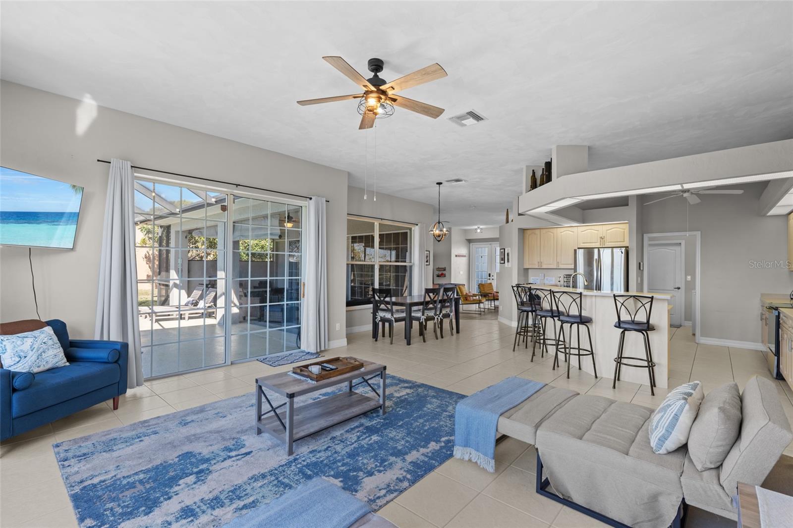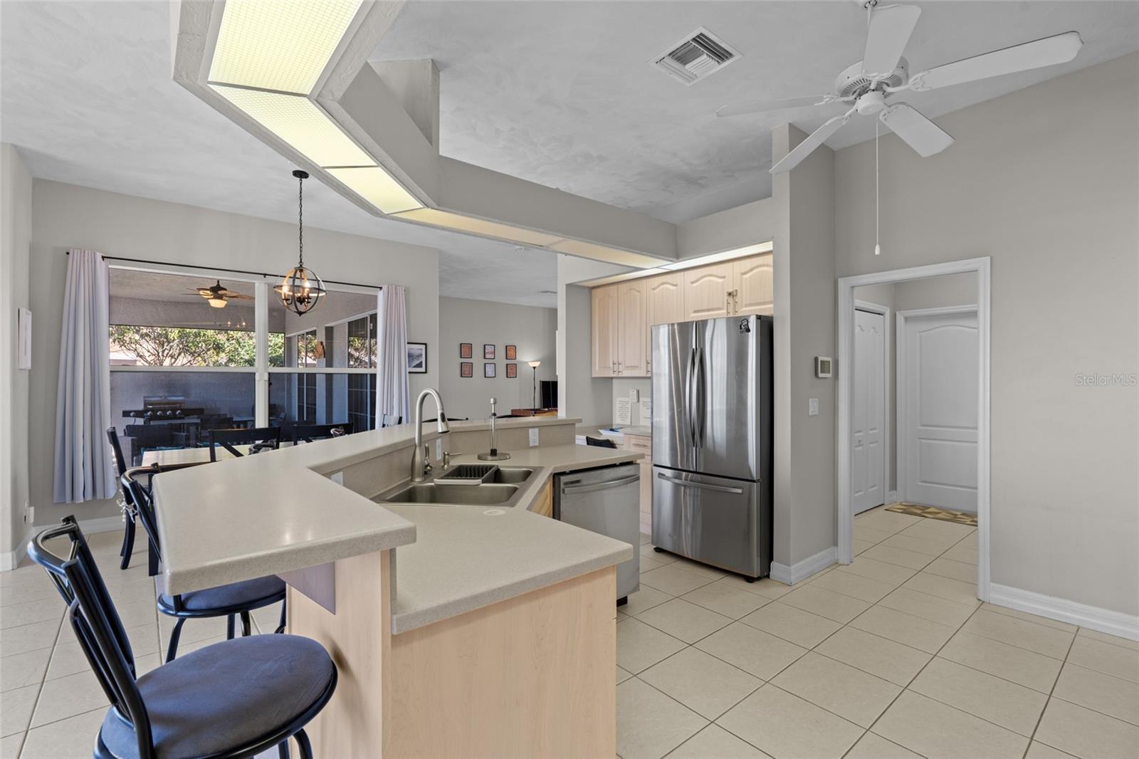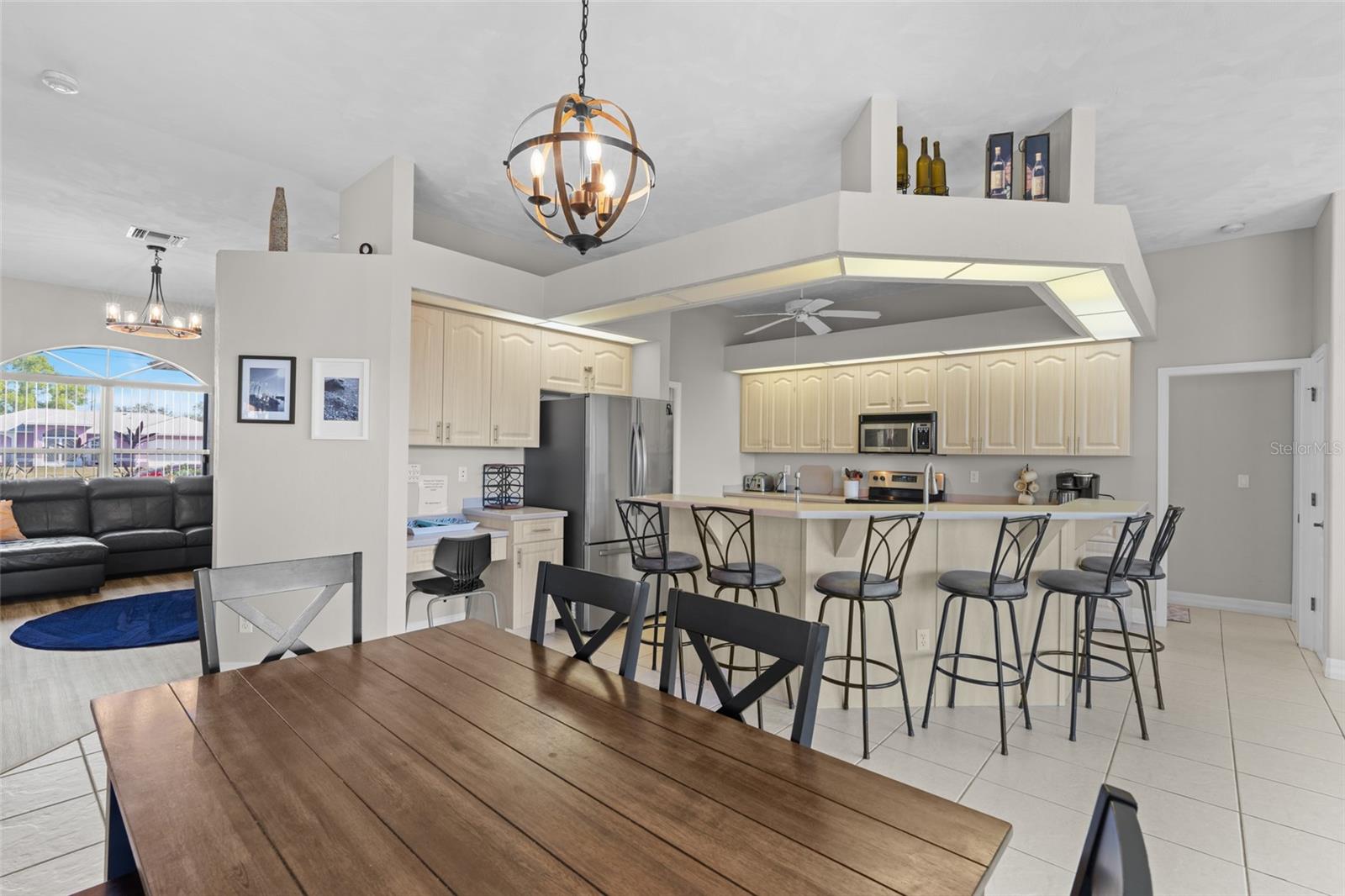 This property is being sold fully turnkey and currently operates as a successful short-term rental, presenting an excellent opportunity for investors. Discover the perfect blend of comfort, style, and convenience in this stunning 3-bedroom, 3-bathroom + den home, nestled on a picturesque canal with a concrete boat dock and seawall. This property did not sustain flooding from any recent hurricanes, providing peace of mind for its new owners. Whether you're kayaking, paddleboarding, or simply enjoying the serene waterfront views, this property offers a quintessential Florida lifestyle. The open floor plan welcomes you with vaulted ceilings, creating an airy and spacious feel throughout the main living areas. The kitchen, a true heart of the home, boasts updated stainless steel appliances, ample cabinet space, and a convenient built-in desk. Adjacent to the kitchen, the informal dining area offers beautiful views of the pool and screened lanai, making it the perfect spot to start your day. The primary suite is a private retreat with generous space for a king-sized bed, a large walk-in closet with extra storage, and an ensuite bathroom featuring a luxurious jetted tub and separate walk-in shower. Each additional bedroom comes with its own full bathroom, ensuring comfort and privacy for family or guests. Step outside to the expansive screened lanai and pool area, where entertaining is effortless. The heated saltwater pool, equipped with a new saltwater system and pool heater, offers year-round enjoyment. The outdoor space is ideal for hosting gatherings or simply unwinding while soaking up the Florida sunshine. The home also features a brand-new roof, adding to its value and appeal. The attached two-car garage provides additional storage with shelving that conveys with the home. Located just off Santa Barbara Boulevard, this home is minutes from shopping, dining, and biking trails, offering unparalleled convenience without sacrificing tranquility. Don’t miss the opportunity to make this exceptional home your private oasis. Come and experience the best of Cape Coral living!