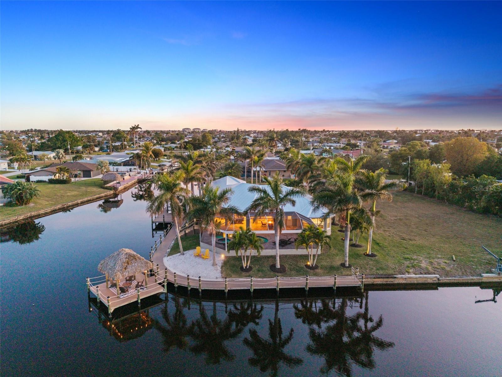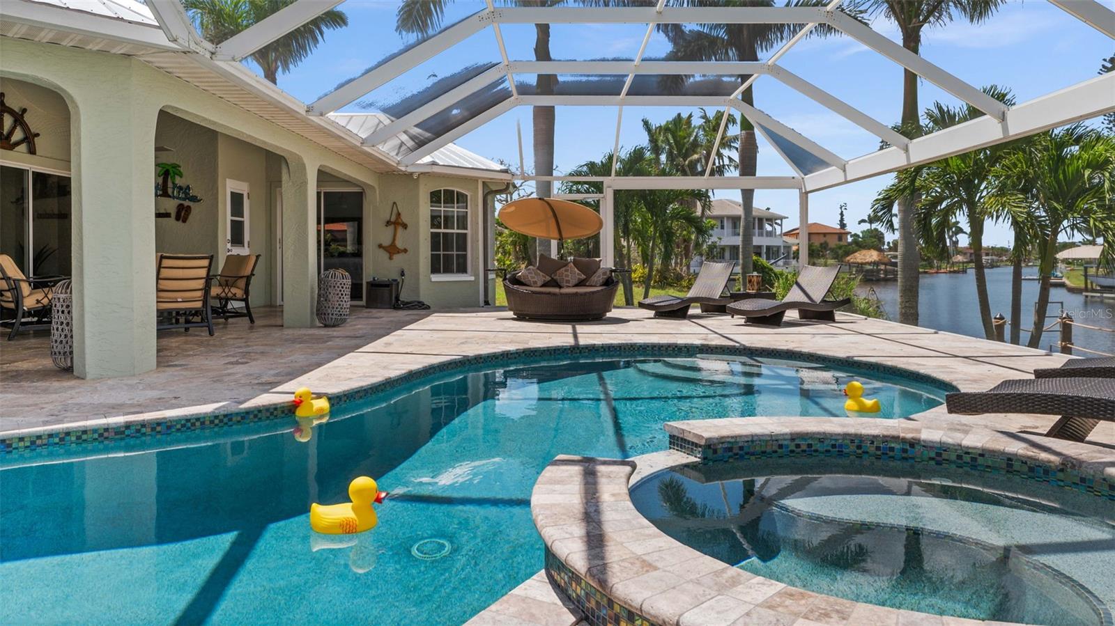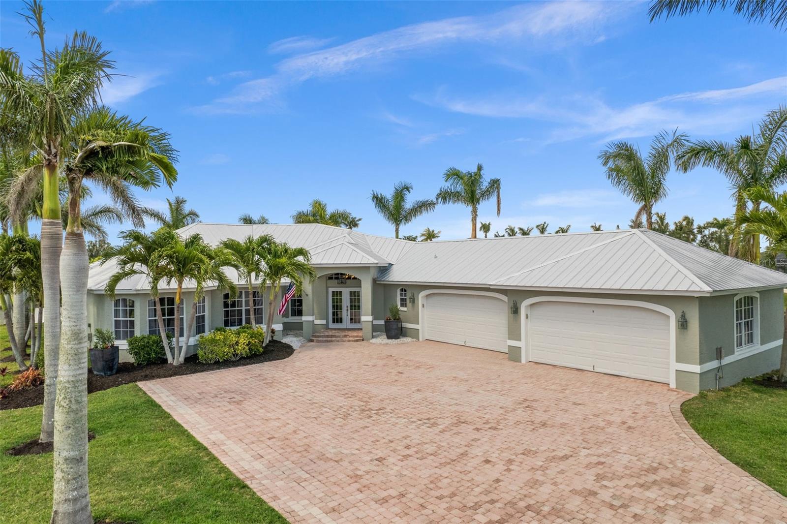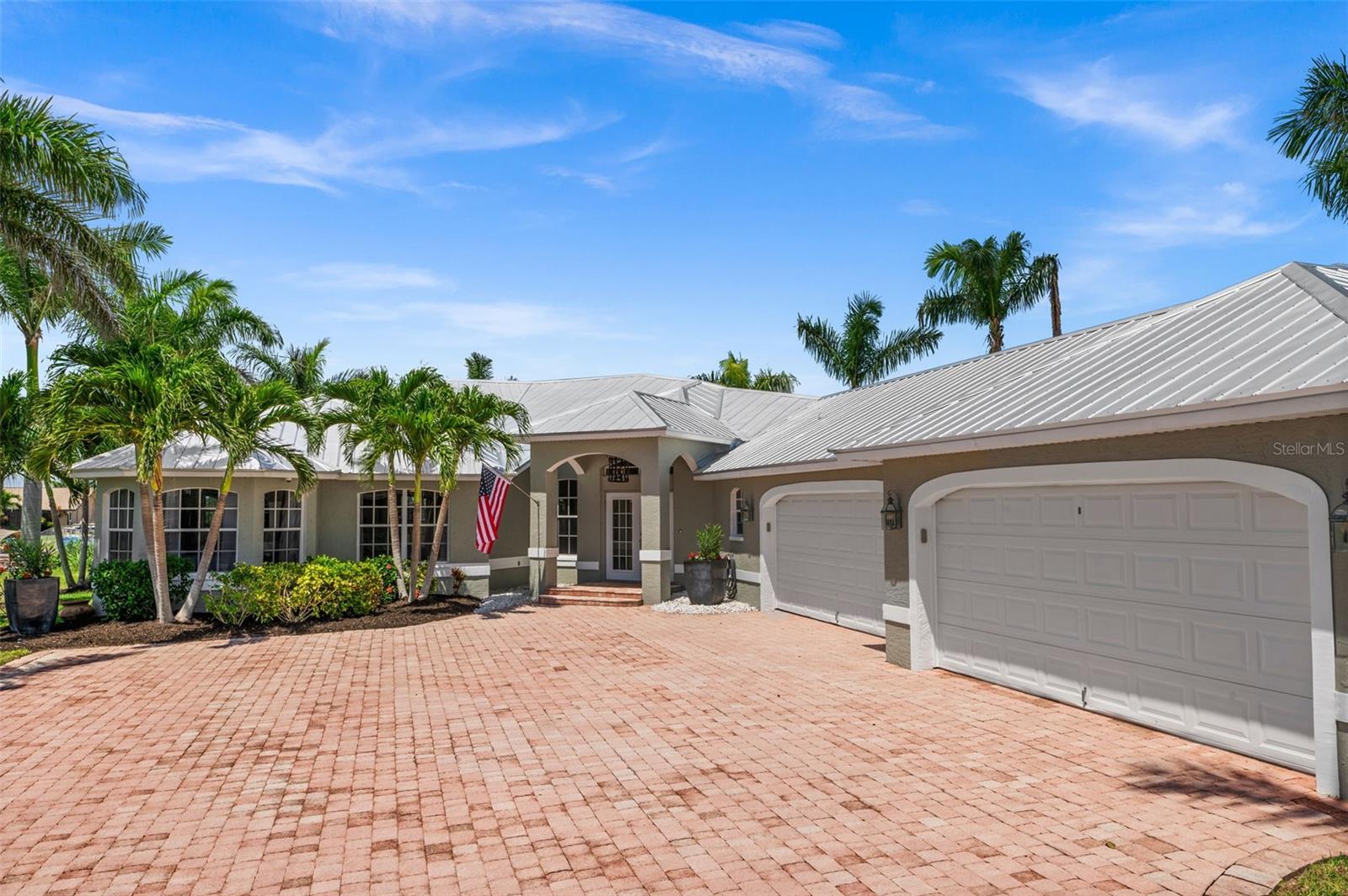 Welcome to 5111 Calusa Ct, a rare waterfront gem offering a premium lot with breathtaking intersecting canal and basin views. This lush and tropical one-third-acre property sits at the end of a cul-de-sac on a hammerhead lot, providing privacy, tranquility, and an exclusive waterfront setting—a combination rarely found in Cape Coral. Enjoy sunrise views down the canals, creating a serene and picturesque backdrop every morning. This home is sold turn-key and move-in ready. Just bring your swimsuit! Designed for the ultimate boating and outdoor lifestyle, the property features 268 feet of water frontage, a wraparound captain’s walk covering most of the waterfront, a built-out dock with a 12 x 12 tiki hut, and a 16,000 lb covered boat lift. From this prime Gulf-access location, you’re just minutes away from waterfront restaurants, pristine beaches, and open-water adventures. Inside, the home offers spacious, open-concept living with soaring ceilings and sliding pocket doors that seamlessly blend indoor and outdoor spaces. The expansive covered lanai and screened-in pool area provide multiple seating areas for relaxing or entertaining while overlooking the water. The freeform pool and attached spa are surrounded by a beautifully tiled deck, making it the perfect space to enjoy the Florida lifestyle. The kitchen features granite countertops, stainless steel appliances, custom cabinetry with crown molding, a tile backsplash, custom lighting, and a breakfast bar. The master suite includes private lanai access, a walk-in closet, and a spa-inspired bathroom with dual sinks, a glass-walled steam shower, and a separate jetted tub. The split-bedroom floor plan ensures privacy for you and your guests. A rare four-car garage setup includes two separate two-car garages—one attached with interior access, and another adjacent with private entry, making it ideal for storage, rental purposes, or securing personal items. The 100-foot-long paver driveway and 30 palm trees throughout the property add to the home’s impressive curb appeal. This home has undergone significant upgrades in the last two years, including a 5V 26-gauge metal roof, a 220' captain’s walk with a 16 x 16 deck platform, a 12 x 12 tiki hut, and a 16,000 lb boat lift with a canopy above the boat. Additional improvements include a new A/C with a heat pump, a new pool pump, and four electronic hurricane carbon fiber roll-down screens on the lanai. Additional upgrades include elegant arched windows, and tile flooring throughout. Best of all, this property has never experienced flooding during any hurricane, offering security and peace of mind. This home is currently in a successfully rental program. With unparalleled water views, an oversized lot, and resort-style outdoor living, this is a rare opportunity to own one of Cape Coral’s most sought-after waterfront properties. Homes like this do not come on the market often—schedule your private showing today!