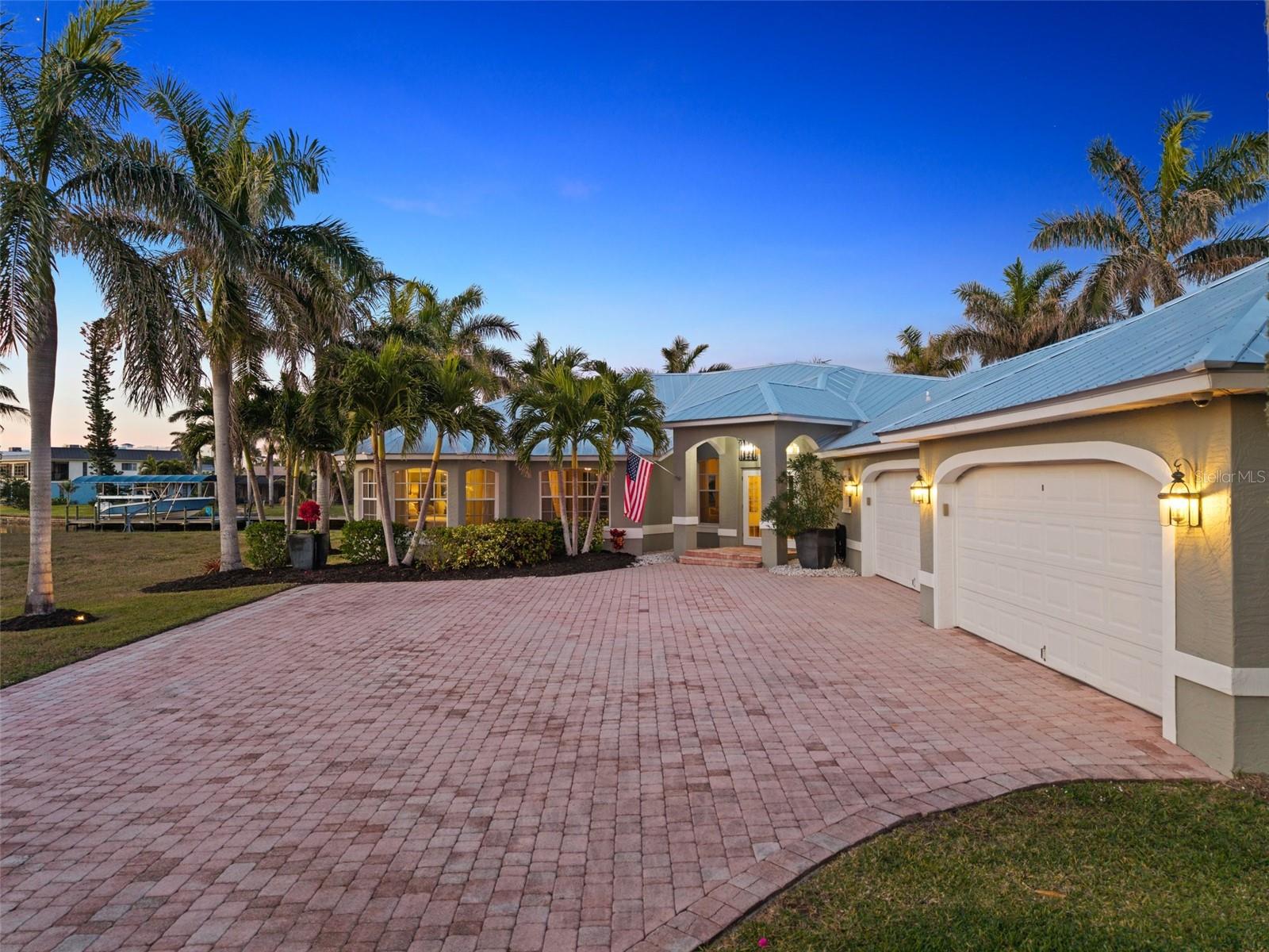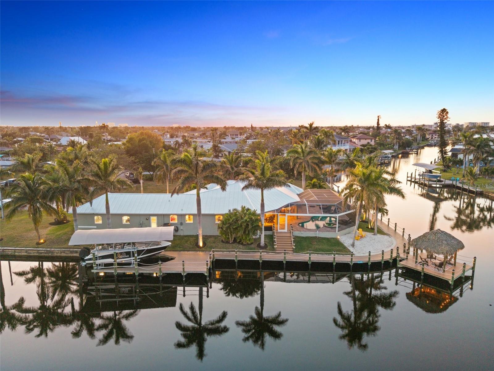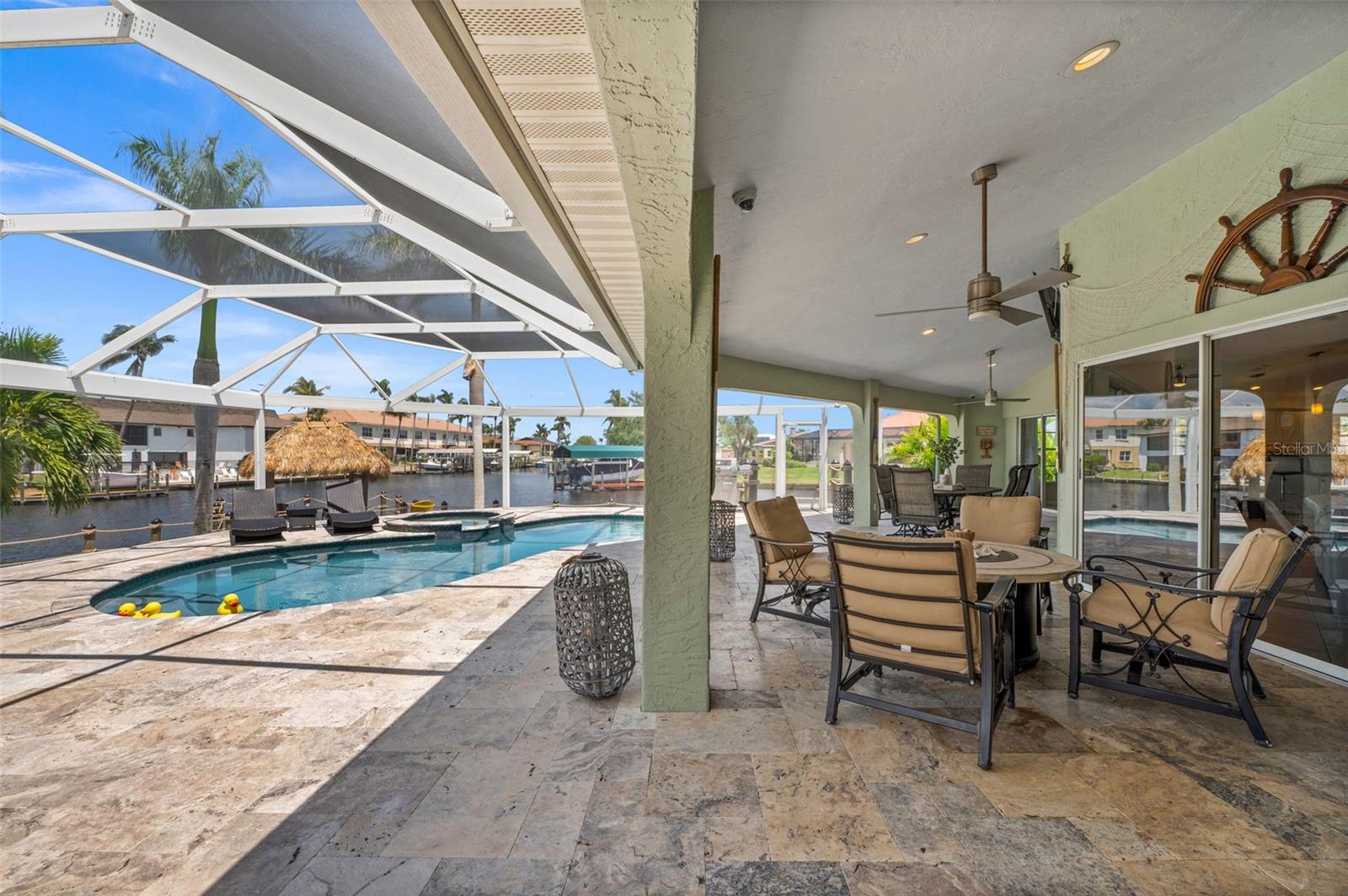 Welcome to 5111 Calusa Ct, a rare waterfront gem offering a premium lot with breathtaking intersecting canal and basin views. This lush and tropical one-third-acre property sits at the end of a cul-de-sac on a hammerhead lot, providing privacy, tranquility, and an exclusive waterfront setting—a combination rarely found in Cape Coral. Enjoy sunrise views down the canals, creating a serene and picturesque backdrop every morning. This home is sold turn-key and move-in ready. Just bring your swimsuit! Designed for the ultimate boating and outdoor lifestyle, the property features 268 feet of water frontage, a wraparound captain’s walk covering most of the waterfront, a built-out dock with a 12 x 12 tiki hut, and a 16,000 lb covered boat lift. From this prime Gulf-access location, you’re just minutes away from waterfront restaurants, pristine beaches, and open-water adventures. Inside, the home offers spacious, open-concept living with soaring ceilings and sliding pocket doors that seamlessly blend indoor and outdoor spaces. The expansive covered lanai and screened-in pool area provide multiple seating areas for relaxing or entertaining while overlooking the water. The freeform pool and attached spa are surrounded by a beautifully tiled deck, making it the perfect space to enjoy the Florida lifestyle. The kitchen features granite countertops, stainless steel appliances, custom cabinetry with crown molding, a tile backsplash, custom lighting, and a breakfast bar. The master suite includes private lanai access, a walk-in closet, and a spa-inspired bathroom with dual sinks, a glass-walled steam shower, and a separate jetted tub. The split-bedroom floor plan ensures privacy for you and your guests. A rare four-car garage setup includes two separate two-car garages—one attached with interior access, and another adjacent with private entry, making it ideal for storage, rental purposes, or securing personal items. The 100-foot-long paver driveway and 30 palm trees throughout the property add to the home’s impressive curb appeal. This home has undergone significant upgrades in the last two years, including a 5V 26-gauge metal roof, a 220' captain’s walk with a 16 x 16 deck platform, a 12 x 12 tiki hut, and a 16,000 lb boat lift with a canopy above the boat. Additional improvements include a new A/C with a heat pump, a new pool pump, and four electronic hurricane carbon fiber roll-down screens on the lanai. Additional upgrades include elegant arched windows, and tile flooring throughout. Best of all, this property has never experienced flooding during any hurricane, offering security and peace of mind. This home is currently in a successfully rental program. With unparalleled water views, an oversized lot, and resort-style outdoor living, this is a rare opportunity to own one of Cape Coral’s most sought-after waterfront properties. Homes like this do not come on the market often—schedule your private showing today!