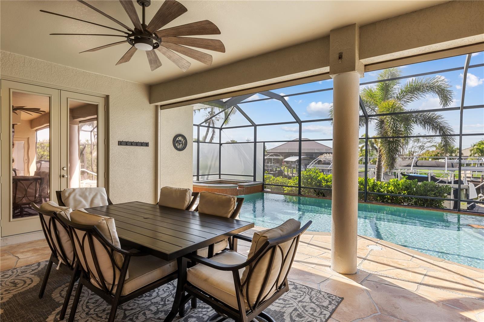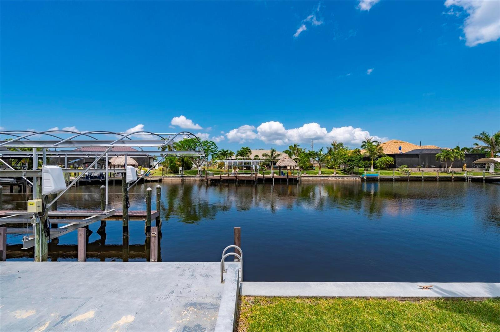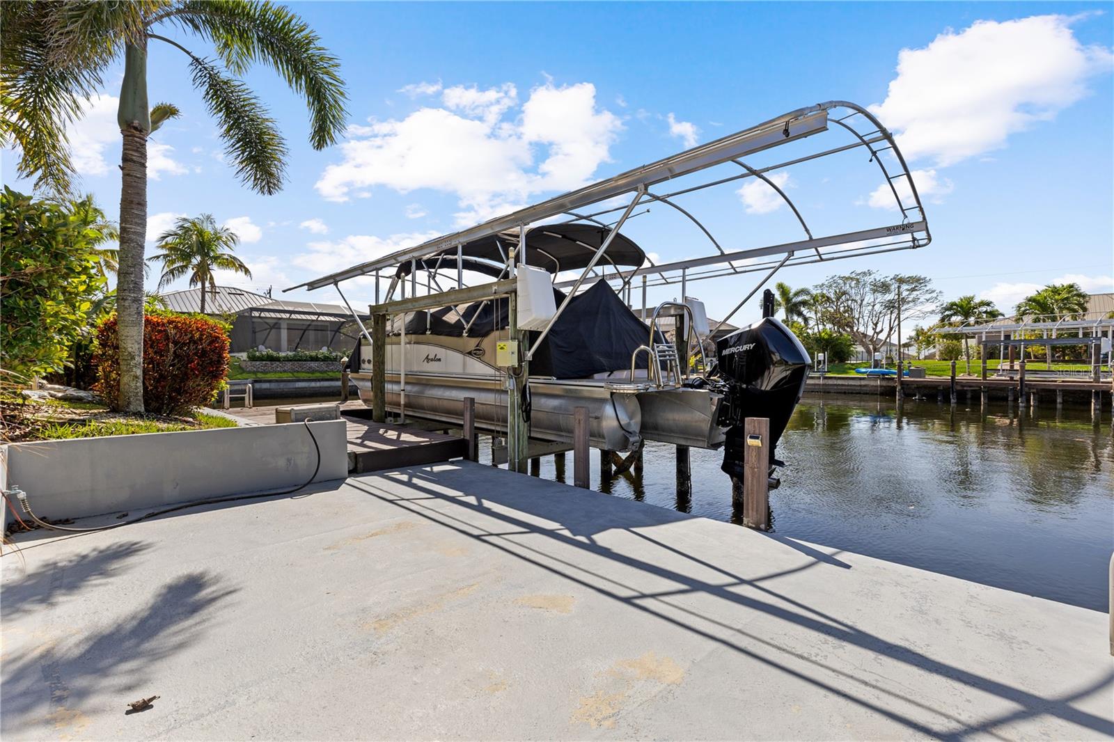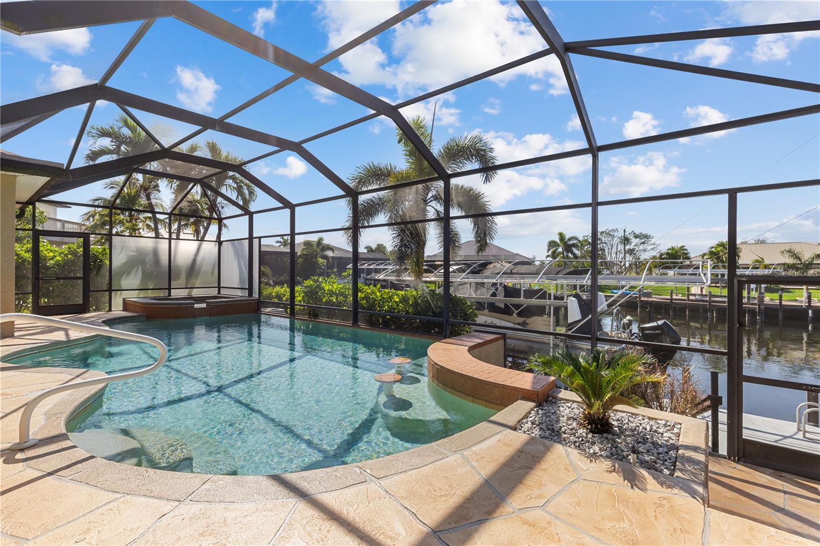 One or more photo(s) has been virtually staged. Experience the ultimate in Florida living with this exquisite furnished 4-bedroom, 2.5-bathroom waterfront pool home with jacuzzi and 3-car garage, perfectly situated in the heart of Cape Coral—and not located in a flood zone. From the moment you arrive, the lush, meticulously maintained landscaping sets the tone for what lies beyond the grand double-door entrance. Inside, you’re welcomed by soaring ceilings, abundant natural light, and stunning canal views through expansive glass French doors. The chef’s kitchen is a dream, offering a spacious cooking island, abundant cabinetry, and a large walk-in pantry with automatic lighting. Just off the kitchen, a spacious laundry room with a deep freezer adds convenience and storage. All four bedrooms are generously sized with large closets, while the luxurious primary suite features an oversized spa-style bathroom with a walk-in shower and dual showerheads—ideal for unwinding at the end of the day. Step out back and enjoy your own private resort-style oasis. The heated pool features built-in bar stools, and the heated jacuzzi provides the perfect spot to relax while soaking in peaceful water views. An outdoor half bath adds convenience for guests, making this space ideal for entertaining. For boating enthusiasts, the property includes a 33-foot dock with a 10,000 lb. boat lift, which extends 20 feet into the canal for easy access to open water. This turnkey home also includes numerous recent upgrades: a whole-house reverse osmosis system, electric storm shutters (2023), 16 impact windows (2023), a new roof (2021), a full HVAC system (2016), an irrigation system, a boat lift canopy (2022), and a concrete seawall (2004). The 3-car garage is fully equipped with a generator hookup, adding peace of mind. A full home and pool inspection and recent appraisal (Feb 2025) provide added confidence for buyers. Located close to top-tier dining, shopping, boating, and Florida’s beautiful beaches, this exceptional home truly offers it all. Schedule your private tour today—this is Florida waterfront living at its finest!