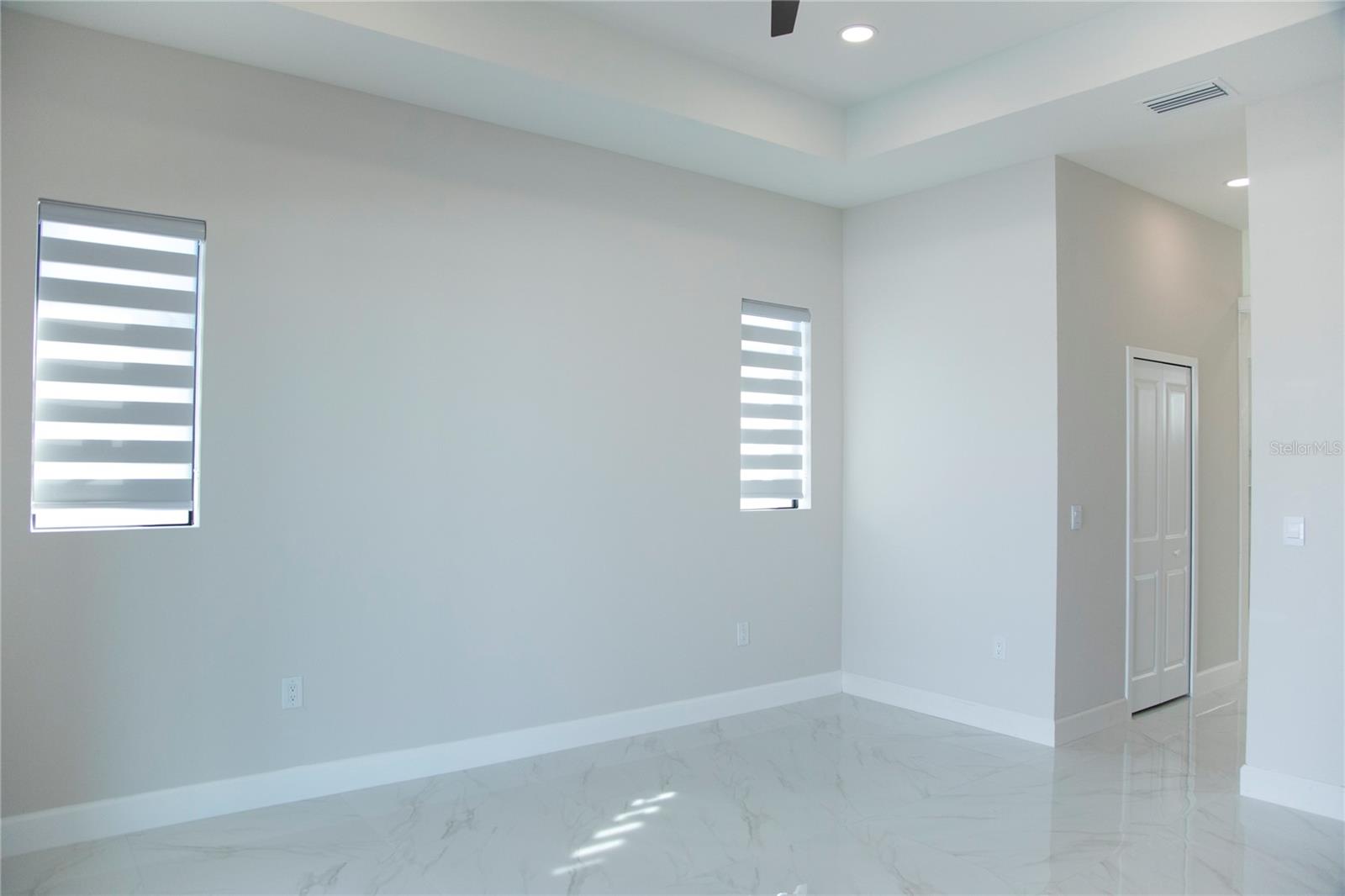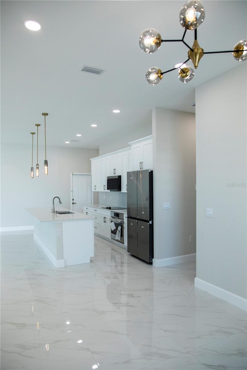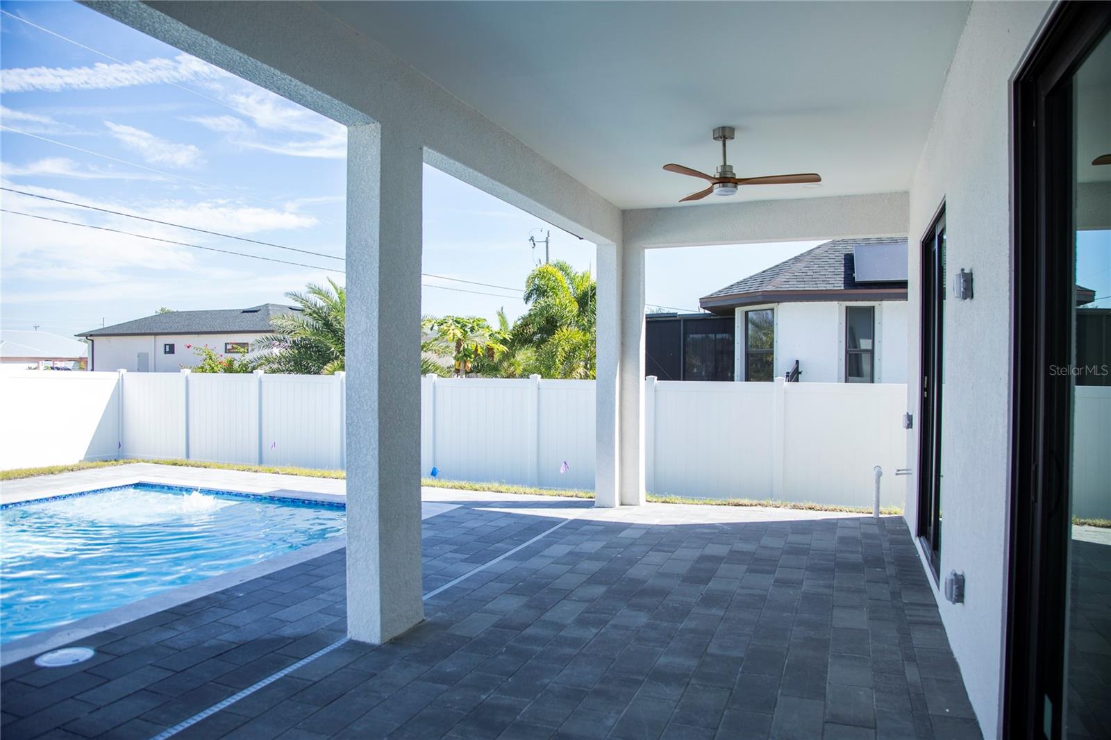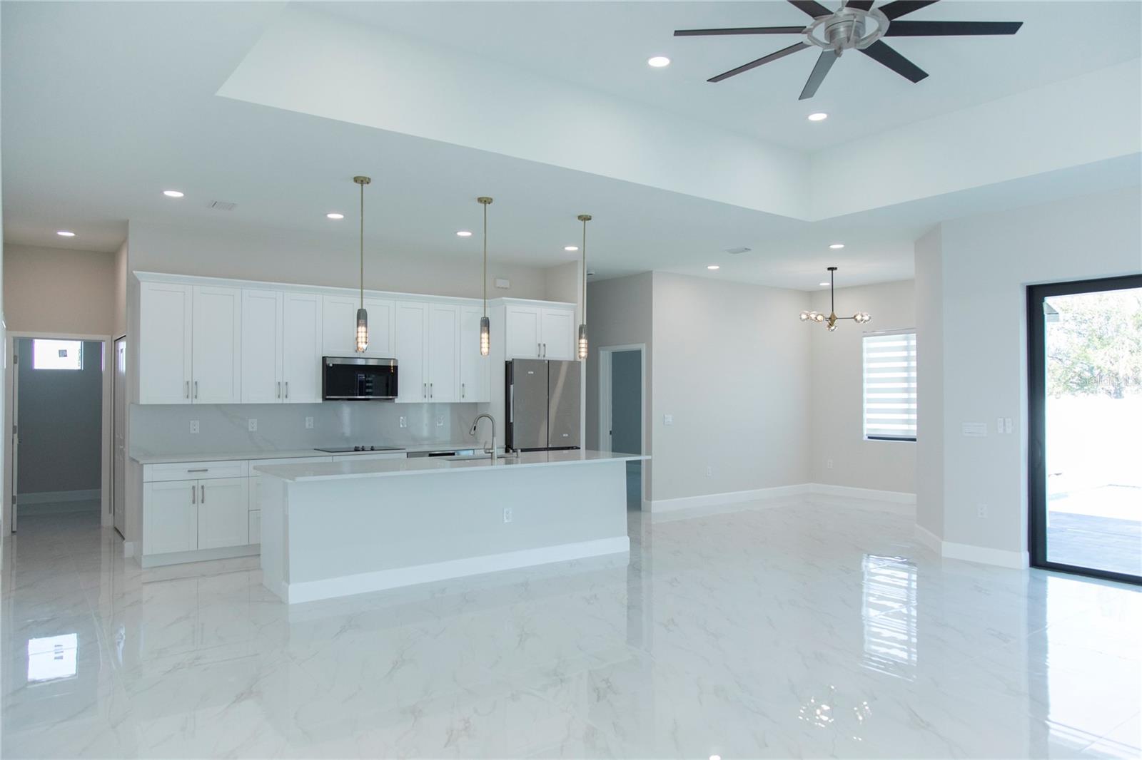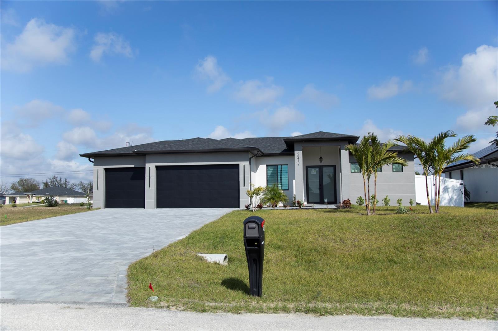 Stunning new construction pool home located in a quiet neighborhood close to all amenities. This fabulous home features 3 bed + den/office, 2 bath, 3 car garage, an in ground 14 x 28 upgraded pool with natural stone travertine coping, interior tile, tanning ledge with bubbler, and a fenced yard. Enter the house through double entrance doors into the large and bright living area with 96” tall sliding doors to the lanai. This home features hurricane impact doors and windows and extra tall ceilings that complement all extended 96” exterior doors and 32”X32” porcelain tile throughout the house. Kitchen features premium cabinets with solid wood doors, a large island with room for seating, upgraded stainless steel appliances with a built in cooktop, and premium quartz counter tops. A separate dining area overlooks the gorgeous pool. Upgraded fixtures, ceiling fans and lighting throughout this home. Primary suite has two walk in closets with custom organizers, dual sinks, large glass enclosed shower, oversized freestanding tub, and sliding doors out to the lanai. The two additional bedrooms have custom closet organizers and window treatments. Garage has two garage door openers. Exterior has decorative stucco finish, extended paver driveway, High efficiency premium Ruud HVAC system, and a sprinkler system.