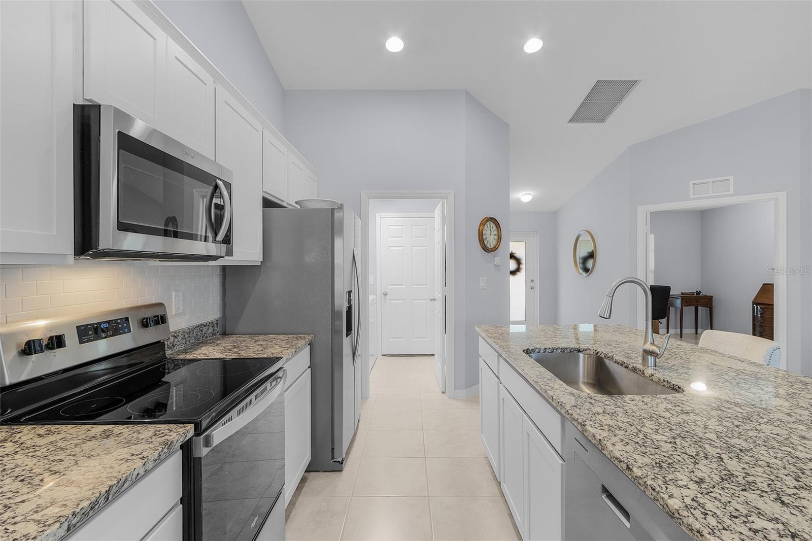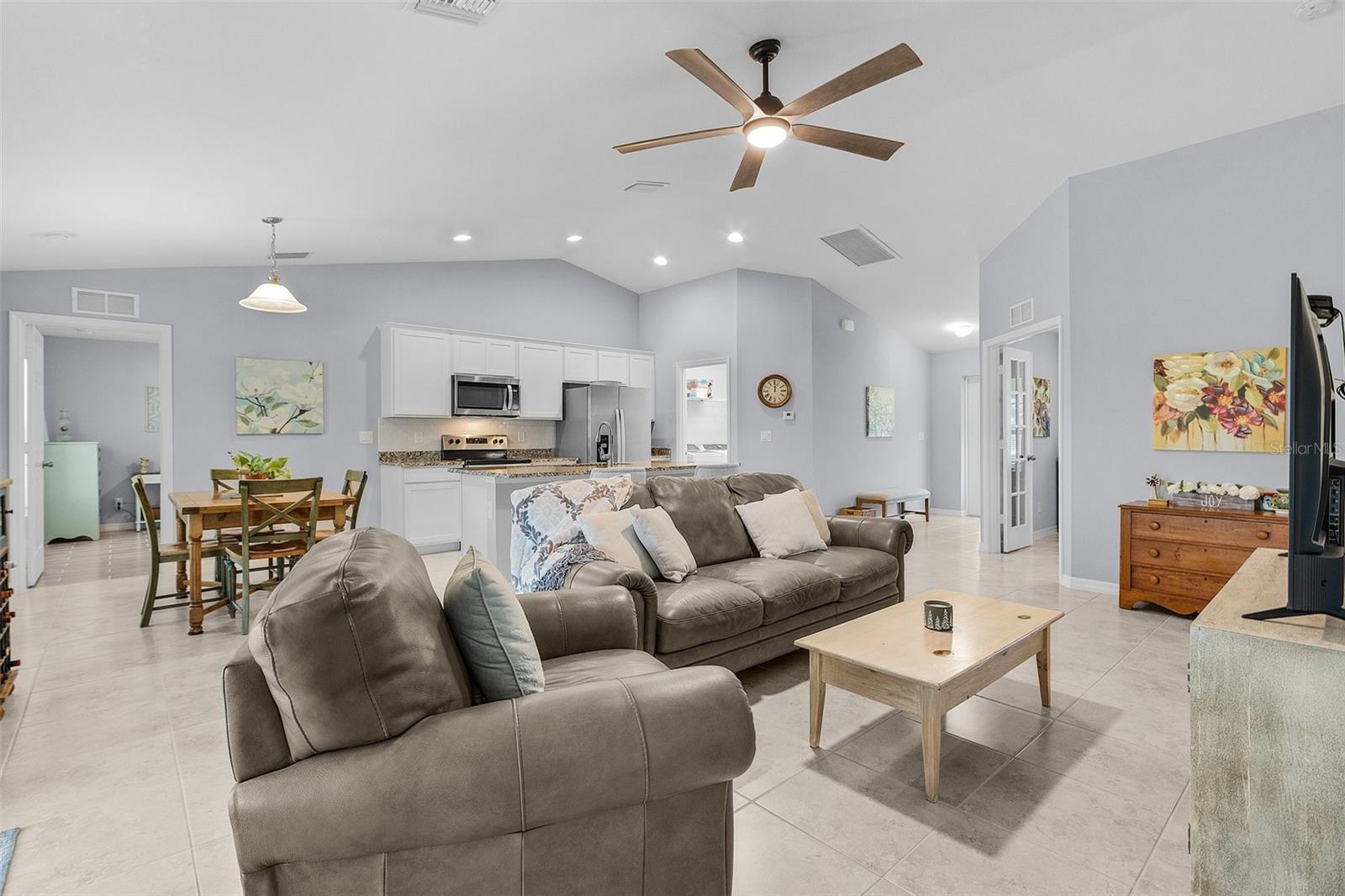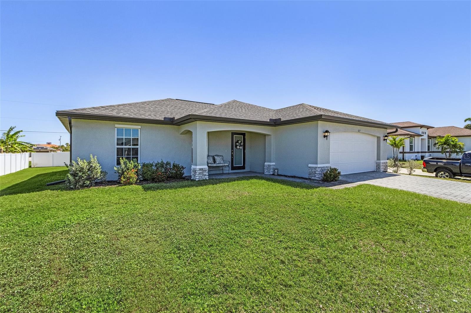 This like-new 2023 Christopher Alan home is a stunning find, offering 3 bedrooms, a den, and 2 bathrooms in an unbeatable location. Situated just two minutes from Mariner High School and Mariner Middle School, and only 9 minutes from Oasis Elementary North, this home offers incredible convenience for families. The property has never flooded and is not located in a flood zone, meaning no flood insurance is required. Inside, you'll find tile flooring throughout the entire home, creating a sleek and cohesive look. The kitchen is a standout, featuring granite countertops, a large island with a single deep sink, modern cabinets with soft-close drawers, and a beautiful tile backsplash. Upgraded remote control fans and lights are installed in every room, ensuring comfort and convenience. The home features a brick paver driveway and a screened-in rear lanai, providing the perfect space to enjoy your morning coffee and watch the sunrise. Additional features include impactresistant windows, an automatic irrigation system, a termite bait and protector system around the perimeter, a decorative chip flake garage floor coating, and a whole-house reverse osmosis system for purified water throughout. This home offers the perfect blend of modern amenities and an excellent location, with easy access to stores, restaurants, and other amenities, making it an exceptional place to call home!