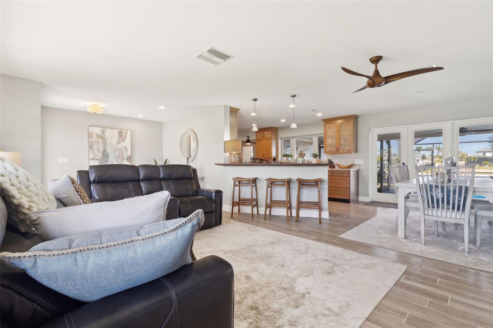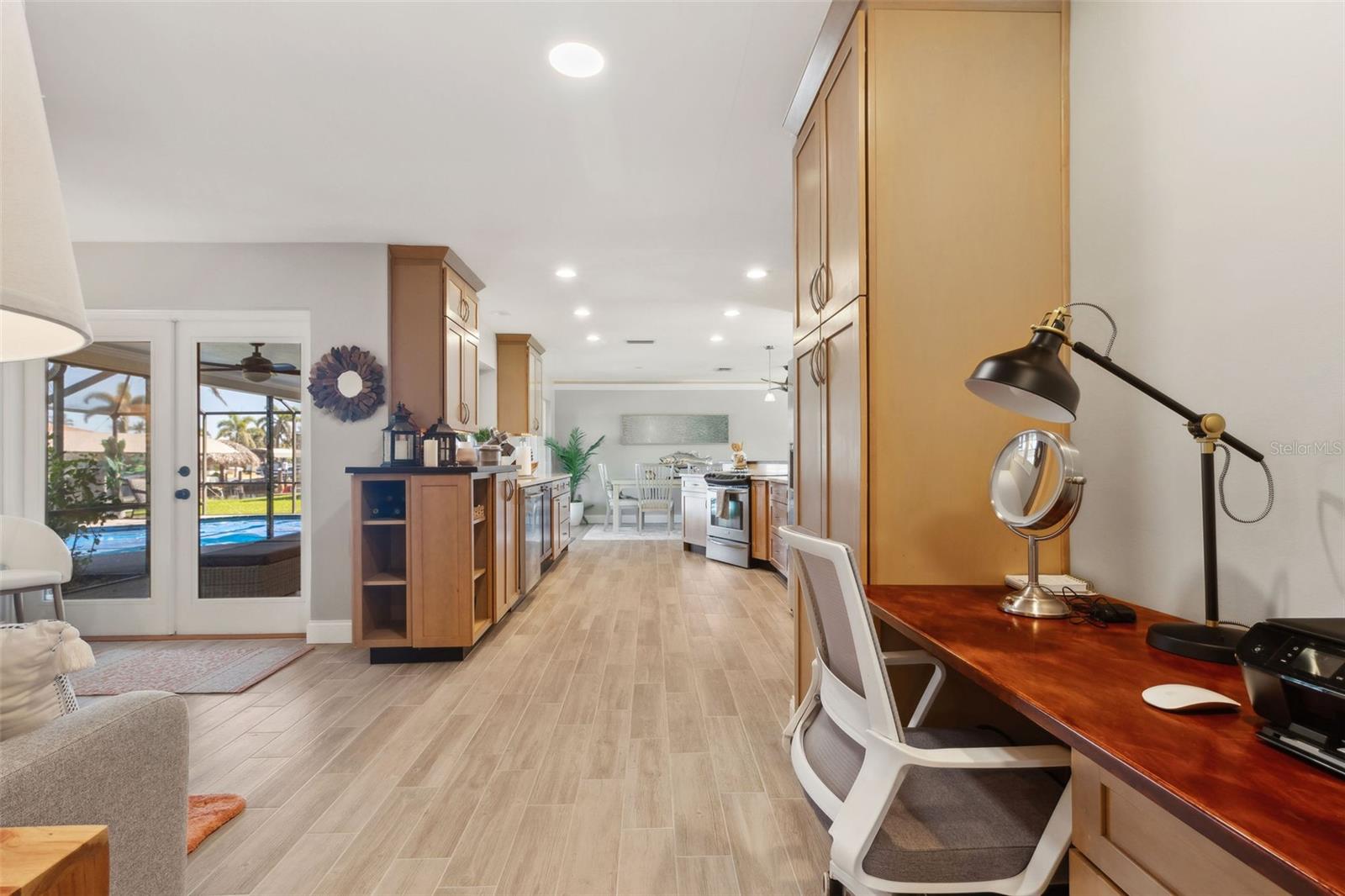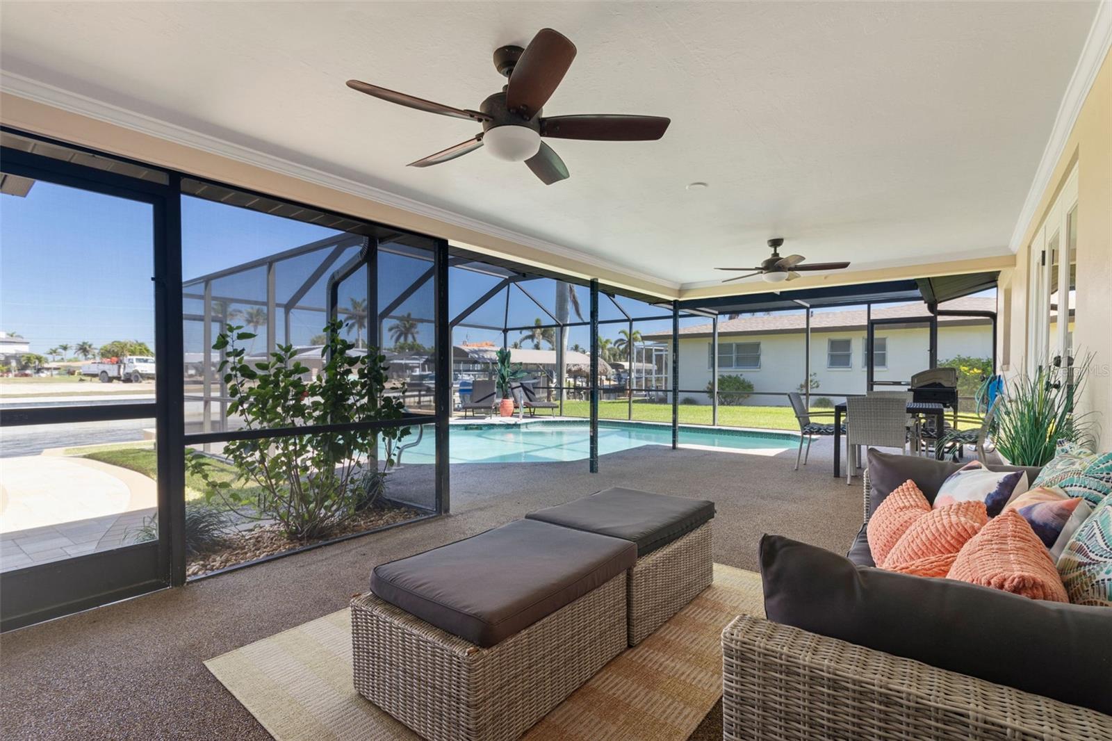 Welcome to this beautifully updated, fully furnished home, designed for comfort and convenience. Offering 2 spacious bedrooms, 2 bathrooms, and a versatile flex room that can be used as an office, den, or guest space, this home is the perfect blend of luxury and functionality. Located on the water with DIRECT Gulf access just minutes from open water, it’s an ideal setting for boating enthusiasts. The property comes turnkey, with furniture included, so you can move right in and start enjoying your new home. Inside, you’ll find thoughtful upgrades throughout, including double-pane door windows for energy efficiency, custom cabinetry with soft-close doors and drawers, and a commercial-grade range that’s perfect for any cooking enthusiast. Additional features include LED cabinet lighting, a newer washer and dryer, and a tankless water heater for endless hot water. The custom walk-in closet provides ample storage, while the multi-tier brick paver patio creates an inviting outdoor space for relaxation or entertaining. The screened lanai, with its beautiful pebble tile, adds a touch of elegance to your outdoor living. Throughout the home, you'll appreciate the newer wood-planked tile flooring, the stunning quartz countertops in the kitchen and bathrooms, and the recent addition of a new roof this year. The heated pool ensures year-round enjoyment, and the brick paver driveway enhances the home’s curb appeal. With crown molding and recessed lighting throughout, this home is the perfect place to relax, entertain, and enjoy the best of waterfront living.
