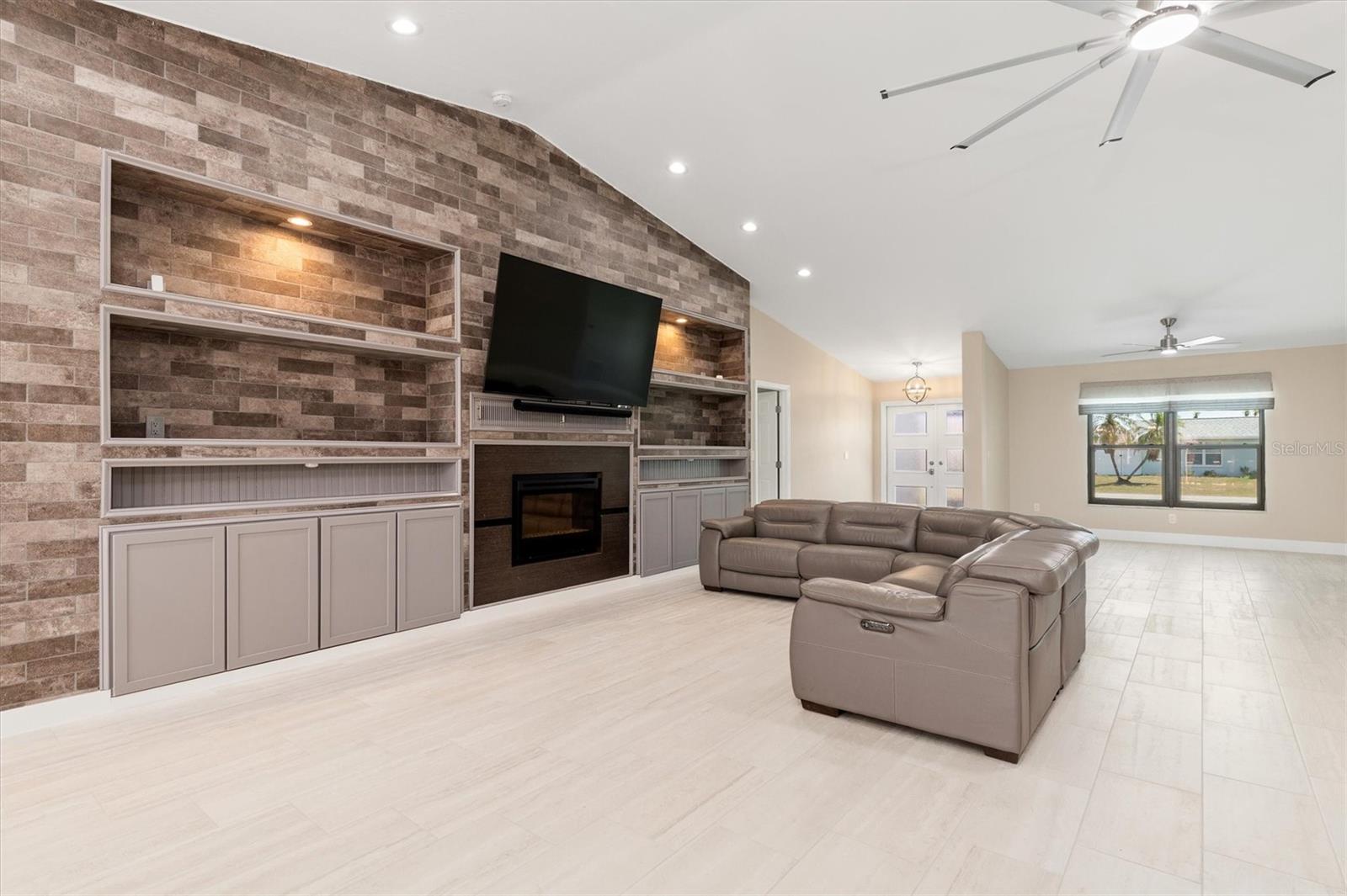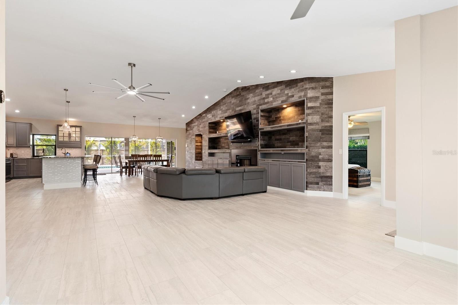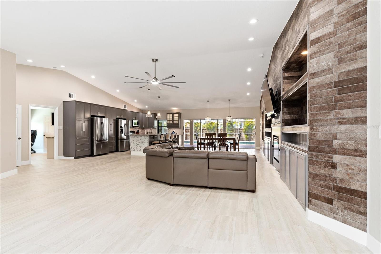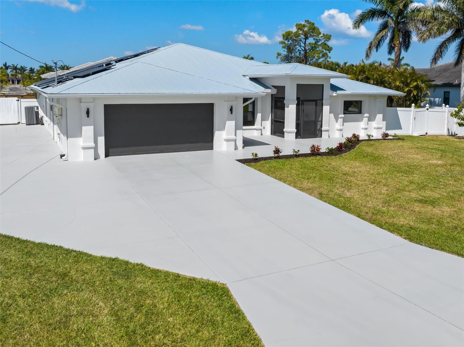 One or more photo(s) has been virtually staged. Welcome to this stunning, fully updated 3,025 sq ft custom home, perfectly situated in a prime Cape Coral location near top-rated schools, dining, and services. This east-facing residence offers peace of mind with hurricane impact glass windows, roll-down screens, and a front door with privacy, impact glass panels. Step inside to discover a spacious interior featuring TWO PRIMARY en-suite bedrooms, a luxurious spa-like bathroom. ONE OF THE EN-SUITES BEDROOMS features a separate entrance leading to a private kitchenette and seating area, perfect for an au pair or in-laws along with a spa-like bathroom and bedroom. The second en-suite features an oversized bedroom, bathroom and walk-in closet, perfect for family and guests. The expansive kitchen is equipped with dual full-size refrigerators, stainless steel appliances, immense island with sink and soft-close cabinets. The great room boasts a soaring vaulted ceiling, a stone tile accent wall with an electric fireplace, and a 16-foot patio door opening to the screened lanai. Outdoor living is at its finest with newly sealed pavers, the pool features water jets and a spa, surrounded by a fenced-in yard for privacy. Enjoy added conveniences like stainless ceiling fans, a detached storage building with electricity—ideal for an office or hobby space—and enhanced security systems. The home is also energy efficient, featuring a durable metal roof, over 60 solar panels, and a Level II Tesla charger. Ample parking is available with a driveway extension providing space for boats, RVs, or recreational vehicles. Additionally, the lot to the left and a few to the rear are protected, and will not be built on. Experience the best of Florida living with unmatched comfort, style, and durability in this exceptional home.