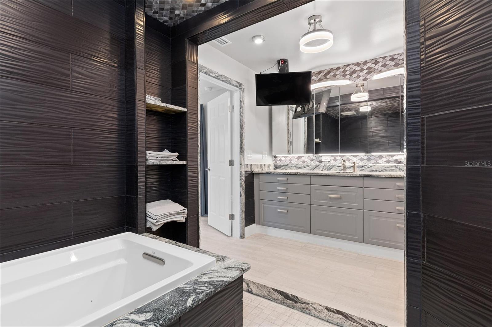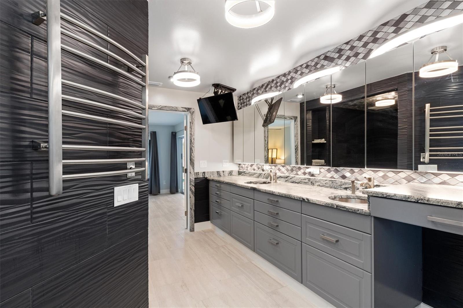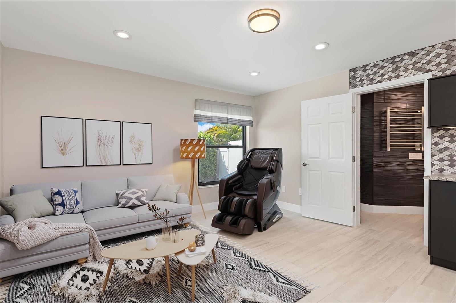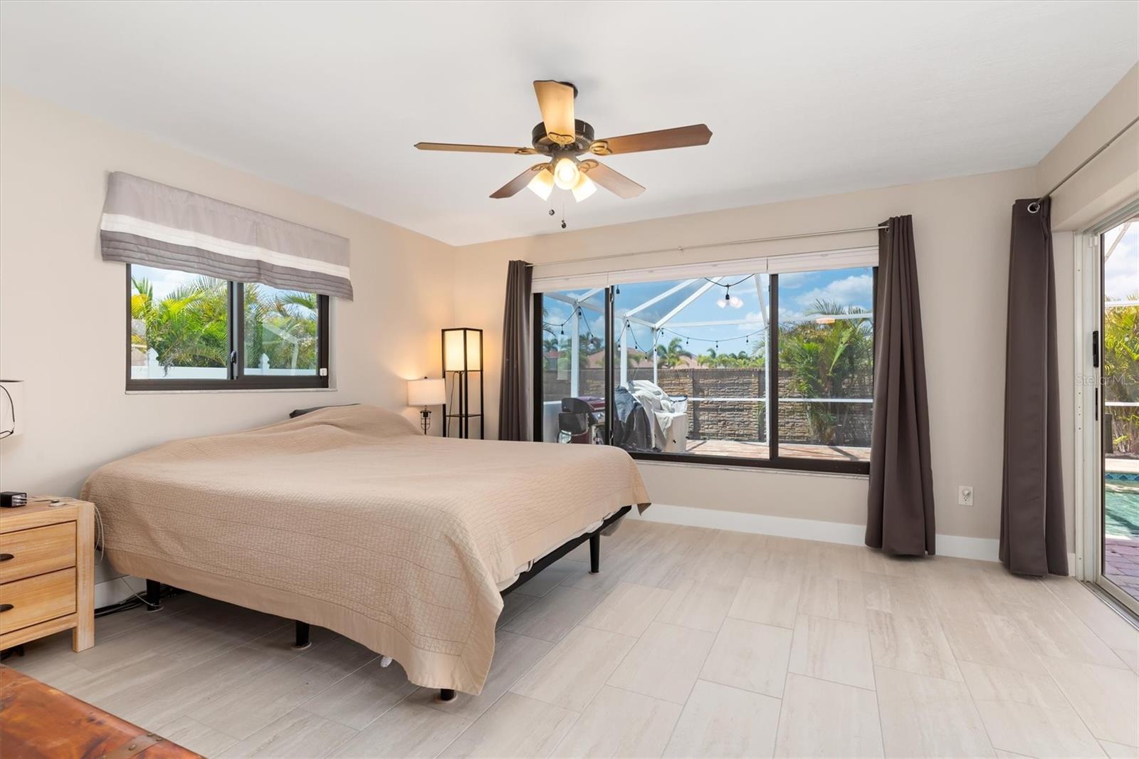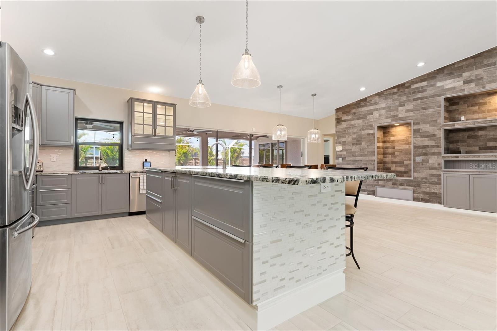 One or more photo(s) has been virtually staged. Welcome to this stunning, fully updated 3,025 sq ft custom home, perfectly situated in a prime Cape Coral location near top-rated schools, dining, and services. This east-facing residence offers peace of mind with hurricane impact glass windows, roll-down screens, and a front door with privacy, impact glass panels. Step inside to discover a spacious interior featuring TWO PRIMARY en-suite bedrooms, a luxurious spa-like bathroom. ONE OF THE EN-SUITES BEDROOMS features a separate entrance leading to a private kitchenette and seating area, perfect for an au pair or in-laws along with a spa-like bathroom and bedroom. The second en-suite features an oversized bedroom, bathroom and walk-in closet, perfect for family and guests. The expansive kitchen is equipped with dual full-size refrigerators, stainless steel appliances, immense island with sink and soft-close cabinets. The great room boasts a soaring vaulted ceiling, a stone tile accent wall with an electric fireplace, and a 16-foot patio door opening to the screened lanai. Outdoor living is at its finest with newly sealed pavers, the pool features water jets and a spa, surrounded by a fenced-in yard for privacy. Enjoy added conveniences like stainless ceiling fans, a detached storage building with electricity—ideal for an office or hobby space—and enhanced security systems. The home is also energy efficient, featuring a durable metal roof, over 60 solar panels, and a Level II Tesla charger. Ample parking is available with a driveway extension providing space for boats, RVs, or recreational vehicles. Additionally, the lot to the left and a few to the rear are protected, and will not be built on. Experience the best of Florida living with unmatched comfort, style, and durability in this exceptional home.
