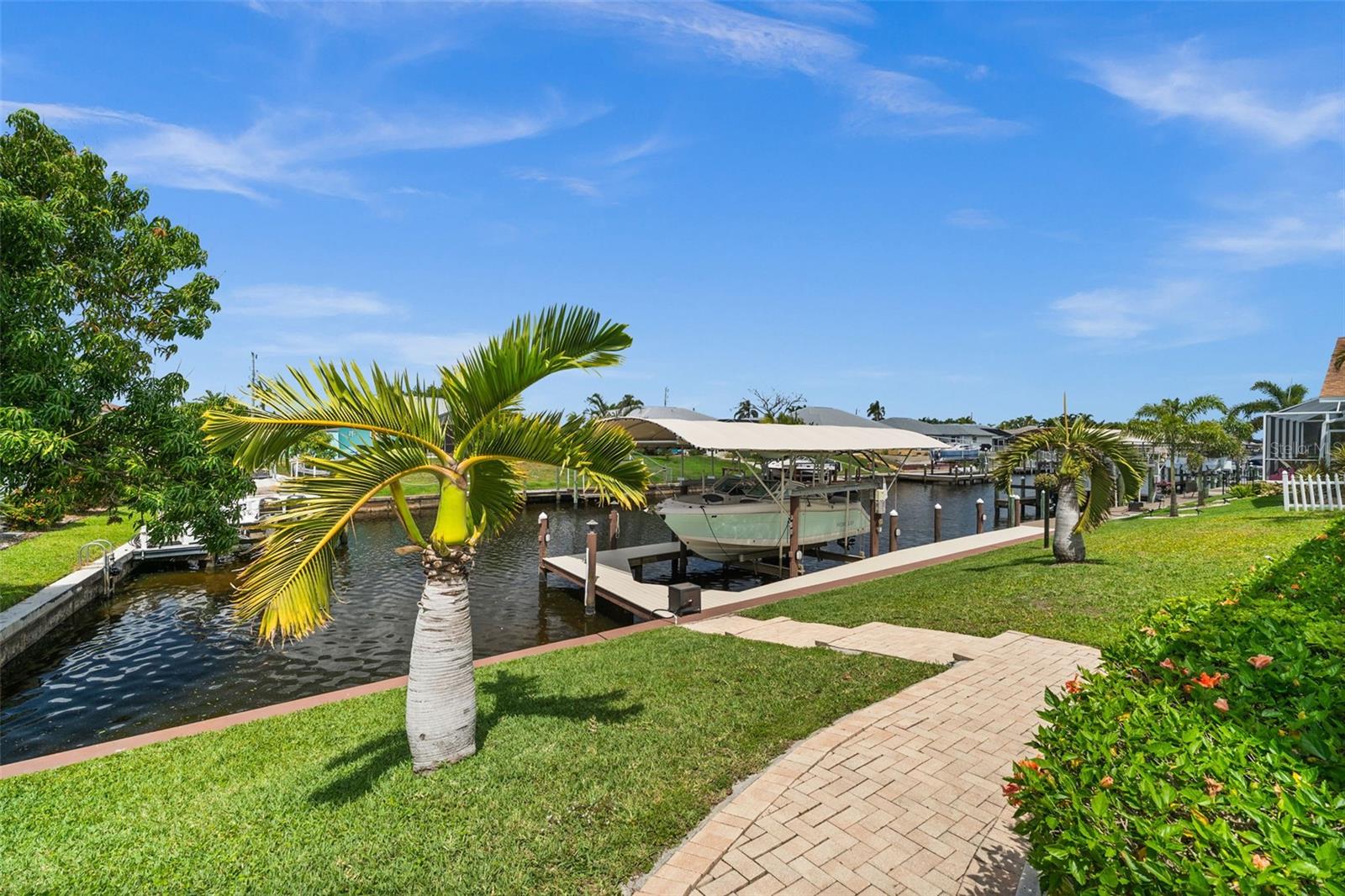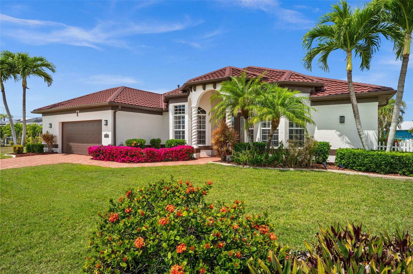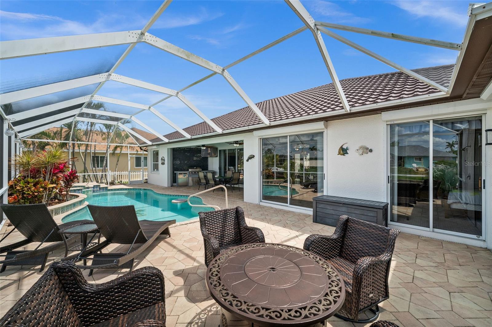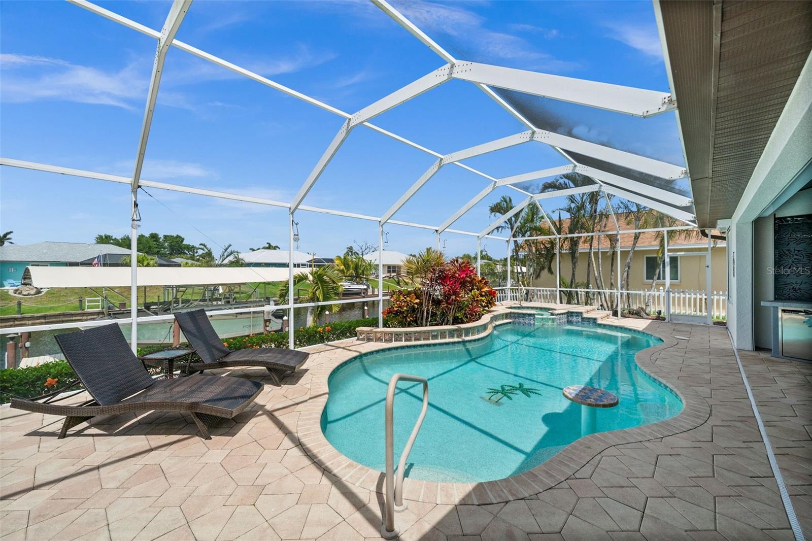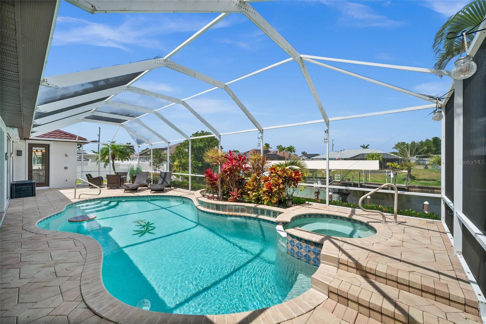 Welcome to this stunning Floridian villa on a Gulf-access canal in Southwest Cape Coral. This 3-bedroom, 3-bathroom home with an office is designed for seamless indoor-outdoor living. With 2,150 square feet of interior space and a wide-open floor plan, the home flows naturally into the incredible outdoor areas, offering a true resort-style experience. Large sliding doors lead from the main living area to a spacious, screened lanai, where a heated pool and spa become the centerpiece of outdoor relaxation. The pool and spa are fully controllable via phone app through the Pentair Automation System. The oversized paver patio wraps around the pool, offering multiple lounging areas including a dedicated fire table lounge with oversized chairs—perfect for entertaining under the stars. The outdoor kitchen is fully equipped with a built-in grill, refrigerator, prep space, and TV, all beneath a richly toned tongue-and-groove ceiling with tropical fans. Inside, the kitchen features a large island with a breakfast bar and stainless appliances, opening to the living and dining areas with volume ceilings and custom lighting. Travertine floors flow throughout the main areas, and the split-bedroom layout ensures privacy for all. The spacious primary suite features dual walk-in closets and a luxurious bathroom with dual sinks, a garden tub, and a walk-through shower. The junior suite offers its own private bath and pool access, while a third bedroom and bath complete the guest wing. The office includes French doors, a bay window, and a built-in desk. Outside, the composite dock with a captain’s walk, 10,000 lb boat lift with remote, and 36’ canopy stands ready for a short boat ride to restaurants, beaches and the Gulf. Other features include electric storm shutters, a whole-house water softener, a reverse osmosis drinking system, smart home automation via Vivint, and a premium Worthhouse steel roof with transferable warranty. This home is NOT IN A FLOOD ZONE and HAS NEVER FLOODED OR SUSTAINED HURRICANE DAMAGE in any recent storms. Located in the popular Pelican neighborhood, close to shopping, dining, and downtown Cape Coral, this home blends elegance, comfort, and true SW Florida lifestyle.