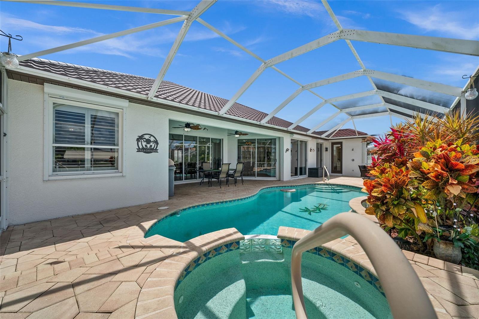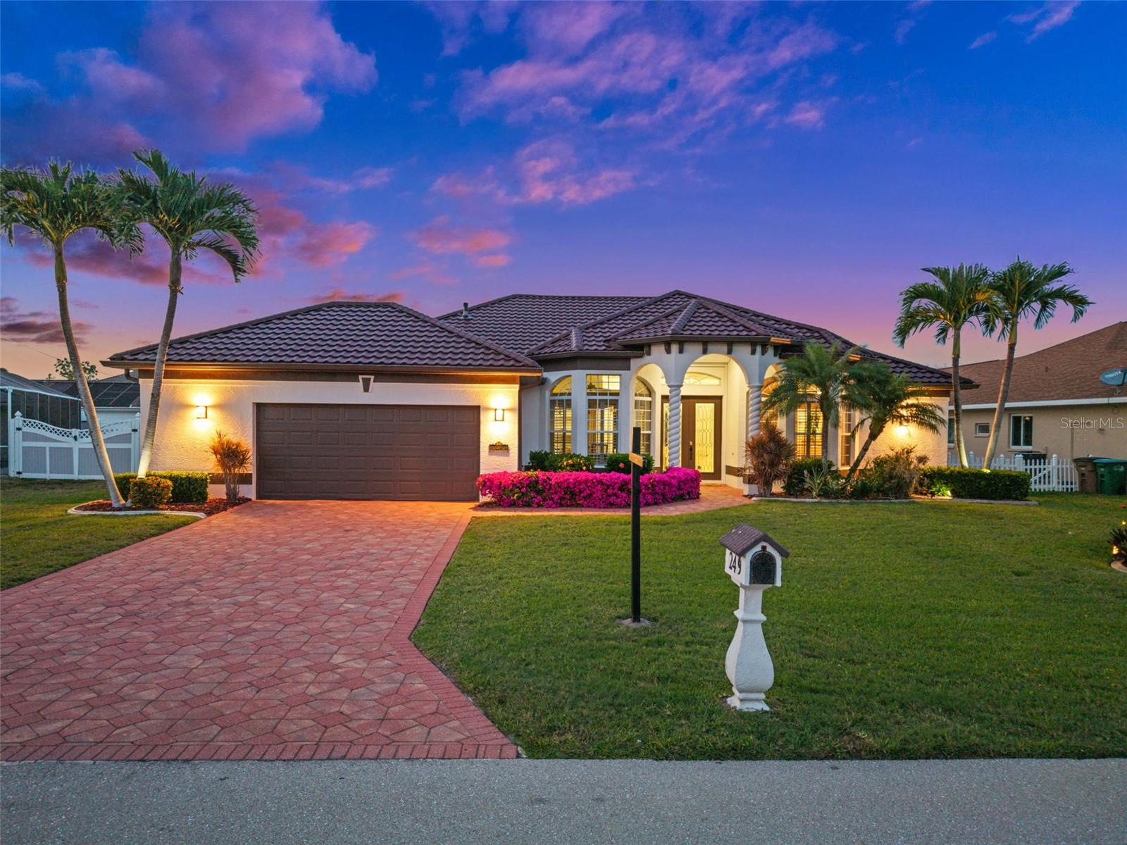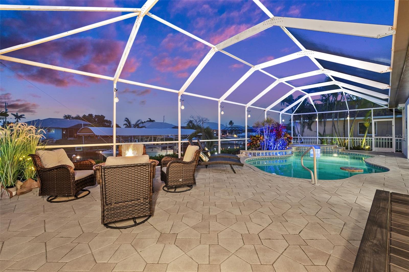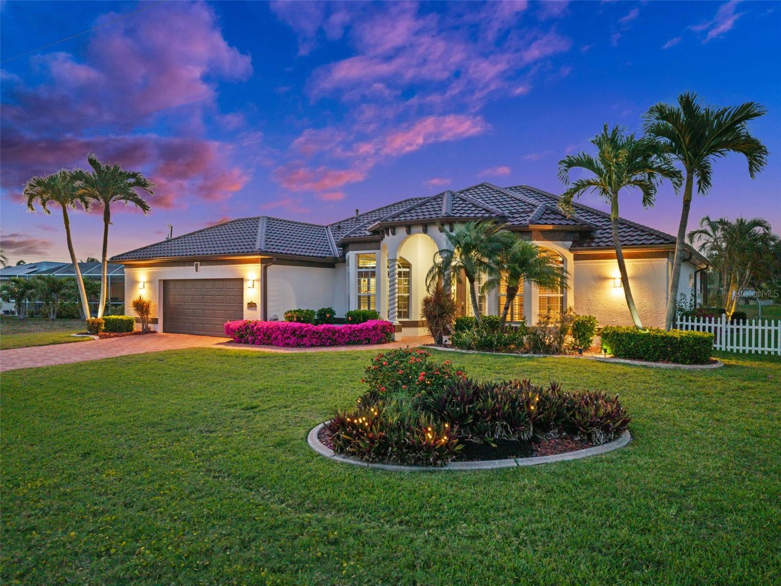 Welcome to this stunning Floridian villa on a Gulf-access canal in Southwest Cape Coral. This 3-bedroom, 3-bathroom home with an office is designed for seamless indoor-outdoor living. With 2,150 square feet of interior space and a wide-open floor plan, the home flows naturally into the incredible outdoor areas, offering a true resort-style experience. Large sliding doors lead from the main living area to a spacious, screened lanai, where a heated pool and spa become the centerpiece of outdoor relaxation. The pool and spa are fully controllable via phone app through the Pentair Automation System. The oversized paver patio wraps around the pool, offering multiple lounging areas including a dedicated fire table lounge with oversized chairs—perfect for entertaining under the stars. The outdoor kitchen is fully equipped with a built-in grill, refrigerator, prep space, and TV, all beneath a richly toned tongue-and-groove ceiling with tropical fans. Inside, the kitchen features a large island with a breakfast bar and stainless appliances, opening to the living and dining areas with volume ceilings and custom lighting. Travertine floors flow throughout the main areas, and the split-bedroom layout ensures privacy for all. The spacious primary suite features dual walk-in closets and a luxurious bathroom with dual sinks, a garden tub, and a walk-through shower. The junior suite offers its own private bath and pool access, while a third bedroom and bath complete the guest wing. The office includes French doors, a bay window, and a built-in desk. Outside, the composite dock with a captain’s walk, 10,000 lb boat lift with remote, and 36’ canopy stands ready for a short boat ride to restaurants, beaches and the Gulf. Other features include electric storm shutters, a whole-house water softener, a reverse osmosis drinking system, smart home automation via Vivint, and a premium Worthhouse steel roof with transferable warranty. This home is NOT IN A FLOOD ZONE and HAS NEVER FLOODED OR SUSTAINED HURRICANE DAMAGE in any recent storms. Located in the popular Pelican neighborhood, close to shopping, dining, and downtown Cape Coral, this home blends elegance, comfort, and true SW Florida lifestyle.