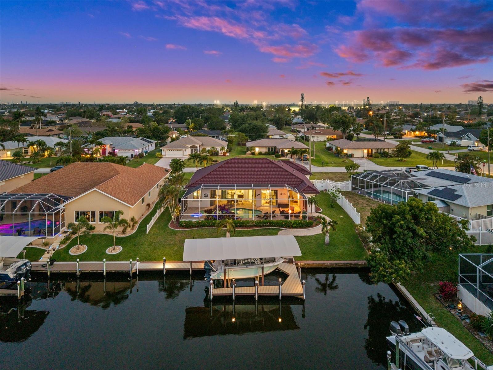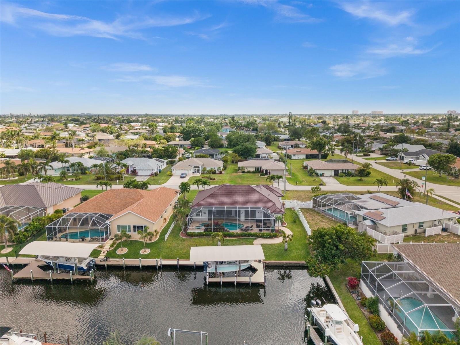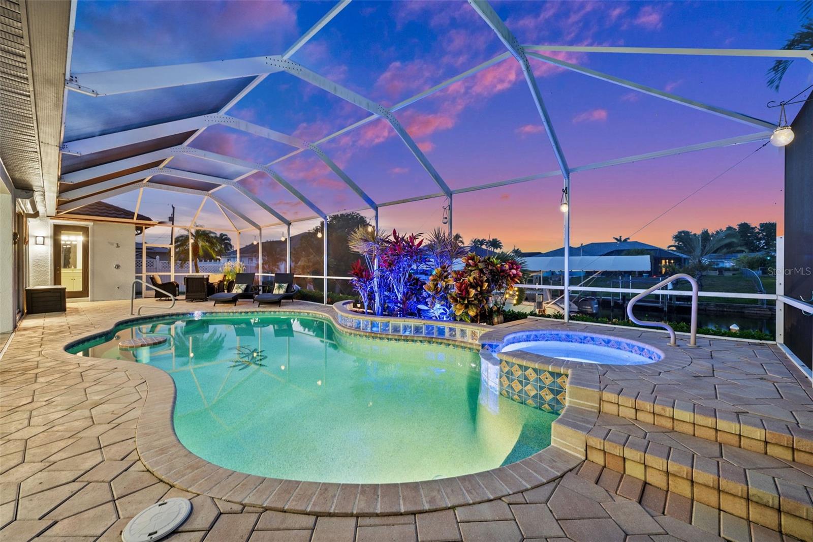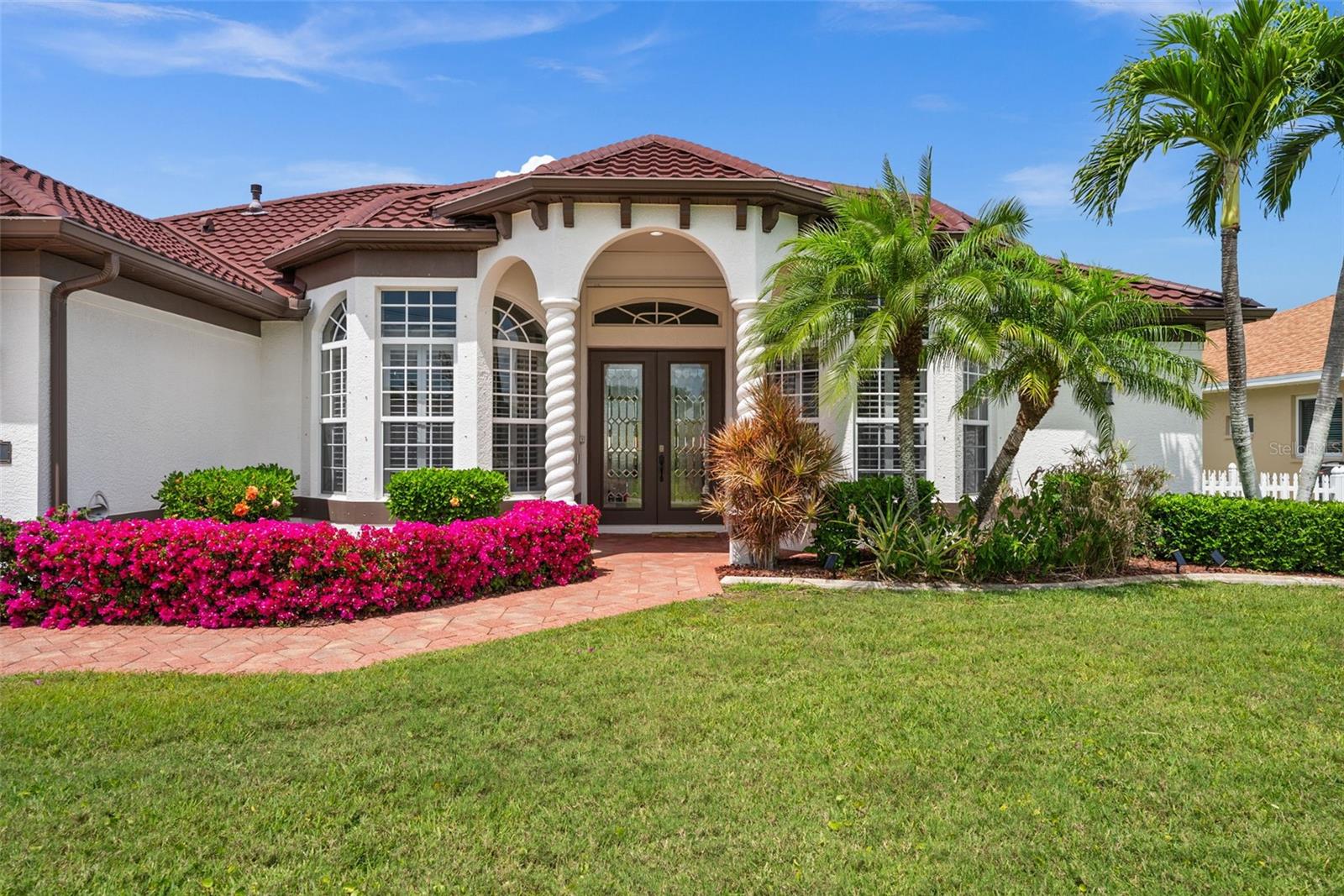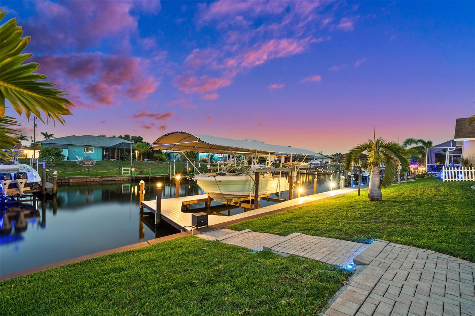 Welcome to this stunning Floridian villa on a Gulf-access canal in Southwest Cape Coral. This 3-bedroom, 3-bathroom home with an office is designed for seamless indoor-outdoor living. With 2,150 square feet of interior space and a wide-open floor plan, the home flows naturally into the incredible outdoor areas, offering a true resort-style experience. Large sliding doors lead from the main living area to a spacious, screened lanai, where a heated pool and spa become the centerpiece of outdoor relaxation. The pool and spa are fully controllable via phone app through the Pentair Automation System. The oversized paver patio wraps around the pool, offering multiple lounging areas including a dedicated fire table lounge with oversized chairs—perfect for entertaining under the stars. The outdoor kitchen is fully equipped with a built-in grill, refrigerator, prep space, and TV, all beneath a richly toned tongue-and-groove ceiling with tropical fans. Inside, the kitchen features a large island with a breakfast bar and stainless appliances, opening to the living and dining areas with volume ceilings and custom lighting. Travertine floors flow throughout the main areas, and the split-bedroom layout ensures privacy for all. The spacious primary suite features dual walk-in closets and a luxurious bathroom with dual sinks, a garden tub, and a walk-through shower. The junior suite offers its own private bath and pool access, while a third bedroom and bath complete the guest wing. The office includes French doors, a bay window, and a built-in desk. Outside, the composite dock with a captain’s walk, 10,000 lb boat lift with remote, and 36’ canopy stands ready for a short boat ride to restaurants, beaches and the Gulf. Other features include electric storm shutters, a whole-house water softener, a reverse osmosis drinking system, smart home automation via Vivint, and a premium Worthhouse steel roof with transferable warranty. This home is NOT IN A FLOOD ZONE and HAS NEVER FLOODED OR SUSTAINED HURRICANE DAMAGE in any recent storms. Located in the popular Pelican neighborhood, close to shopping, dining, and downtown Cape Coral, this home blends elegance, comfort, and true SW Florida lifestyle.