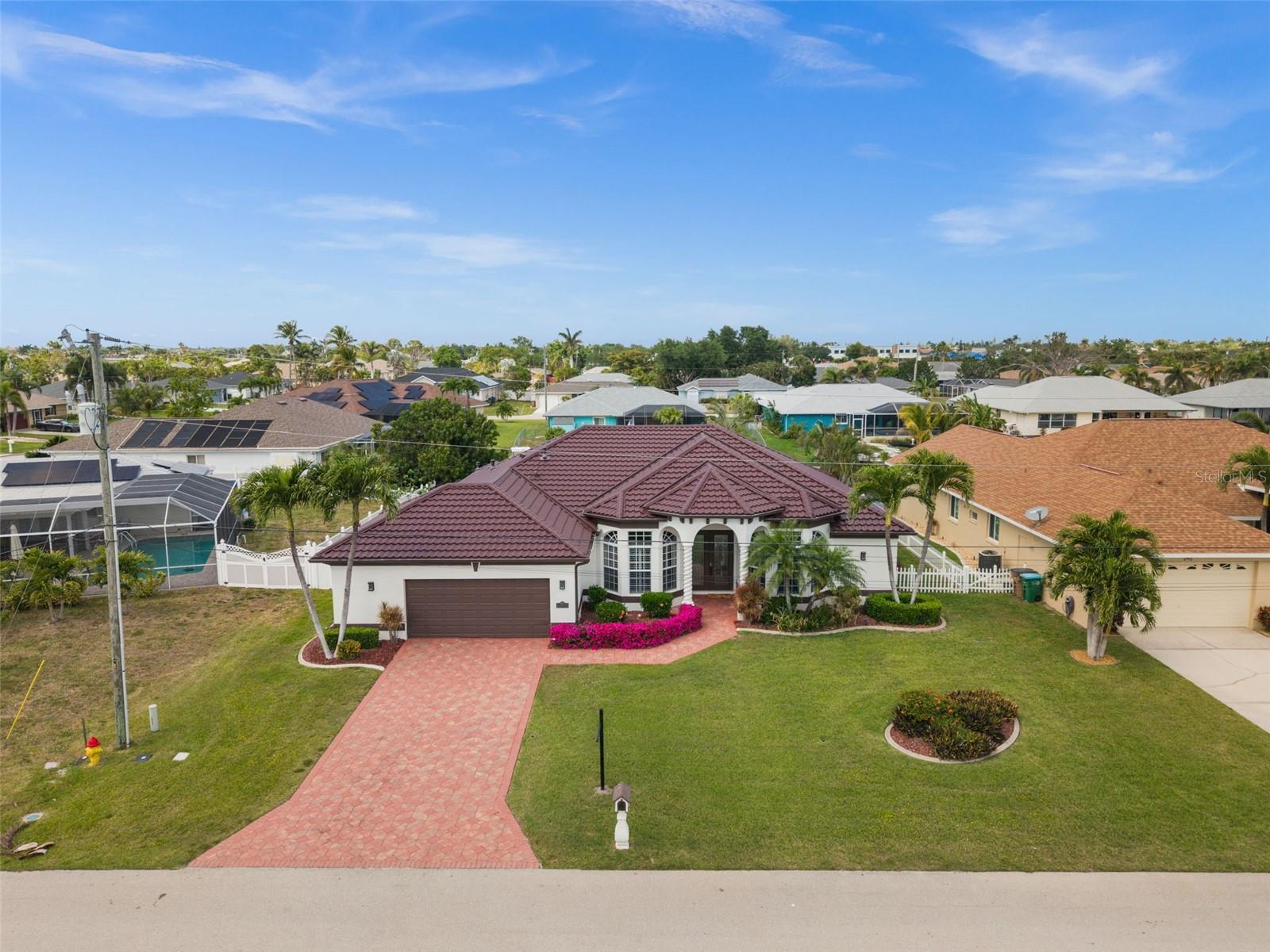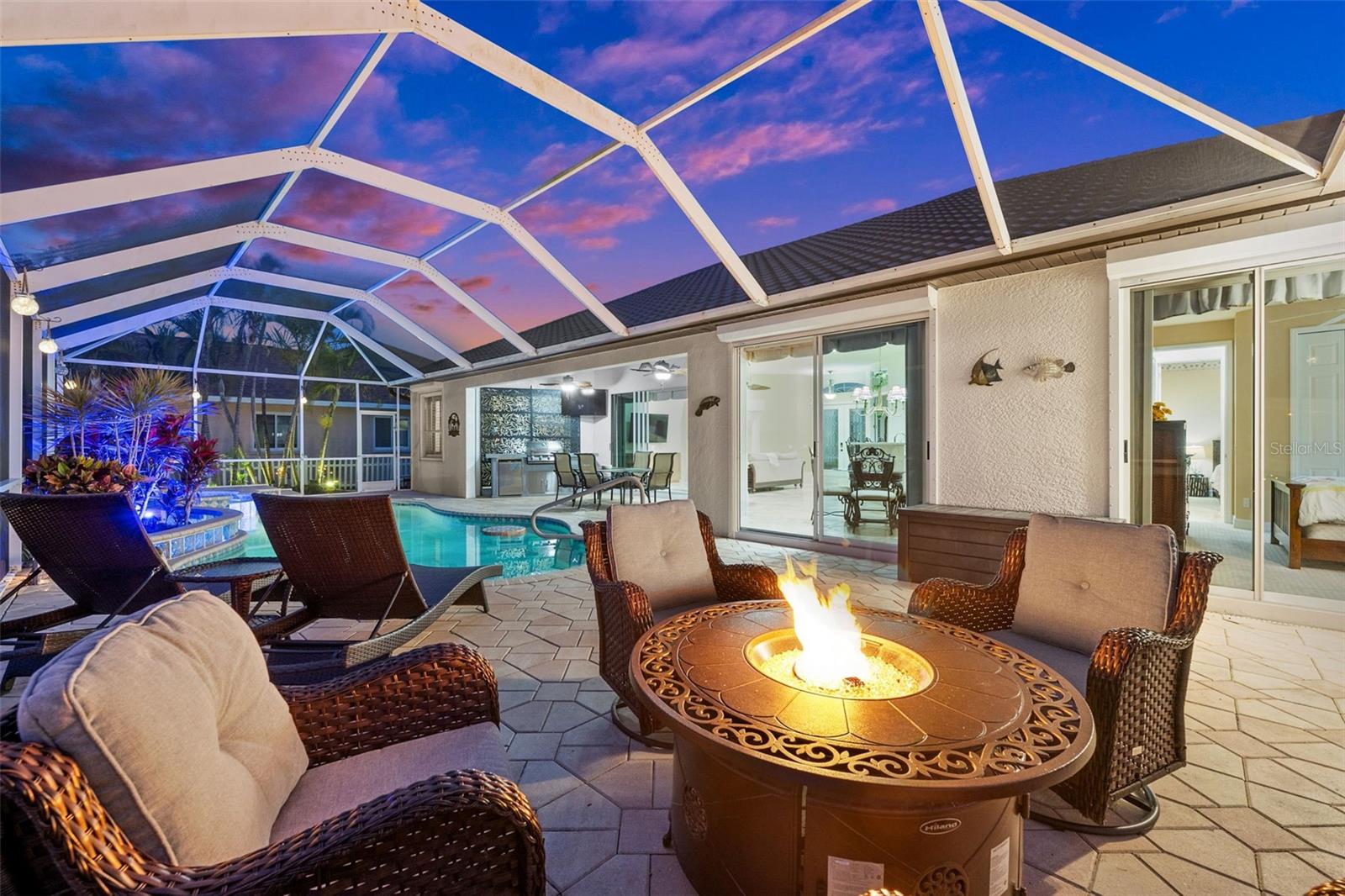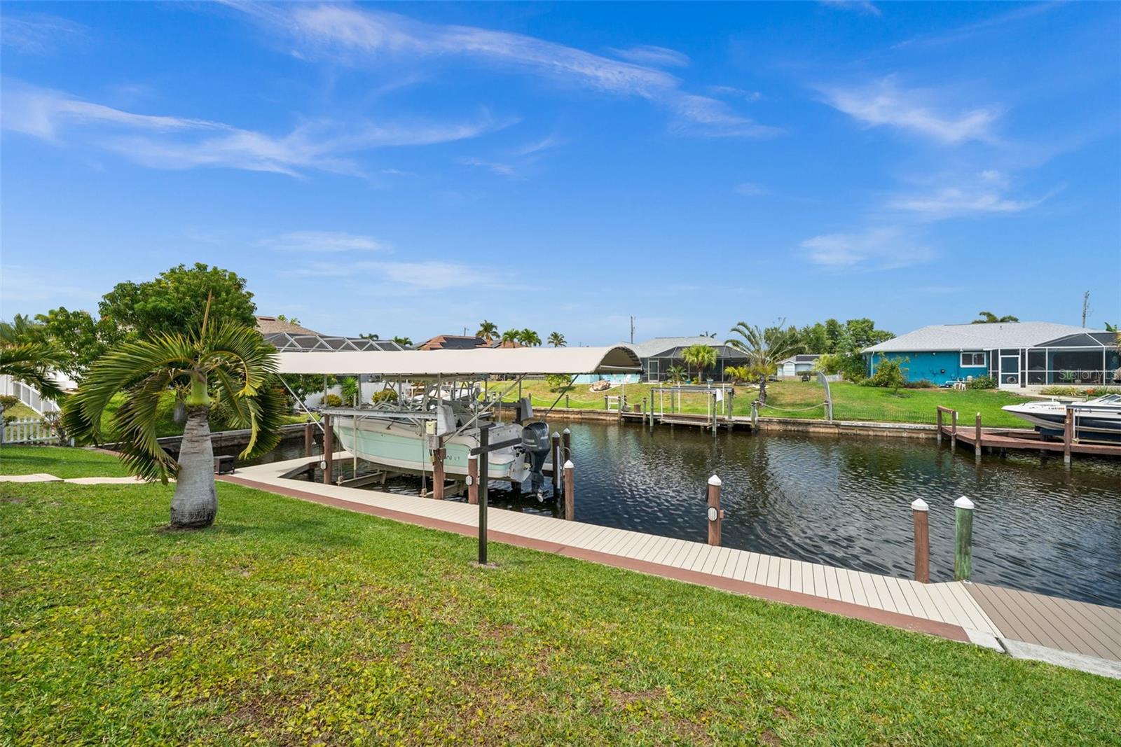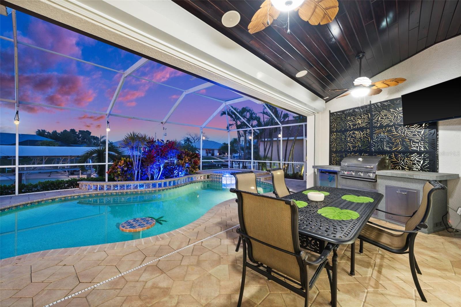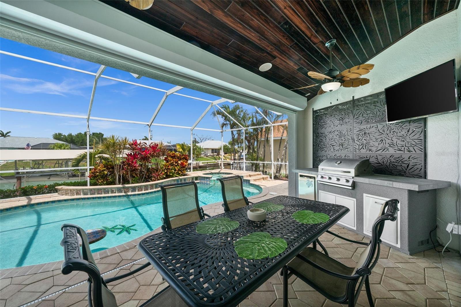 Welcome to this stunning Floridian villa on a Gulf-access canal in Southwest Cape Coral. This 3-bedroom, 3-bathroom home with an office is designed for seamless indoor-outdoor living. With 2,150 square feet of interior space and a wide-open floor plan, the home flows naturally into the incredible outdoor areas, offering a true resort-style experience. Large sliding doors lead from the main living area to a spacious, screened lanai, where a heated pool and spa become the centerpiece of outdoor relaxation. The pool and spa are fully controllable via phone app through the Pentair Automation System. The oversized paver patio wraps around the pool, offering multiple lounging areas including a dedicated fire table lounge with oversized chairs—perfect for entertaining under the stars. The outdoor kitchen is fully equipped with a built-in grill, refrigerator, prep space, and TV, all beneath a richly toned tongue-and-groove ceiling with tropical fans. Inside, the kitchen features a large island with a breakfast bar and stainless appliances, opening to the living and dining areas with volume ceilings and custom lighting. Travertine floors flow throughout the main areas, and the split-bedroom layout ensures privacy for all. The spacious primary suite features dual walk-in closets and a luxurious bathroom with dual sinks, a garden tub, and a walk-through shower. The junior suite offers its own private bath and pool access, while a third bedroom and bath complete the guest wing. The office includes French doors, a bay window, and a built-in desk. Outside, the composite dock with a captain’s walk, 10,000 lb boat lift with remote, and 36’ canopy stands ready for a short boat ride to restaurants, beaches and the Gulf. Other features include electric storm shutters, a whole-house water softener, a reverse osmosis drinking system, smart home automation via Vivint, and a premium Worthhouse steel roof with transferable warranty. This home is NOT IN A FLOOD ZONE and HAS NEVER FLOODED OR SUSTAINED HURRICANE DAMAGE in any recent storms. Located in the popular Pelican neighborhood, close to shopping, dining, and downtown Cape Coral, this home blends elegance, comfort, and true SW Florida lifestyle.