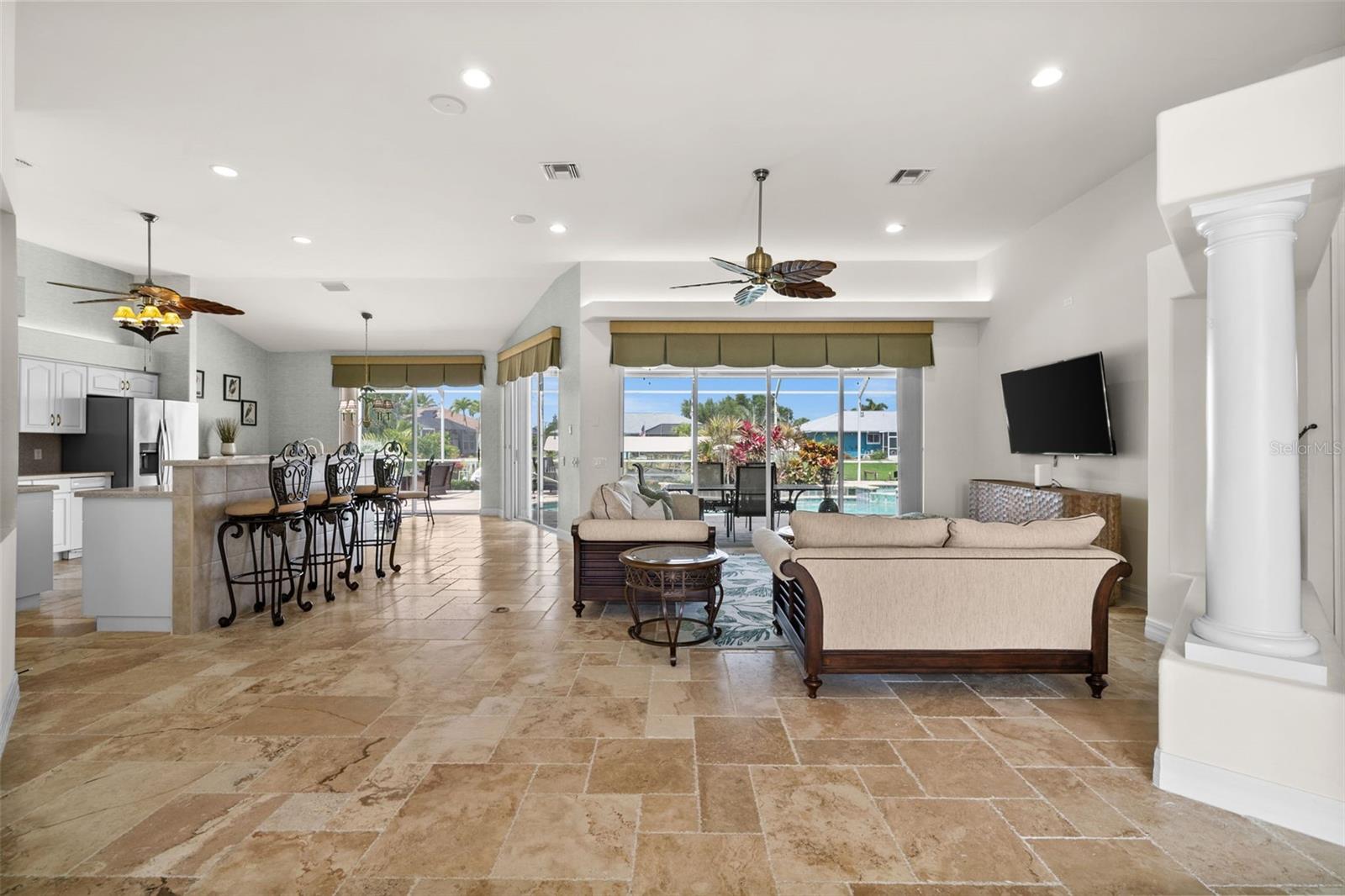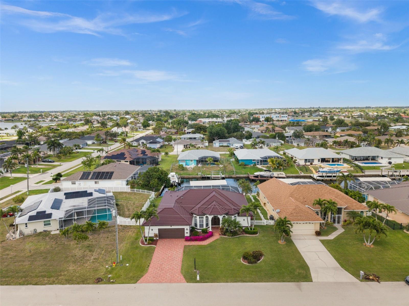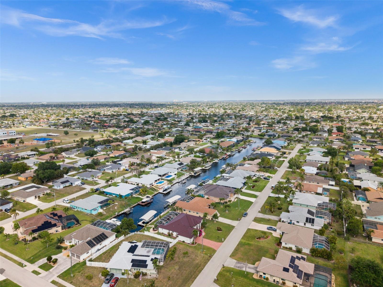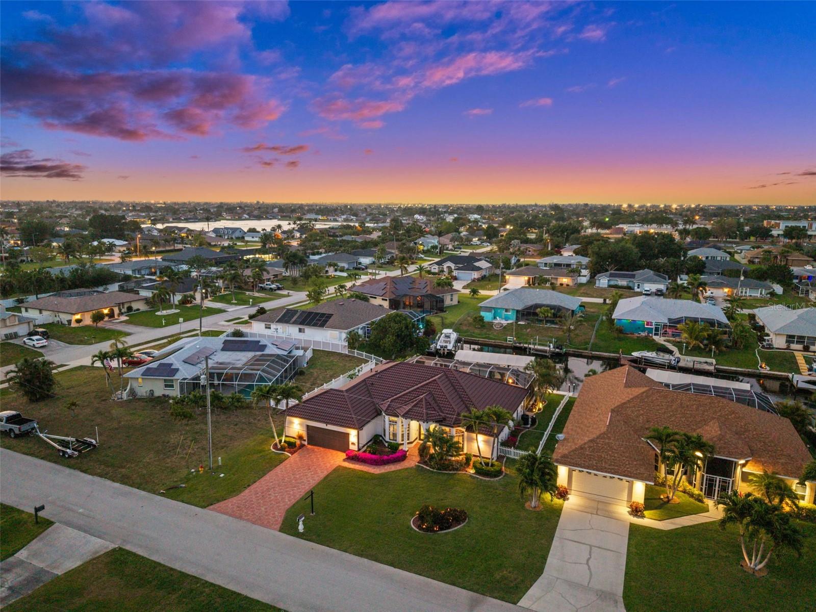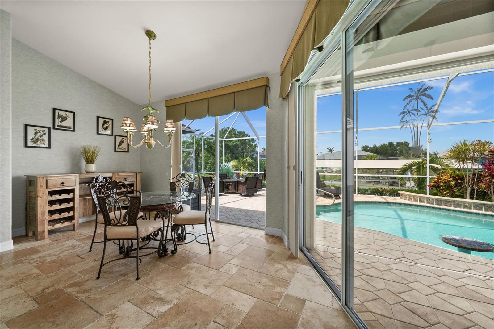 Welcome to this stunning Floridian villa on a Gulf-access canal in Southwest Cape Coral. This 3-bedroom, 3-bathroom home with an office is designed for seamless indoor-outdoor living. With 2,150 square feet of interior space and a wide-open floor plan, the home flows naturally into the incredible outdoor areas, offering a true resort-style experience. Large sliding doors lead from the main living area to a spacious, screened lanai, where a heated pool and spa become the centerpiece of outdoor relaxation. The pool and spa are fully controllable via phone app through the Pentair Automation System. The oversized paver patio wraps around the pool, offering multiple lounging areas including a dedicated fire table lounge with oversized chairs—perfect for entertaining under the stars. The outdoor kitchen is fully equipped with a built-in grill, refrigerator, prep space, and TV, all beneath a richly toned tongue-and-groove ceiling with tropical fans. Inside, the kitchen features a large island with a breakfast bar and stainless appliances, opening to the living and dining areas with volume ceilings and custom lighting. Travertine floors flow throughout the main areas, and the split-bedroom layout ensures privacy for all. The spacious primary suite features dual walk-in closets and a luxurious bathroom with dual sinks, a garden tub, and a walk-through shower. The junior suite offers its own private bath and pool access, while a third bedroom and bath complete the guest wing. The office includes French doors, a bay window, and a built-in desk. Outside, the composite dock with a captain’s walk, 10,000 lb boat lift with remote, and 36’ canopy stands ready for a short boat ride to restaurants, beaches and the Gulf. Other features include electric storm shutters, a whole-house water softener, a reverse osmosis drinking system, smart home automation via Vivint, and a premium Worthhouse steel roof with transferable warranty. This home is NOT IN A FLOOD ZONE and HAS NEVER FLOODED OR SUSTAINED HURRICANE DAMAGE in any recent storms. Located in the popular Pelican neighborhood, close to shopping, dining, and downtown Cape Coral, this home blends elegance, comfort, and true SW Florida lifestyle.