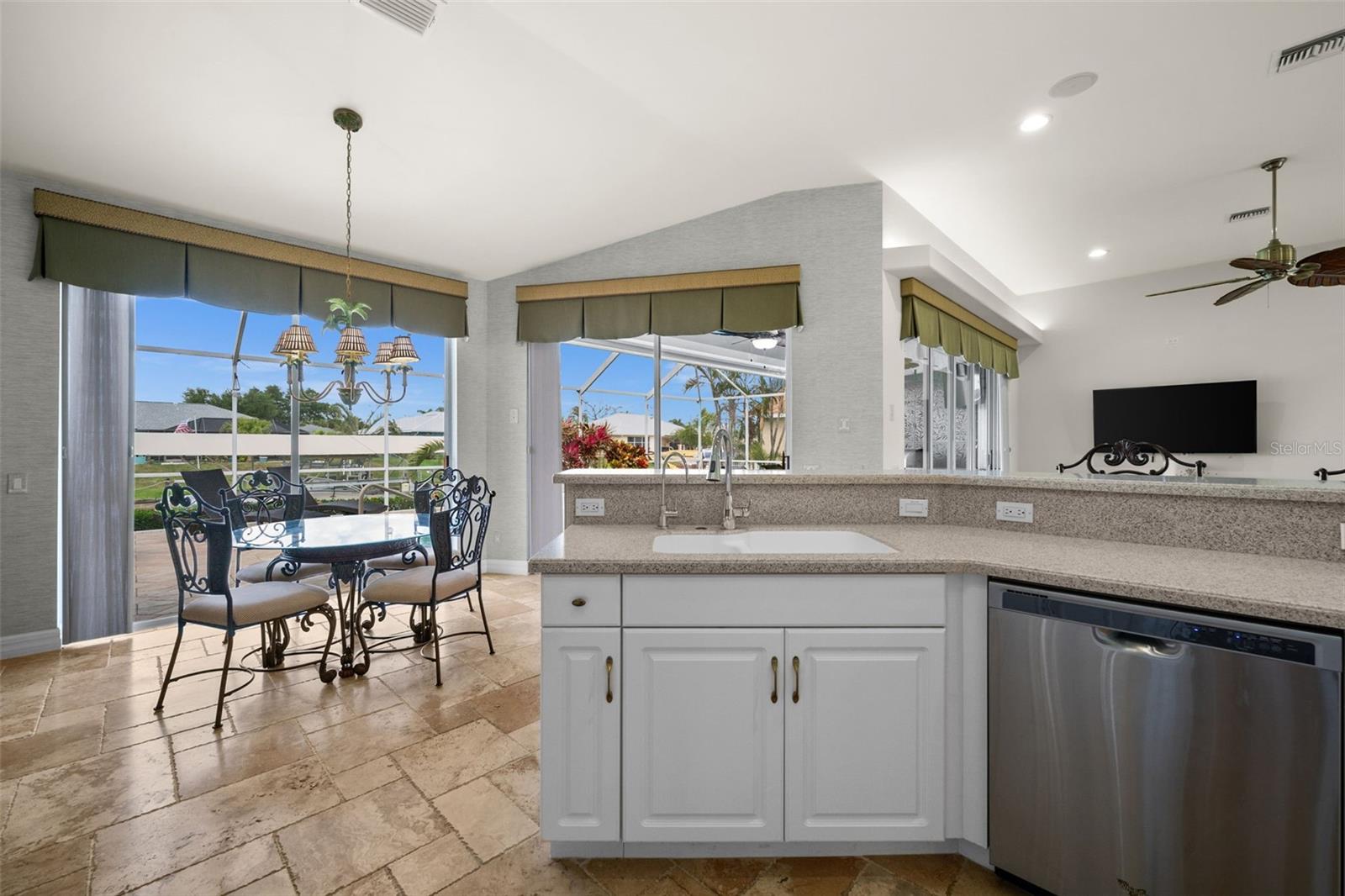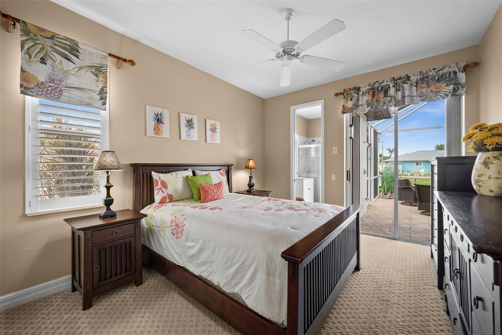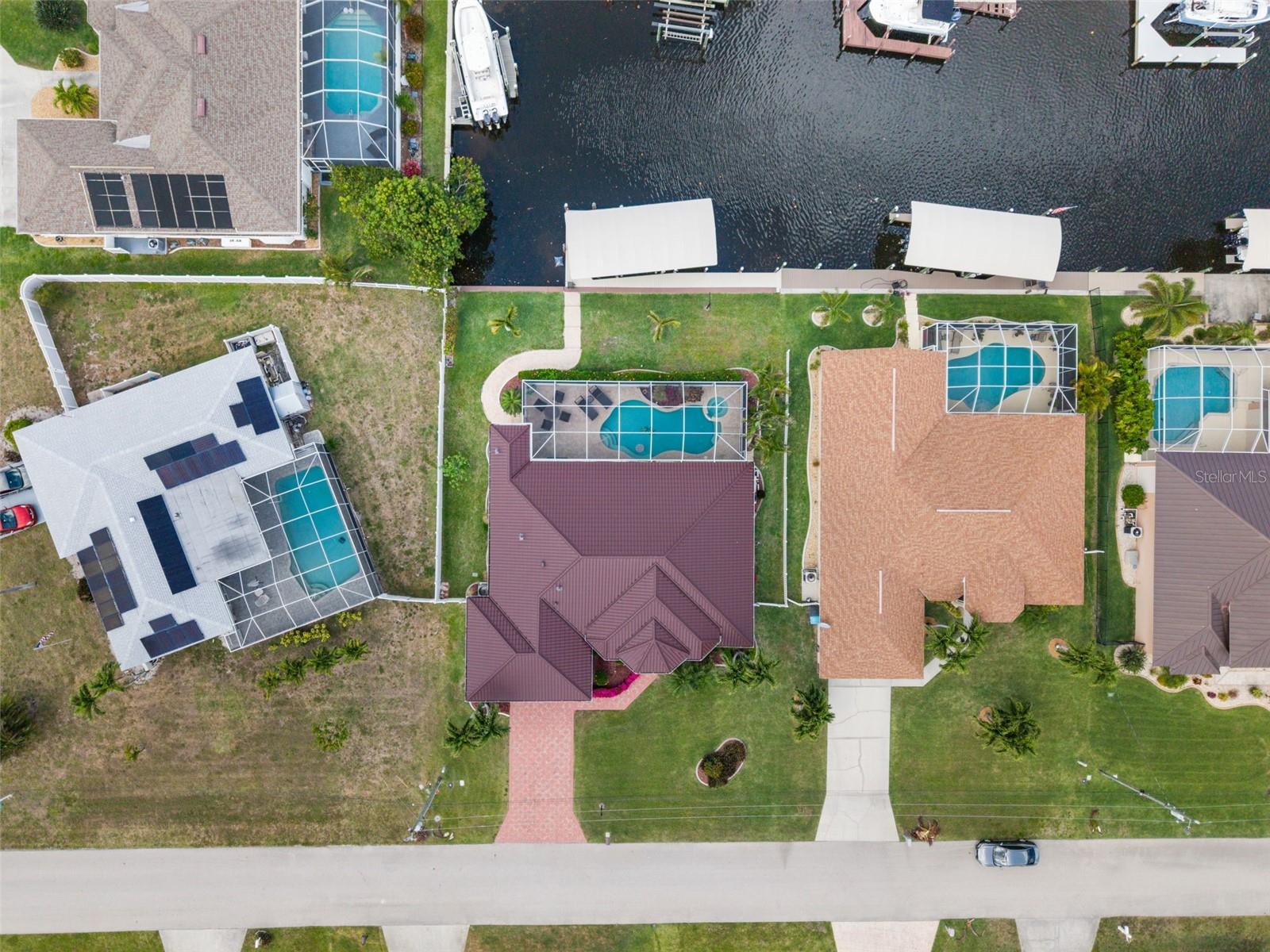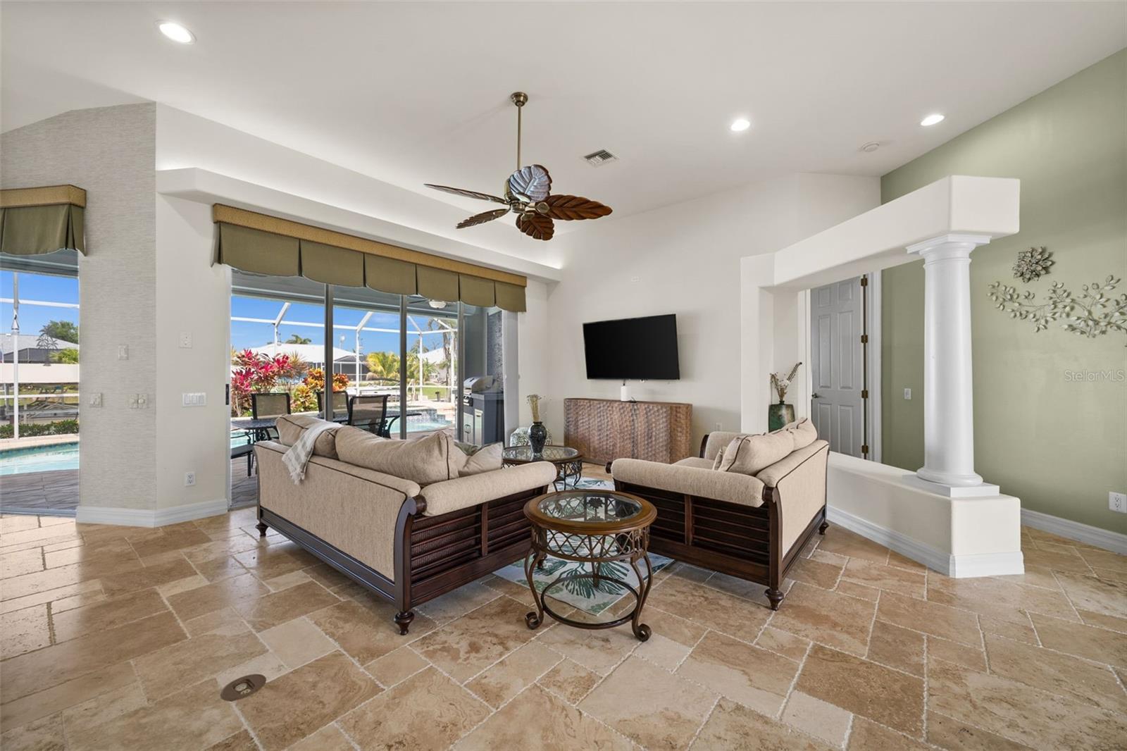 Welcome to this stunning Floridian villa on a Gulf-access canal in Southwest Cape Coral. This 3-bedroom, 3-bathroom home with an office is designed for seamless indoor-outdoor living. With 2,150 square feet of interior space and a wide-open floor plan, the home flows naturally into the incredible outdoor areas, offering a true resort-style experience. Large sliding doors lead from the main living area to a spacious, screened lanai, where a heated pool and spa become the centerpiece of outdoor relaxation. The pool and spa are fully controllable via phone app through the Pentair Automation System. The oversized paver patio wraps around the pool, offering multiple lounging areas including a dedicated fire table lounge with oversized chairs—perfect for entertaining under the stars. The outdoor kitchen is fully equipped with a built-in grill, refrigerator, prep space, and TV, all beneath a richly toned tongue-and-groove ceiling with tropical fans. Inside, the kitchen features a large island with a breakfast bar and stainless appliances, opening to the living and dining areas with volume ceilings and custom lighting. Travertine floors flow throughout the main areas, and the split-bedroom layout ensures privacy for all. The spacious primary suite features dual walk-in closets and a luxurious bathroom with dual sinks, a garden tub, and a walk-through shower. The junior suite offers its own private bath and pool access, while a third bedroom and bath complete the guest wing. The office includes French doors, a bay window, and a built-in desk. Outside, the composite dock with a captain’s walk, 10,000 lb boat lift with remote, and 36’ canopy stands ready for a short boat ride to restaurants, beaches and the Gulf. Other features include electric storm shutters, a whole-house water softener, a reverse osmosis drinking system, smart home automation via Vivint, and a premium Worthhouse steel roof with transferable warranty. This home is NOT IN A FLOOD ZONE and HAS NEVER FLOODED OR SUSTAINED HURRICANE DAMAGE in any recent storms. Located in the popular Pelican neighborhood, close to shopping, dining, and downtown Cape Coral, this home blends elegance, comfort, and true SW Florida lifestyle.