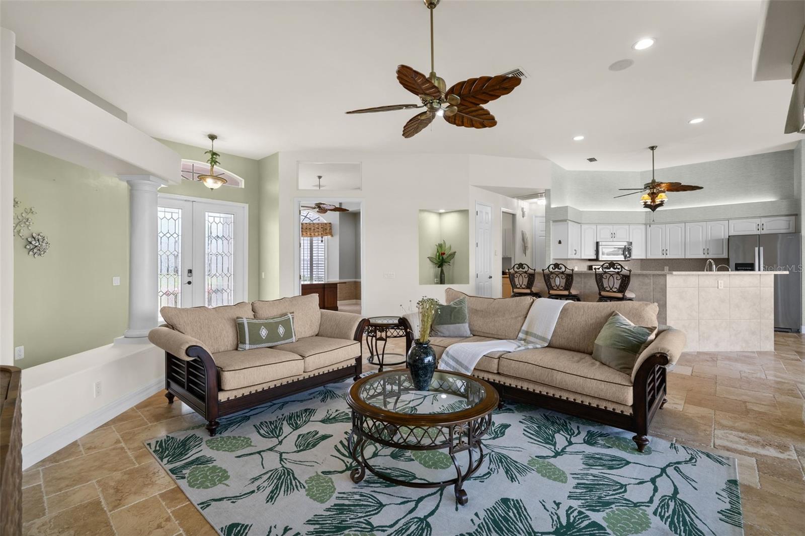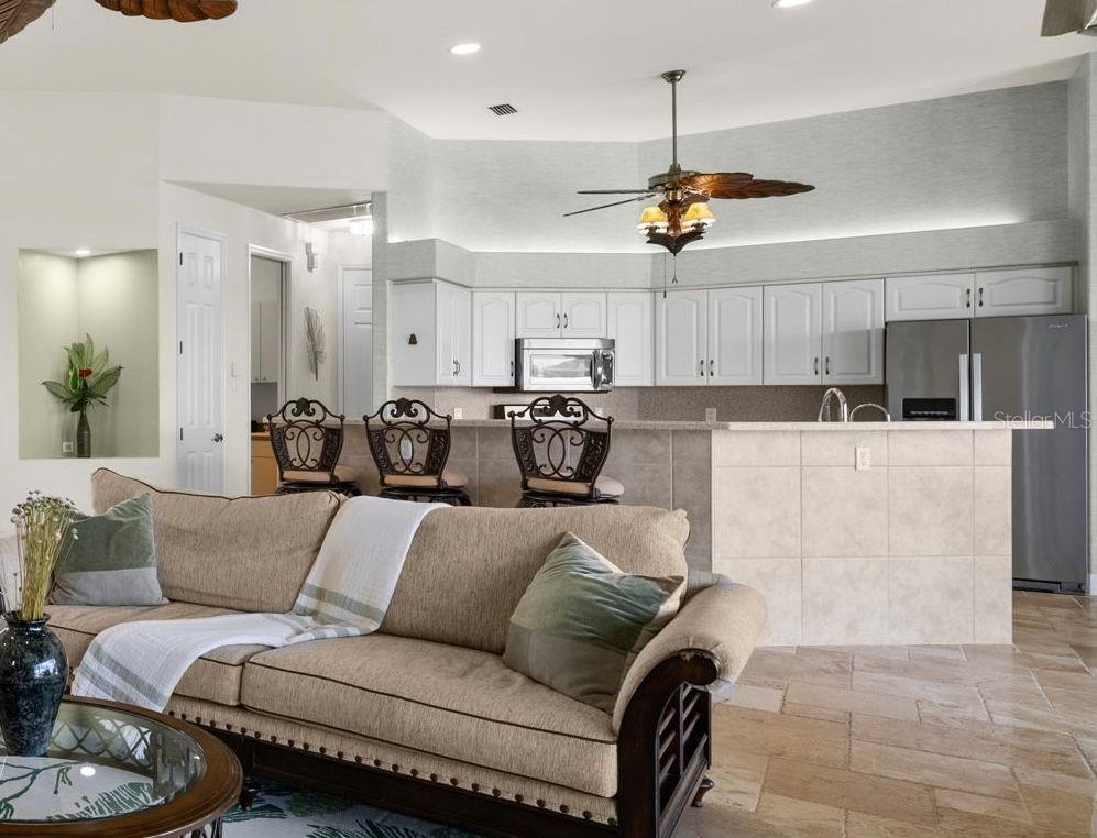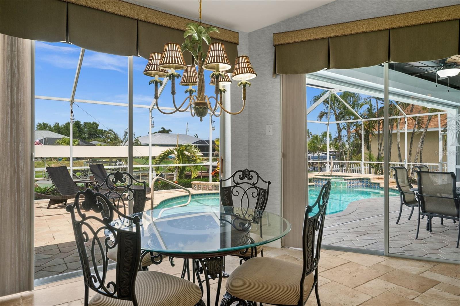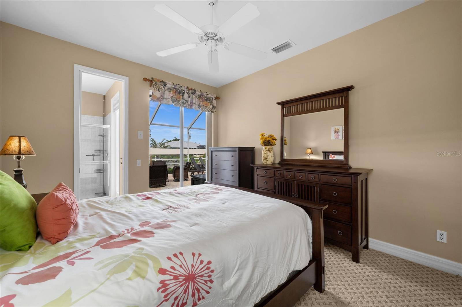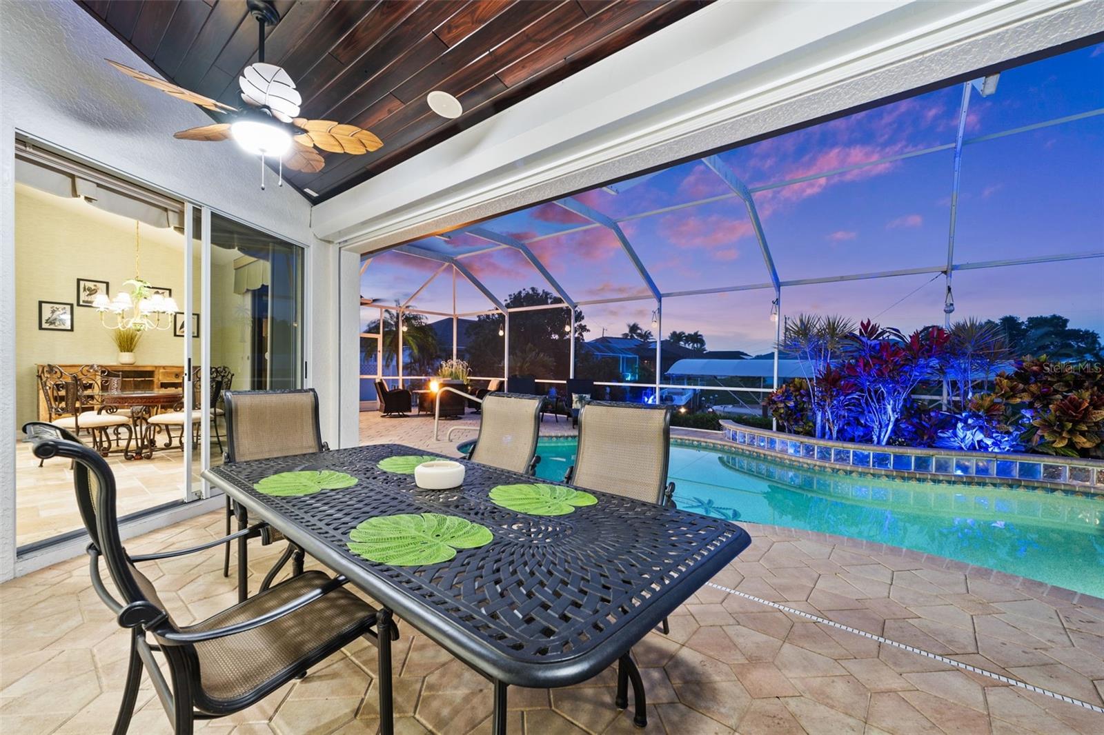 Welcome to this stunning Floridian villa on a Gulf-access canal in Southwest Cape Coral. This 3-bedroom, 3-bathroom home with an office is designed for seamless indoor-outdoor living. With 2,150 square feet of interior space and a wide-open floor plan, the home flows naturally into the incredible outdoor areas, offering a true resort-style experience. Large sliding doors lead from the main living area to a spacious, screened lanai, where a heated pool and spa become the centerpiece of outdoor relaxation. The pool and spa are fully controllable via phone app through the Pentair Automation System. The oversized paver patio wraps around the pool, offering multiple lounging areas including a dedicated fire table lounge with oversized chairs—perfect for entertaining under the stars. The outdoor kitchen is fully equipped with a built-in grill, refrigerator, prep space, and TV, all beneath a richly toned tongue-and-groove ceiling with tropical fans. Inside, the kitchen features a large island with a breakfast bar and stainless appliances, opening to the living and dining areas with volume ceilings and custom lighting. Travertine floors flow throughout the main areas, and the split-bedroom layout ensures privacy for all. The spacious primary suite features dual walk-in closets and a luxurious bathroom with dual sinks, a garden tub, and a walk-through shower. The junior suite offers its own private bath and pool access, while a third bedroom and bath complete the guest wing. The office includes French doors, a bay window, and a built-in desk. Outside, the composite dock with a captain’s walk, 10,000 lb boat lift with remote, and 36’ canopy stands ready for a short boat ride to restaurants, beaches and the Gulf. Other features include electric storm shutters, a whole-house water softener, a reverse osmosis drinking system, smart home automation via Vivint, and a premium Worthhouse steel roof with transferable warranty. This home is NOT IN A FLOOD ZONE and HAS NEVER FLOODED OR SUSTAINED HURRICANE DAMAGE in any recent storms. Located in the popular Pelican neighborhood, close to shopping, dining, and downtown Cape Coral, this home blends elegance, comfort, and true SW Florida lifestyle.