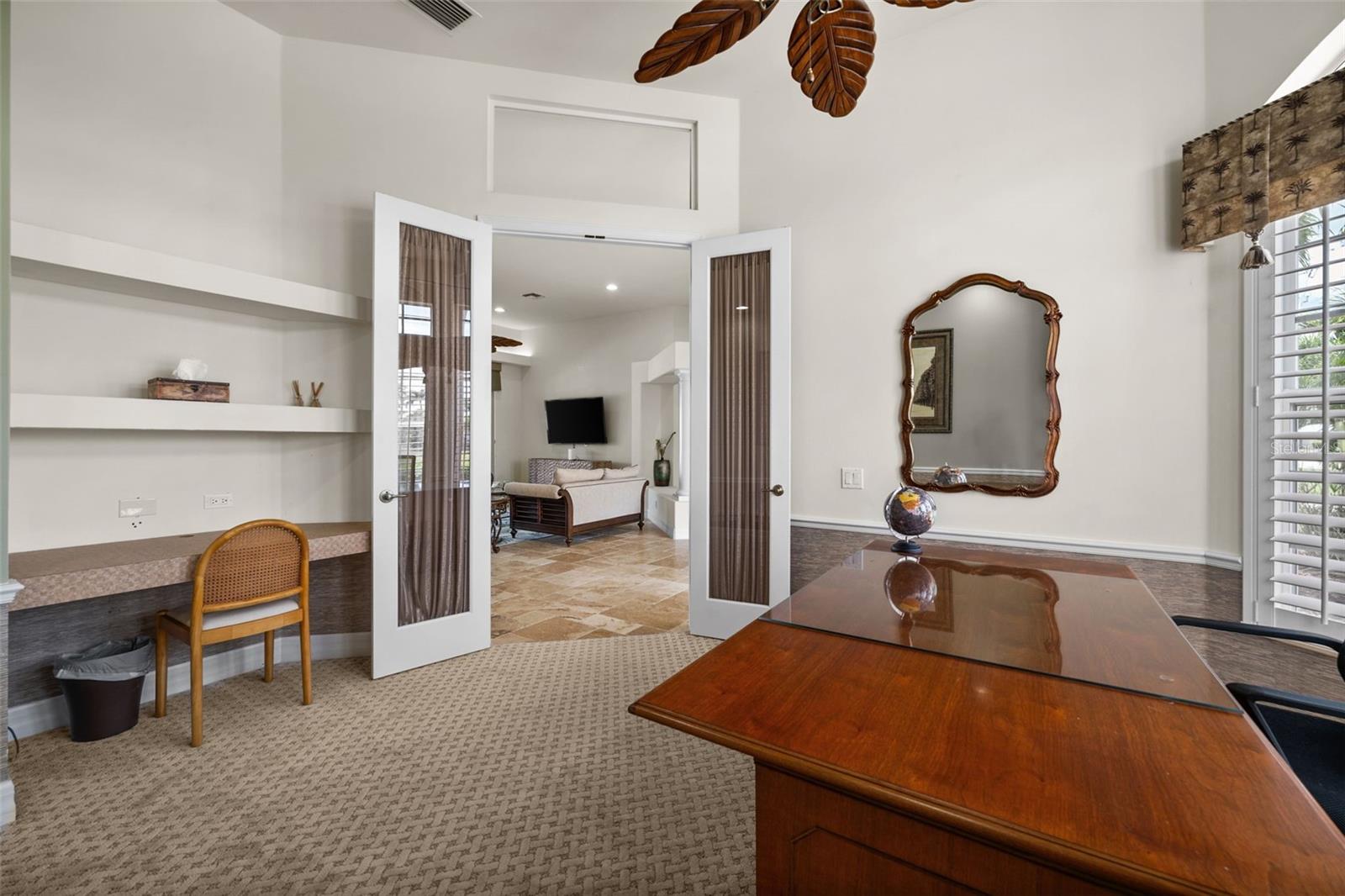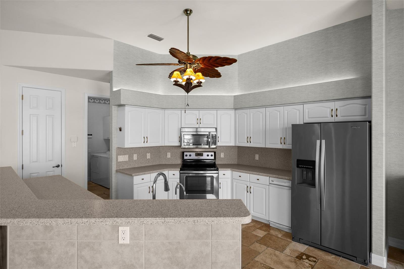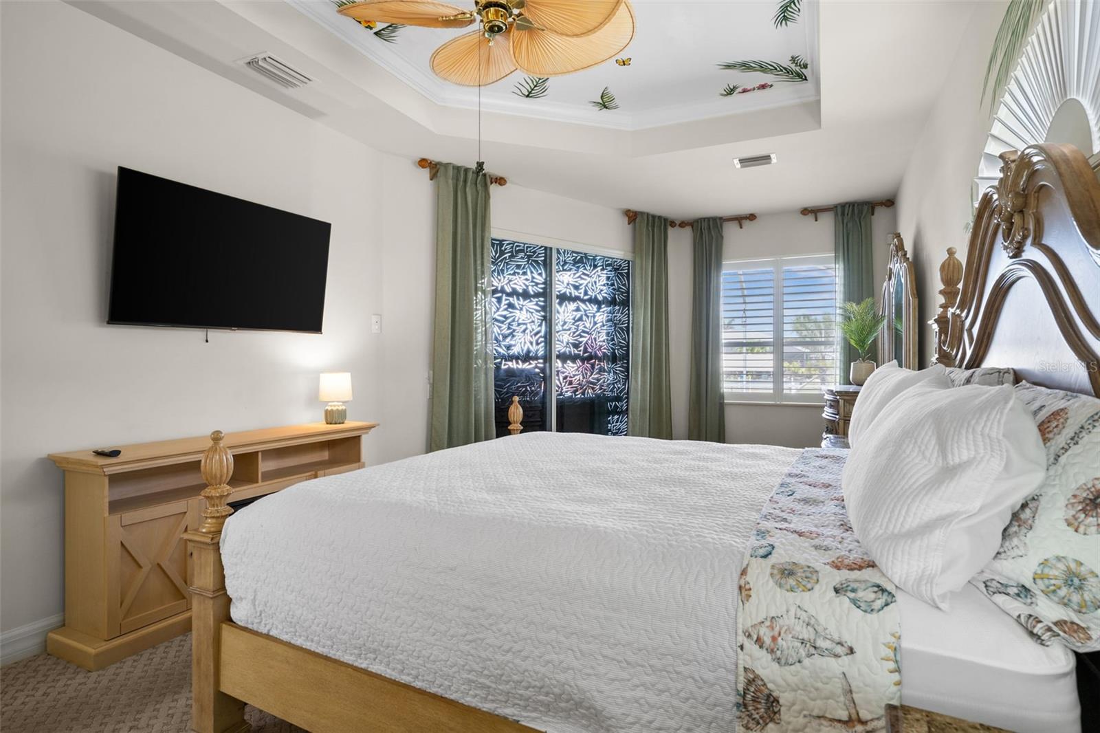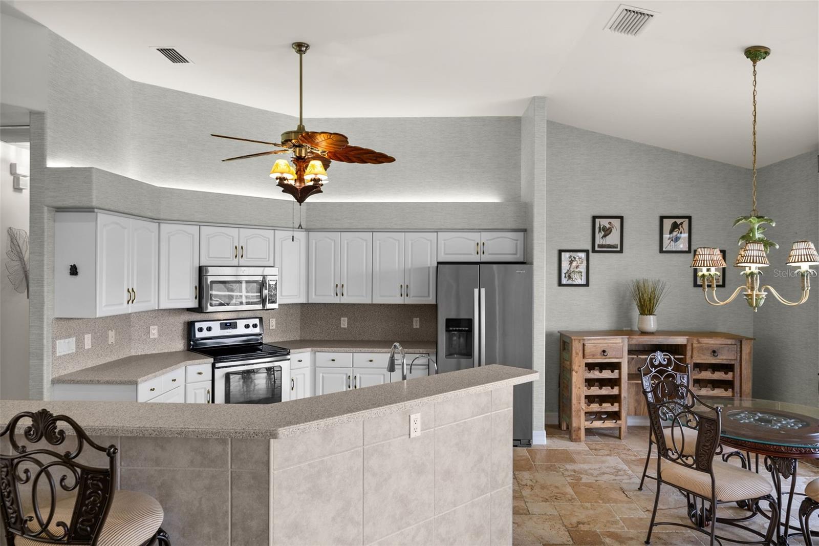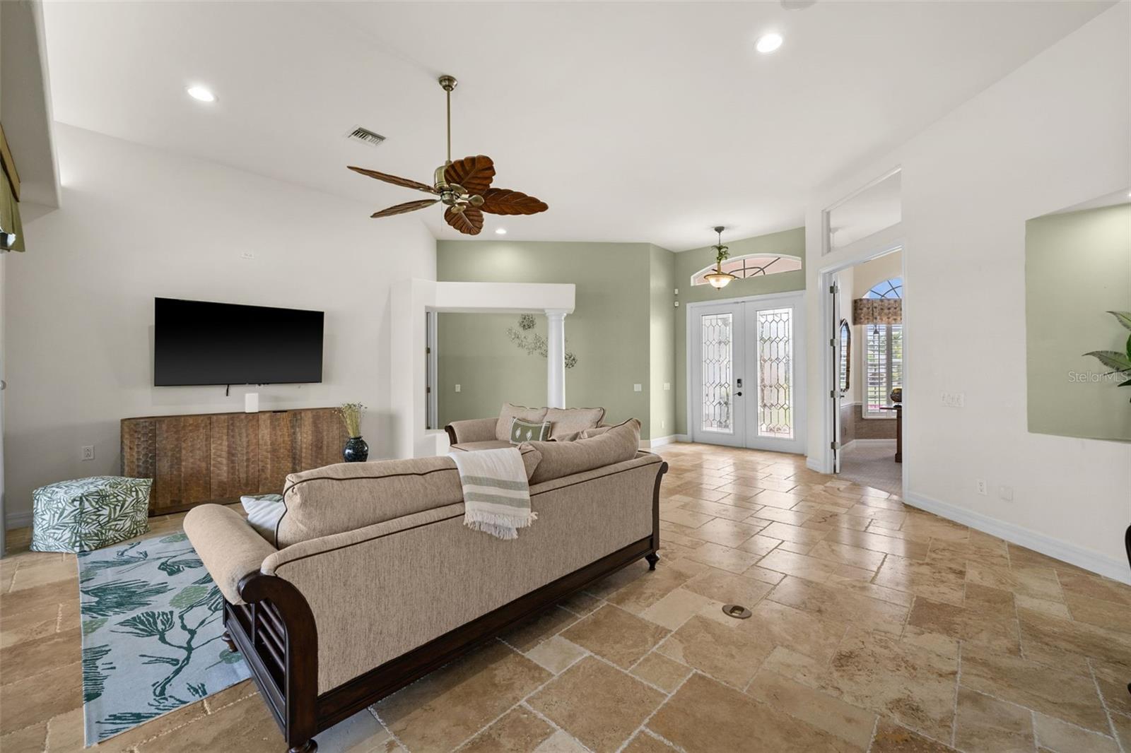 Welcome to this stunning Floridian villa on a Gulf-access canal in Southwest Cape Coral. This 3-bedroom, 3-bathroom home with an office is designed for seamless indoor-outdoor living. With 2,150 square feet of interior space and a wide-open floor plan, the home flows naturally into the incredible outdoor areas, offering a true resort-style experience. Large sliding doors lead from the main living area to a spacious, screened lanai, where a heated pool and spa become the centerpiece of outdoor relaxation. The pool and spa are fully controllable via phone app through the Pentair Automation System. The oversized paver patio wraps around the pool, offering multiple lounging areas including a dedicated fire table lounge with oversized chairs—perfect for entertaining under the stars. The outdoor kitchen is fully equipped with a built-in grill, refrigerator, prep space, and TV, all beneath a richly toned tongue-and-groove ceiling with tropical fans. Inside, the kitchen features a large island with a breakfast bar and stainless appliances, opening to the living and dining areas with volume ceilings and custom lighting. Travertine floors flow throughout the main areas, and the split-bedroom layout ensures privacy for all. The spacious primary suite features dual walk-in closets and a luxurious bathroom with dual sinks, a garden tub, and a walk-through shower. The junior suite offers its own private bath and pool access, while a third bedroom and bath complete the guest wing. The office includes French doors, a bay window, and a built-in desk. Outside, the composite dock with a captain’s walk, 10,000 lb boat lift with remote, and 36’ canopy stands ready for a short boat ride to restaurants, beaches and the Gulf. Other features include electric storm shutters, a whole-house water softener, a reverse osmosis drinking system, smart home automation via Vivint, and a premium Worthhouse steel roof with transferable warranty. This home is NOT IN A FLOOD ZONE and HAS NEVER FLOODED OR SUSTAINED HURRICANE DAMAGE in any recent storms. Located in the popular Pelican neighborhood, close to shopping, dining, and downtown Cape Coral, this home blends elegance, comfort, and true SW Florida lifestyle.