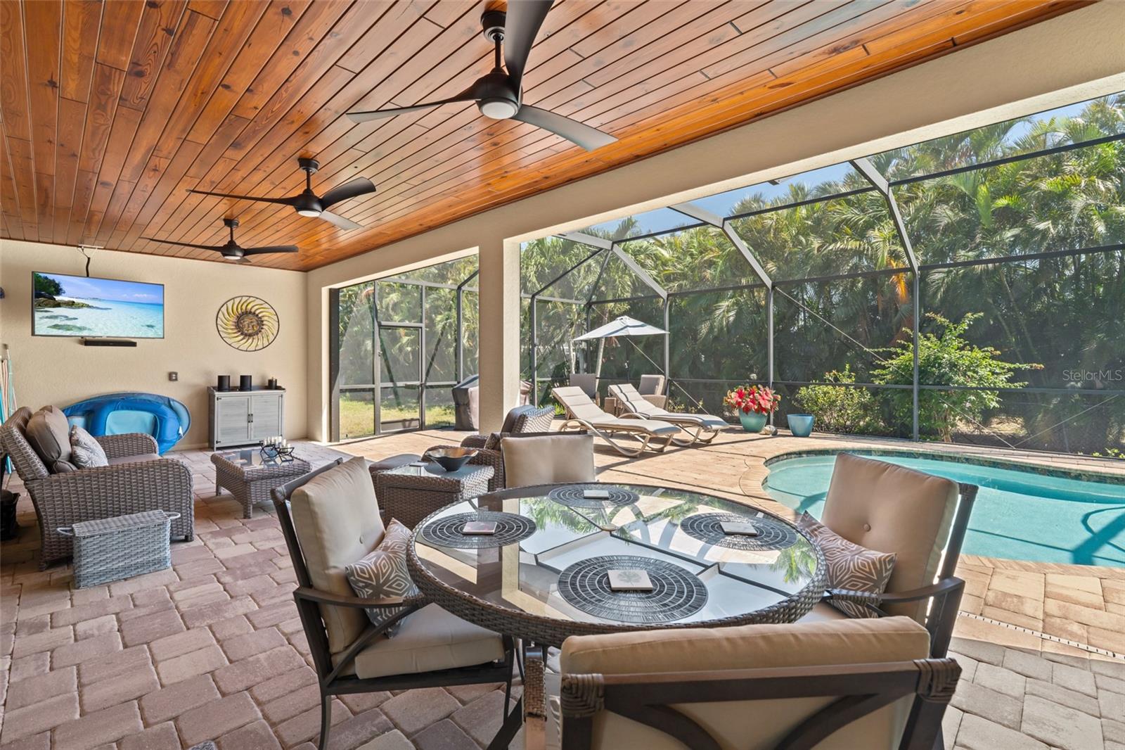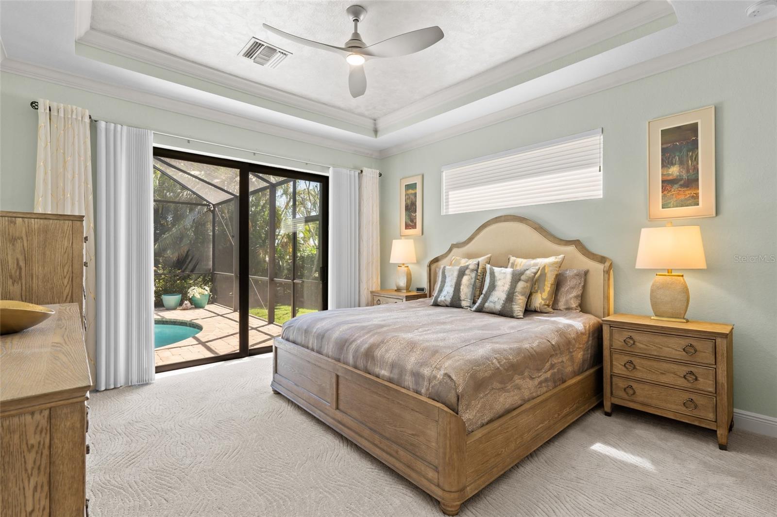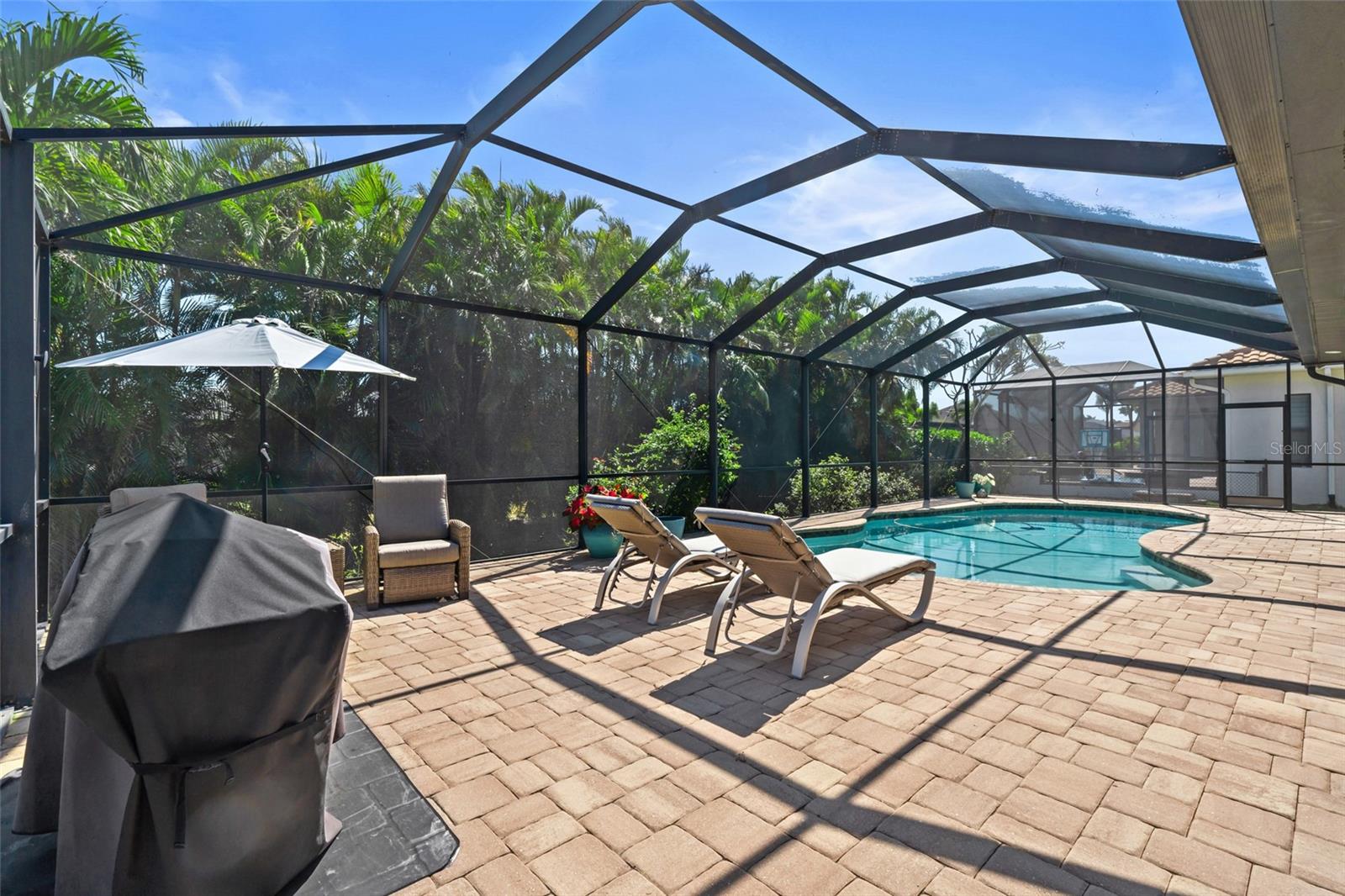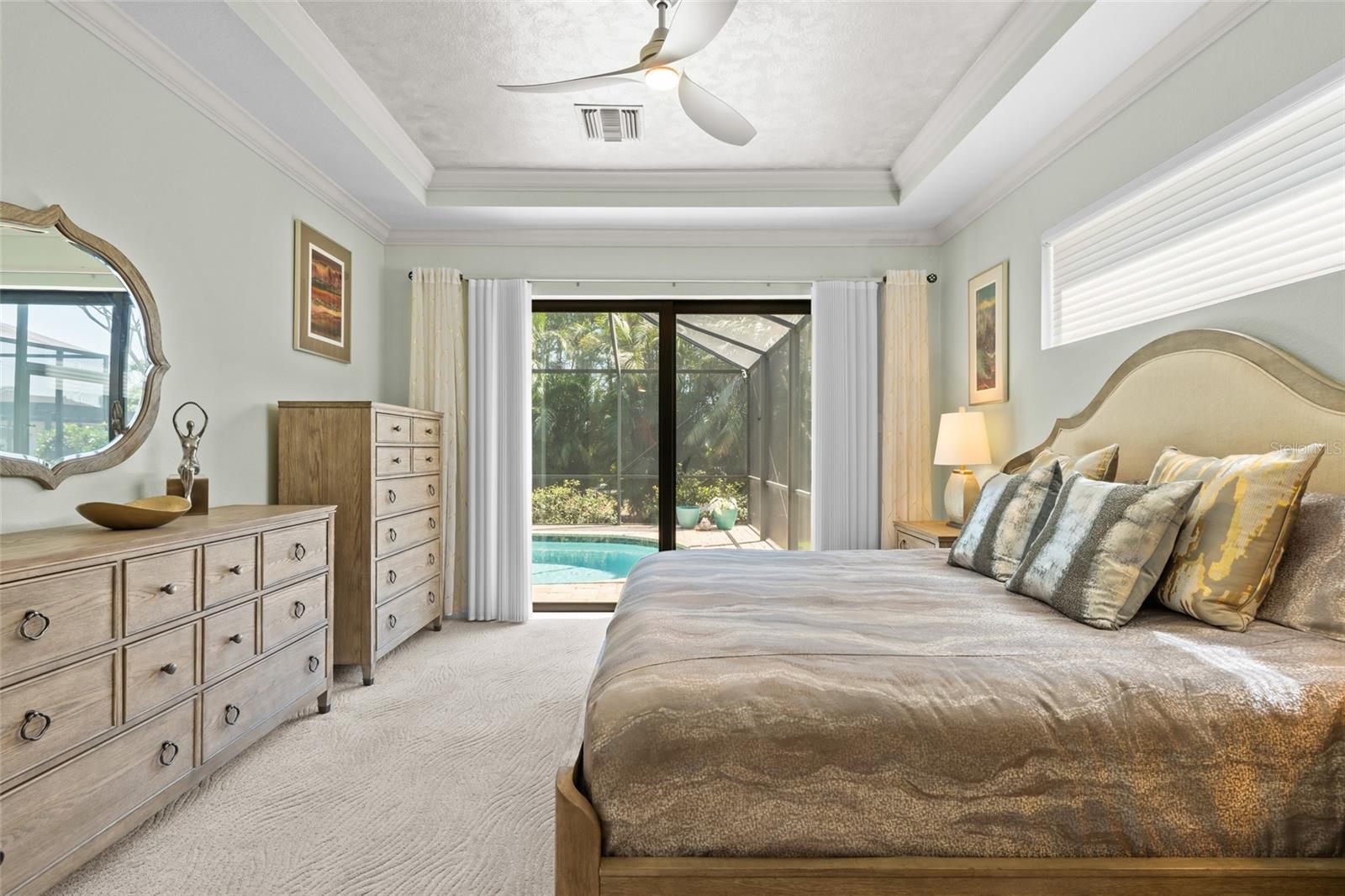 Spectacular custom built high-end executive residence offers luxurious living with every detail carefully thought out and upgraded—this home needs absolutely nothing! Built in 2016 and extensively updated in 2024, this property is a rare find that seamlessly blends timeless elegance with modern convenience. Step inside to a bright, open floor plan with extra-high and stunning tray ceiling details in the living room, primary suite, and office/den. Natural light pours through the high-impact, low-E hurricane-rated windows and doors, providing beauty, energy efficiency, and security. Elegant crown molding runs throughout the entire home, adding a sophisticated finishing touch. The heart of the home is the chef’s kitchen, upgraded with exquisite Cambria quartz countertops in 2024, along with high-end cabinetry and stylish fixtures that are both functional and luxurious. Beautiful travertine tile flooring flows throughout the main living areas, enhancing the home’s warm, upscale feel. The spacious primary suite offers a peaceful retreat, featuring tray ceilings, ample light, and a luxurious en-suite bathroom with dual vanities and gorgeous soapstone countertops. The oversized walk-in closet connects to the laundry room--a brilliant convenience and rare in most homes. The additional bedrooms are generously sized, and the office/den is perfect for remote work, a reading room, or a quiet escape. Step outside to your personal paradise—a covered lanai with a rich cedar ceiling and powerful ceiling fans, creating a serene atmosphere for entertaining or relaxing. The 90-degree pocketing sliding glass doors open fully, blending the indoors with the outdoors and leading to your heated saltwater pool, ideal for year-round enjoyment. Other features include a brand new A/C unit, new pool pump, and a whole-house reverse osmosis (RO) water system, Storm Smart screens on lanai, all installed in 2024. There’s also a dedicated EV hookup installed in 2022, along with a mini-split air conditioner in the spacious 3-car garage and wired for generator hookup.. A fresh coat of interior paint brightens the entire home. Storage is abundant, with smartly designed spaces throughout. Best of all, this home has never experienced flooding from any storm—a major bonus in Florida living. This one-of-a-kind property checks all the boxes for luxury, comfort, and peace of mind. Whether you're seeking a full-time residence or a high-end seasonal escape, this home offers everything you need. Don’t miss the opportunity to own a true gem—schedule your private tour today! Transferrable Owner Flood insurance $1867/year.