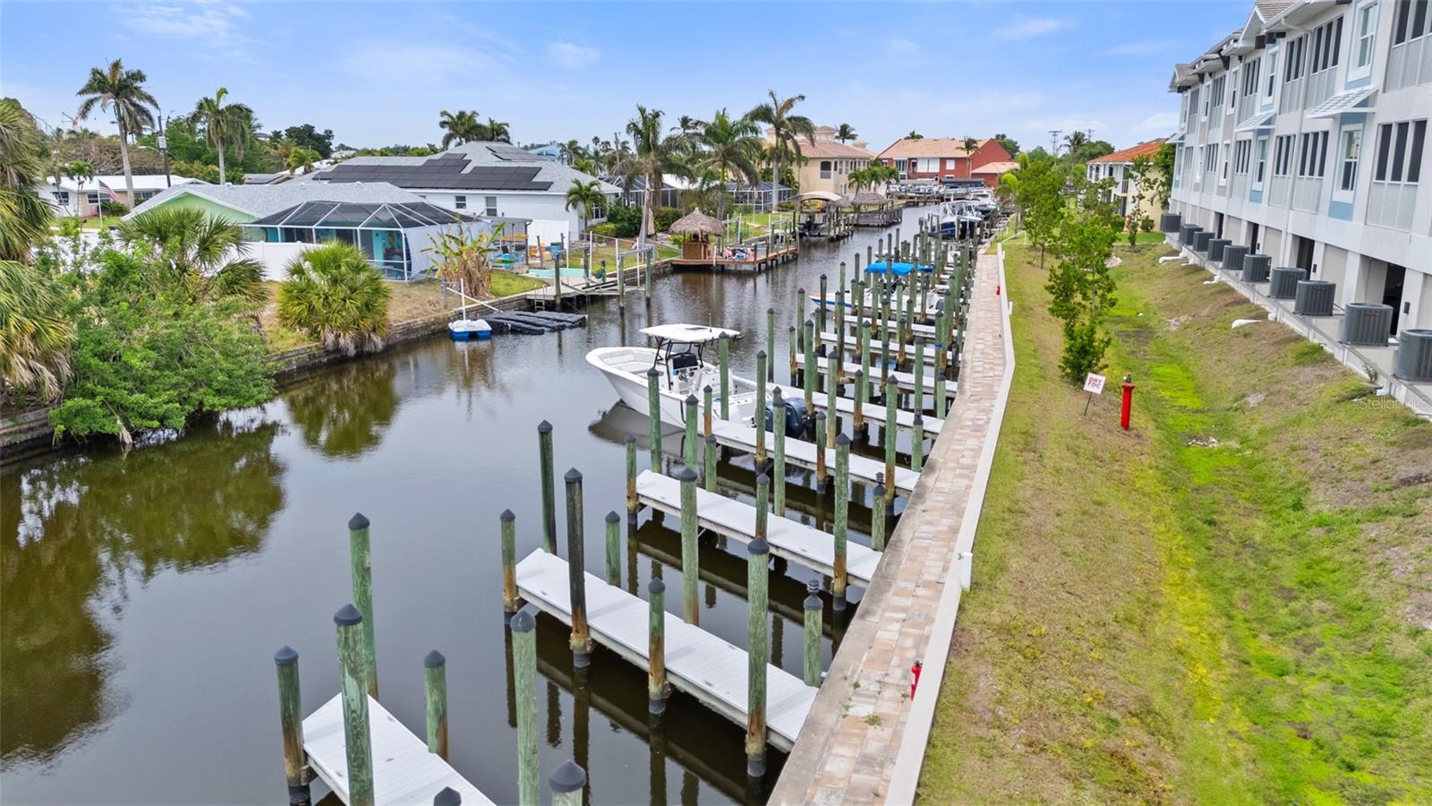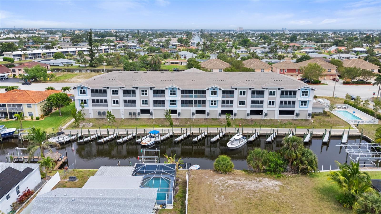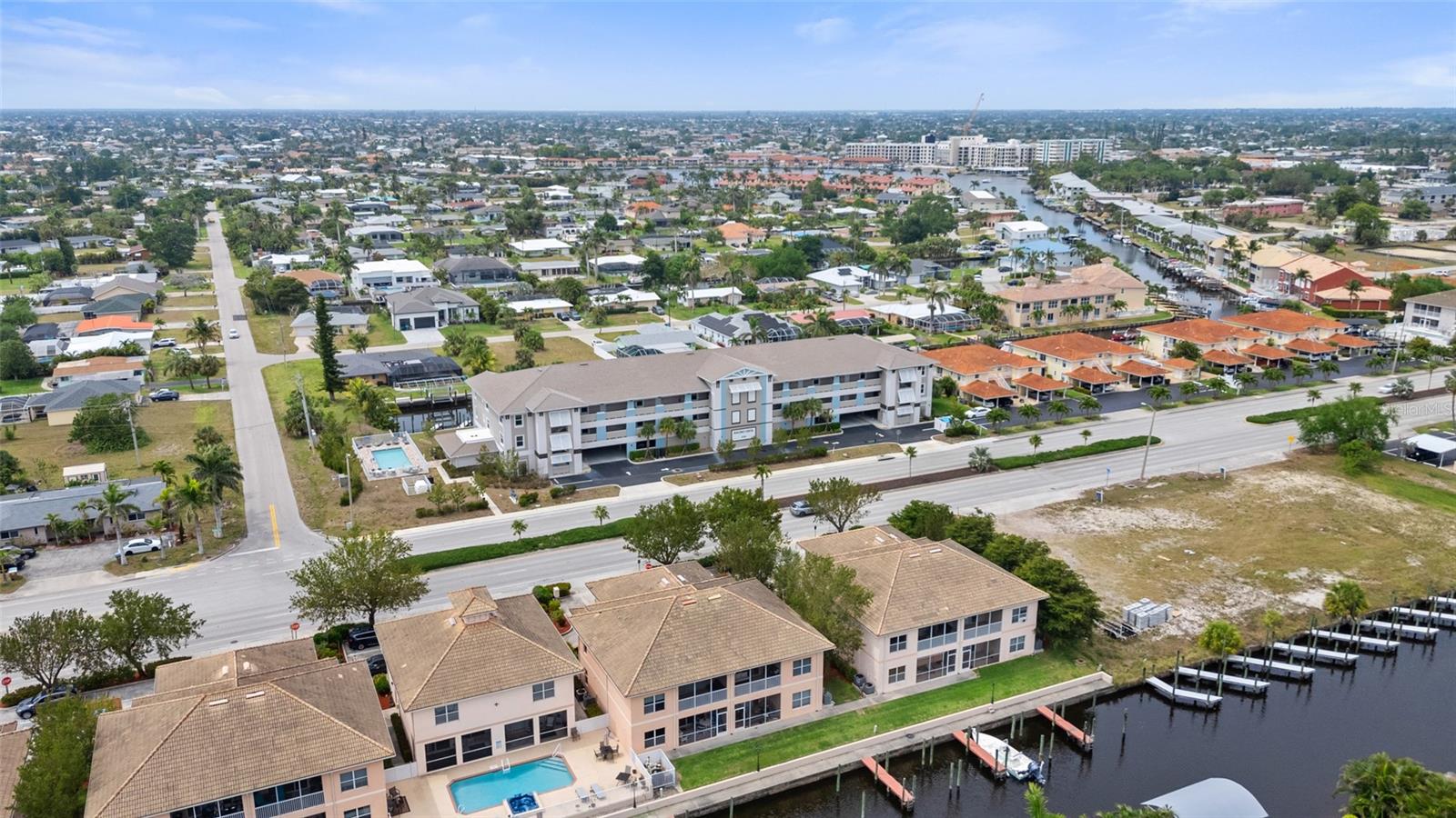 Brand-New Gulf Access Condo – Turnkey & Fully Furnished! Don’t miss the only newly built Gulf access condo community in Cape Coral! Bacino Vista is an exclusive 16-unit waterfront development offering direct, no-bridge access to open water with a deeded 18-ft boat slip. This modern 2-bedroom, 2-bathroom condo, built in 2023, is fully furnished and move-in ready. The open floor plan features 9-foot ceilings, recessed lighting, and porcelain tile flooring throughout. The chef’s kitchen is designed for both style and functionality, boasting granite countertops, a walk-in pantry, stainless steel appliances, chic pendant lighting, and a breakfast bar with seating for four. The primary suite offers direct balcony access, a walk-in closet, and a spa-like en-suite with dual sinks and a luxurious walk-in shower featuring subway tile and a rainfall showerhead. The guest bath includes a soaking tub. Relax on your screened-in lanai with peaceful canal views, or enjoy the resort-style saltwater pool surrounded by tropical landscaping. Additional perks include two assigned garage parking spaces, a locked 6’x8’ storage unit, a common elevator, and guest parking. Located near downtown Cape Coral, you'll have easy access to dining, shopping, and entertainment. Future enhancements, including the renovated Cape Coral Yacht Club, public beach expansion, and the Bimini Basin’s upcoming waterfront dining and retail, will further elevate this prime location. With major development projects underway, these condos are poised for significant appreciation. Whether you're seeking a full-time residence or a high-performing rental investment, this is an opportunity you won’t want to miss. Schedule your private tour today!