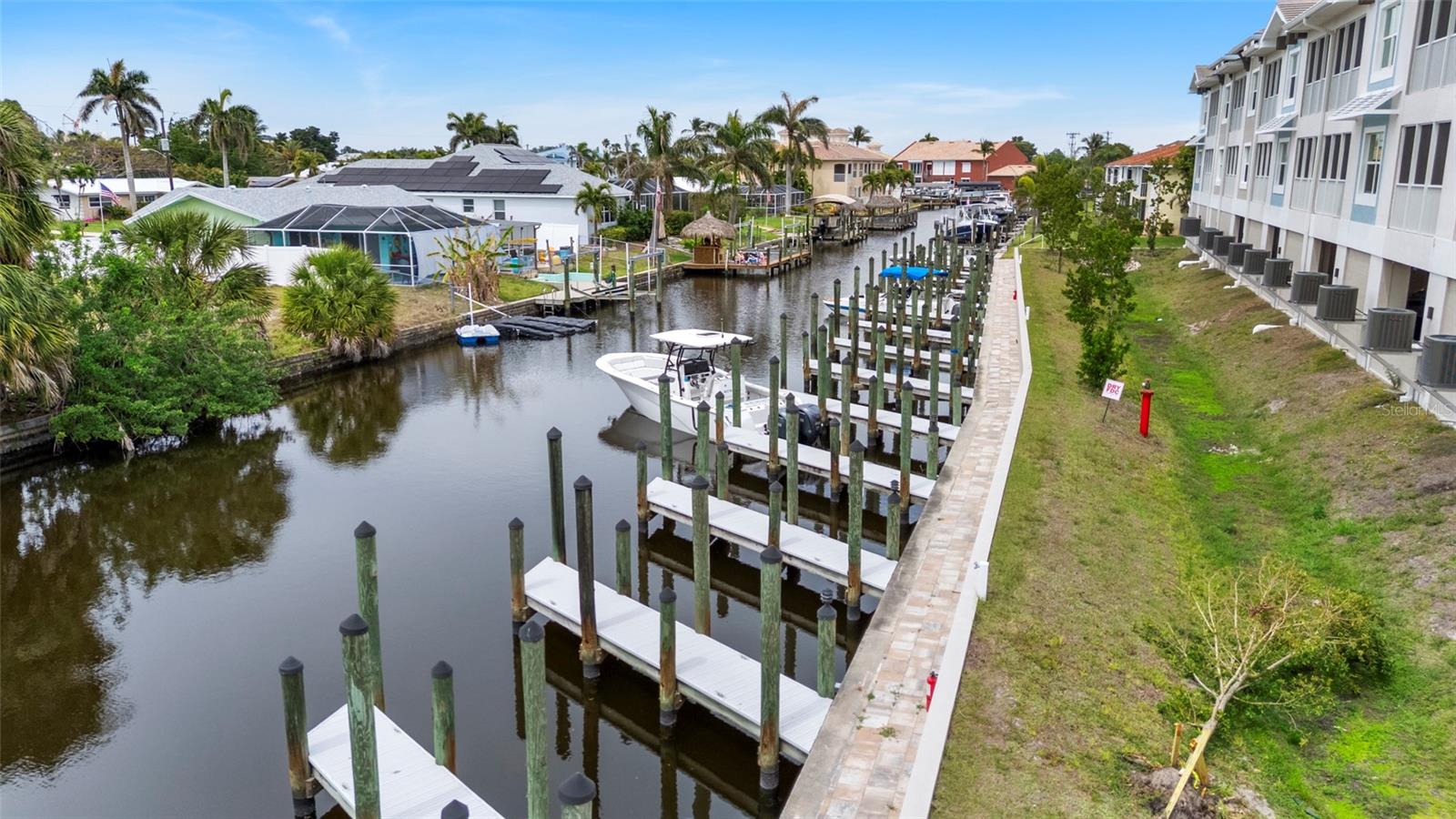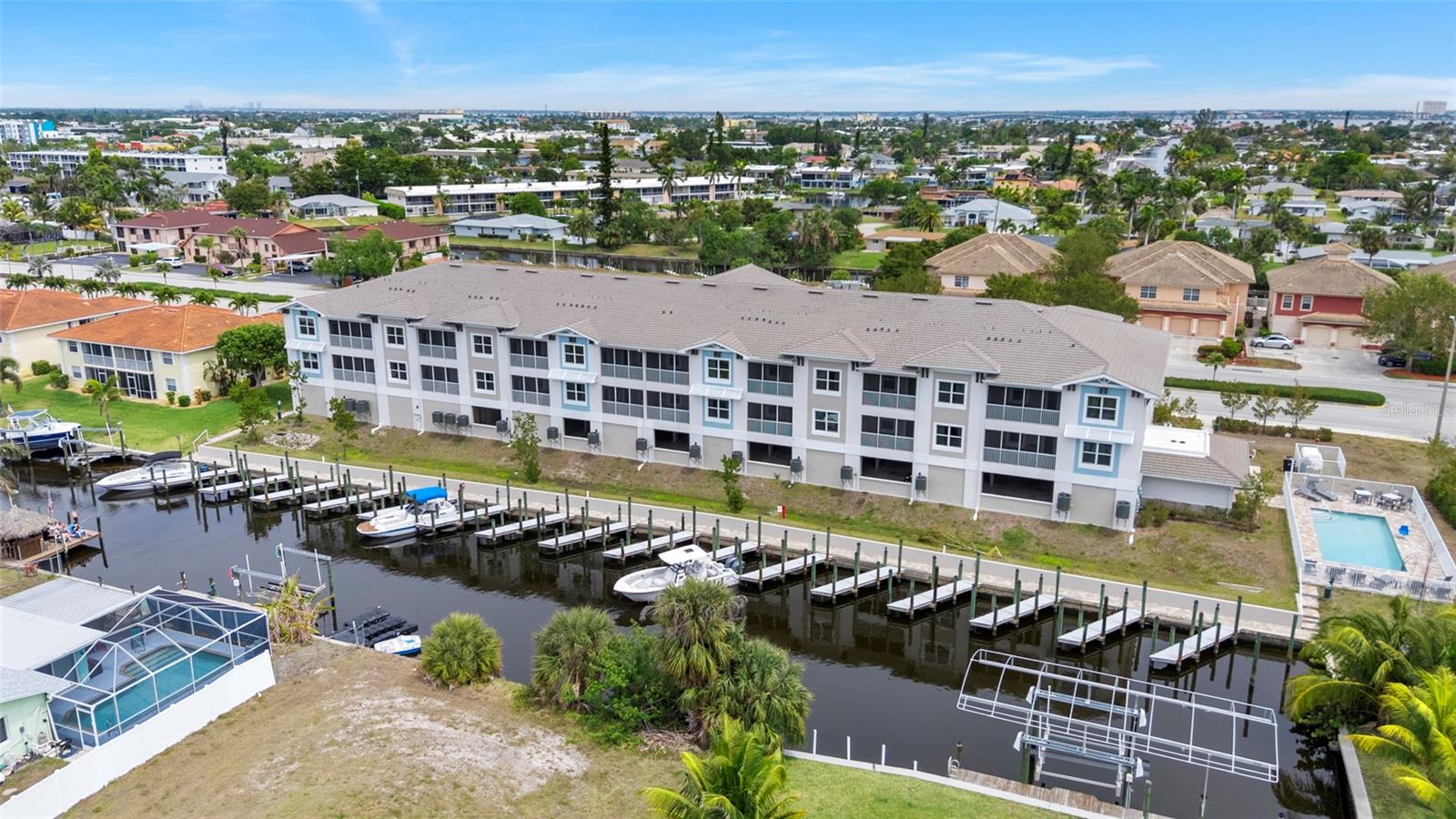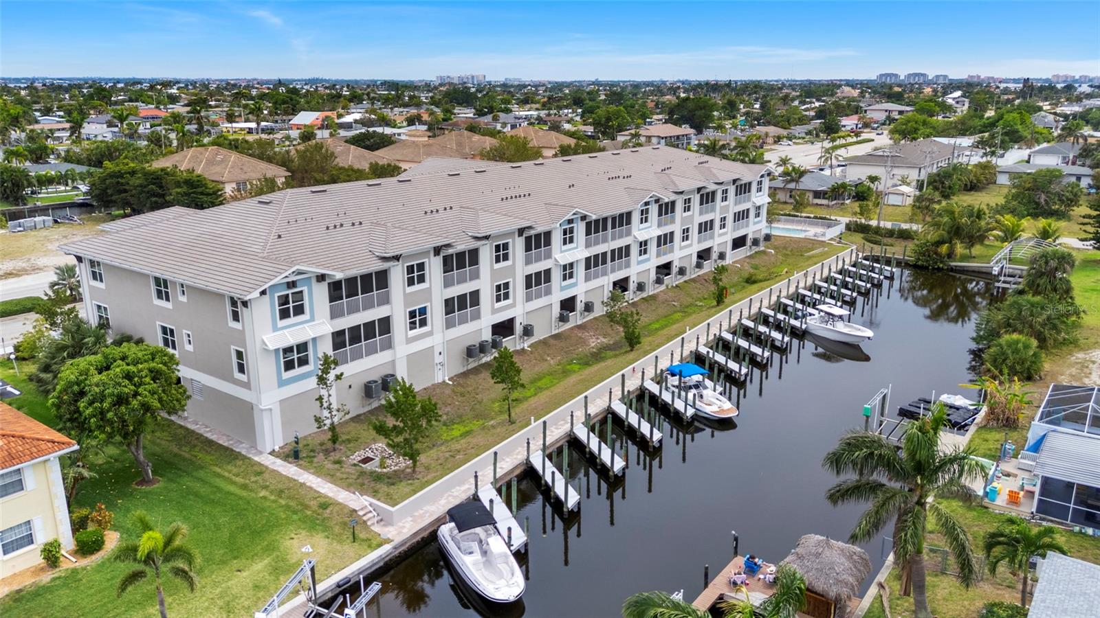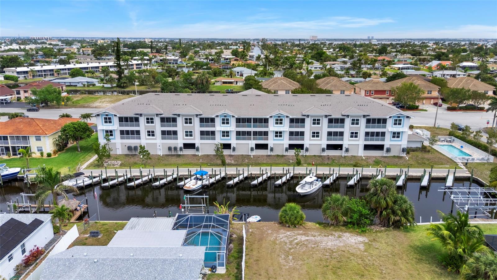 Brand-New Gulf Access Condo – Turnkey & Fully Furnished! Don’t miss the only newly built Gulf access condo community in Cape Coral! Bacino Vista is an exclusive 16-unit waterfront development offering direct, no-bridge access to open water with a deeded 18-ft boat slip. This modern 2-bedroom, 2-bathroom plus a den condo, built in 2023, is fully furnished and move-in ready. The open floor plan features 9-foot ceilings, recessed lighting, and porcelain tile flooring throughout. The chef’s kitchen is designed for both style and functionality, boasting granite countertops, a walk-in pantry, stainless steel appliances, chic pendant lighting, and a breakfast bar with seating for four. The primary suite offers direct balcony access, a walk-in closet, and a spa-like en-suite with dual sinks and a luxurious walk-in shower featuring subway tile and a rainfall showerhead. The guest bath includes a soaking tub. Relax on your screened-in lanai with peaceful canal views, or enjoy the resort-style saltwater pool surrounded by tropical landscaping. Additional perks include two assigned garage parking spaces, a locked 6’x8’ storage unit, a common elevator, and guest parking. Located near downtown Cape Coral, you'll have easy access to dining, shopping, and entertainment. Future enhancements, including the renovated Cape Coral Yacht Club, public beach expansion, and the Bimini Basin’s upcoming waterfront dining and retail, will further elevate this prime location. With major development projects underway, these condos are poised for significant appreciation. Whether you're seeking a full-time residence or a high-performing rental investment, this is an opportunity you won’t want to miss. Schedule your private tour today!