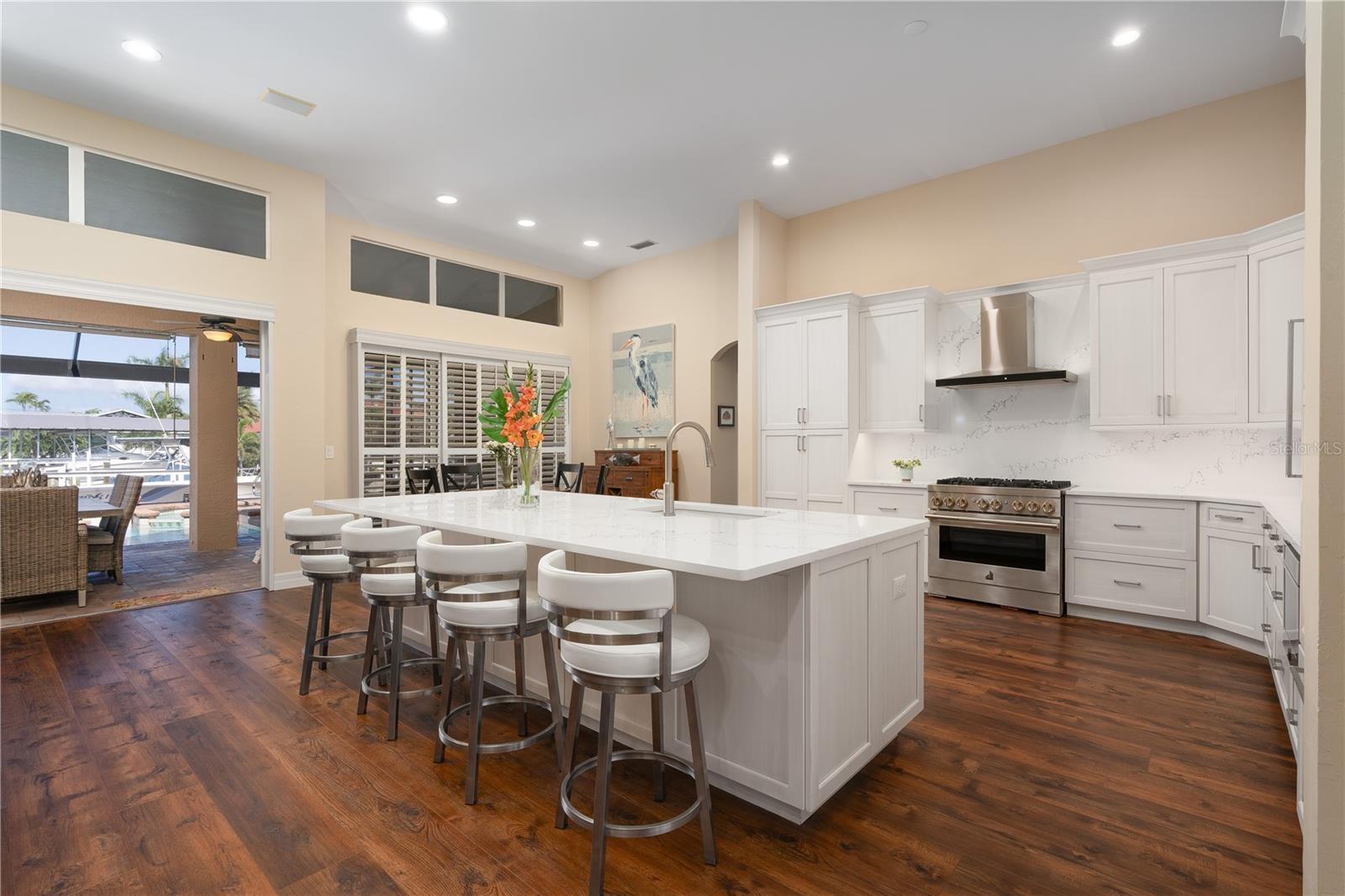 Welcome to your waterfront oasis with Gulf access and no bridges, offering the perfect blend of luxury, functionality, and outdoor living. This 3-bedroom plus den, 3-bath home is nestled on a wide canal and boasts a private boat dock and lift, making it a dream for boaters. Enjoy unforgettable sunsets from your beautiful saltwater pool and spa, all enclosed within a screened lanai for year-round enjoyment. Step inside and be captivated by the open-concept layout and rich wood laminate floors that flow throughout the home (bathrooms feature tile). The split-bedroom floor plan with volume ceilings creates privacy and openness all at once, perfect for both entertaining and everyday living. Plantation shutters throughout the home add timeless elegance and light control. The heart of the home is a spacious kitchen designed for both style and performance. Featuring cabinetry with crown molding, Quartz countertops, a large cook island with seating, and a high-end gas range, it’s a culinary dream. There’s even a dedicated bar area with glass cabinets and a beverage refrigerator, ideal for entertaining. The primary suite is a true retreat with a walk-in closet, a spa-inspired bathroom featuring a deep soaking tub, an expansive Quartz vanity, and a frameless glass walk-in shower. Two additional bedrooms, three full baths, and a flexible den with ample space for guests, hobbies, or a home office. Additional updates include a new roof (2018), AC unit (2019), and appliances (2021). What truly sets this home apart is the rare 500-gallon propane tank that fuels the gas range and is available for other uses as desired—adding convenience and value. Step out to the covered patio with paver flooring and ceiling fans, the perfect setting for poolside dining or relaxing while taking in tranquil sunset views over the canal. Whether you're boating, entertaining, or simply enjoying the serenity of waterfront living, this home offers the ultimate Florida lifestyle.