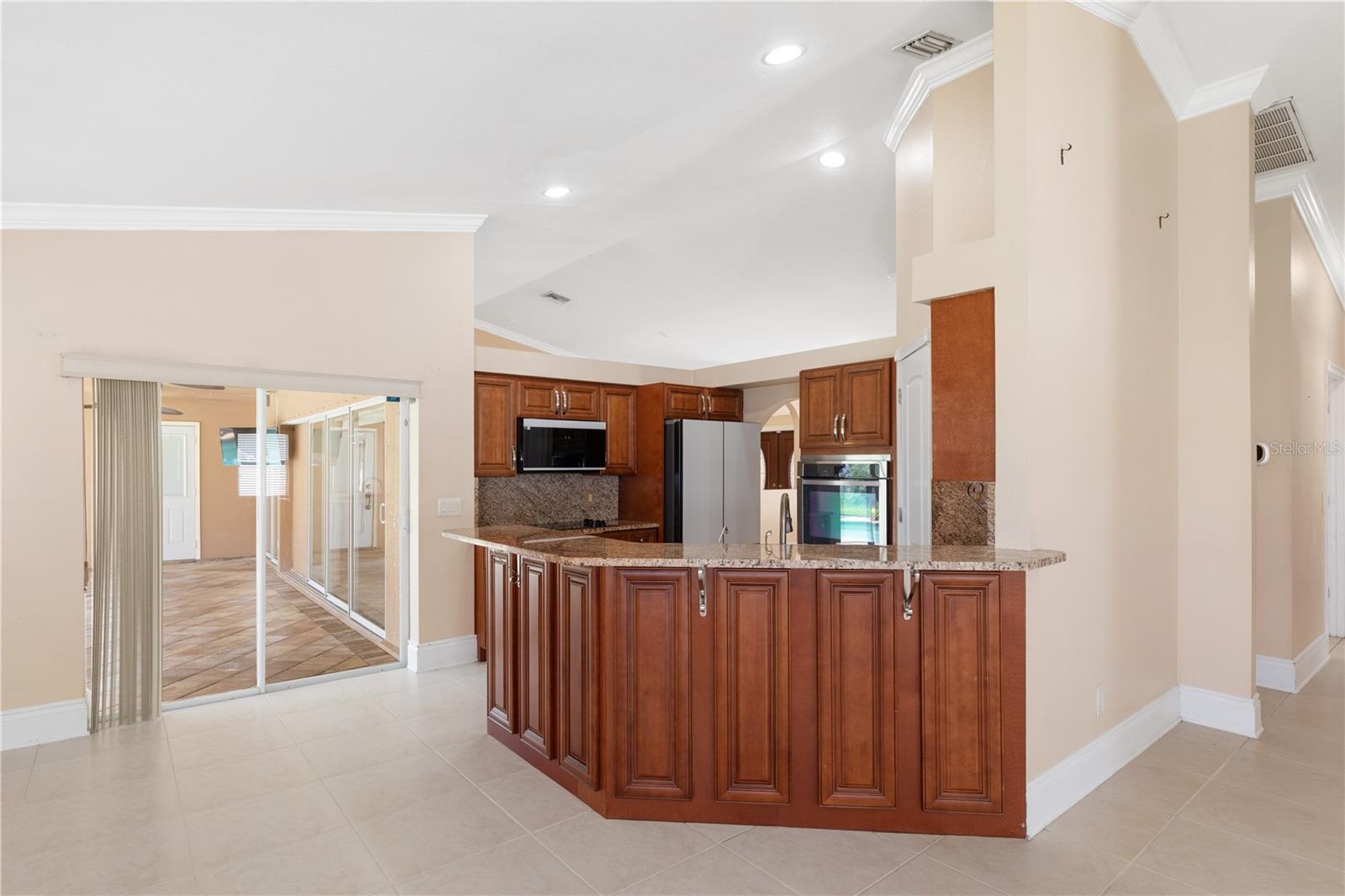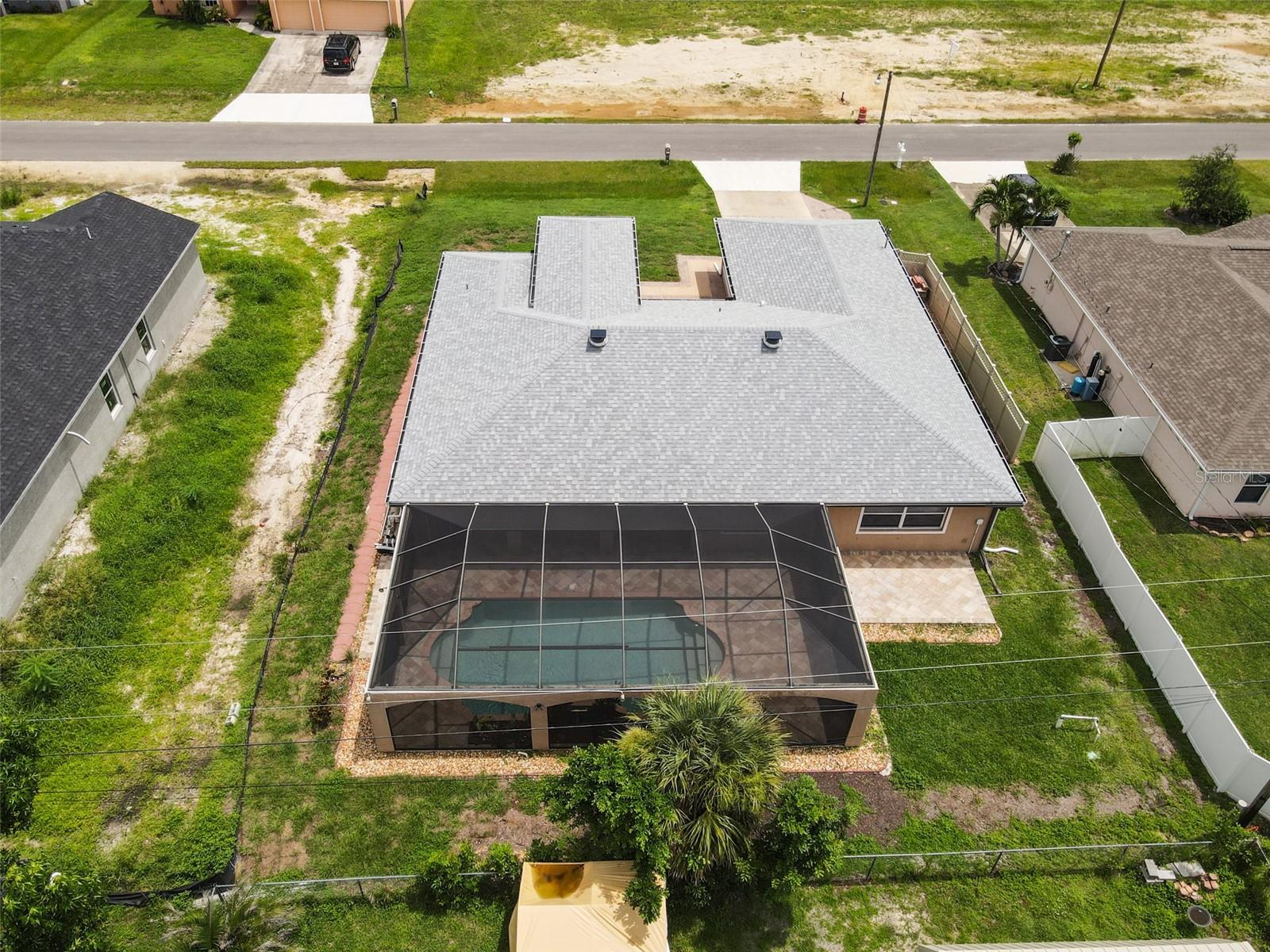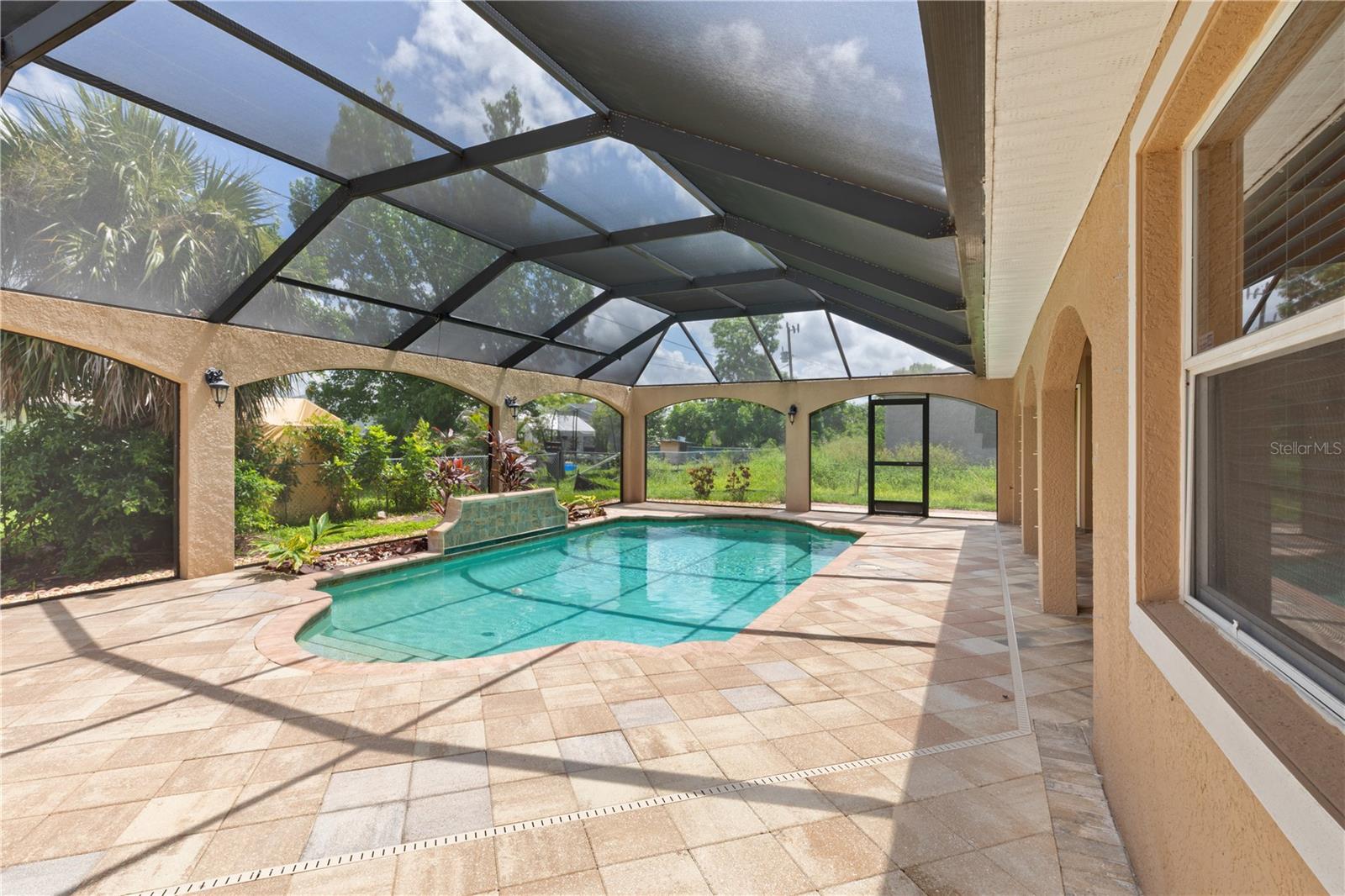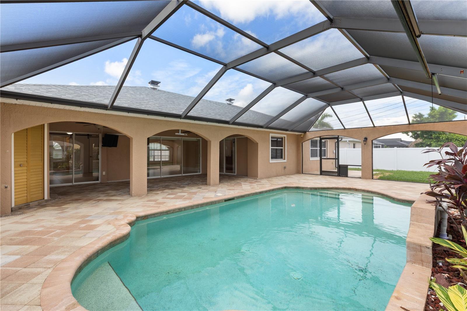 SPACIOUS 3 Bedroom, 2.5 Bathroom, 2 Car Garage, Pool home with a Family room located in Cape Coral. NO HOA FEES & NO FLOOD REQUIRED! CLICK ON THE VIRTUAL TOUR LINK 1 FOR THE VIDEO AND VIRTUAL LINK 2 FOR THE 3D TOUR. This lovely home features a bright & airy floor plan, tile flooring throughout, high ceilings, crown molding, and MUCH MORE! A versatile front patio is perfect for sipping your morning coffee, tending a patio garden, or simply relaxing and enjoying the fresh air. Enjoy a no-seeum screened front entry that creates a breezy, bug-free welcome into your home. The open-concept living and dining area is ideal for entertaining friends and family, featuring a large glass pocket slider that seamlessly connects the space to the lanai. The kitchens offers an 2024 appliances including an electric cook top and built in oven, kitchen Reverse Osmosis system, granite countertops, a closet pantry, a breakfast bar and a dinette. Expand your living and entertaining space with the generously sized Family room off the kitchen. The spacious master suite has a glass slider to the lanai, DUAL walk-in closets and a private bathroom with HIS & HERS split vanities, a walk-in shower with multiple shower heads, and a jacuzzi soaking tub. The guest bedrooms are on a split floorplan, providing plenty of privacy, with built in closets and a nearby guest bathroom. Expand your living and entertaining space to the spacious lanai, the perfect for hosting weekend barbeques, casual outdoor dining or unwinding with your favorite evening beverage. Protected by no-see-um screens, you can relax comfortably without the nuisance of bugs. Soak up the Florida sunshine from the pool deck, or lounge in style in your private HEATED saltwater pool. After a swim, rinse off in the private outdoor shower, and enjoy the convenience of a poolside half bathroom—perfect for guests and effortless entertaining. The partially fenced backyard has a paver patio—a practical space for a grill, outdoor seating, or small gatherings. Low-maintenance and functional, it offers just enough room to enjoy the outdoors without a lot of upkeep. 2024 ROOF - SOLAR ATTIC FANS - NO SEE-UM SCREENS ON FRONT & BACK LANAI - 2024 A/C & AIR HANDLER - WATER SOFTENER. Conveniently located close to local shopping & boutiques, fine & casual dining, LIVE entertainment, and a short car ride to award-winning beaches! Schedule your showing TODAY!