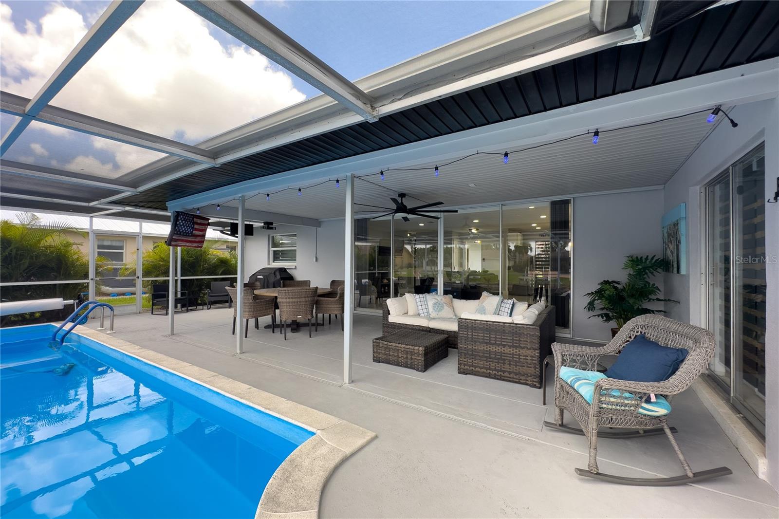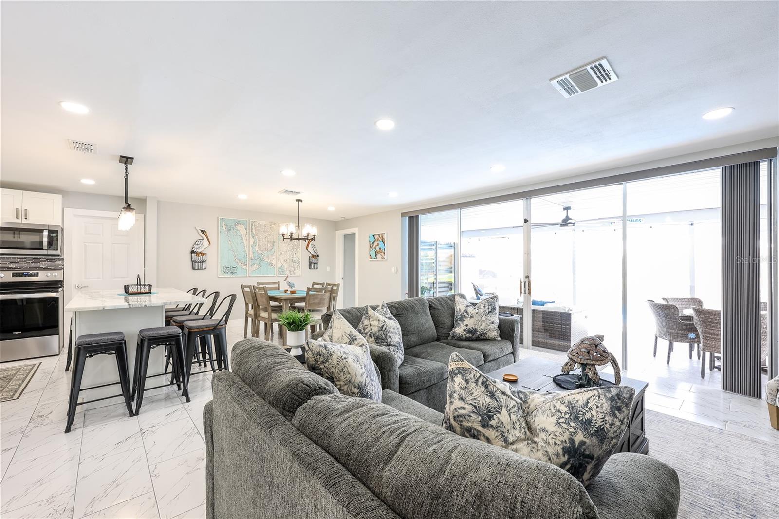 Welcome to your dream oasis in the desirable Palaco Grande Neighborhood, located on the picturesque Rainbow Canal! This stunning, fully remodeled pool home is offered completely turnkey, nestled in the sought-after Flood Zone X500 with no flooding concerns. Featuring impact windows throughout, this charming residence boasts a brand-new roof, AC, flooring, kitchen with quartz countertops, bathrooms, stylish window treatments, beautiful landscaping, and recent exterior paint. Step inside to an open floor plan with stylish furniture, offering a seamless flow throughout the home. Enjoy breathtaking views of the canal right from the front door. Massive sliding doors open to the lanai, providing the perfect setting for indoor-outdoor living. Perfect for boating enthusiasts, this property includes massive pilings for a large yacht and offers sailboat access with no bridges. The great entertaining space under truss is ideal for gatherings and relaxation. Additional features include a spacious 2-car garage and an extra patio with loungers and a seating area at the dock. Enjoy the convenience of utilities being paid and a proven rental history, making it an ideal investment or vacation home. With everything included, just bring your suitcase and toothbrush. One look, and you’ll be hooked. Don’t miss out on this incredible opportunity!
