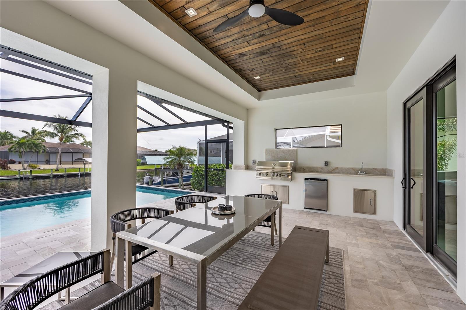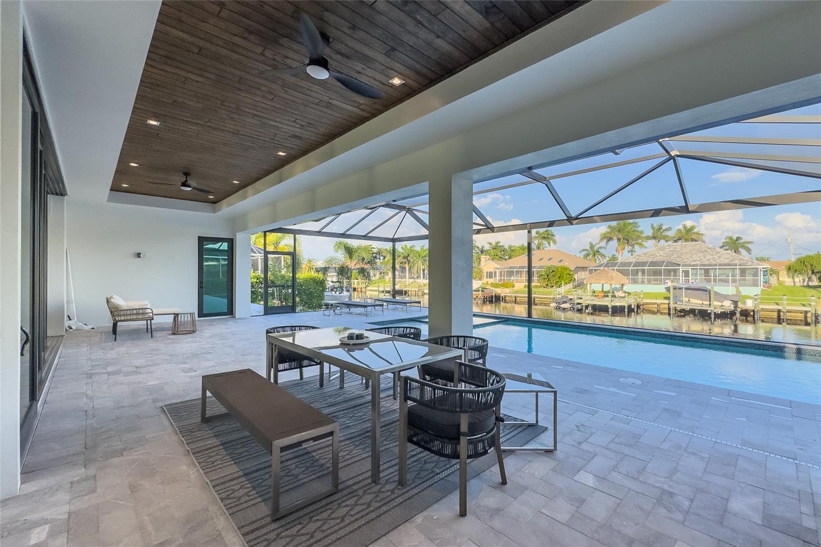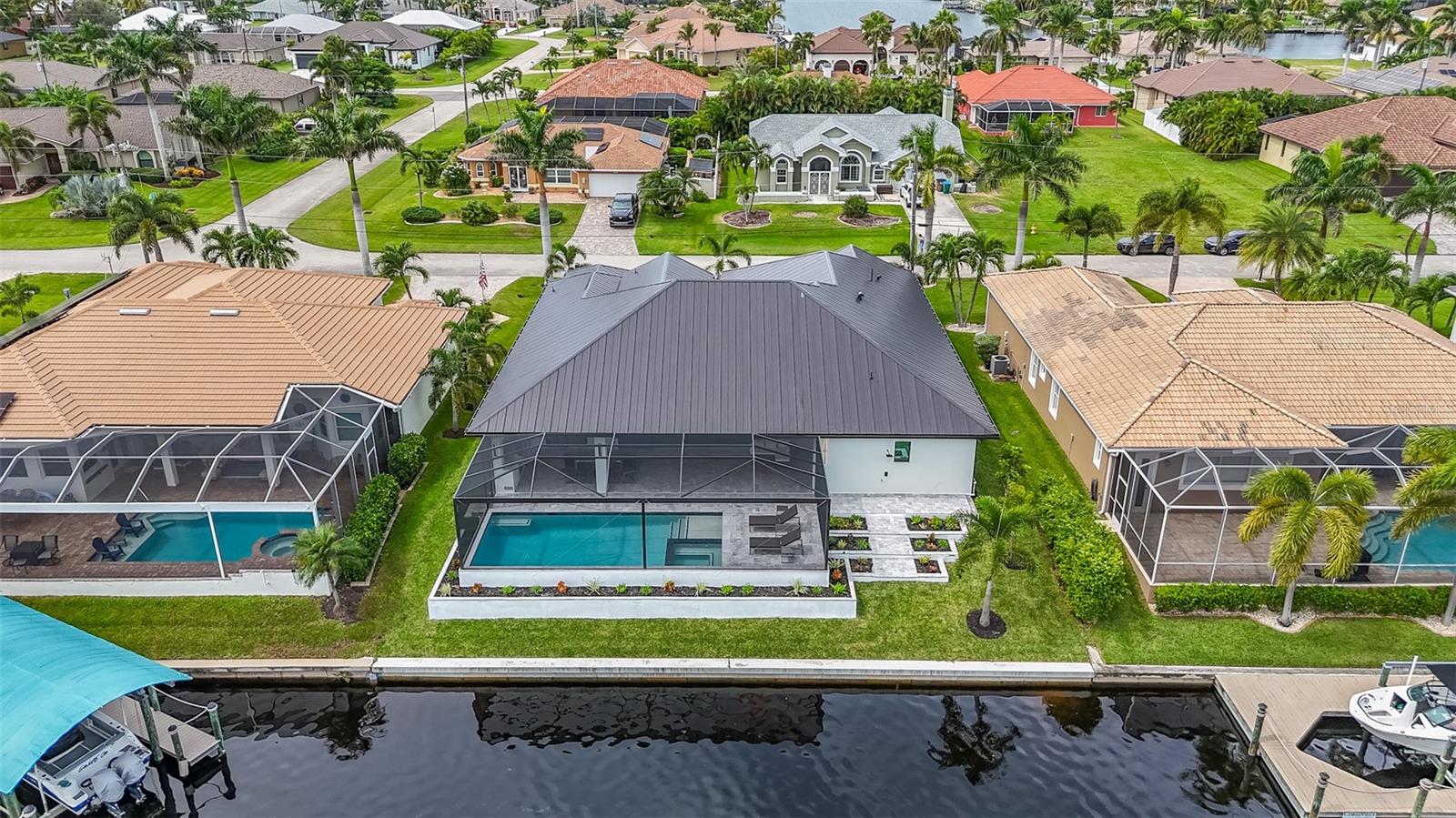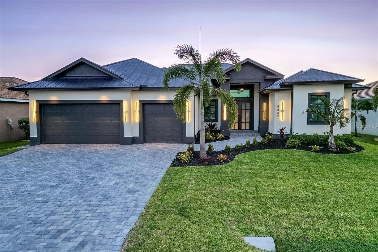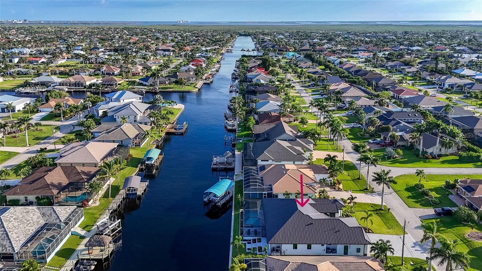 Experience luxury waterfront living in this brand-new custom-built Gulf access estate located in one of Southwest Florida’s most desirable boating communities. Designed for today’s discerning buyer, this modern coastal masterpiece offers Gulf access with only one bridge to open water, placing you just minutes from world-class boating, fishing, and the open waters of the Gulf of America—ideal for boaters, luxury homeowners, and high-end vacation rental investors. This stunning four-bedroom, four-bath residence features nearly 2,700 square feet of open-concept living with soaring 13-foot ceilings in the main living areas, creating an expansive and light-filled atmosphere. Premium finishes include oversized 48”x48” porcelain tile flooring, custom European MDF wall panels, and refined architectural details throughout. The main living space is anchored by a sleek atomizing fireplace, delivering a dramatic focal point ideal for elevated entertaining. The gourmet chef’s kitchen is designed to impress, offering high-end appliances, a walk-in pantry, elegant wine display, dedicated coffee bar, and seamless flow to the waterfront outdoor living areas—perfect for hosting or enjoying everyday luxury with tranquil water views. The private primary suite is a true retreat, featuring 11-foot ceilings, a spa-inspired ensuite bathroom designed as a luxury wet room with dual rainfall shower heads and a large freestanding soaking tub, and an expansive custom walk-in closet with built-in organizational systems. Each additional bedroom is thoughtfully designed for comfort and privacy, while the well-appointed laundry room with abundant storage supports effortless daily living. The oversized three-car garage provides ample space for luxury vehicles, watercraft accessories, and recreational equipment. Outdoors, enjoy your own resort-style oasis with a custom heated pool and spa, elegant travertine pavers, and panoramic waterfront views framed by premium picture-window screen enclosures. The professionally designed summer kitchen creates the perfect setting for alfresco dining and sunset entertaining. Built for durability and peace of mind, this home includes hurricane-impact windows and doors, a metal roof, and a newer seawall (2023) offering excellent deep-water access with room for a custom dock accommodating multiple vessels. This exceptional waterfront property represents a rare opportunity to own a luxury new construction home with Gulf access and only one bridge to open water in Southwest Florida—ideal as a primary residence, second home, or income-producing investment. Audio/video surveillance in use.