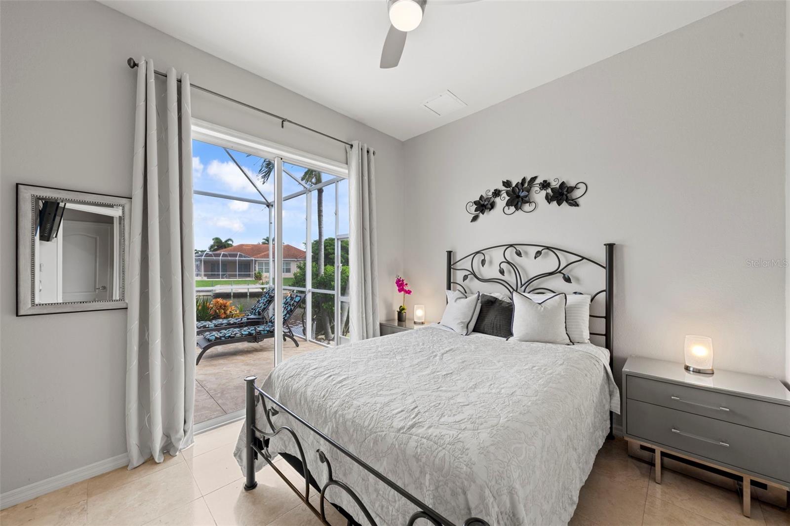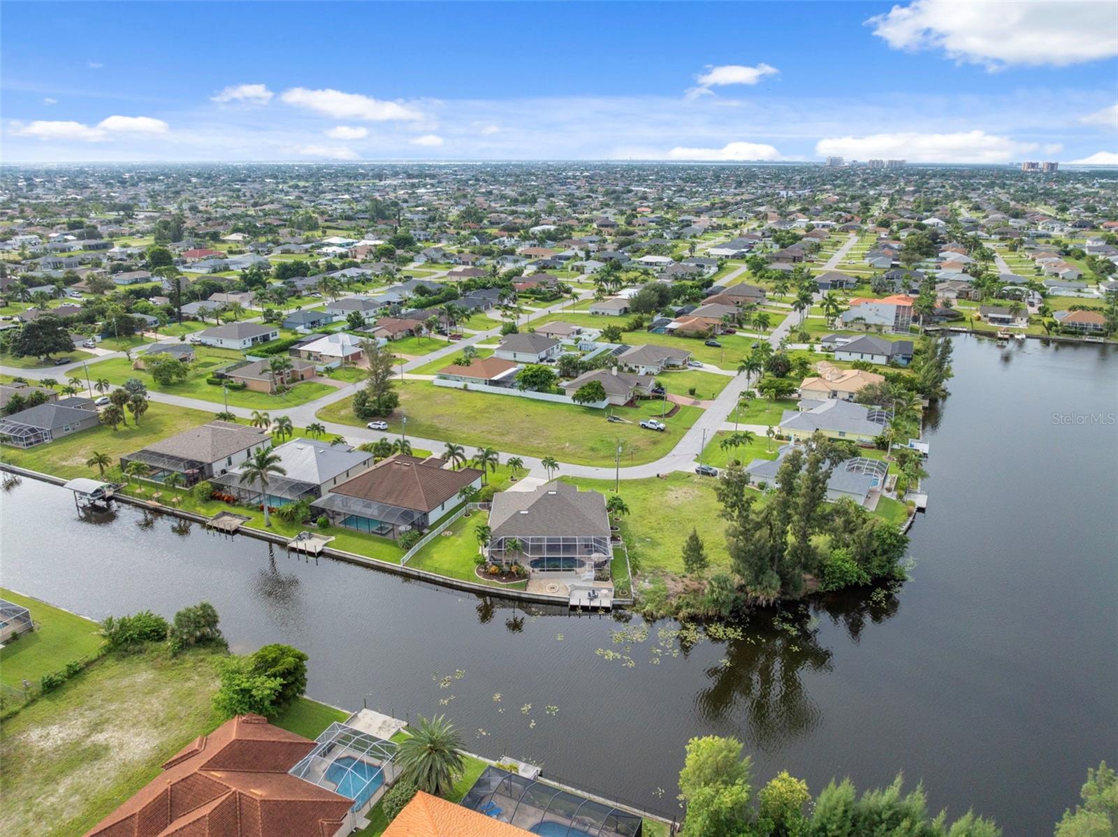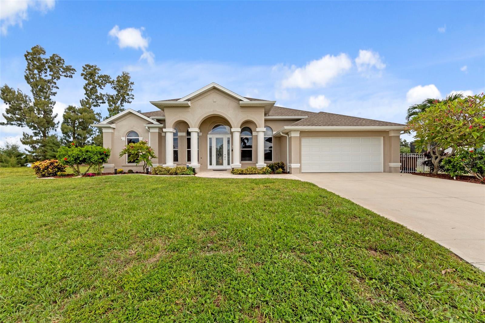 Welcome to luxurious waterfront living with stunning water views from nearly every room.No Flood Insurance Required. A spacious foyer leads to a large great room, featuring ceramic tile. Sliding glass pocket doors open up to embrace the Florida lifestyle right from your living room. The kitchen is perfect for entertaining, with a central island, ample cabinet and storage space, modern appliances, and a pantry. There’s an indoor laundry area with a washer and dryer, plus a double-size laundry sink in the garage. The bedrooms follow a split plan, with two additional rooms that can serve as bedrooms or an office. The primary bedroom is incredibly spacious, offering water views, wood floors, and access to a spa-like bathroom with a large Jacuzzi tub, separate shower, and plenty of linen and closet space. It also opens onto the lanai. The other bedrooms are roomy, and a guest bathroom with a shower completes this side of the home. Step outside to the Florida-style patio with ample seating, a shaded lanai area, and plenty of space for sunbathing. The heated waterfall pool is perfect for relaxation, offering spectacular sunset views over a wide canal and lake. For your protection there are hurricane screen shutters along the back lanai and shutters for most all the other windows. The garage door is hurricane rated too. This home boasts over 2,300 sq. ft. of living space, with water, sewer, and irrigation in place. The roof was redone in 2022, and the AC and water heater have been recently updated.