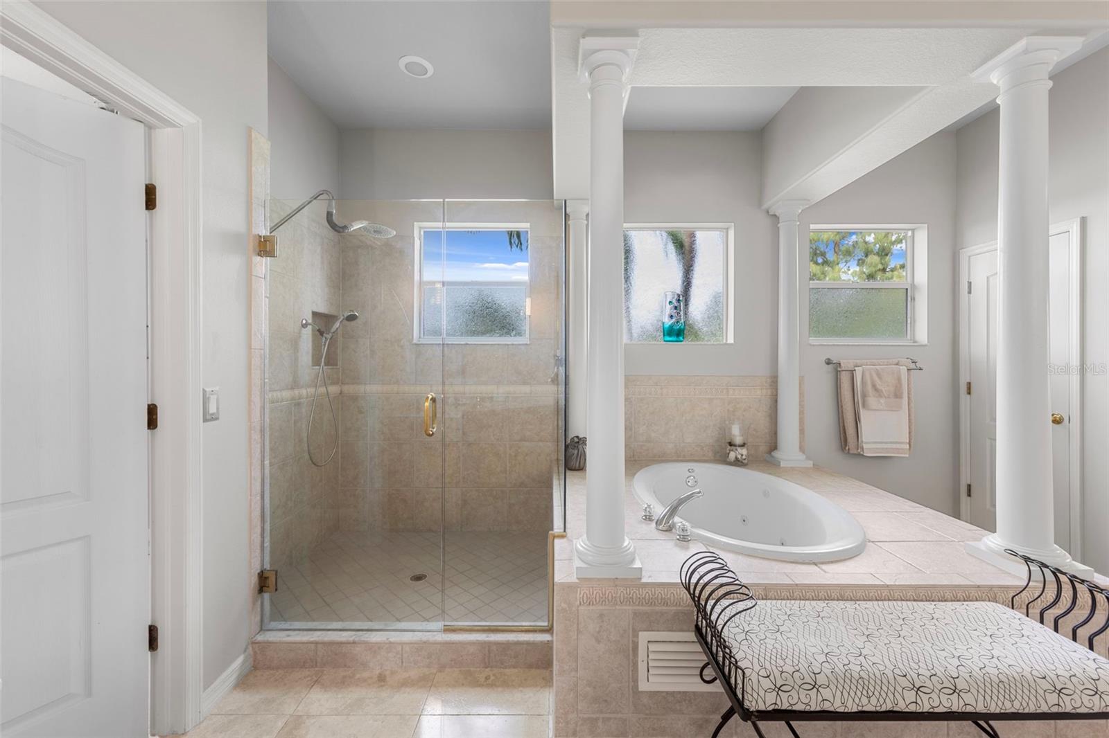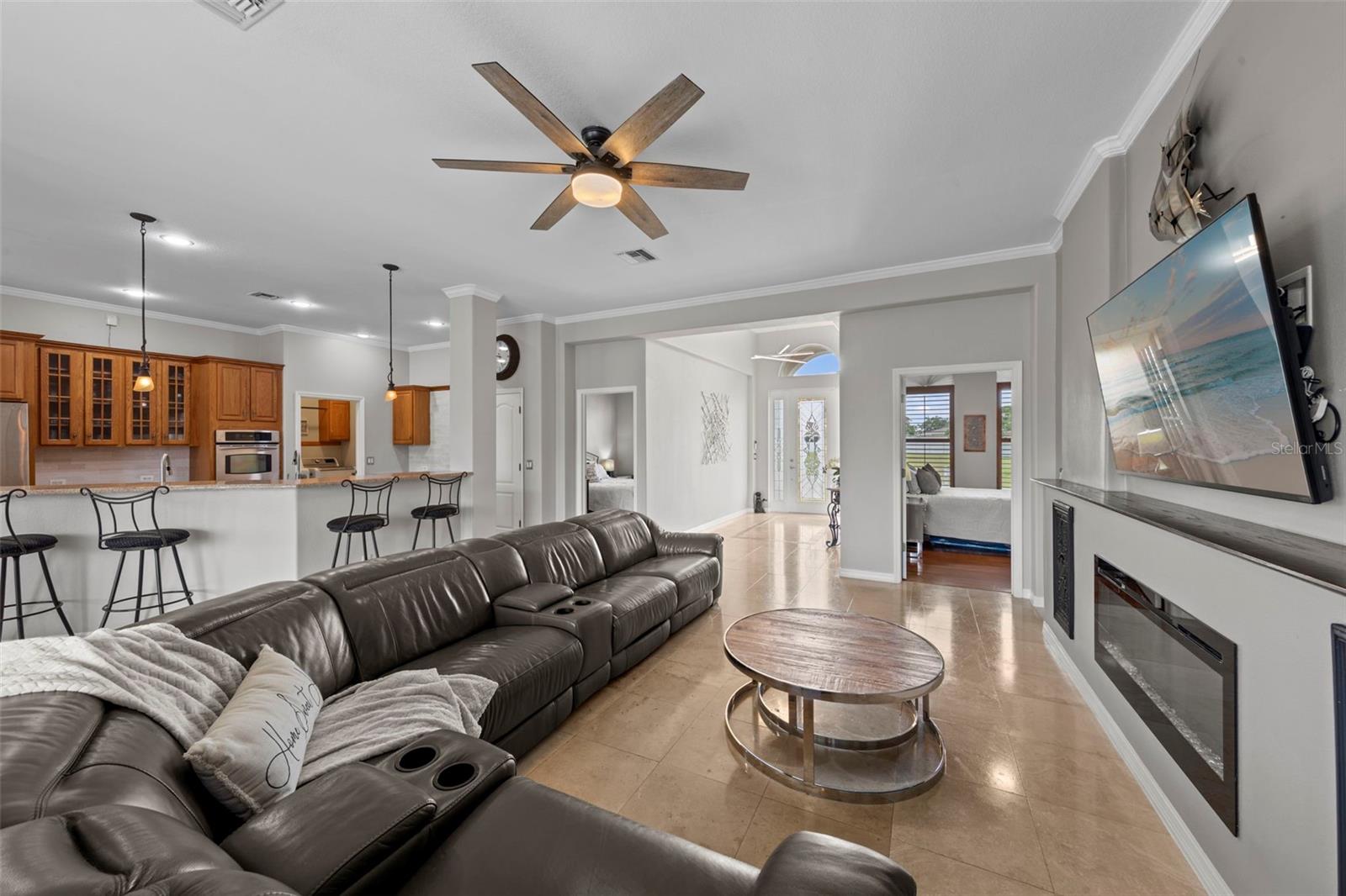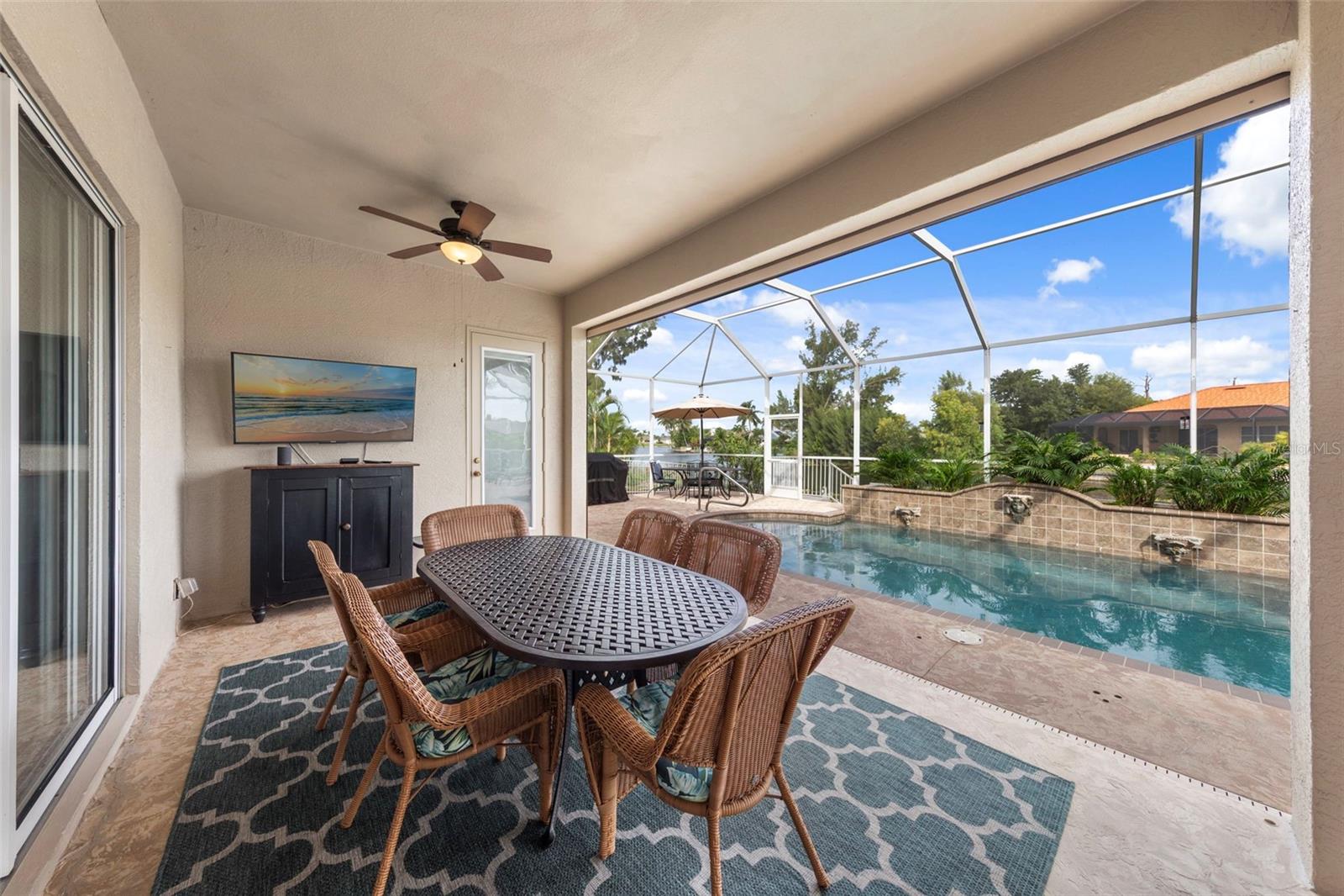 Welcome to luxurious waterfront living with stunning water views from nearly every room.No Flood Insurance Required. A spacious foyer leads to a large great room, featuring ceramic tile. Sliding glass pocket doors open up to embrace the Florida lifestyle right from your living room. The kitchen is perfect for entertaining, with a central island, ample cabinet and storage space, modern appliances, and a pantry. There’s an indoor laundry area with a washer and dryer, plus a double-size laundry sink in the garage. The bedrooms follow a split plan, with two additional rooms that can serve as bedrooms or an office. The primary bedroom is incredibly spacious, offering water views, wood floors, and access to a spa-like bathroom with a large Jacuzzi tub, separate shower, and plenty of linen and closet space. It also opens onto the lanai. The other bedrooms are roomy, and a guest bathroom with a shower completes this side of the home. Step outside to the Florida-style patio with ample seating, a shaded lanai area, and plenty of space for sunbathing. The heated waterfall pool is perfect for relaxation, offering spectacular sunset views over a wide canal and lake. For your protection there are hurricane screen shutters along the back lanai and shutters for most all the other windows. The garage door is hurricane rated too. This home boasts over 2,300 sq. ft. of living space, with water, sewer, and irrigation in place. The roof was redone in 2022, and the AC and water heater have been recently updated.