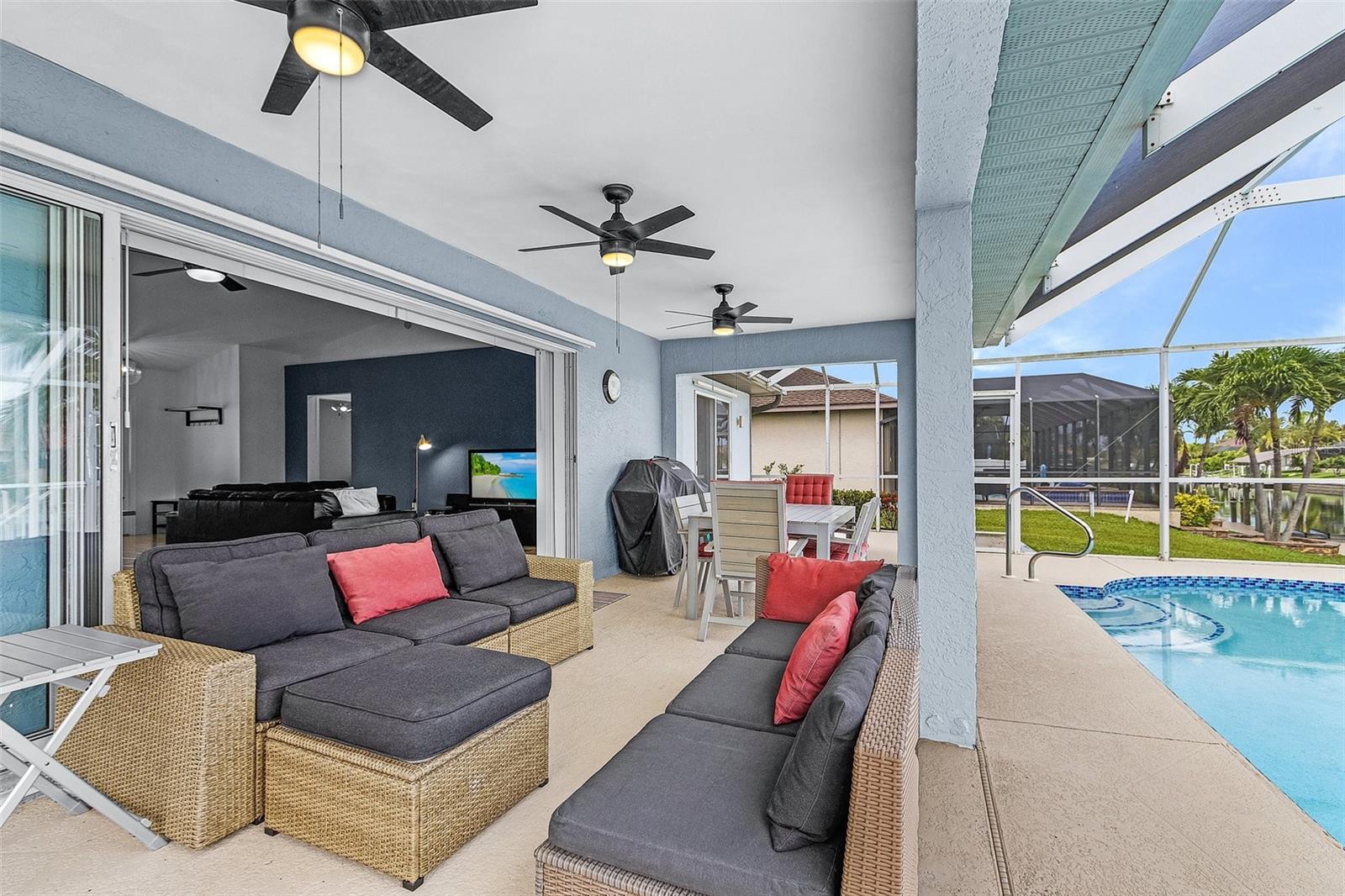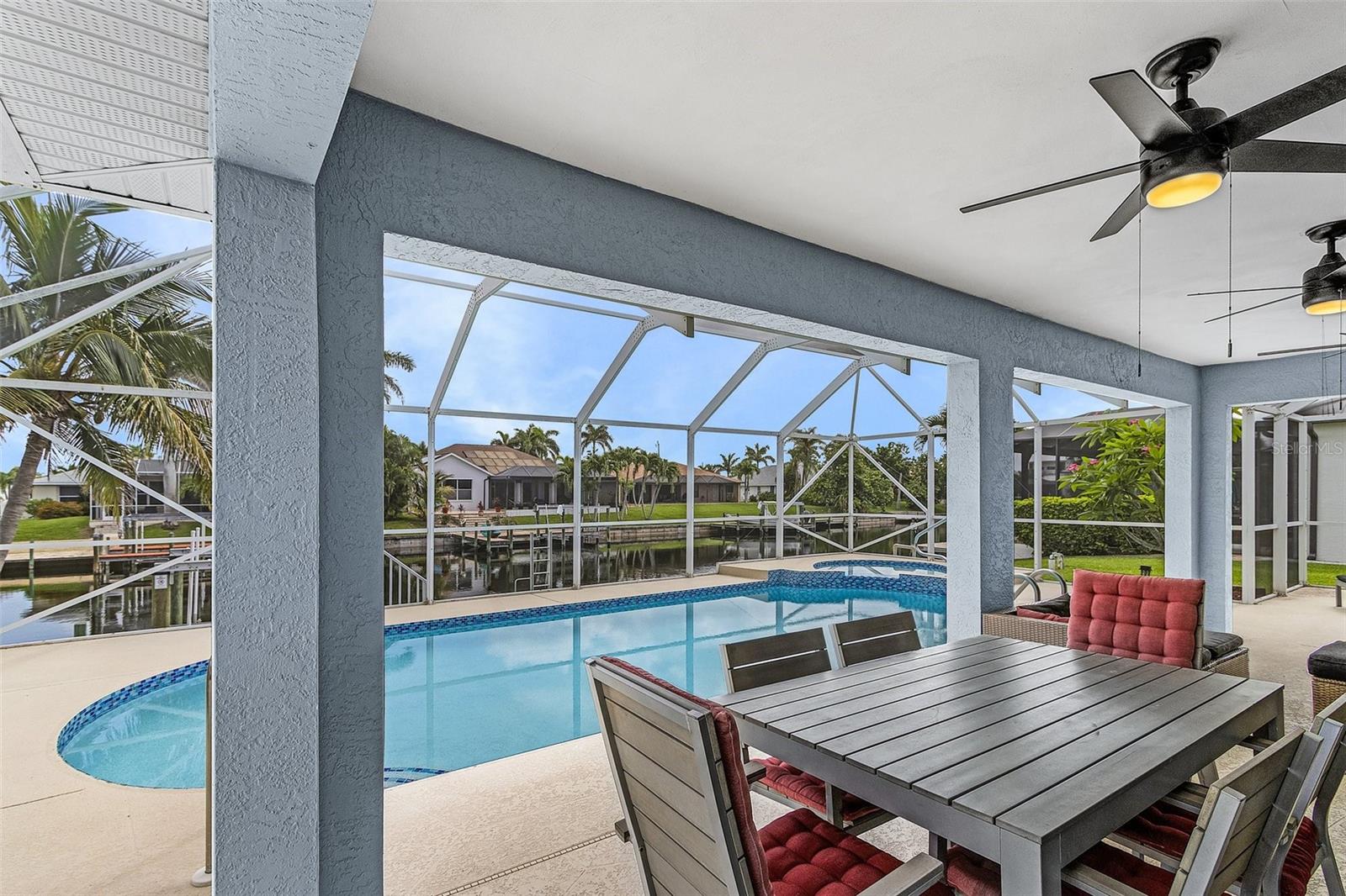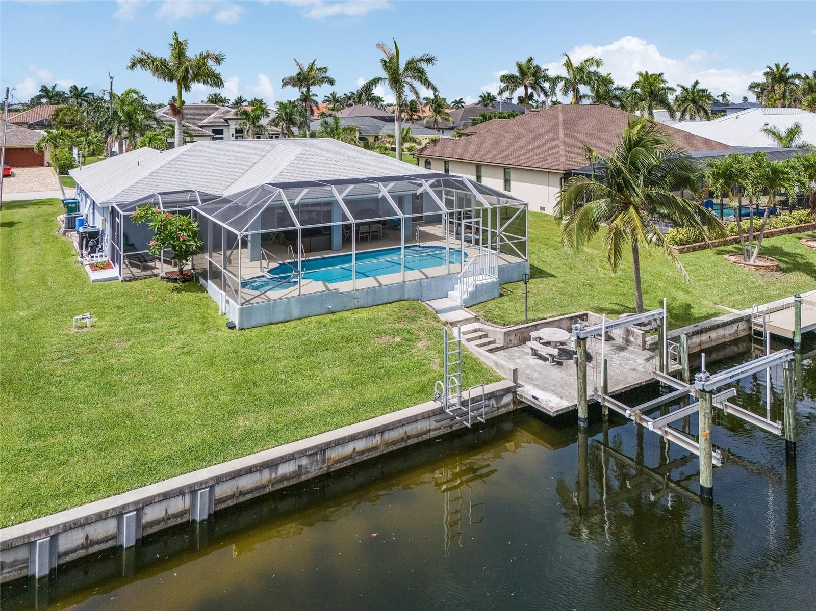 This amazing gulf access pool home off Surfside Blvd comes fully TURNKEY and features 3 bed 2 bath, 1,570sqft, NEW SEAWALL 2018, ROOF 2019, New Boat lift 2024 and Jet ski lift, ASSESSMENTS PAID OFF, AC 2016, TILES THROUGHOUT, updated kitchen with beautiful backsplash, big PANTRY and a bar to enjoy, Laundry room, huge Master suite with sliding doors to the pool, master bath with DOUBLE VANITY, shower with glass doors, updated guest bath, guest room with sliding doors to the pool, new resurfaced pool/spa, POOL HEATER, TRANSFERRABLE FLOOD POLICY, lush landscaping and so much more is waiting for the new buyer
