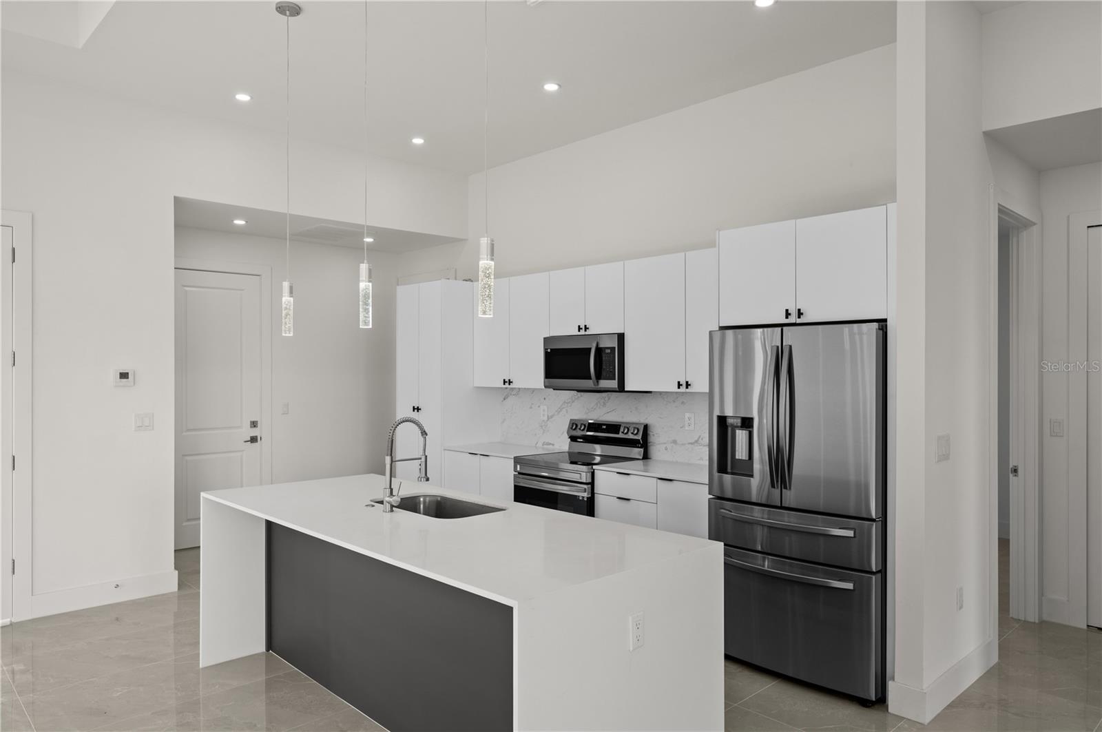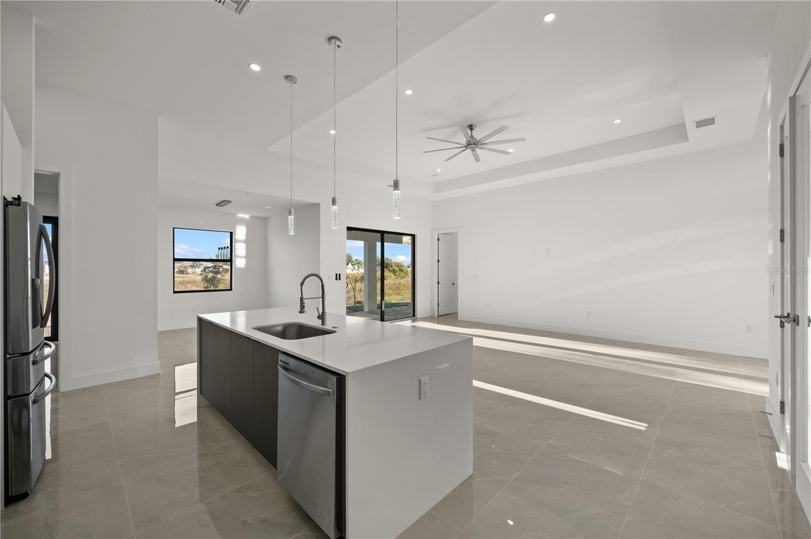Under Construction. Introducing the "Ella" model, a brand-new construction in Cape Coral, Florida, perfectly situated on a tranquil location backing a canal. This modern beauty offers 3 bedrooms, 2 bathrooms, plus a flexible room. The master bedroom boasts his and hers walk-in closets (All bedrooms feature spacious walk-in closets). The master bathroom exudes luxury with a shower and tub. The open format design features high ceilings and large format tile throughout, creating a spacious and elegant atmosphere. An additional cabana bathroom adds convenience for guests and outdoor entertaining. Step onto the lanai, complete with a wet bar, ideal for hosting gatherings or savoring the Florida weather. The open kitchen is a chef's dream, with modern finishes and top-notch appliances. Park your vehicles in the 2-car garage with epoxy floors. This home showcases contemporary design, modern finishes, and a well-thought-out layout, offering the perfect canvas for your Cape Coral lifestyle. **These pictures are of a model home**