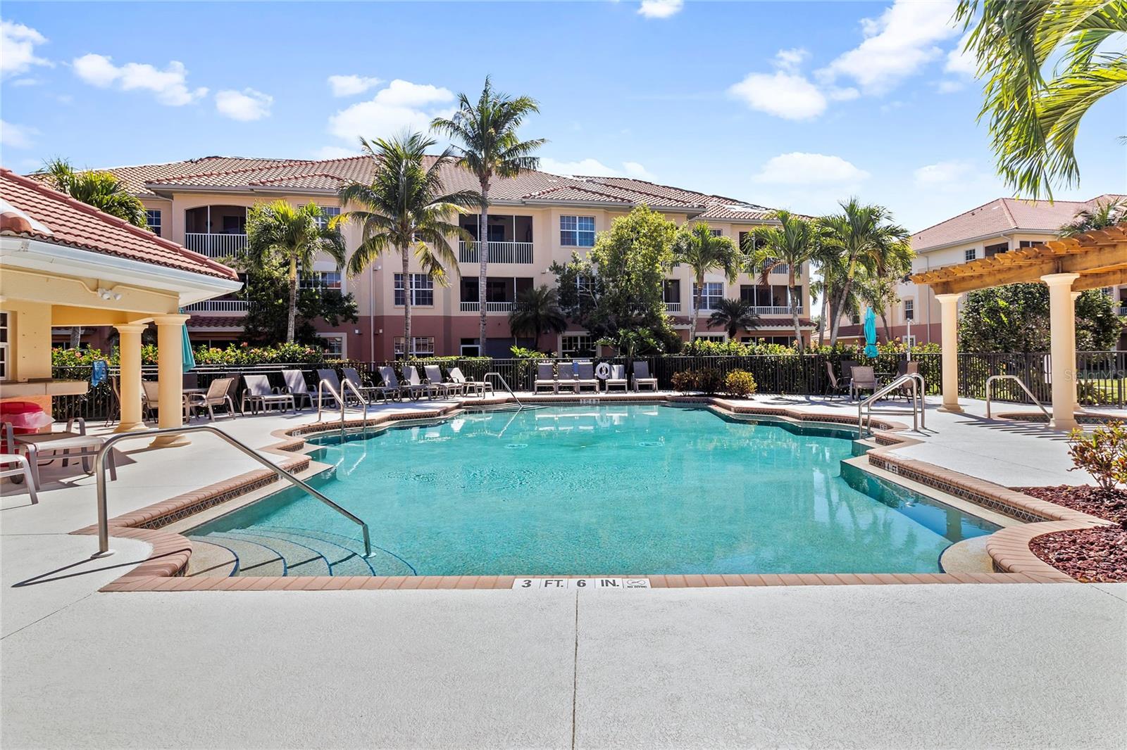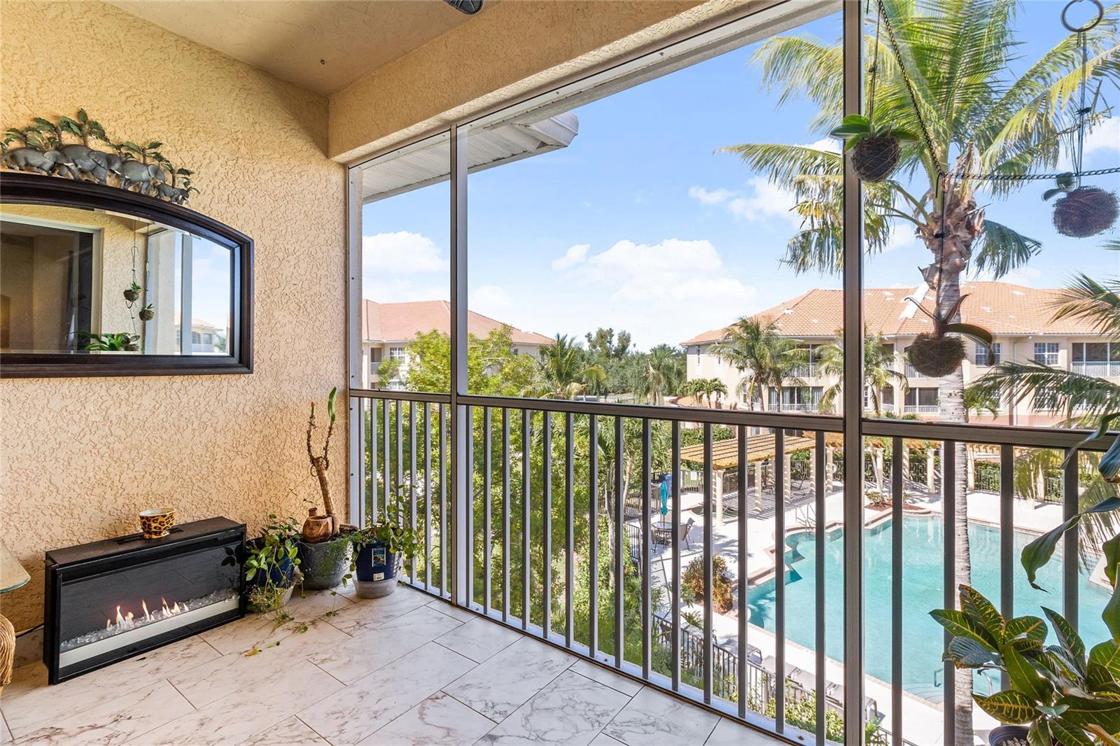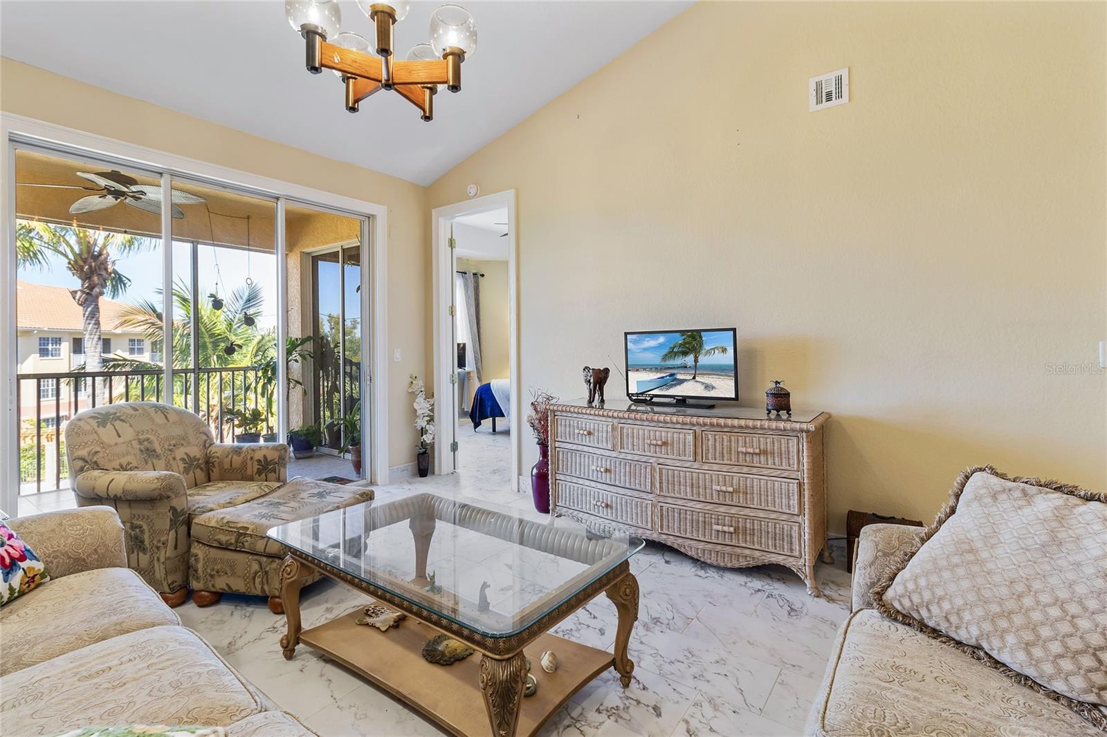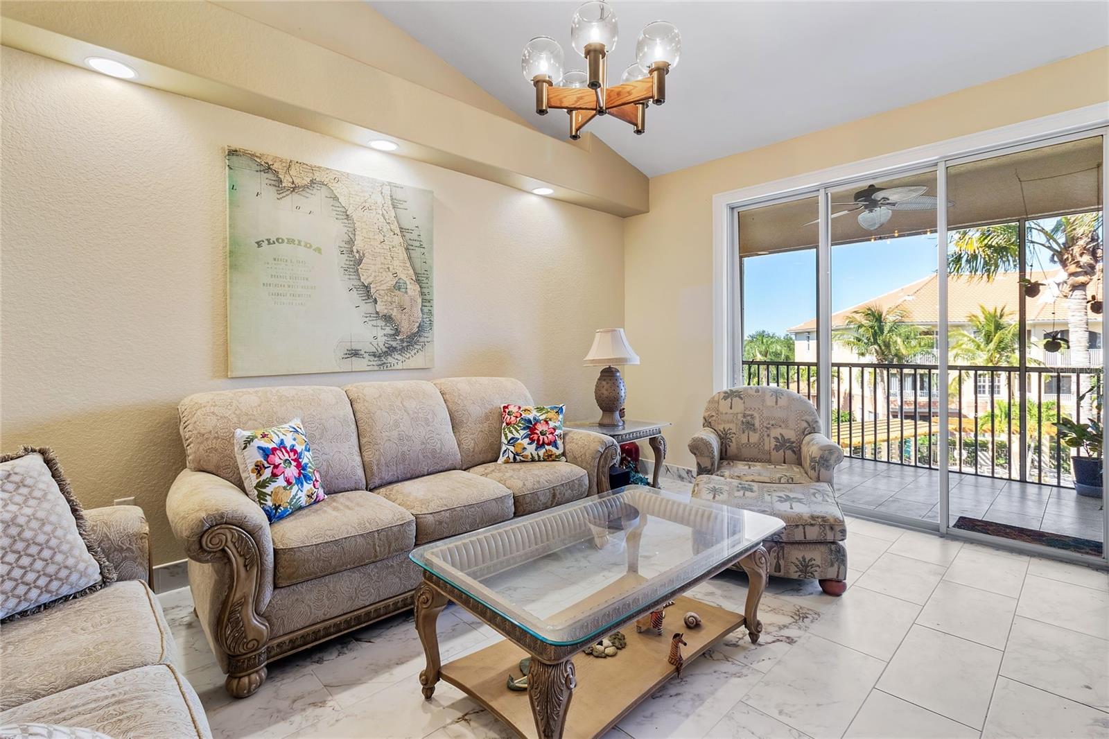 Absolutely stunning 2-bedroom, 2-bathroom condo, now with an additional den that's been beautifully renovated, making its debut on the market. Perched on the top floor and benefiting from impressive vaulted ceilings, this gem is ideally positioned just steps from the elevator, marrying accessibility with sheer luxury. This unit reveals a superb layout featuring a spacious great room that flows into a well-appointed open kitchen. A cozy breakfast nook and breakfast bar/pass-through invite mornings filled with warmth, while natural light floods the charming screened lanai through its beautiful tile flooring. What sets this condo apart is its GRAND view overlooking the resort-style pool, offering a breathtaking backdrop that elevates every moment spent on the lanai. Attention to detail is evident throughout, with upgrades including brand-new tile floors, state-of-the-art appliances, and a fresh coat of paint, ensuring this home is the epitome of move-in readiness. The additional den, outfitted with a built-in closet, provides flexible space for a media room or home office, and can easily be transformed into a third bedroom to suit your evolving needs. Located within the cozy and meticulously maintained gated development of Van Loon Commons in Cape Coral, this condo offers more than just a place to live—it offers a lifestyle. Residents enjoy access to an array of amenities, including a large clubhouse, picturesque walking trails, a refreshing pool, a relaxing spa, a fitness room, covered parking, and extra storage. Situated near Hancock Bridge Parkway and Pine Island Rd, the convenience of this location is unparalleled, offering effortless access to all amenities. Discover the hidden gem of Cape Coral and step into a life of unmatched comfort, convenience, and beauty, all highlighted by a grand view of the resort-style pool in this exceptional top-floor condo.