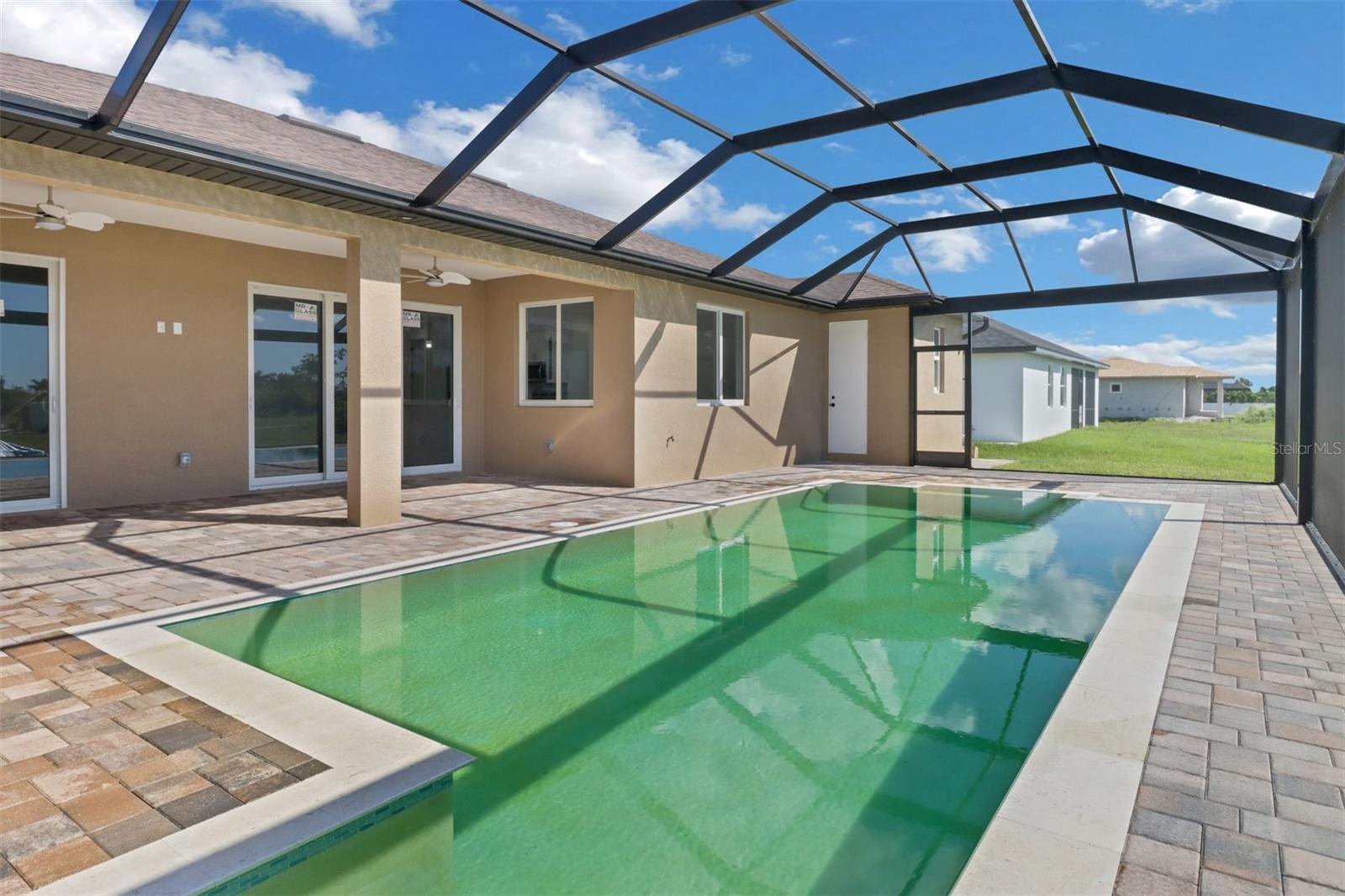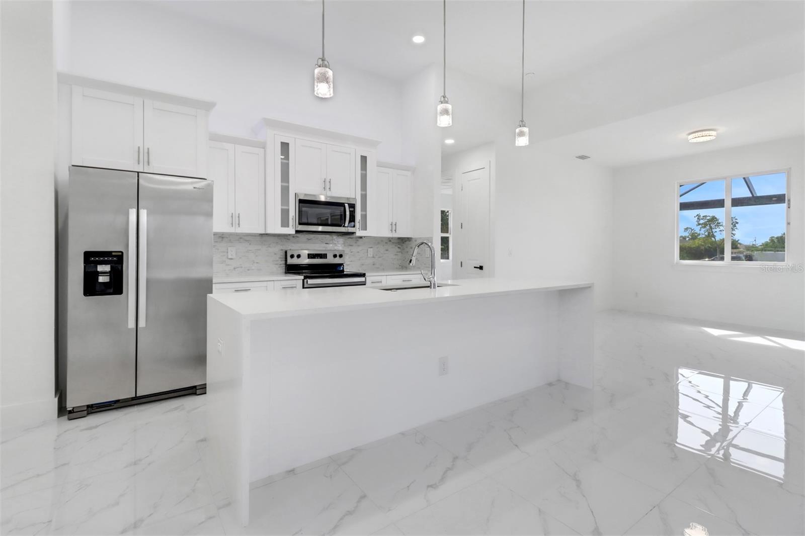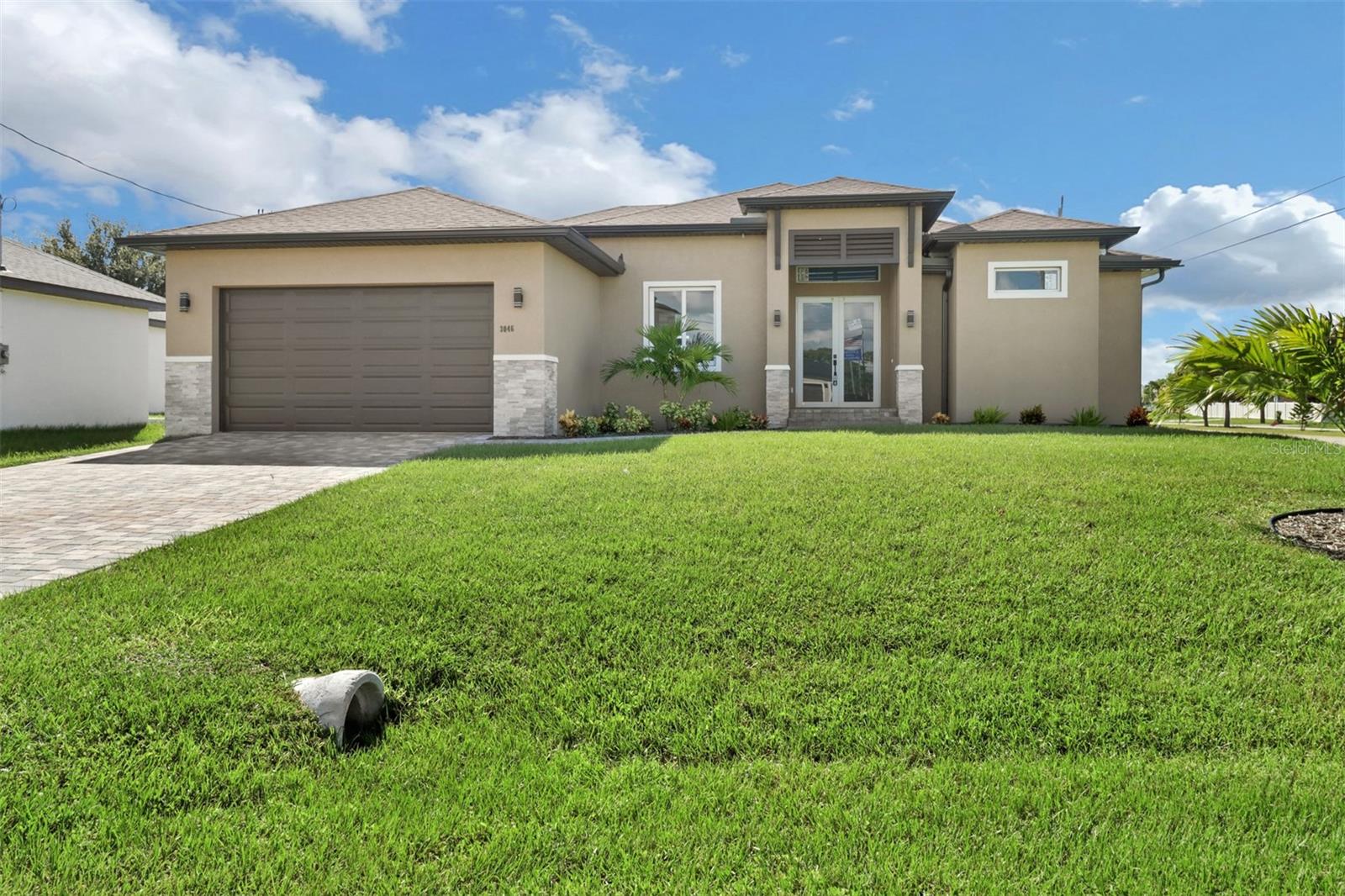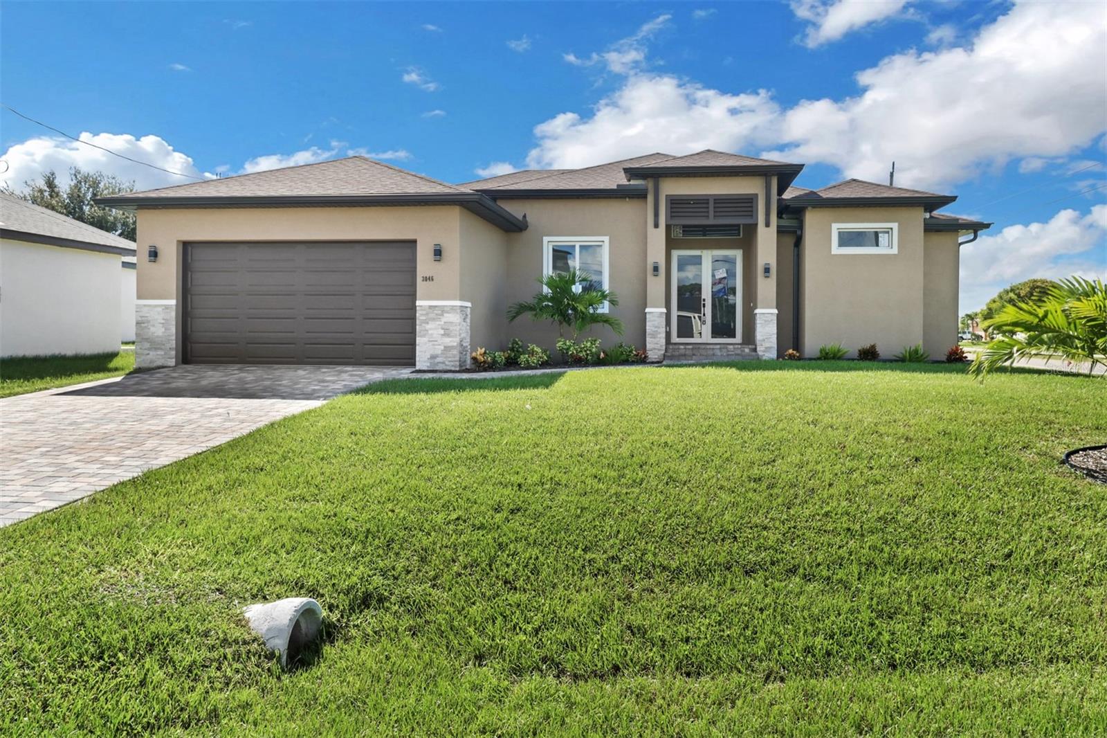 Welcome to your dream home in Cape Coral! This stunning single family home boasts 4 bedrooms, 3 bathrooms, and a 2 car garage, perfect for a growing family or those who love to entertain. The kitchen features granite counters, stainless steel appliances, and 42" cabinets, making it a chef's paradise. The tile flooring throughout the home adds a touch of elegance and luxury. The High ceilings and impact windows and doors create a bright and airy atmosphere, while LED lights and ceiling fans add a modern touch. Cozy up by the electric fireplace on chilly evenings, or enjoy movie nights on the 75-inch TV in the living room.The master bathroom is a true oasis with a huge walk in shower, and beautiful granite countertops. The walking closets with custom organizers ensures that your wardrobe stays organized and clutter-free. Step outside to relax in the amazing pool area and enjoy the Florida sunshine, with an outdoor kitchen this pool area is JUST PERFECT, and don't forget to bring your boat with you because the boat ramp is just minutes away allows for easy access to the water.This new construction home has everything you could want and more, making it the perfect place to call home in Cape Coral. Don't miss out on this opportunity to live in luxury and comfort!