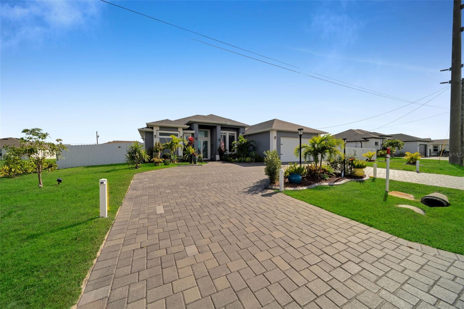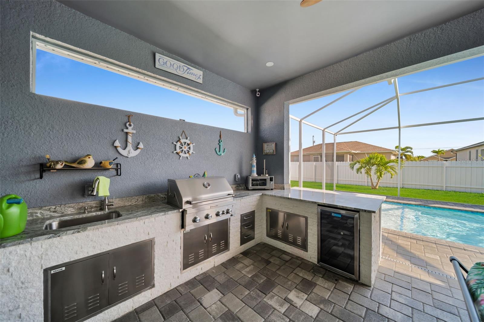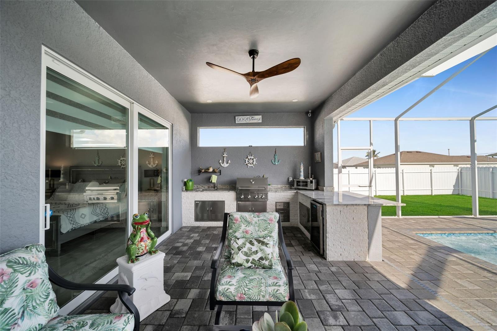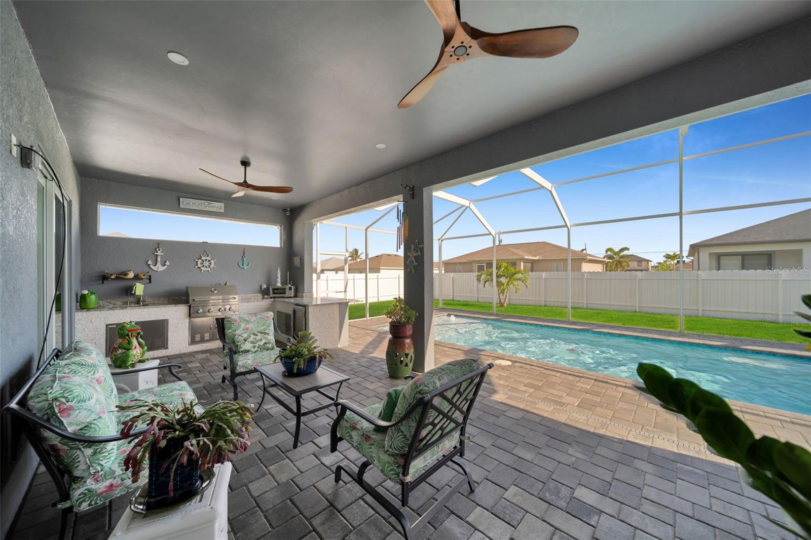 SELLER MOTIVARED!! Better than new! This stunning home, built in 2022, has been upgraded with high-end finishes and smart features throughout. Offering 1,867 sq ft under air, this property features 3 spacious bedrooms—each with its own private bathroom and walk-in closet. The open-concept layout flows seamlessly into a gourmet kitchen with modern cabinetry, premium appliances, designer lighting, and luxury ceiling fans—all included in the sale. Enjoy outdoor living with a fully equipped summer kitchen featuring a gas grill and wine cooler, a saltwater pool with screened enclosure, outdoor shower, full irrigation system, and a fully fenced yard for added privacy. Additional features include impact-resistant doors and windows, electric shades, smart door lock with built-in camera, indoor and outdoor security cameras, automatic transfer switch for backup power, epoxy-finished garage floor, A/C in the garage, and full-home internet connectivity. Truly move-in ready—this home offers comfort, security, and style all in one. A must-see in Cape Coral!