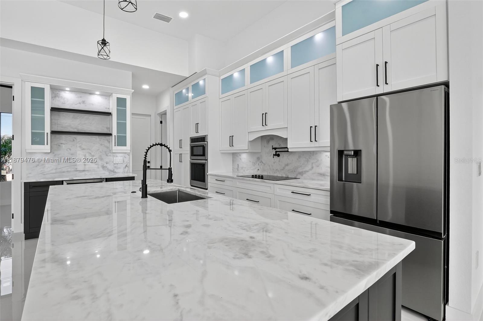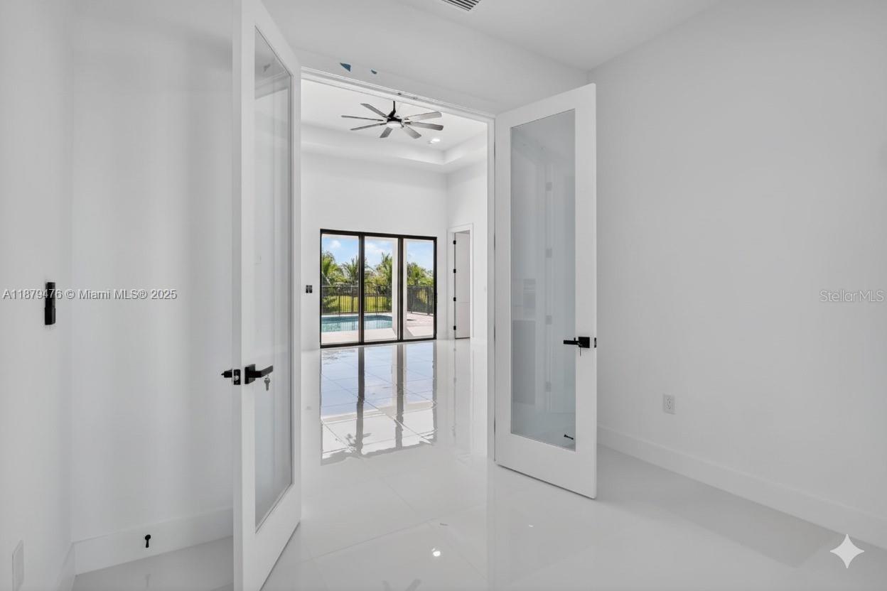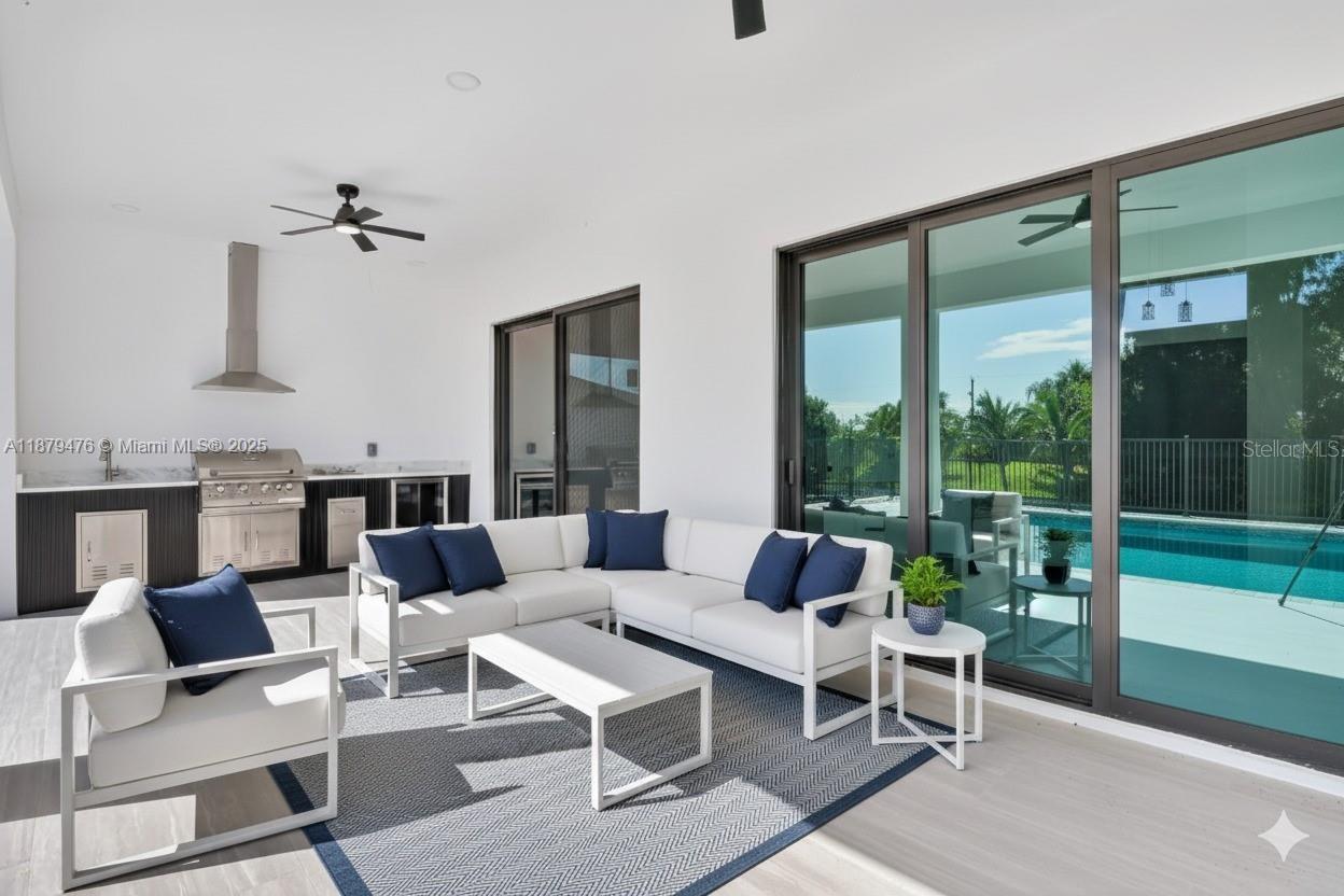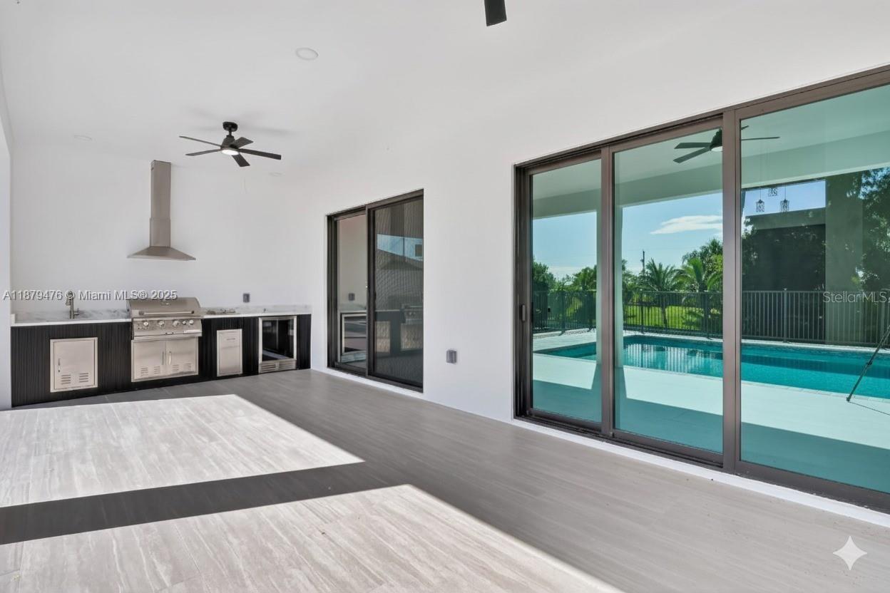 One or more photo(s) has been virtually staged. Move in Ready Canal View Pool home. No HOA, No CDD, No Flood Zone. This stem wall footers, 3-bedrooms + Den & 3 full bathrooms elegance & modern design showcases the warmth, versatility, and functionality of the open floor plan, bright porcelain floor with membrane all-over, high-quality Impact Windows/Door with Low-E. Gorgeous kitchen with stone countertops and upgraded appliance package, built-in microwave-oven, pot filler, electric 36" cooktop, in-liner hood, Coffee-Bar with dual temperature built-in wine fridge, built-in outdoor Summer Kitchen featuring propane BBQ with rotisserie motor and built-in beverage fridge. Paver driveway leading to the three-car garage, lush landscape with sprinkler system. Saltwater pool ready. The bathroom glass doors will be installed before closing.