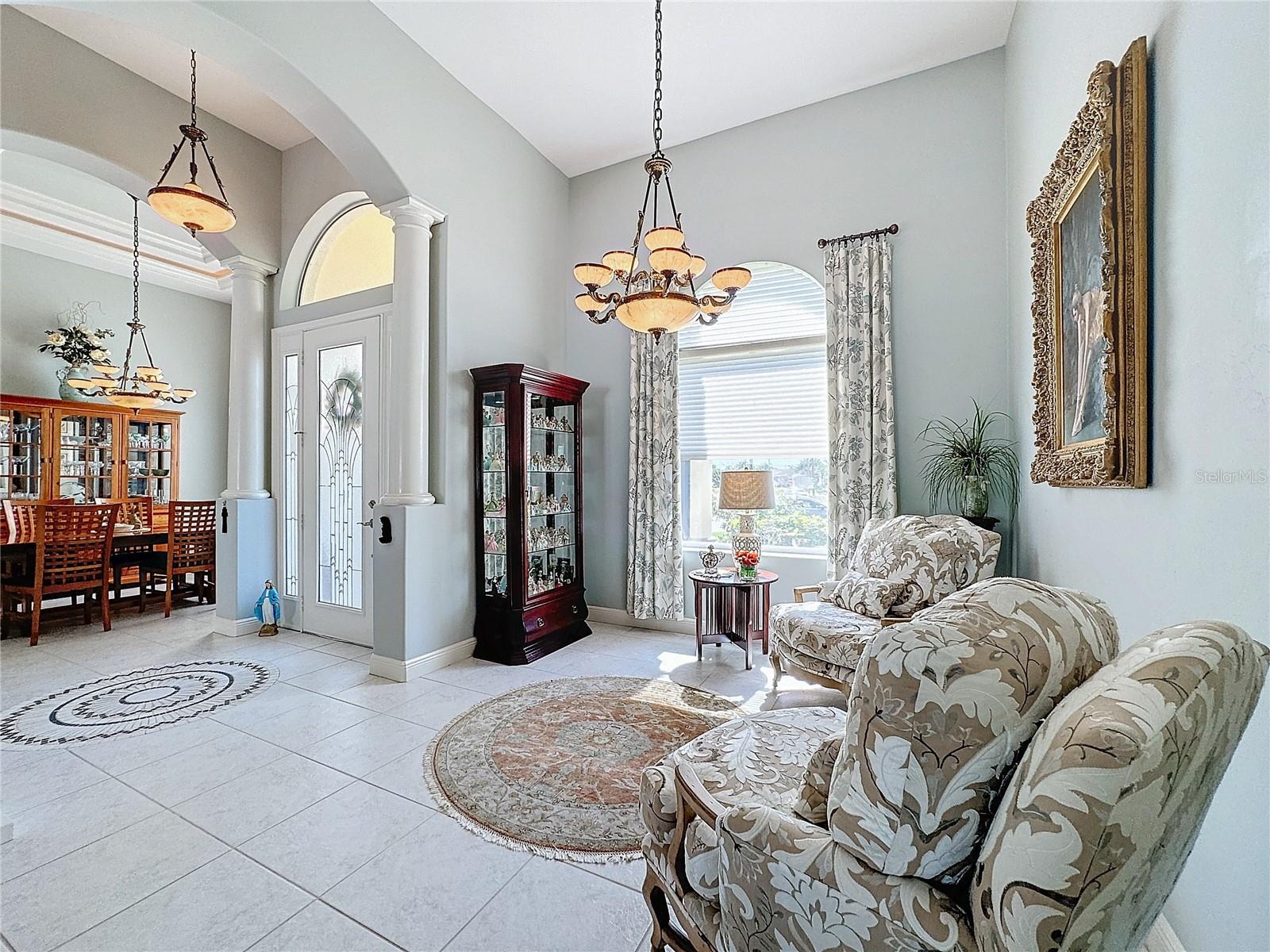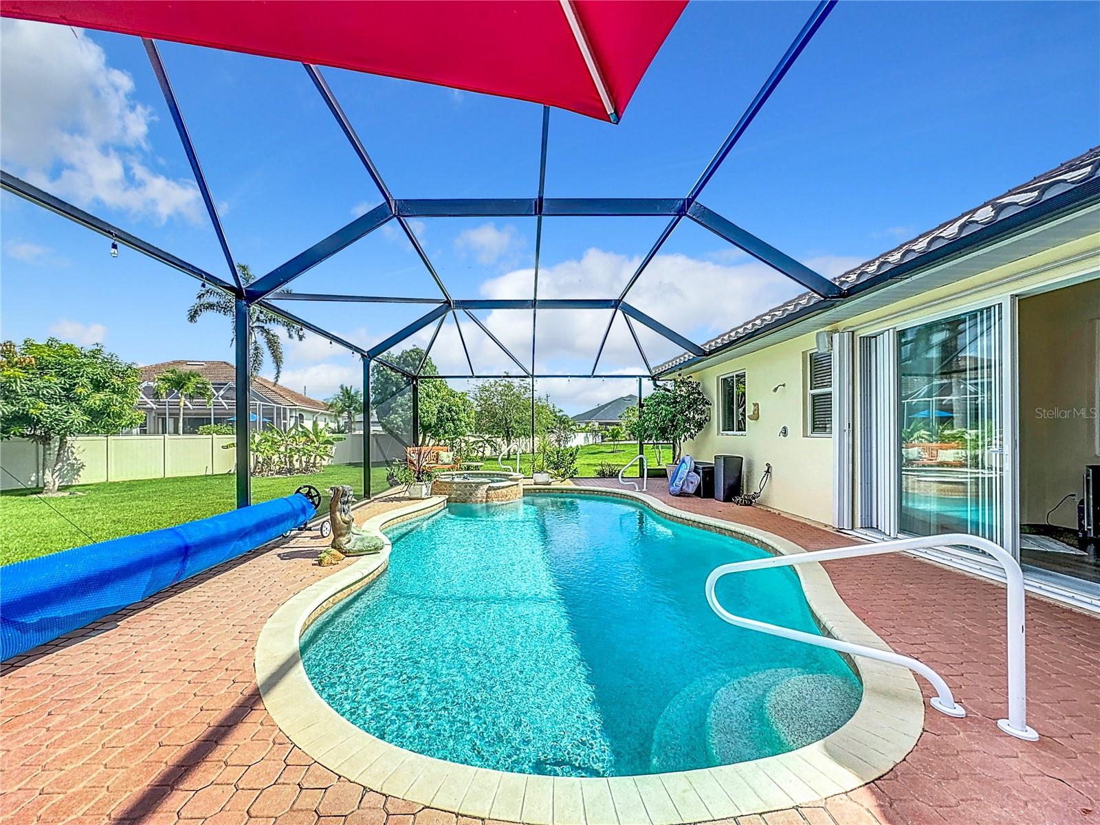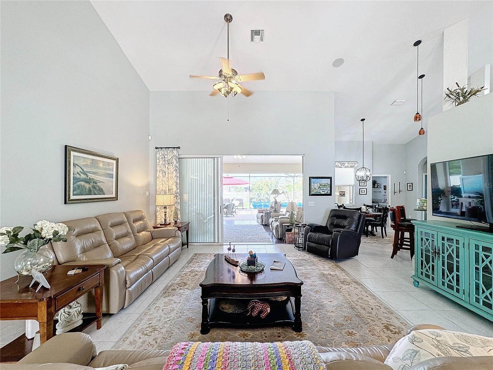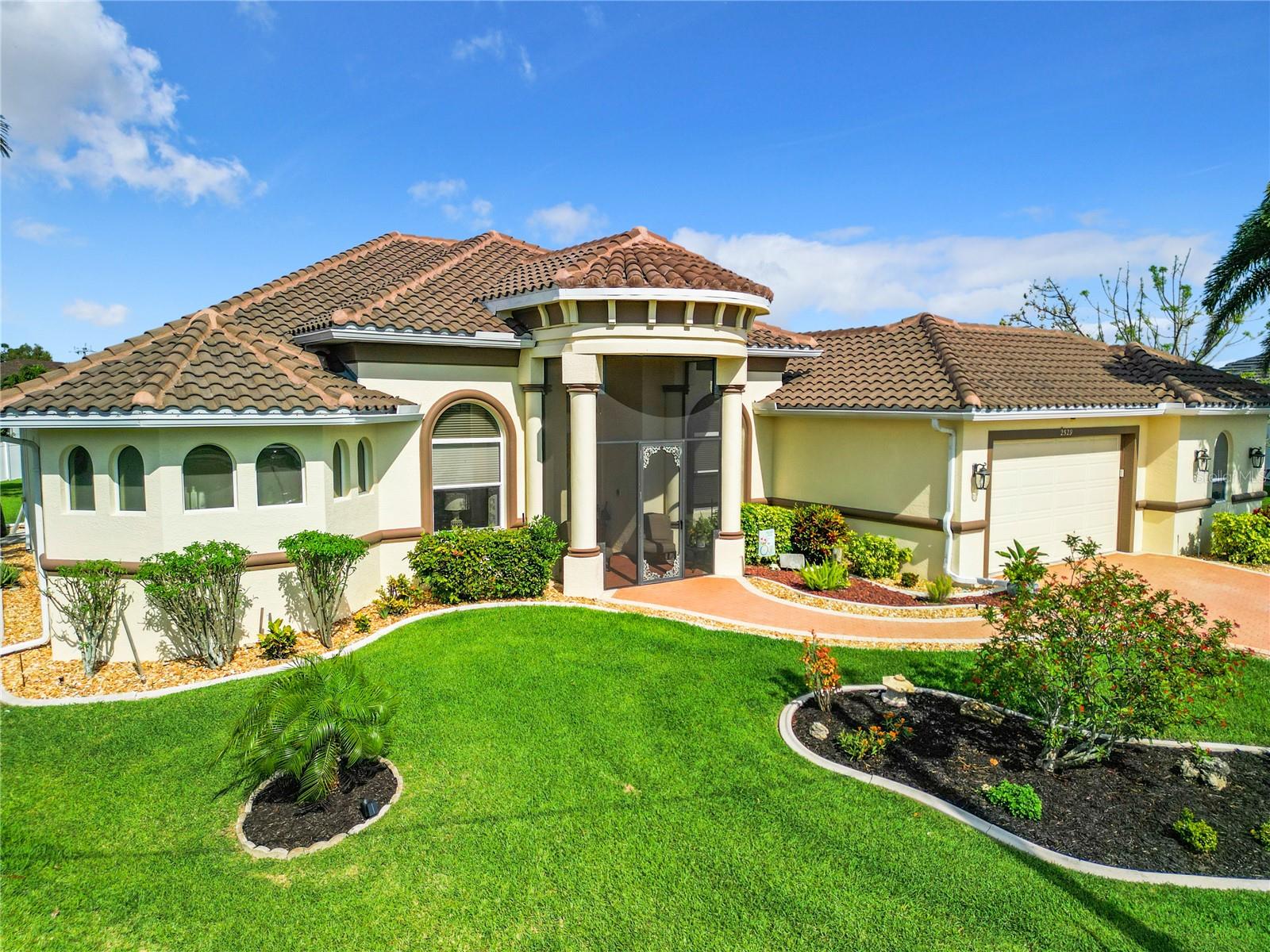 This stunning SW Cape Coral home with extensive 2023-2024 upgrades offers over 3,200 sq ft of living space, featuring 4 bedrooms, 2.5 baths, and a heated pool with spa. The residence boasts exquisite features, including grand 26-foot ceilings, a lavish primary suite, and additional bedrooms with a connecting bathroom. Recently upgraded with a new tile roof, pool enclosure, and fresh exterior and interior paint, all completed in 2023. The home also includes new bedroom carpeting, a pool heat pump, and a GE refrigerator installed in 2024, along with stylish new Ballard curtains. There’s a versatile separate room off the garage, perfect for an office or playroom. Safety and convenience are top priorities with a new ADP alarm system with cameras, hurricane impact windows, hurricane accordion doors for rear sliders, and a Duromax 13,000-watt whole-house generator. Additional highlights include a central vacuum system, internal pest control system, irrigation system, and built-in speakers in 3 rooms and outside. Every room is equipped with ceiling fans, with the garage and Florida room having air conditioning. The home is beautifully accented with alabaster and Austrian crystal chandeliers, and the screened front porch provides a welcoming entry. With no HOA fees and a southwest front exposure, this home blends luxury and practicality in a prime location.