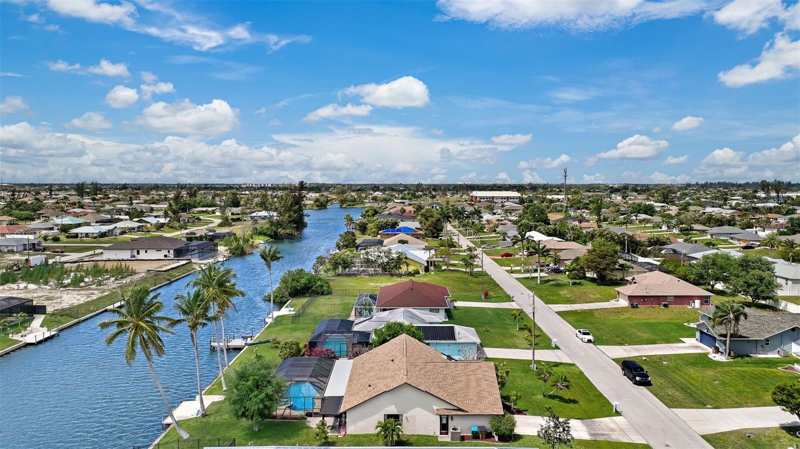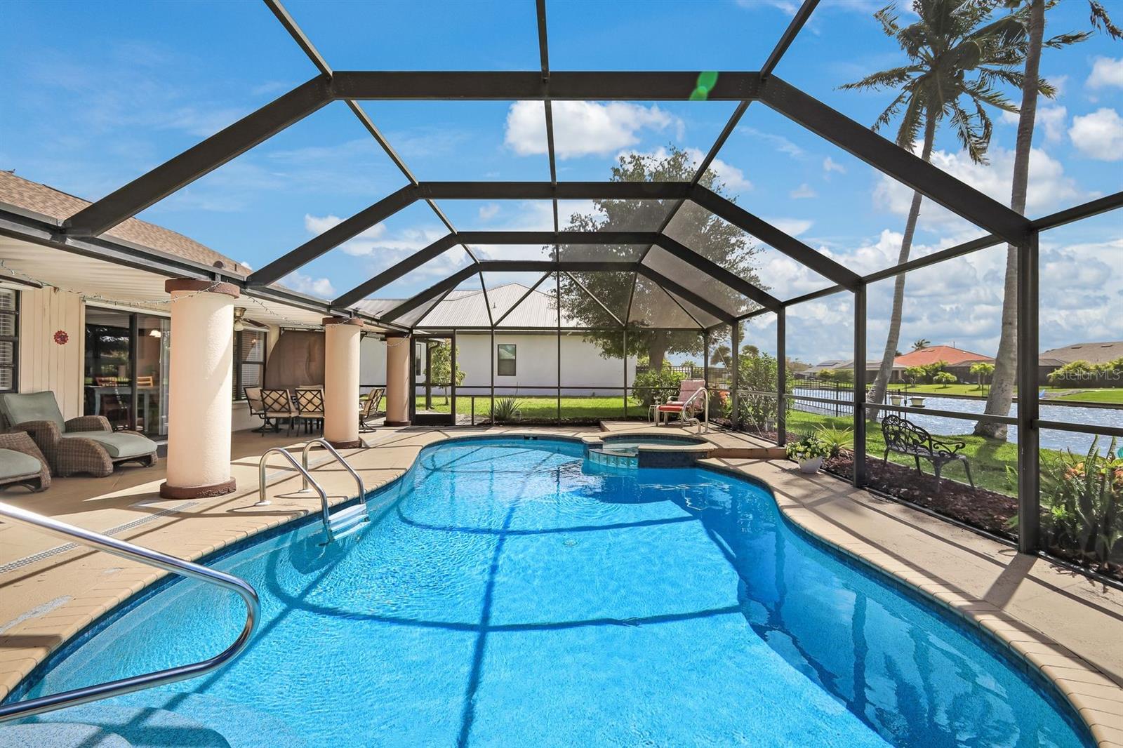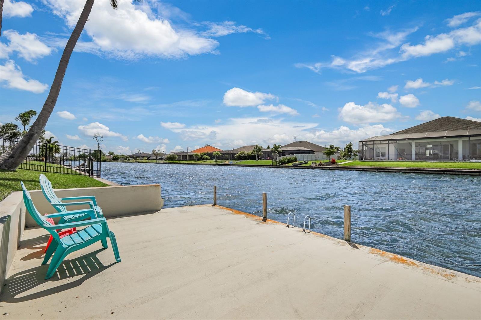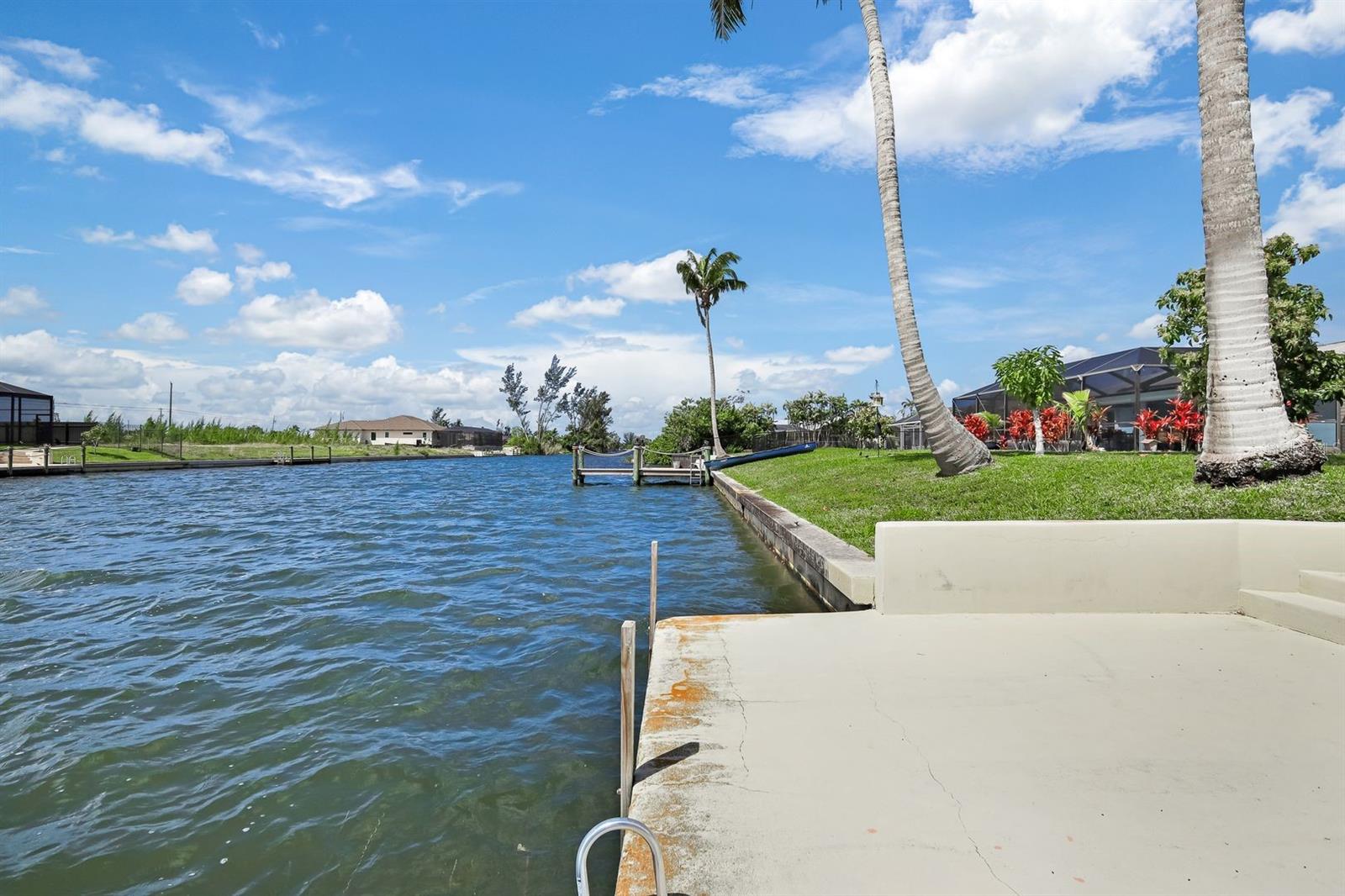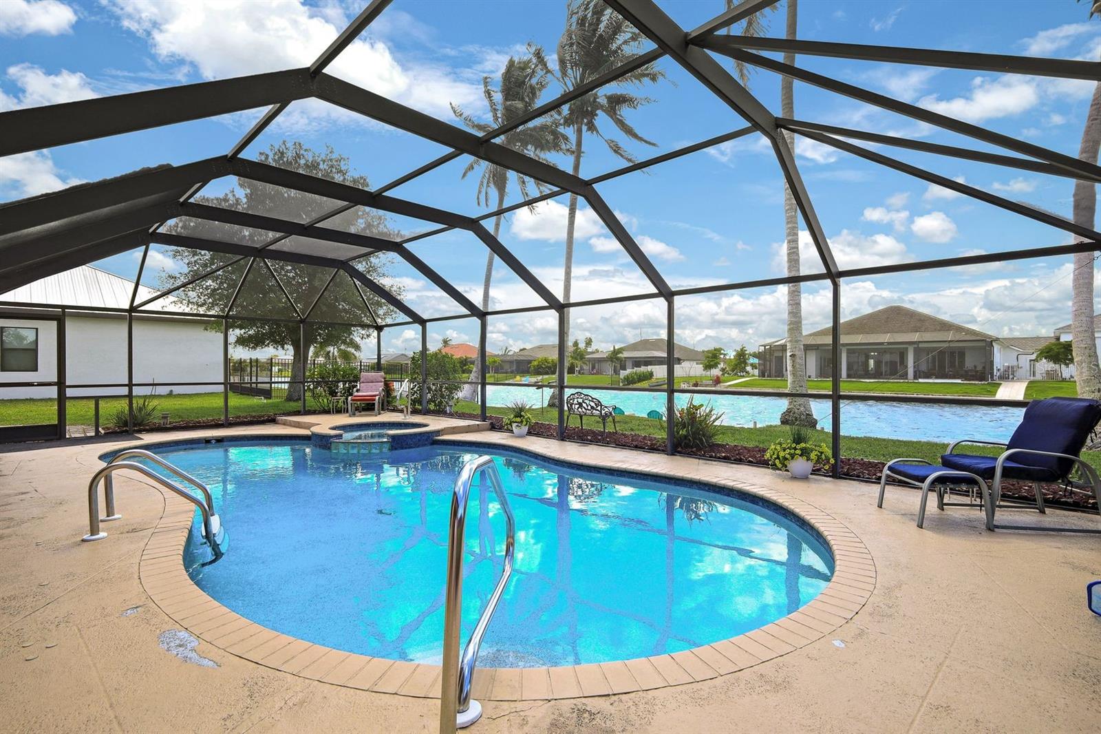 Bring all offers! Southern Exposure, wide water views and access to Chain of Lakes offering miles and miles of fresh water fun for ALL! This stunning property is situated overlooking 120 foot Escapade Canal ensuring WIDE WATER VIEWS throughout! Featuring 1818 sqft under air, 3 bedroom, plus den, 2 bathrooms and a 2 car garage. Step inside to discover a haven of comfort and style. Natural light pours in through the new skylight, highlighting the tile and acacia flooring that flows throughout the home. High ceilings create an airy ambiance in the split-bedroom layout, offering privacy and space for all occupants. Updated fans and light fixtures add a touch of contemporary flair to every room. The den provides a versatile space for work or relaxation, while inside laundry with shelving adds convenience to your daily routine. At the heart of the home is the kitchen and dining area designed for family gatherings. Features include granite counters, stainless steel appliances, and espresso cabinets which combine style with functionality, while a breakfast bar and breakfast nook offer casual dining options. A pantry provides ample storage space, while a glass mosaic backsplash adds a pop of color and sophistication to the space. Retreat to the luxurious master suite featuring crown molding, a vaulted ceilings, and shaker vanity. Dual sinks and exotic granite countertops offer a spa-like experience in the ensuite bathroom, complete with a large walk-in shower for ultimate relaxation. Outdoor living is what SWFL is all about and this home will not disappoint. Step onto the painted deck overlooking the sparkling blue pool and spa, perfect for relaxing or entertaining guests. The lanai features a custom bar area with granite counters invites gatherings and cocktails under the Florida sun. NOTEWORTHY: New Roof 2023, AC 2018, city water and sewer, Flood Zone X! Perfect for families, vacationers, 2nd home, part time or full time! Enjoy everything that SW FL has to offer - boat, sail, kayak, SUP, jet ski, fish or simply take a dip in your private oasis! See 3D tour, features list and schedule your private tour today!