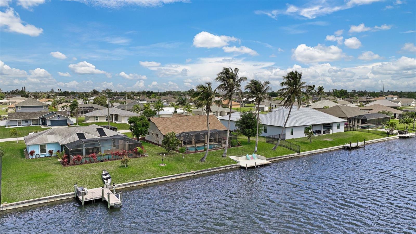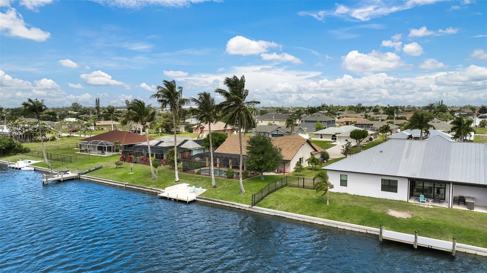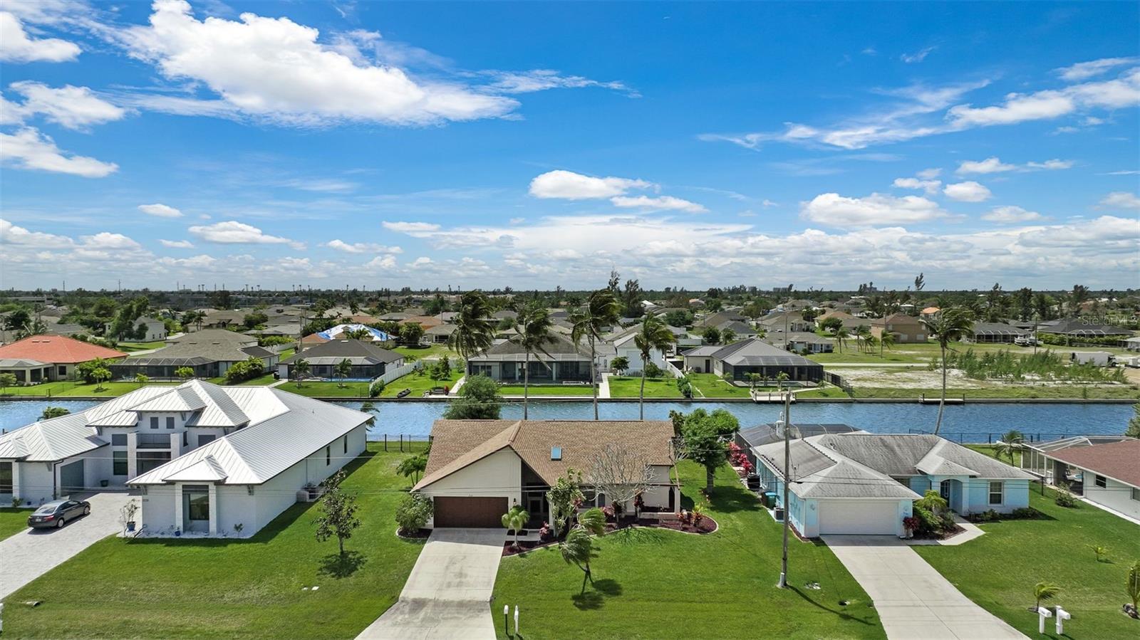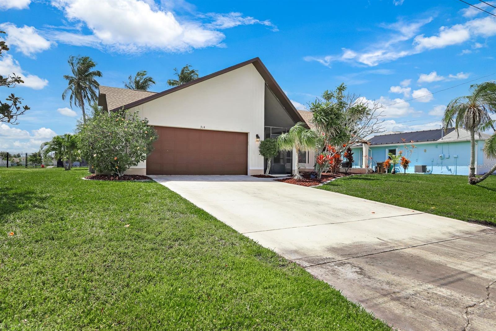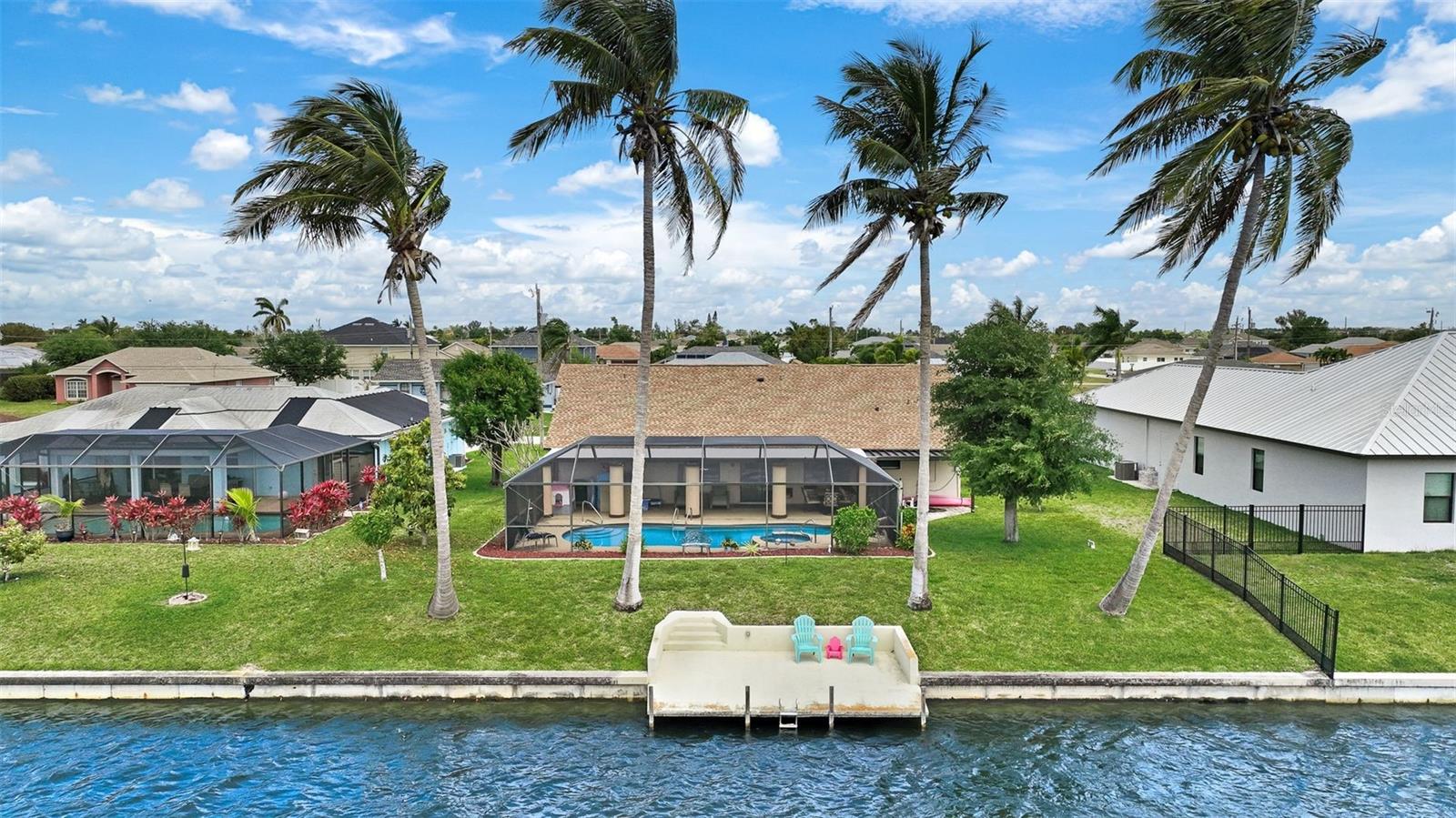 Bring all offers! Southern Exposure, wide water views and access to Chain of Lakes offering miles and miles of fresh water fun for ALL! This stunning property is situated overlooking 120 foot Escapade Canal ensuring WIDE WATER VIEWS throughout! Featuring 1818 sqft under air, 3 bedroom, plus den, 2 bathrooms and a 2 car garage. Step inside to discover a haven of comfort and style. Natural light pours in through the new skylight, highlighting the tile and acacia flooring that flows throughout the home. High ceilings create an airy ambiance in the split-bedroom layout, offering privacy and space for all occupants. Updated fans and light fixtures add a touch of contemporary flair to every room. The den provides a versatile space for work or relaxation, while inside laundry with shelving adds convenience to your daily routine. At the heart of the home is the kitchen and dining area designed for family gatherings. Features include granite counters, stainless steel appliances, and espresso cabinets which combine style with functionality, while a breakfast bar and breakfast nook offer casual dining options. A pantry provides ample storage space, while a glass mosaic backsplash adds a pop of color and sophistication to the space. Retreat to the luxurious master suite featuring crown molding, a vaulted ceilings, and shaker vanity. Dual sinks and exotic granite countertops offer a spa-like experience in the ensuite bathroom, complete with a large walk-in shower for ultimate relaxation. Outdoor living is what SWFL is all about and this home will not disappoint. Step onto the painted deck overlooking the sparkling blue pool and spa, perfect for relaxing or entertaining guests. The lanai features a custom bar area with granite counters invites gatherings and cocktails under the Florida sun. NOTEWORTHY: New Roof 2023, AC 2018, city water and sewer, Flood Zone X! Perfect for families, vacationers, 2nd home, part time or full time! Enjoy everything that SW FL has to offer - boat, sail, kayak, SUP, jet ski, fish or simply take a dip in your private oasis! See 3D tour, features list and schedule your private tour today!