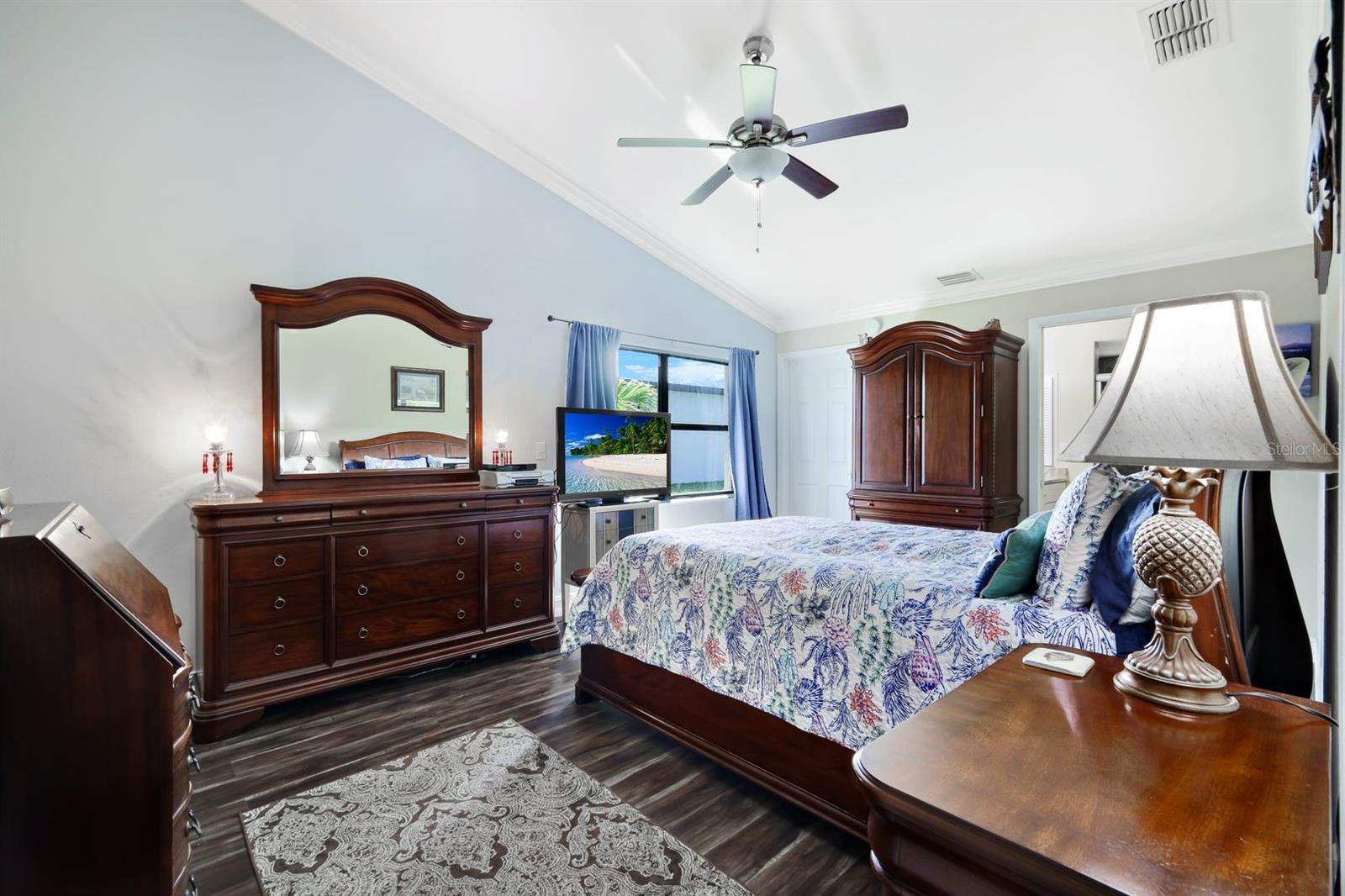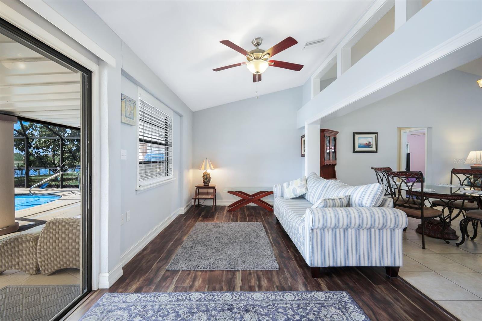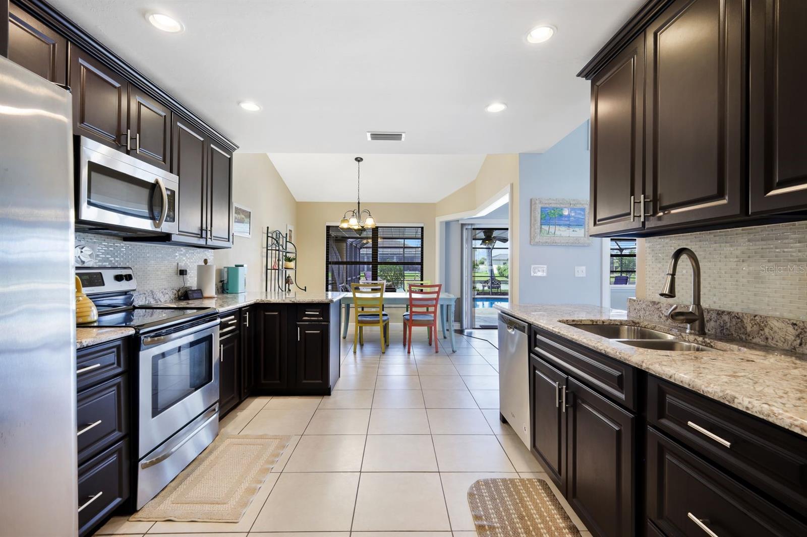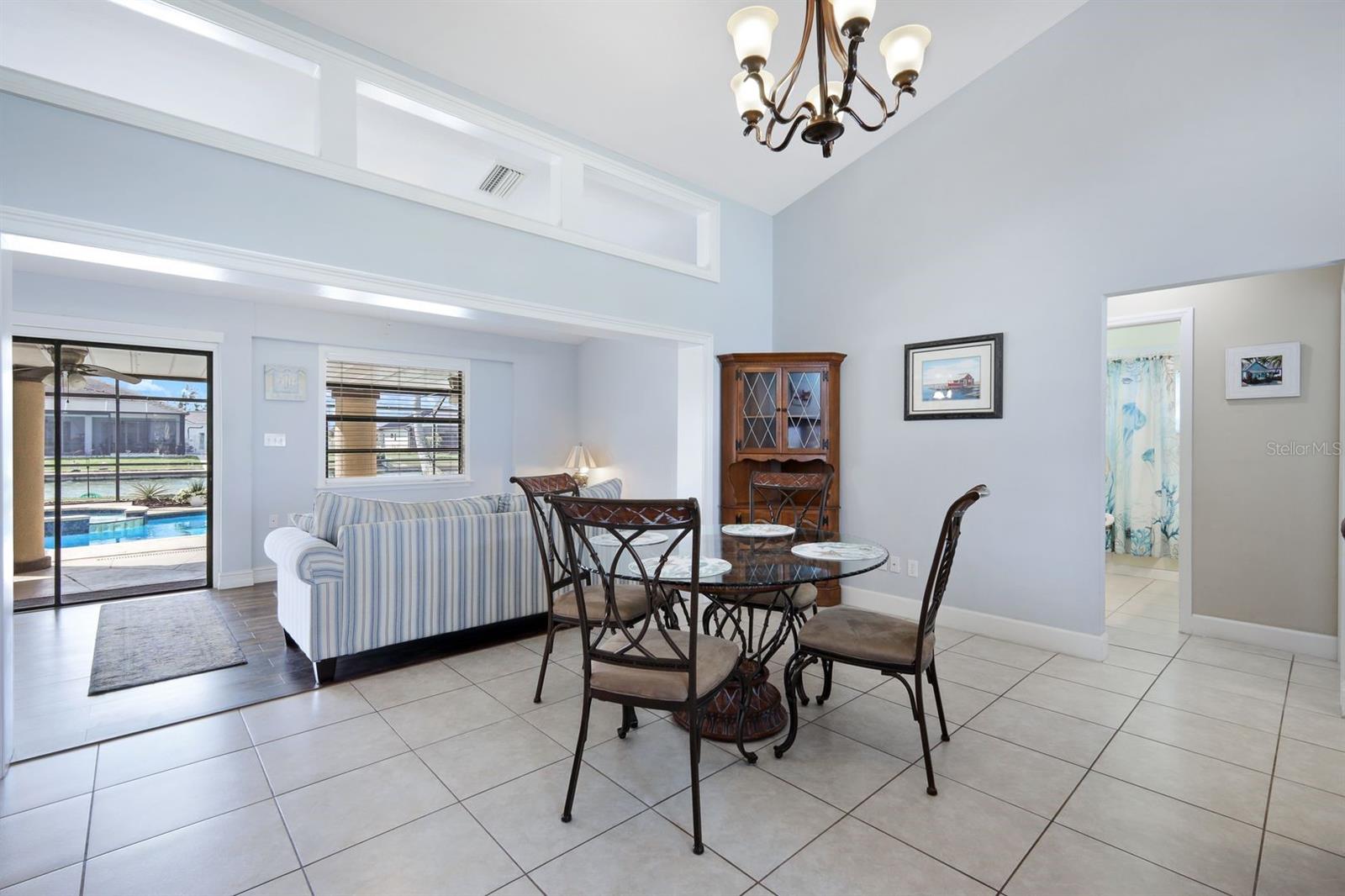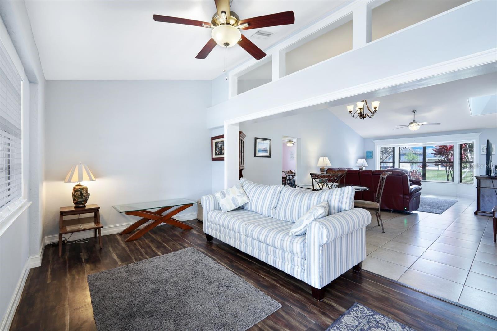 Bring all offers! Southern Exposure, wide water views and access to Chain of Lakes offering miles and miles of fresh water fun for ALL! This stunning property is situated overlooking 120 foot Escapade Canal ensuring WIDE WATER VIEWS throughout! Featuring 1818 sqft under air, 3 bedroom, plus den, 2 bathrooms and a 2 car garage. Step inside to discover a haven of comfort and style. Natural light pours in through the new skylight, highlighting the tile and acacia flooring that flows throughout the home. High ceilings create an airy ambiance in the split-bedroom layout, offering privacy and space for all occupants. Updated fans and light fixtures add a touch of contemporary flair to every room. The den provides a versatile space for work or relaxation, while inside laundry with shelving adds convenience to your daily routine. At the heart of the home is the kitchen and dining area designed for family gatherings. Features include granite counters, stainless steel appliances, and espresso cabinets which combine style with functionality, while a breakfast bar and breakfast nook offer casual dining options. A pantry provides ample storage space, while a glass mosaic backsplash adds a pop of color and sophistication to the space. Retreat to the luxurious master suite featuring crown molding, a vaulted ceilings, and shaker vanity. Dual sinks and exotic granite countertops offer a spa-like experience in the ensuite bathroom, complete with a large walk-in shower for ultimate relaxation. Outdoor living is what SWFL is all about and this home will not disappoint. Step onto the painted deck overlooking the sparkling blue pool and spa, perfect for relaxing or entertaining guests. The lanai features a custom bar area with granite counters invites gatherings and cocktails under the Florida sun. NOTEWORTHY: New Roof 2023, AC 2018, city water and sewer, Flood Zone X! Perfect for families, vacationers, 2nd home, part time or full time! Enjoy everything that SW FL has to offer - boat, sail, kayak, SUP, jet ski, fish or simply take a dip in your private oasis! See 3D tour, features list and schedule your private tour today!
