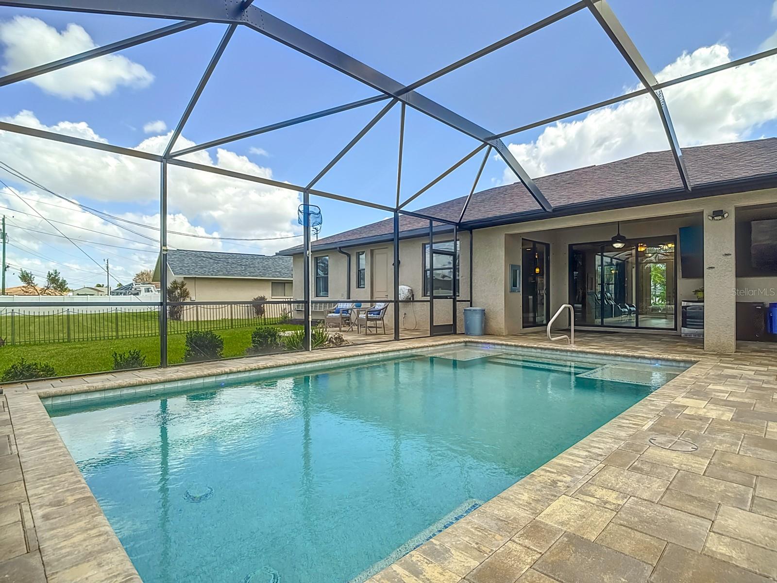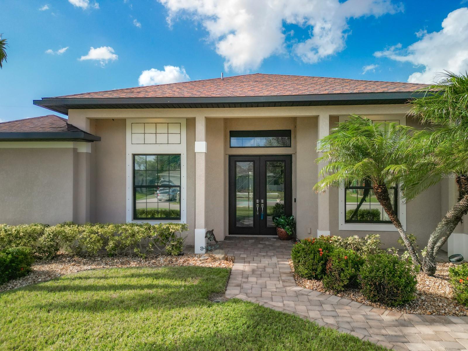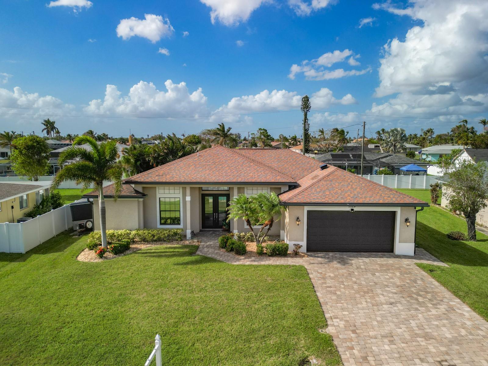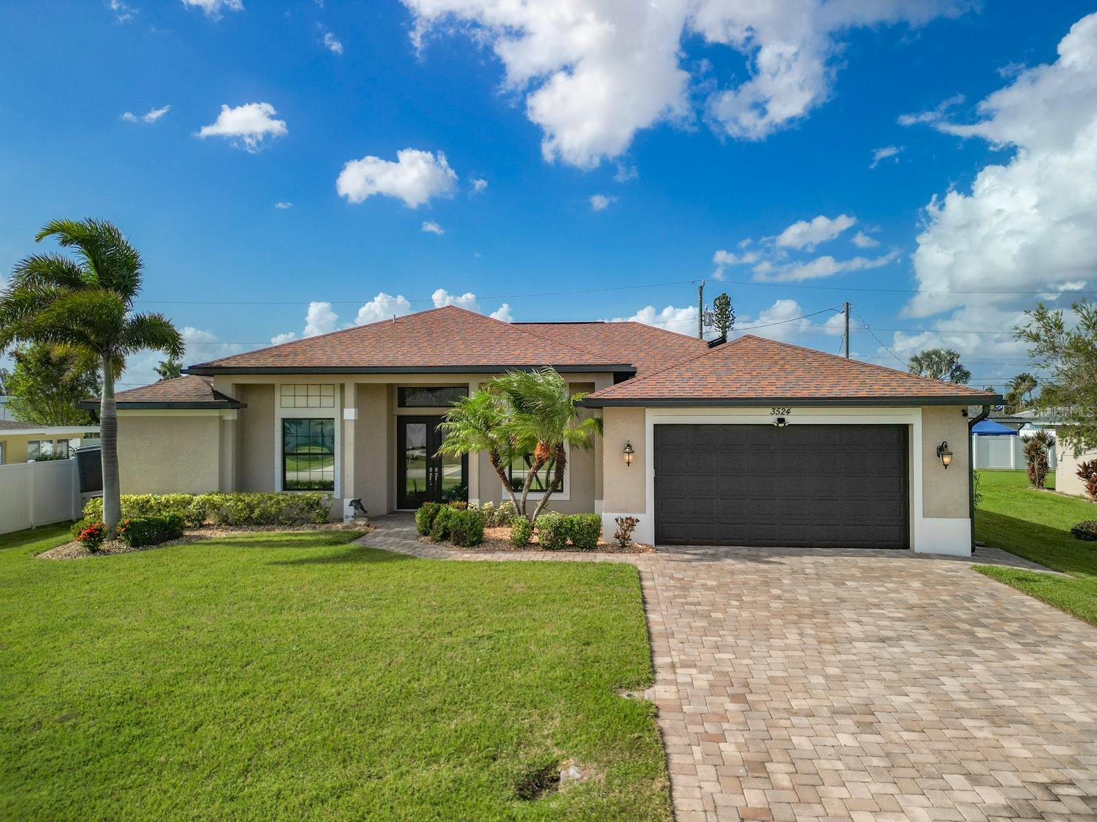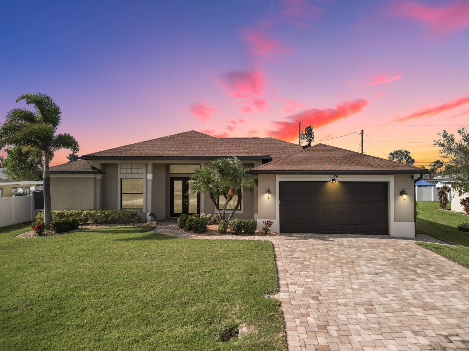 Welcome to this stunning modern home in Cape Coral, FL that comes with peace of mind - it has NEVER FLOODED! This three-bedroom, two- bathroom gem showcases a thoughtful split floor plan and includes a flexible den or office space, perfect for remote work or quiet study. Step into the open living area, where soaring high ceilings, elegant trayed detailing, and classic crown molding create a grand yet welcoming atmosphere. The kitchen is designed for both style and function, featuring expansive cabinets, a spacious island with seating, and a separate dining area ideal for family gatherings or entertaining friends. Triple and double sliding glass doors extend the indoor living space seamlessly to the outdoors, where a 24-by-14-foot pool awaits, nestled in private, lush landscaping. This outdoor oasis makes the patio a perfect place to host or unwind. The owner’s ensuite is a private retreat with luxurious trayed ceilings, dual sinks, a walk-in shower, and a roomy walk-in closet. The two additional bedrooms are cleverly designed with their own separate entrance, creating a private, two-bedroom in-law suite option. The oversized two-car garage, complete with fresh epoxy flooring, newer overhead storage, a workbench, and added electrical outlets, is built for convenience. It also has pull-down attic access, providing even more storage options. This home offers a rare blend of modern luxury, practical layout, and storm security, making it a standout choice in Cape Coral. SW Florida International Airport: 18.4 miles. Yacht Club Public Beach: 4.0 miles. Sun Splash Family Waterpark: 6.0 miles. Cultural Park Theatre: 5.0 miles
