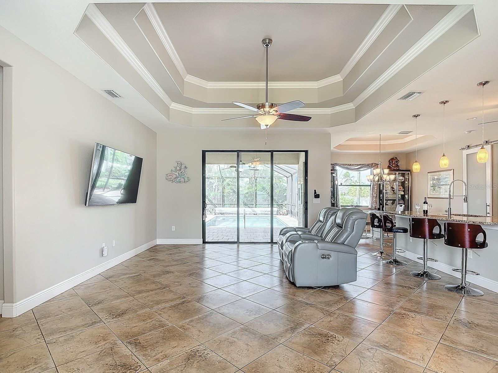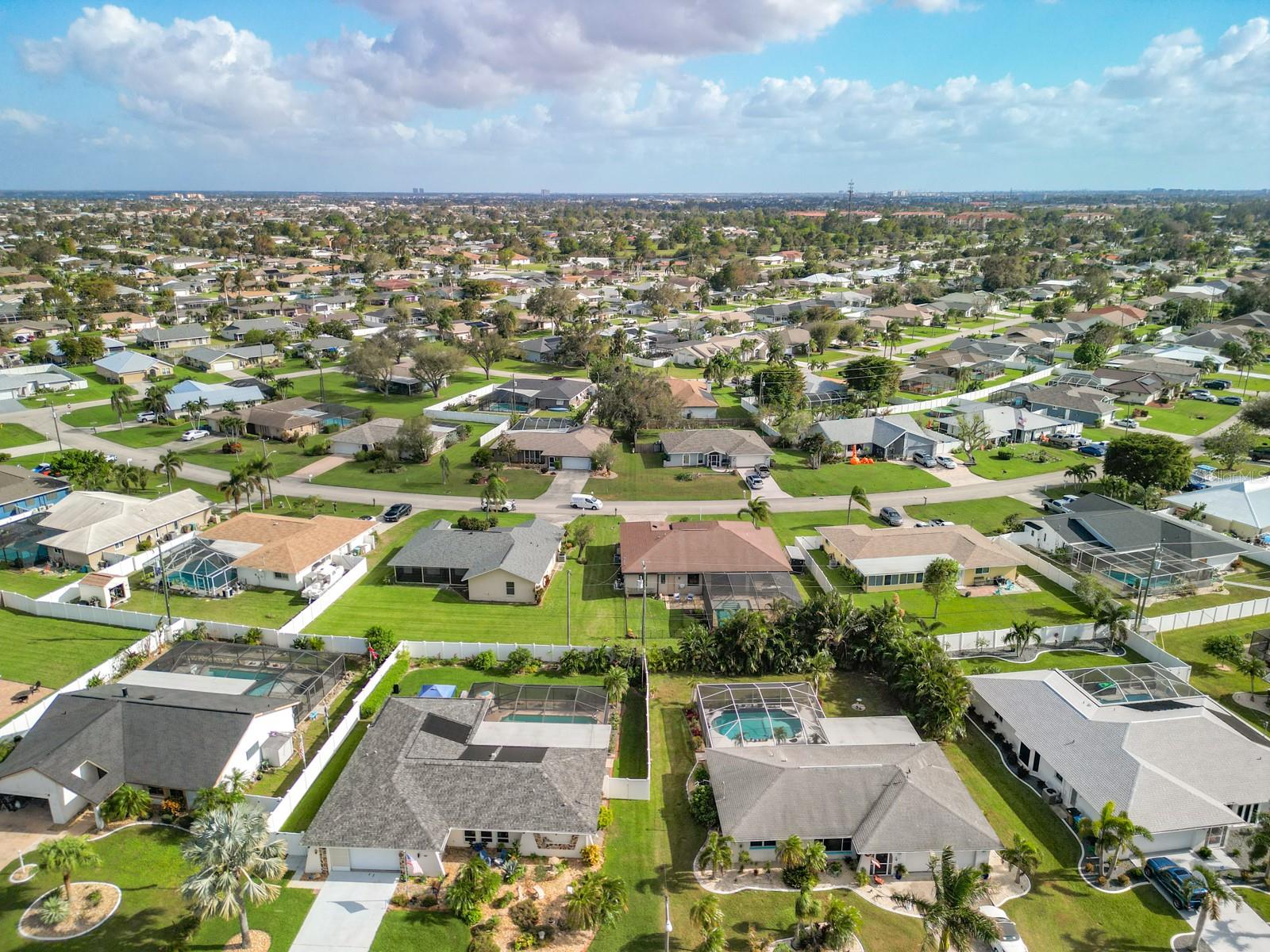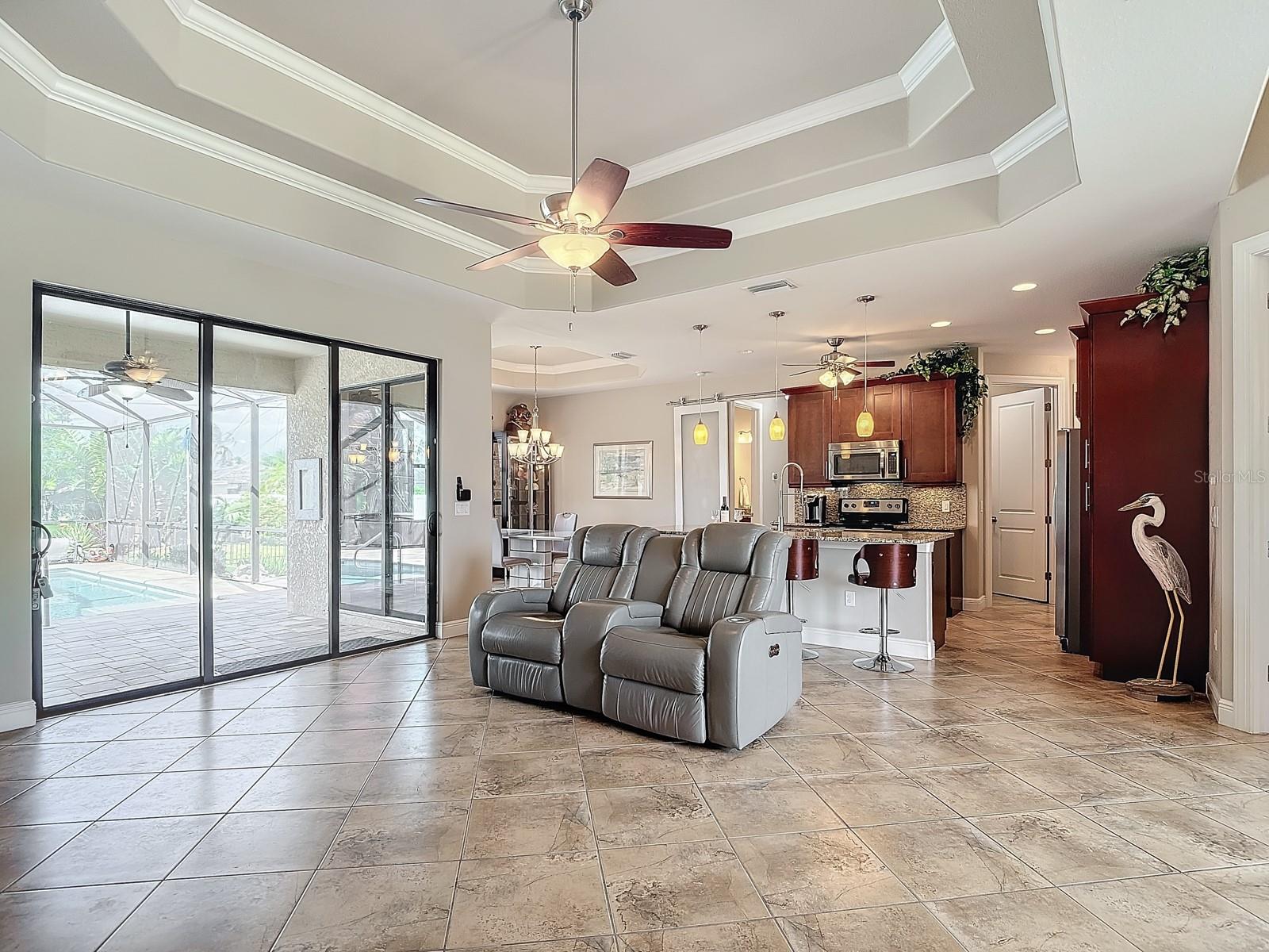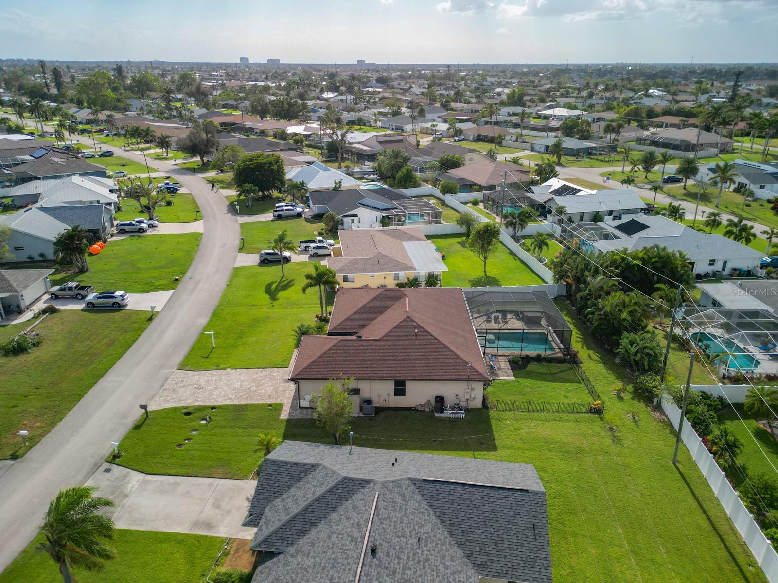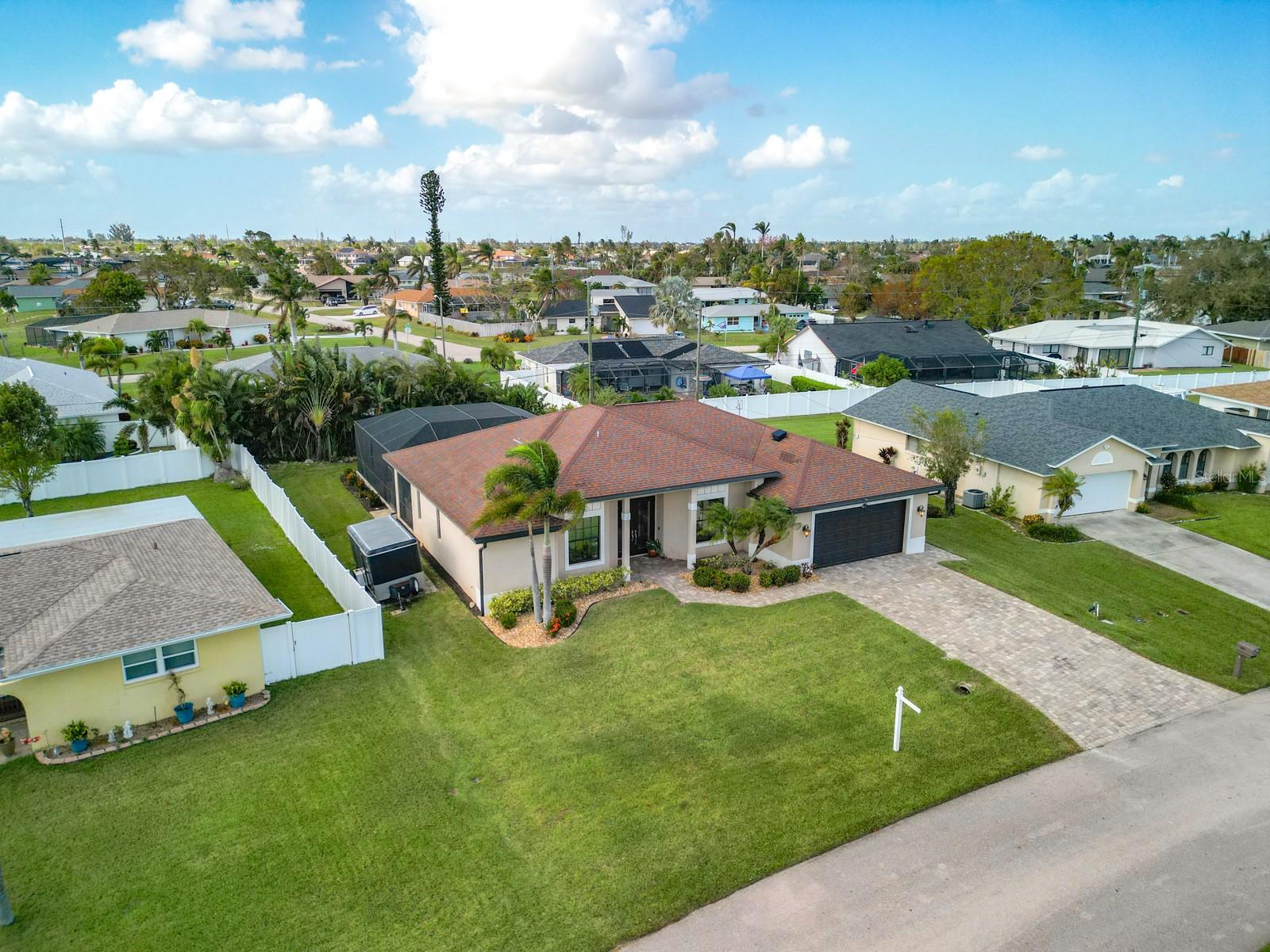 Welcome to this stunning modern home in Cape Coral, FL that comes with peace of mind - it has NEVER FLOODED! This three-bedroom, two- bathroom gem showcases a thoughtful split floor plan and includes a flexible den or office space, perfect for remote work or quiet study. Step into the open living area, where soaring high ceilings, elegant trayed detailing, and classic crown molding create a grand yet welcoming atmosphere. The kitchen is designed for both style and function, featuring expansive cabinets, a spacious island with seating, and a separate dining area ideal for family gatherings or entertaining friends. Triple and double sliding glass doors extend the indoor living space seamlessly to the outdoors, where a 24-by-14-foot pool awaits, nestled in private, lush landscaping. This outdoor oasis makes the patio a perfect place to host or unwind. The owner’s ensuite is a private retreat with luxurious trayed ceilings, dual sinks, a walk-in shower, and a roomy walk-in closet. The two additional bedrooms are cleverly designed with their own separate entrance, creating a private, two-bedroom in-law suite option. The oversized two-car garage, complete with fresh epoxy flooring, newer overhead storage, a workbench, and added electrical outlets, is built for convenience. It also has pull-down attic access, providing even more storage options. This home offers a rare blend of modern luxury, practical layout, and storm security, making it a standout choice in Cape Coral. SW Florida International Airport: 18.4 miles. Yacht Club Public Beach: 4.0 miles. Sun Splash Family Waterpark: 6.0 miles. Cultural Park Theatre: 5.0 miles