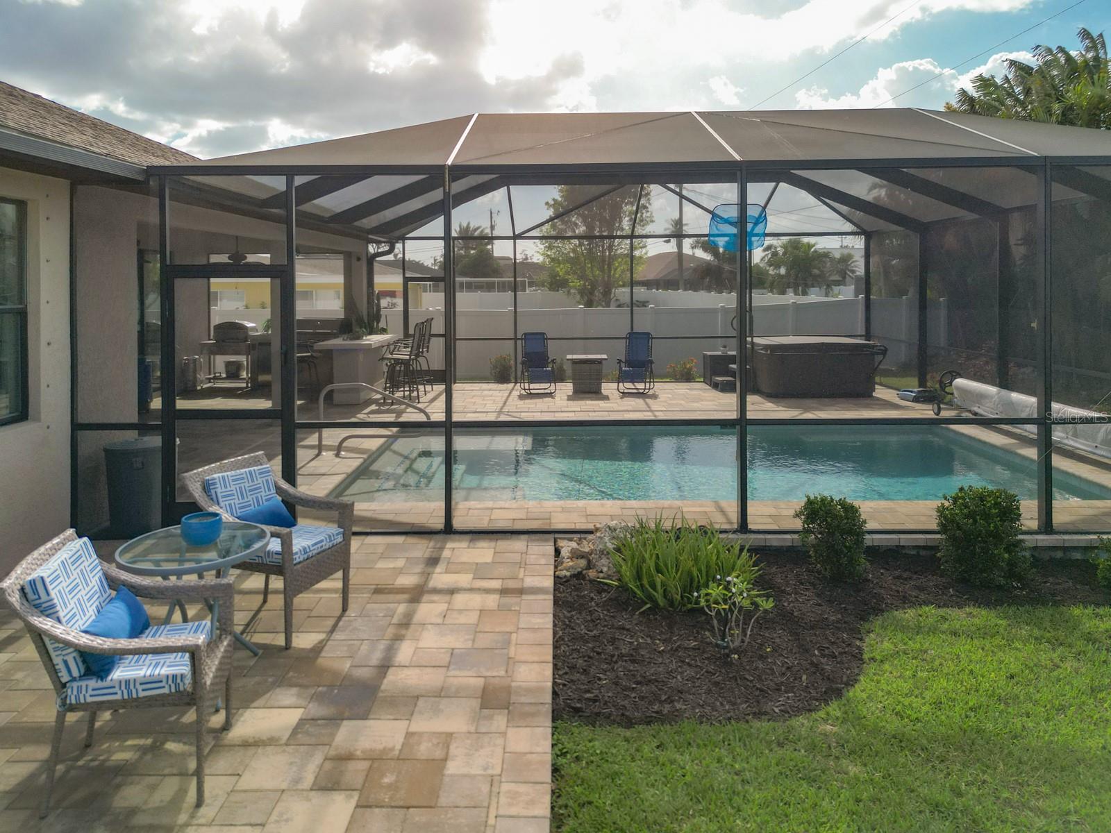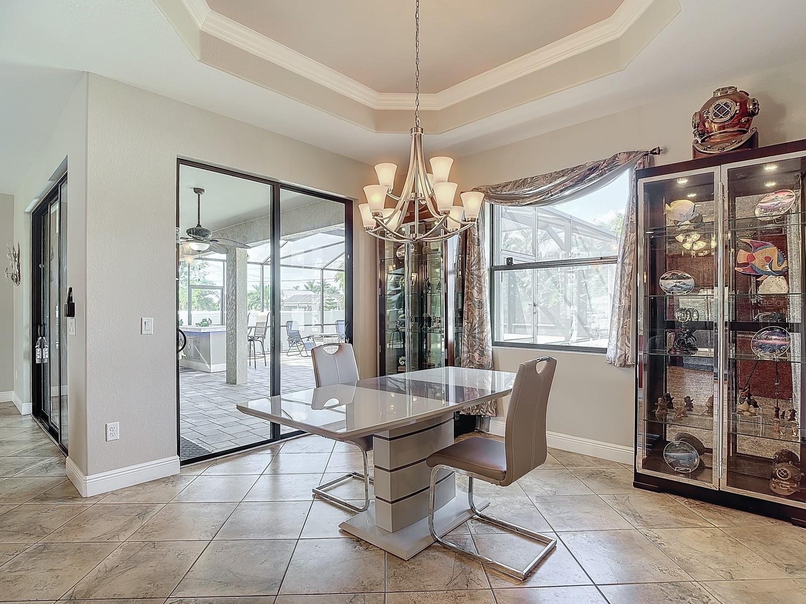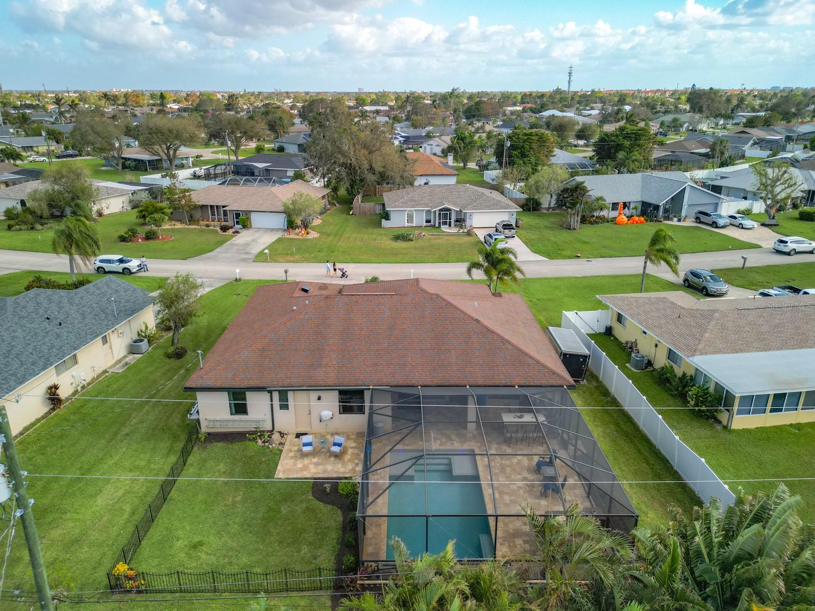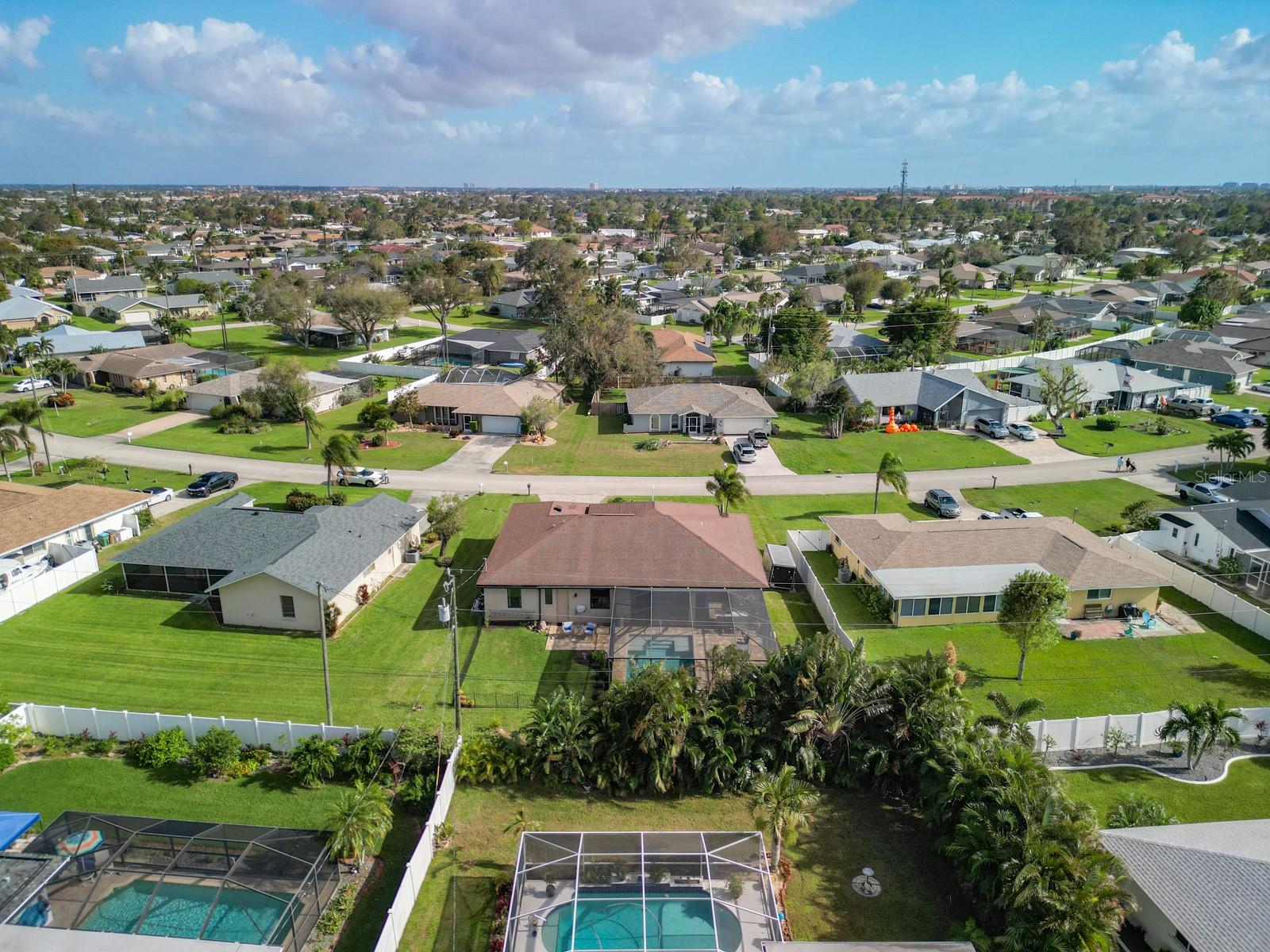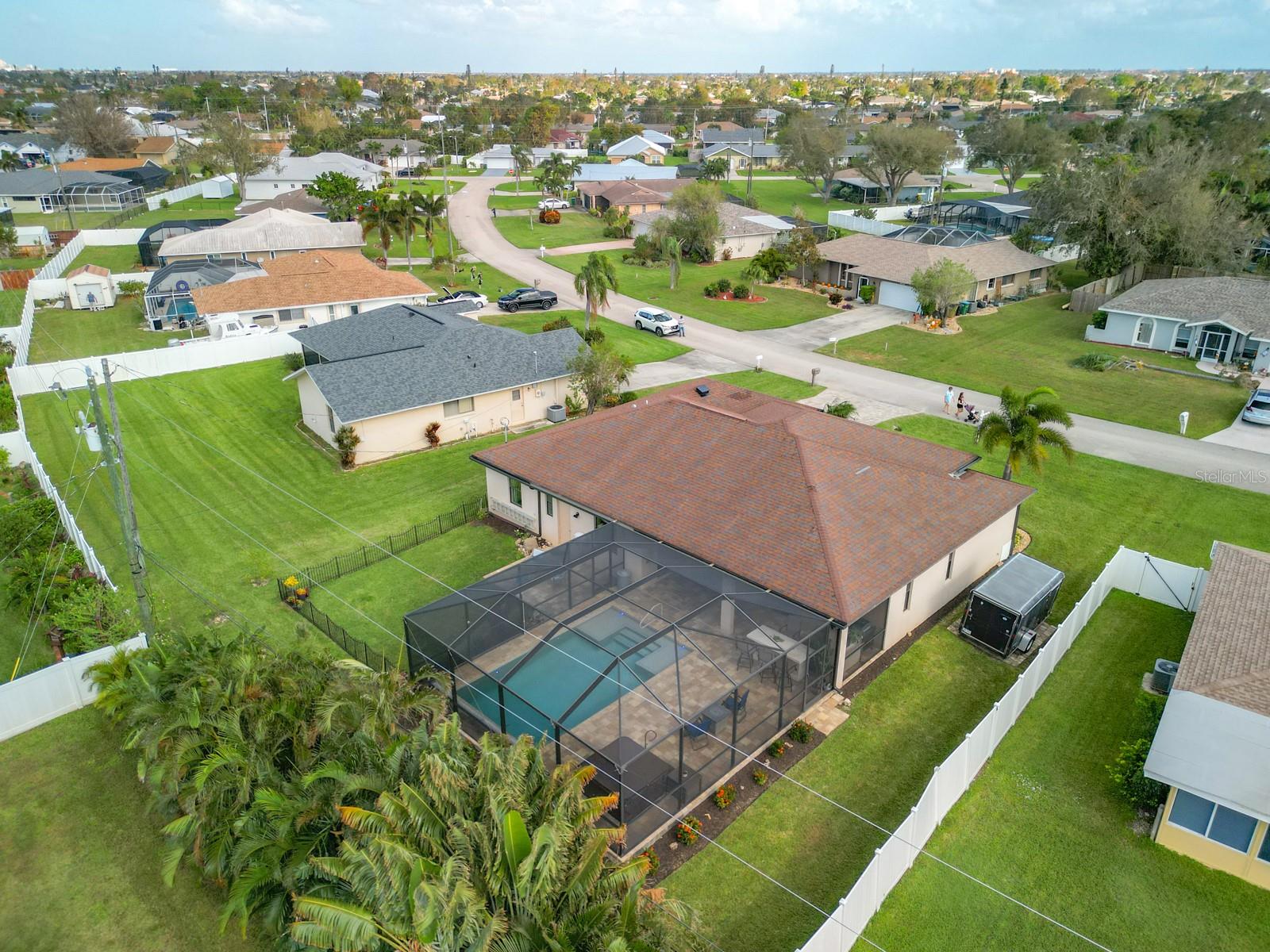 Welcome to this stunning modern home in Cape Coral, FL that comes with peace of mind - it has NEVER FLOODED! This three-bedroom, two- bathroom gem showcases a thoughtful split floor plan and includes a flexible den or office space, perfect for remote work or quiet study. Step into the open living area, where soaring high ceilings, elegant trayed detailing, and classic crown molding create a grand yet welcoming atmosphere. The kitchen is designed for both style and function, featuring expansive cabinets, a spacious island with seating, and a separate dining area ideal for family gatherings or entertaining friends. Triple and double sliding glass doors extend the indoor living space seamlessly to the outdoors, where a 24-by-14-foot pool awaits, nestled in private, lush landscaping. This outdoor oasis makes the patio a perfect place to host or unwind. The owner’s ensuite is a private retreat with luxurious trayed ceilings, dual sinks, a walk-in shower, and a roomy walk-in closet. The two additional bedrooms are cleverly designed with their own separate entrance, creating a private, two-bedroom in-law suite option. The oversized two-car garage, complete with fresh epoxy flooring, newer overhead storage, a workbench, and added electrical outlets, is built for convenience. It also has pull-down attic access, providing even more storage options. This home offers a rare blend of modern luxury, practical layout, and storm security, making it a standout choice in Cape Coral. SW Florida International Airport: 18.4 miles. Yacht Club Public Beach: 4.0 miles. Sun Splash Family Waterpark: 6.0 miles. Cultural Park Theatre: 5.0 miles